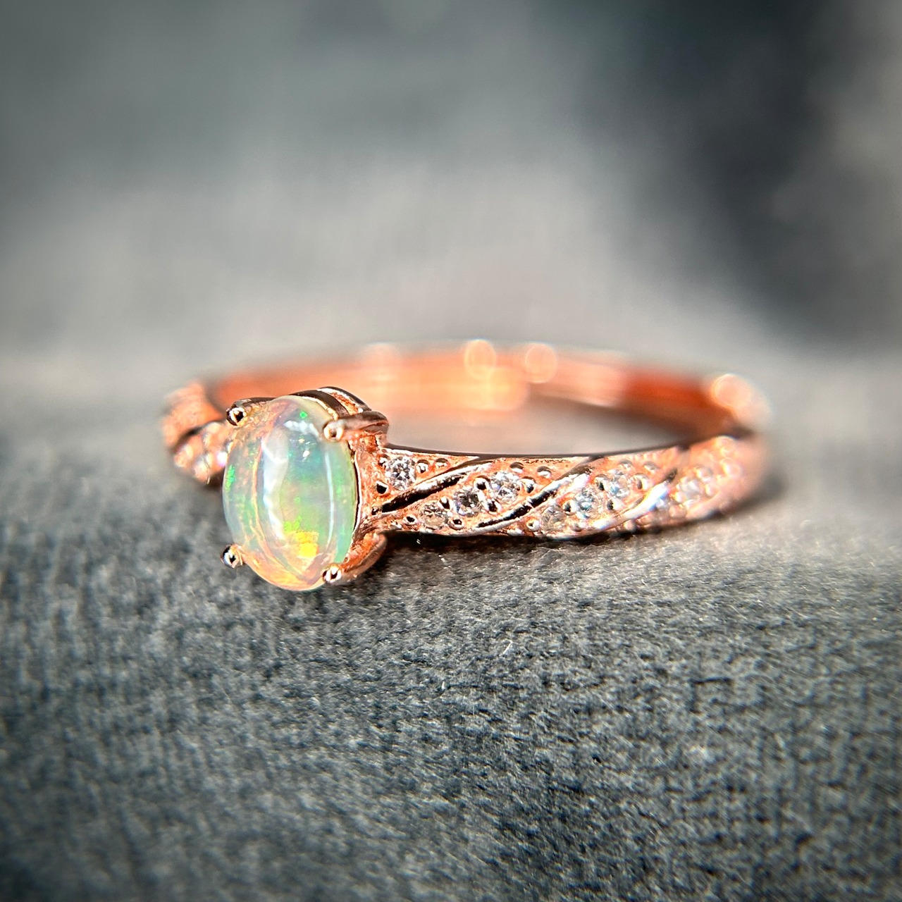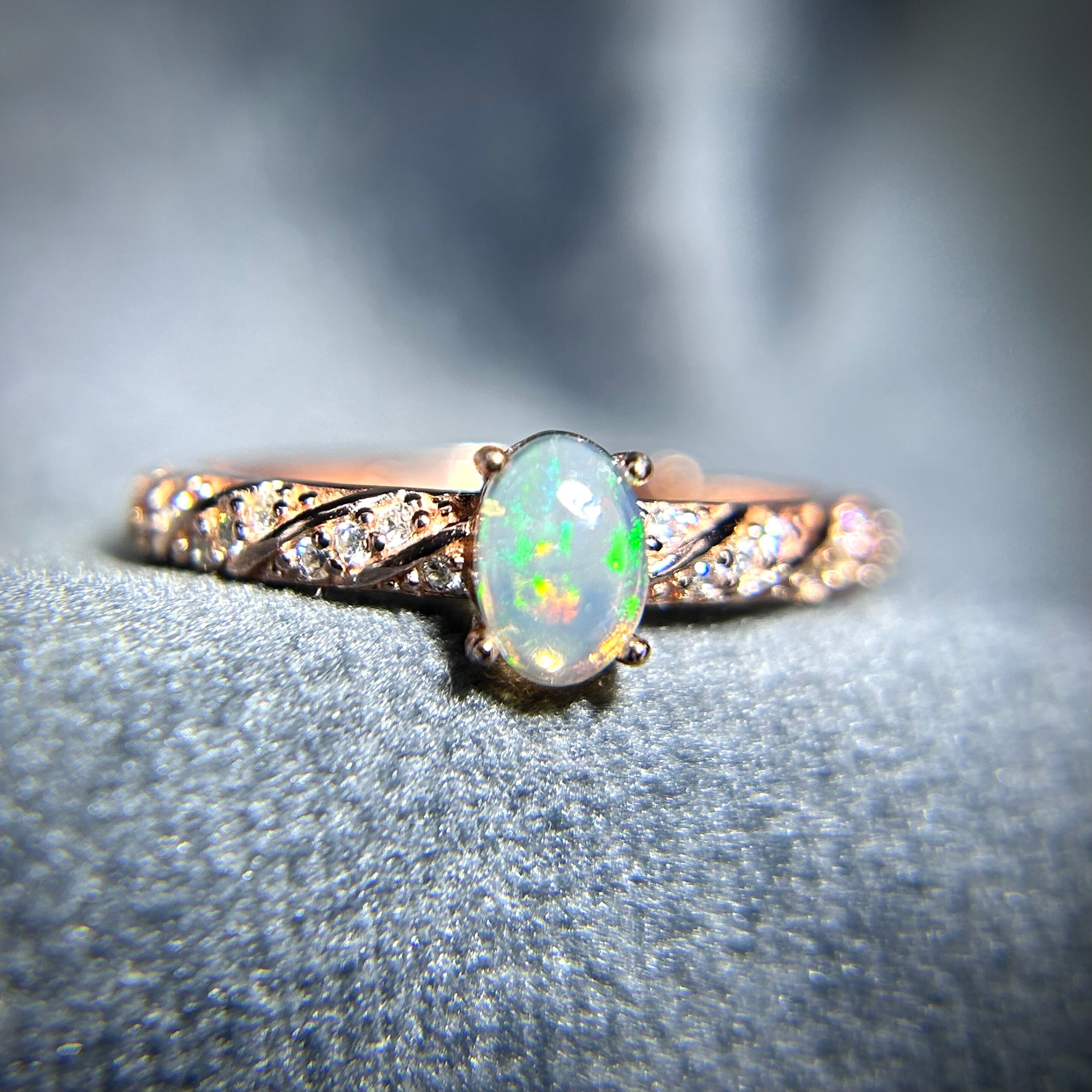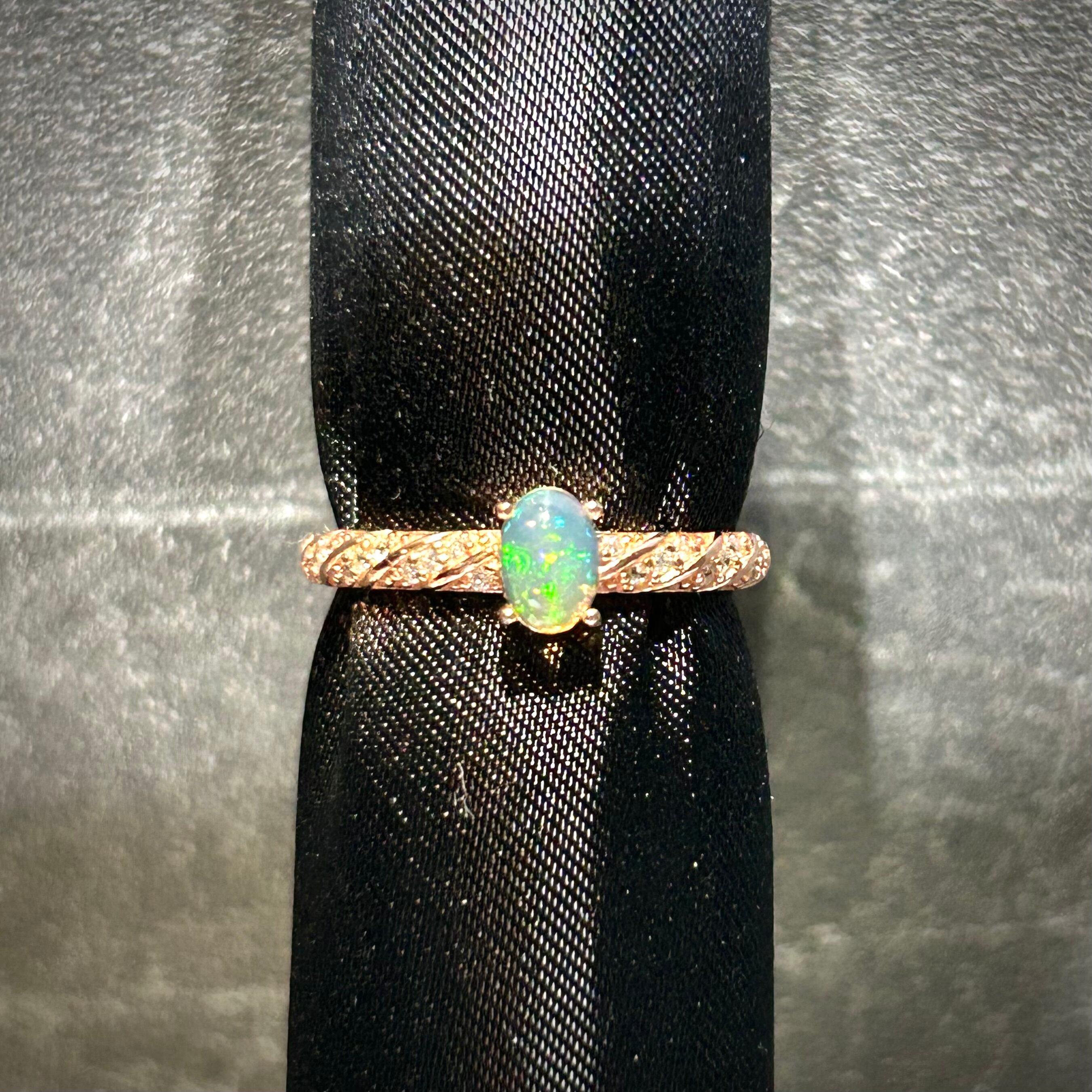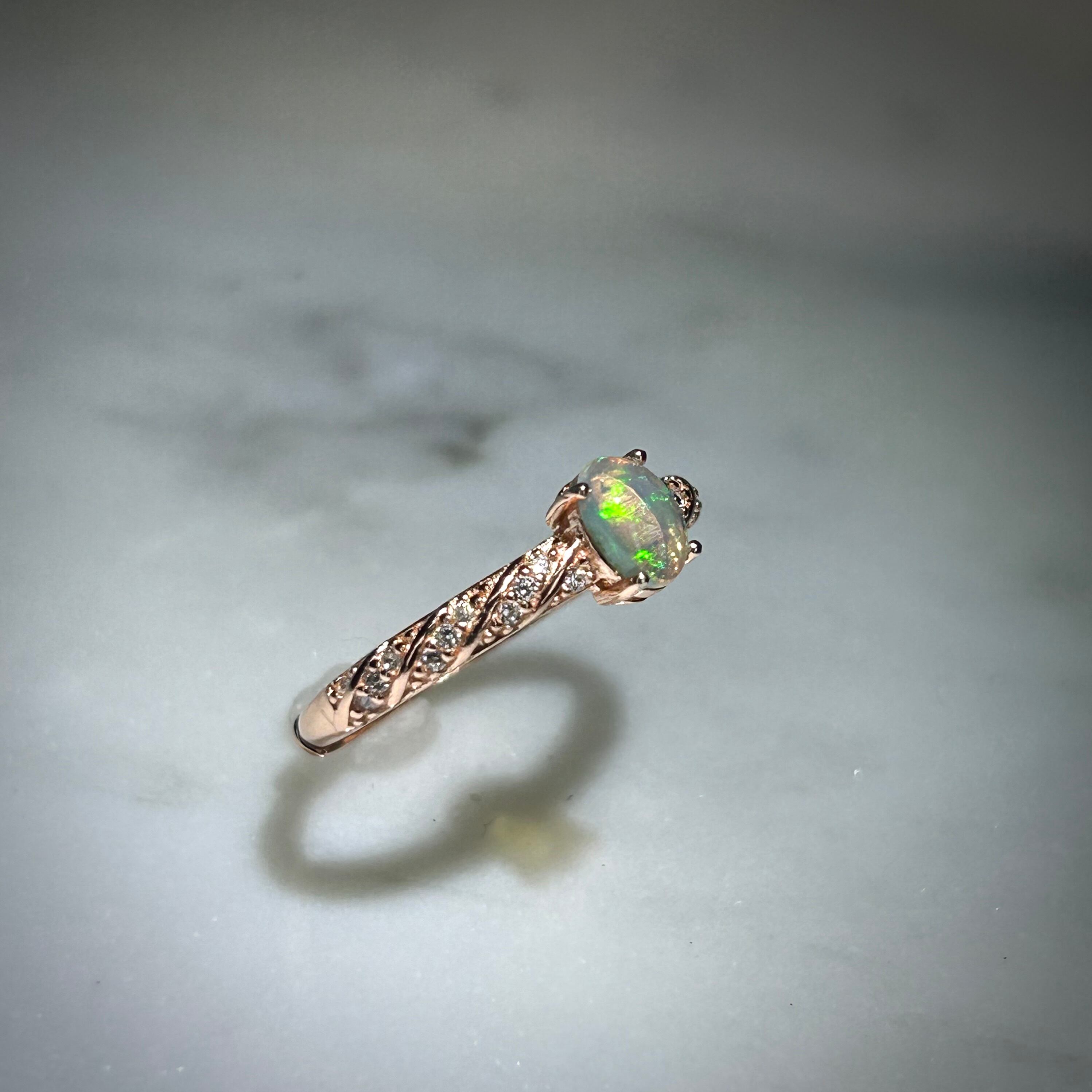 シルバー製ピンクゴールドカラー、オパールのスパイラルデザインリング。
