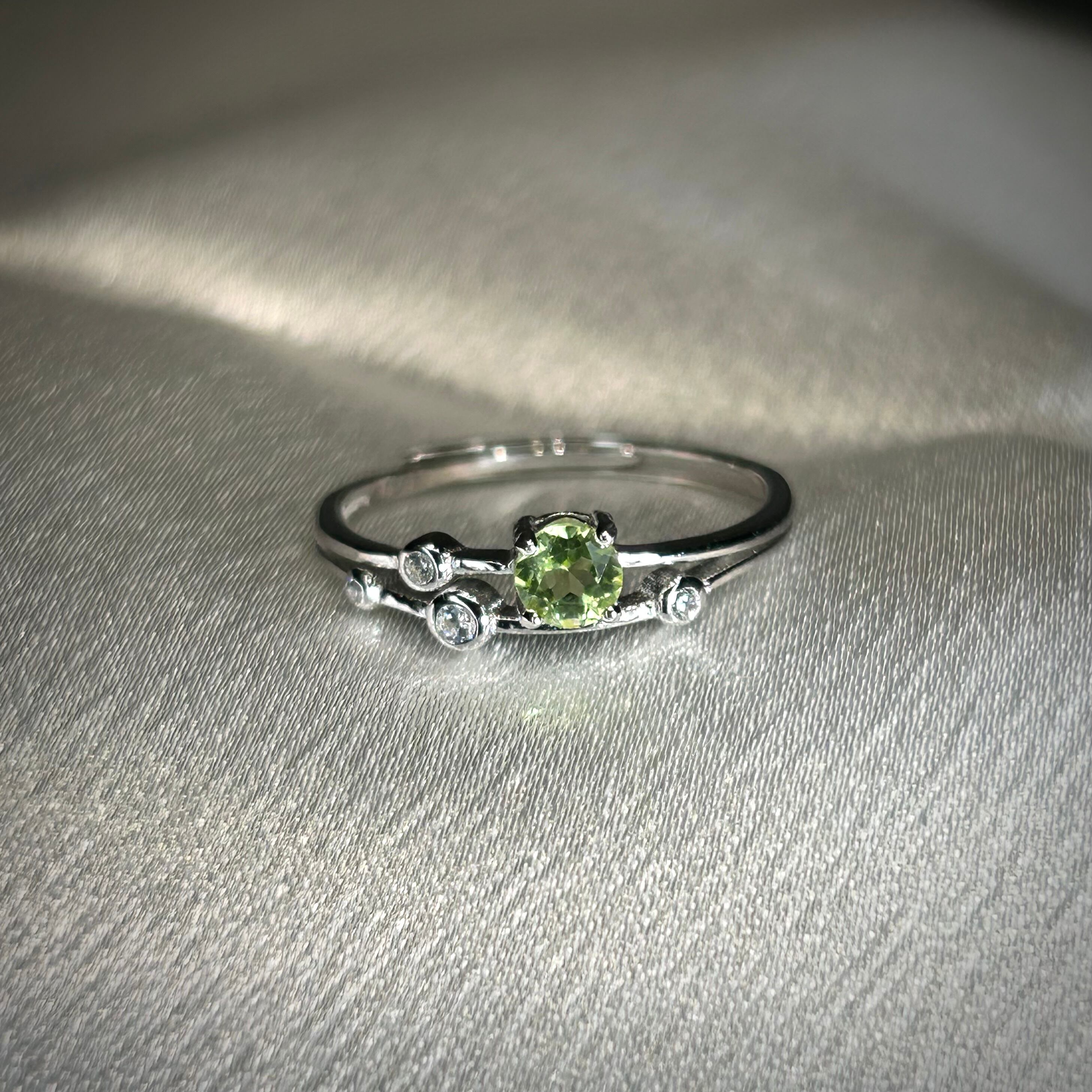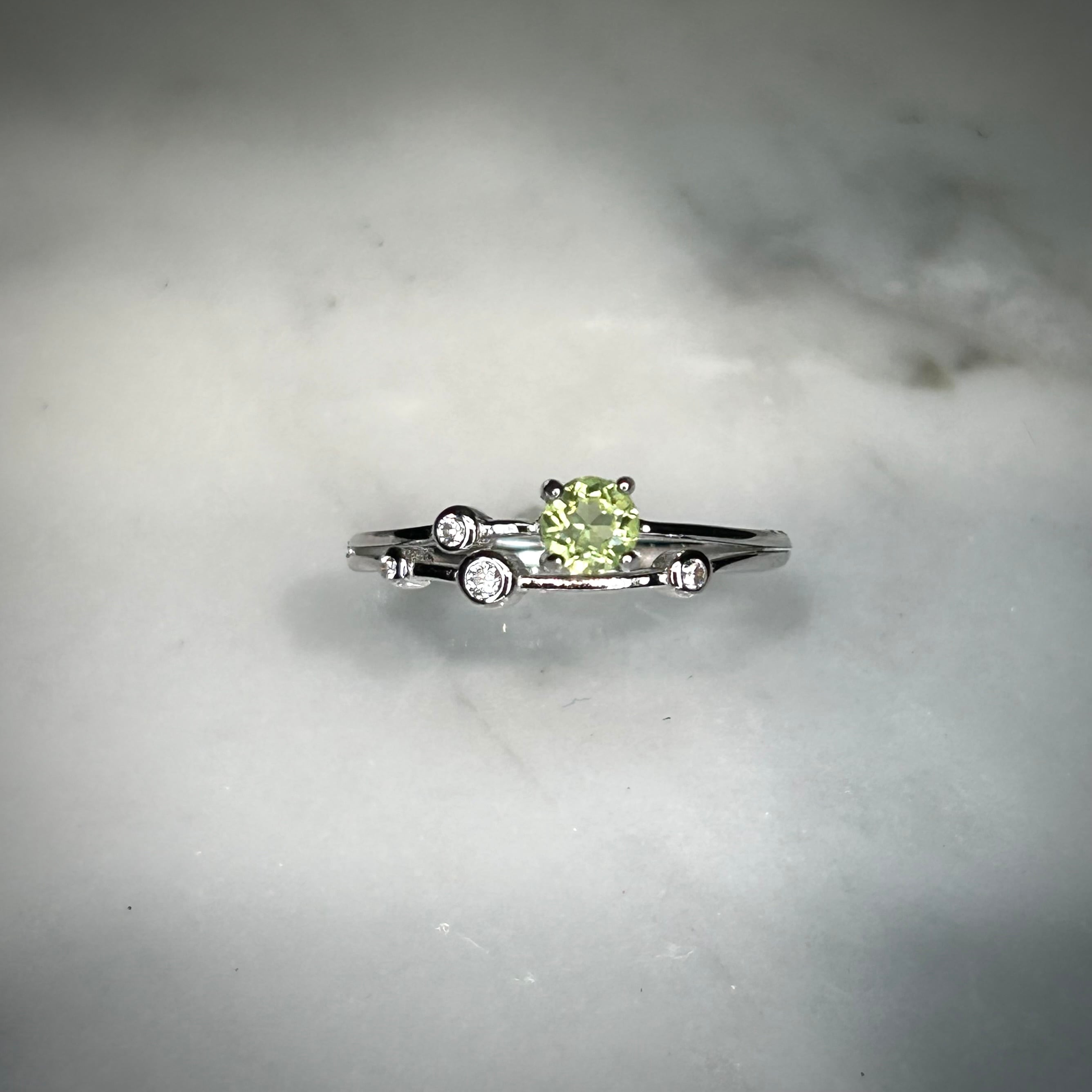 脇石が点々と配置されたデザインに、美しいペリドットが目を引くリングです。