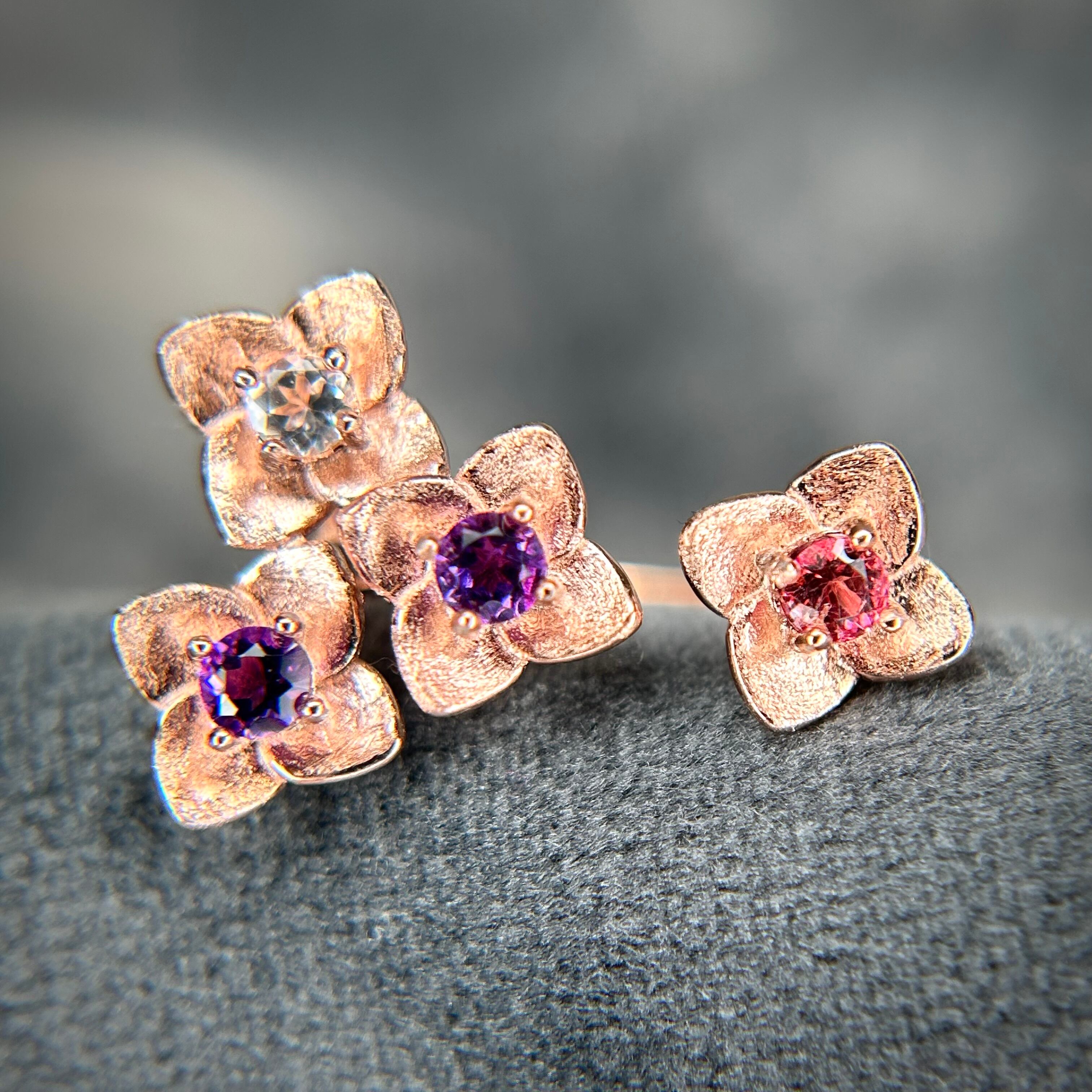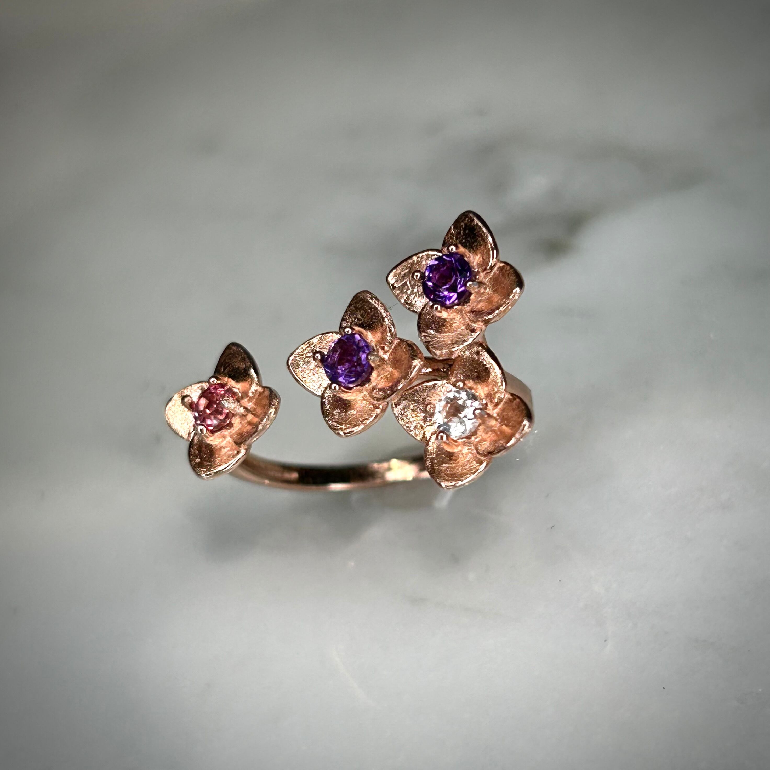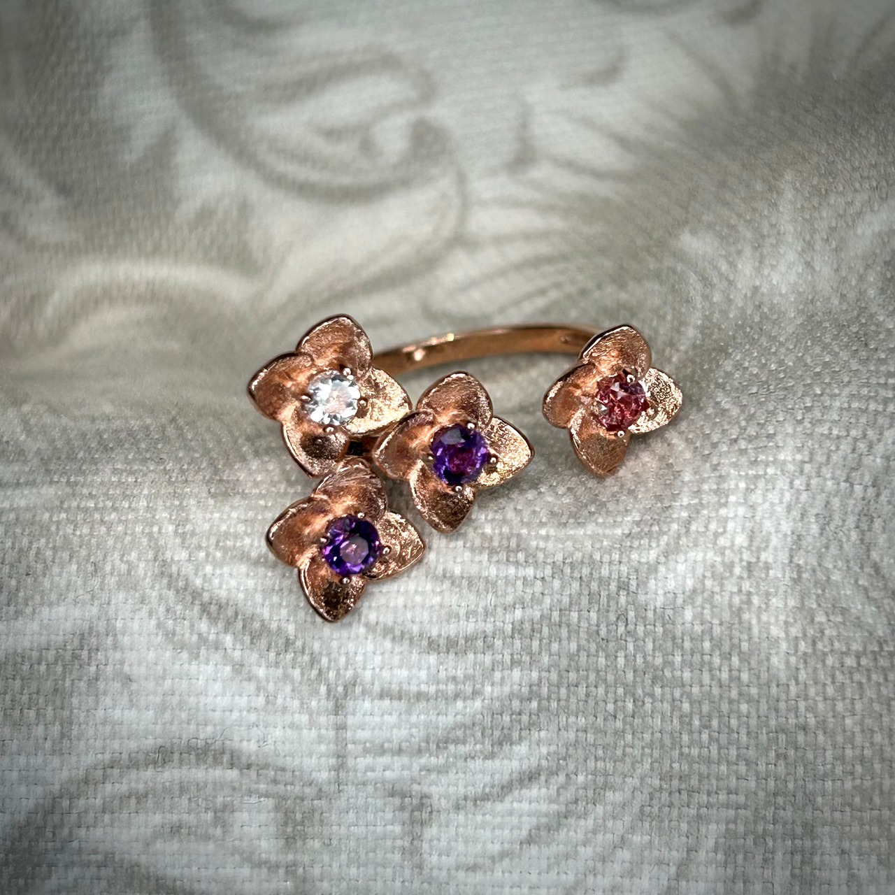 シルバー製ピンクゴールドカラー マルチストーンのフラワーリング。