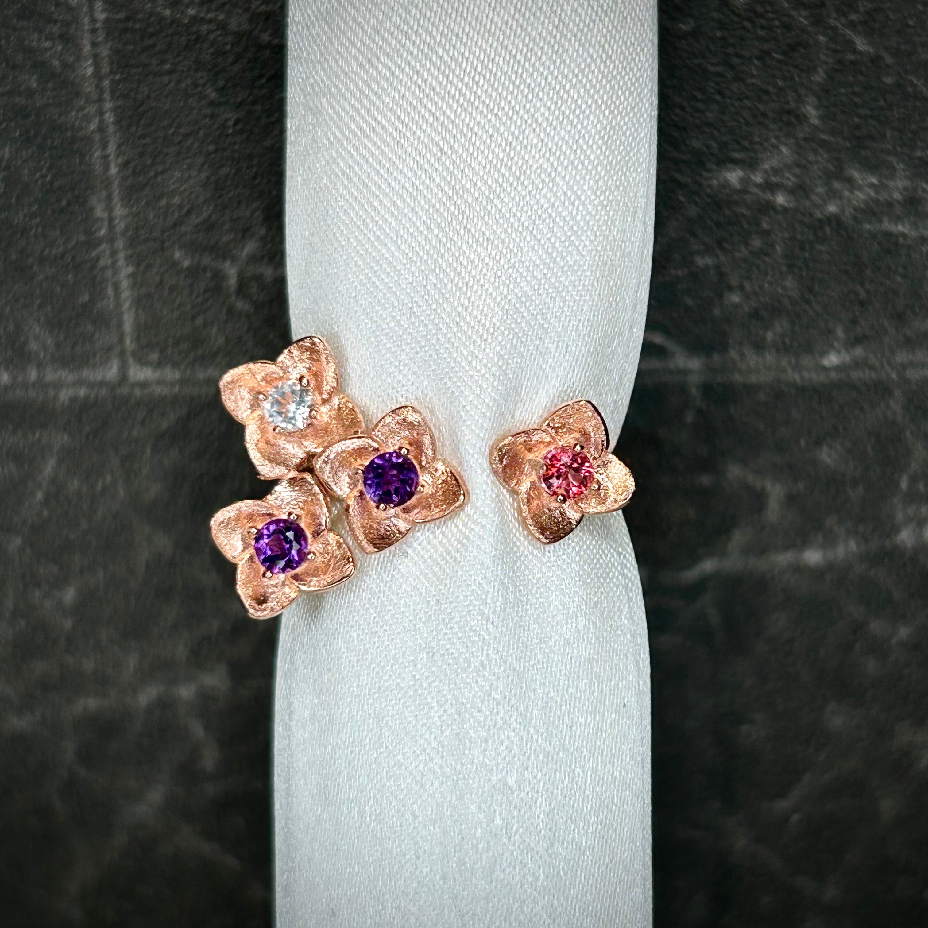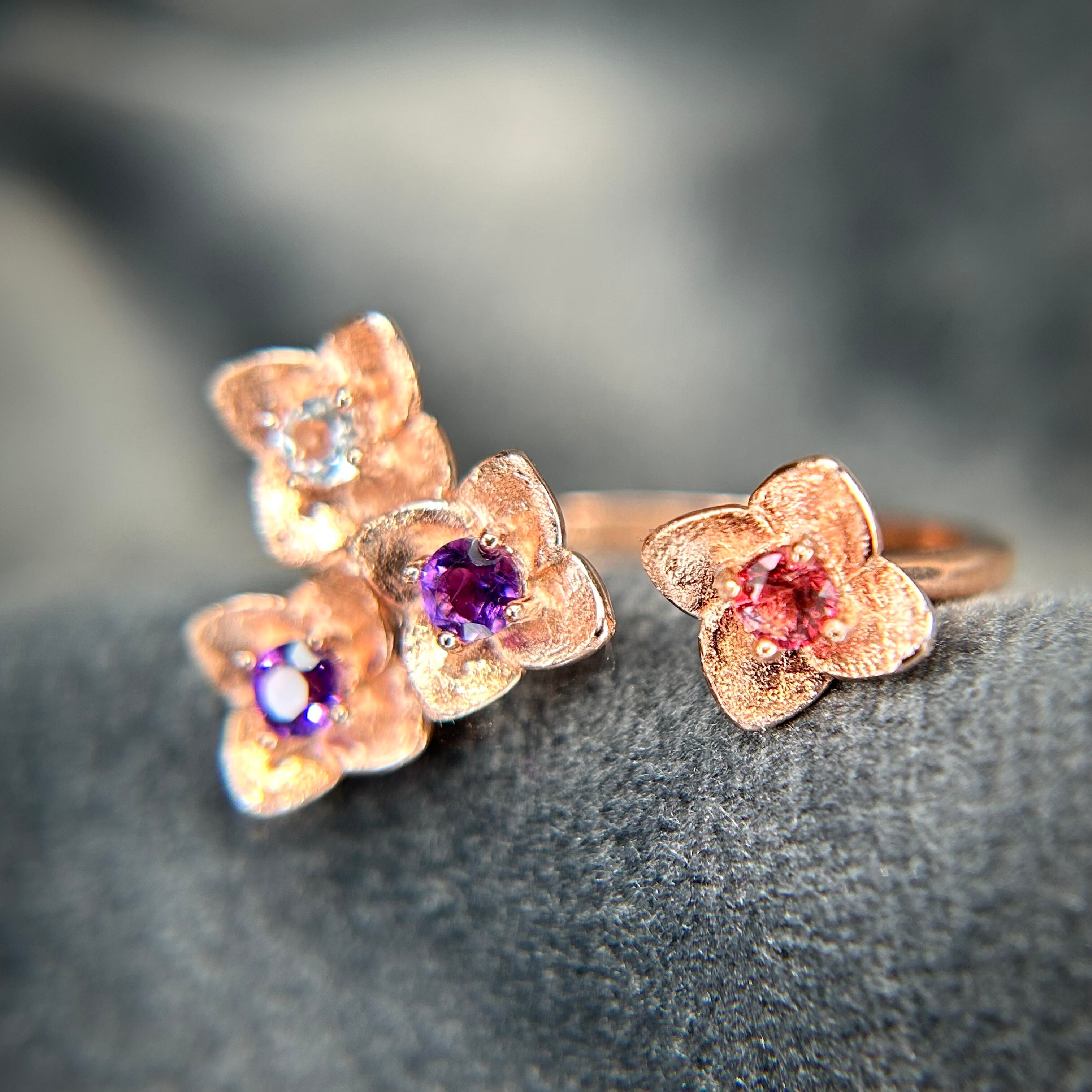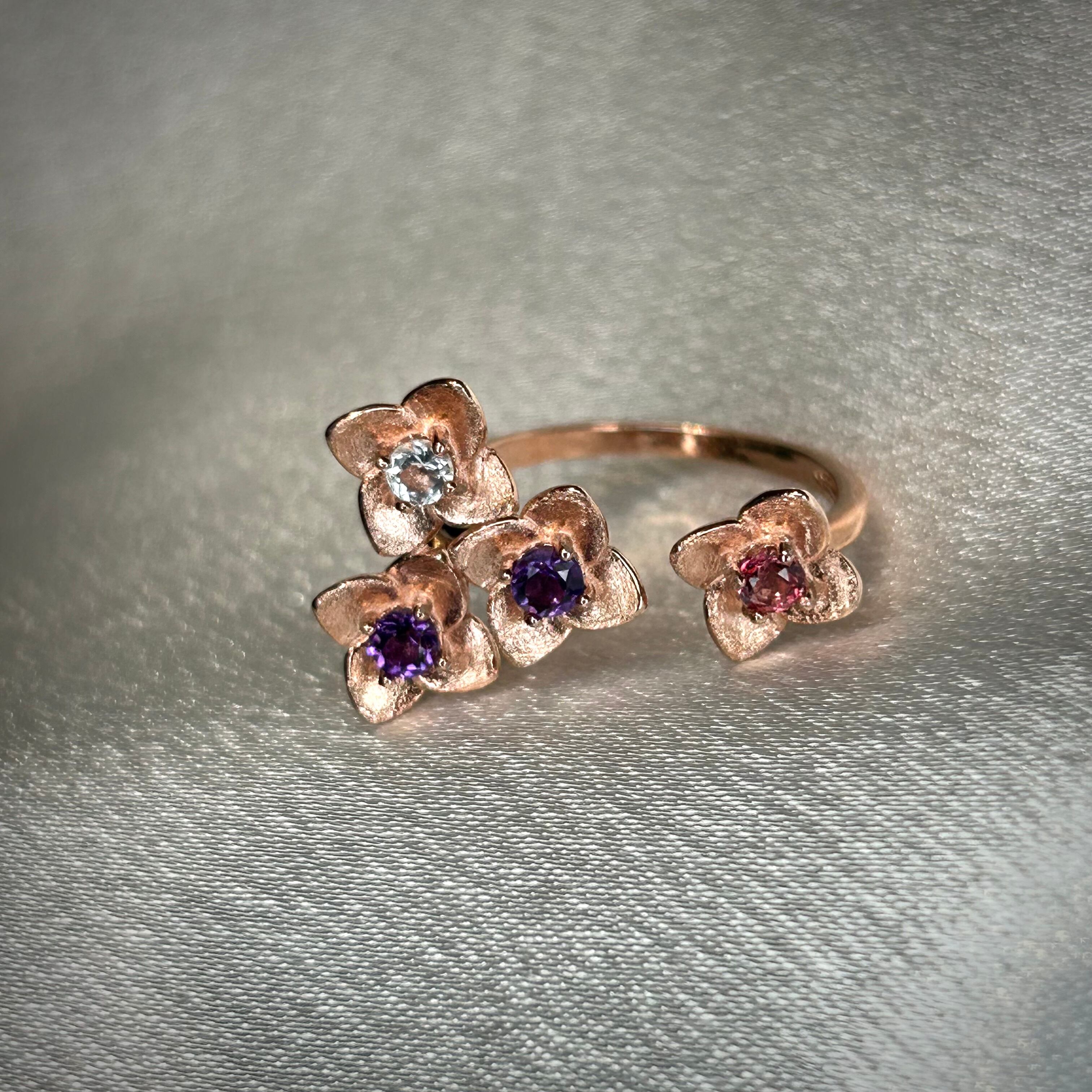 シルバー製ピンクゴールドカラー マルチストーンのフラワーリング。