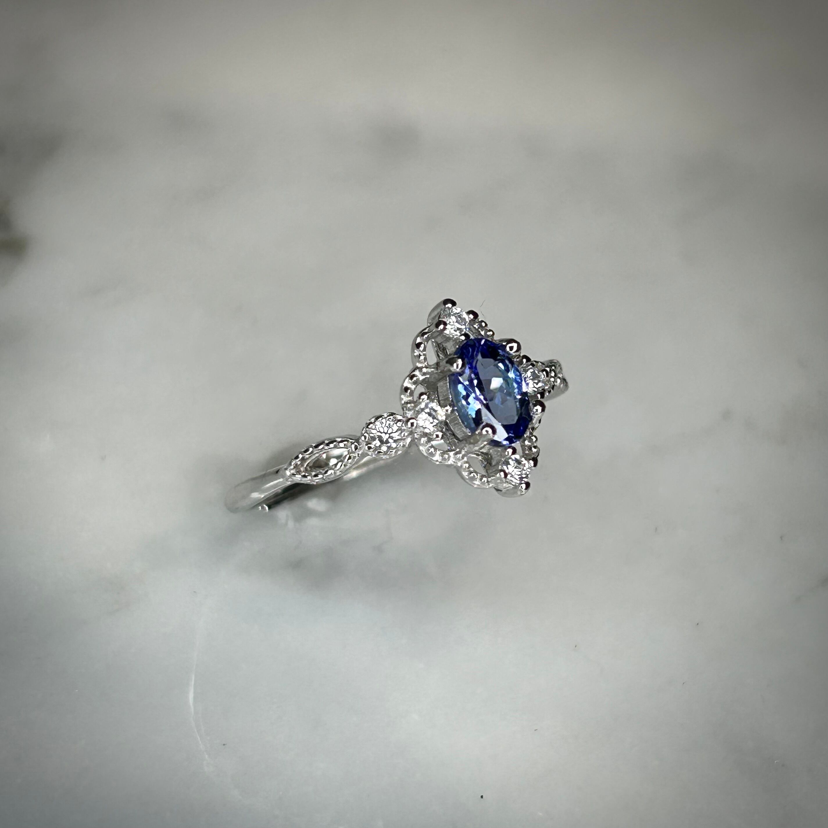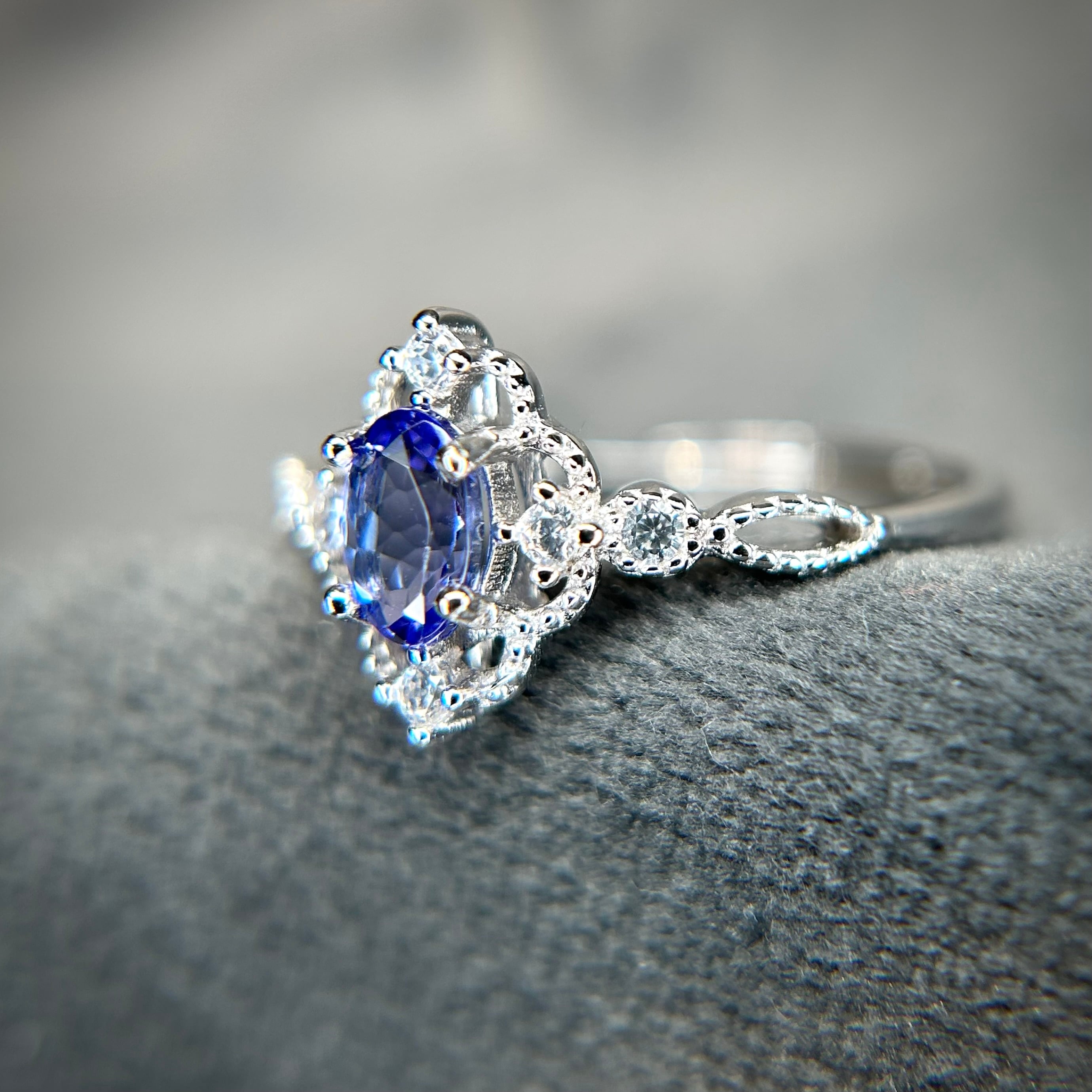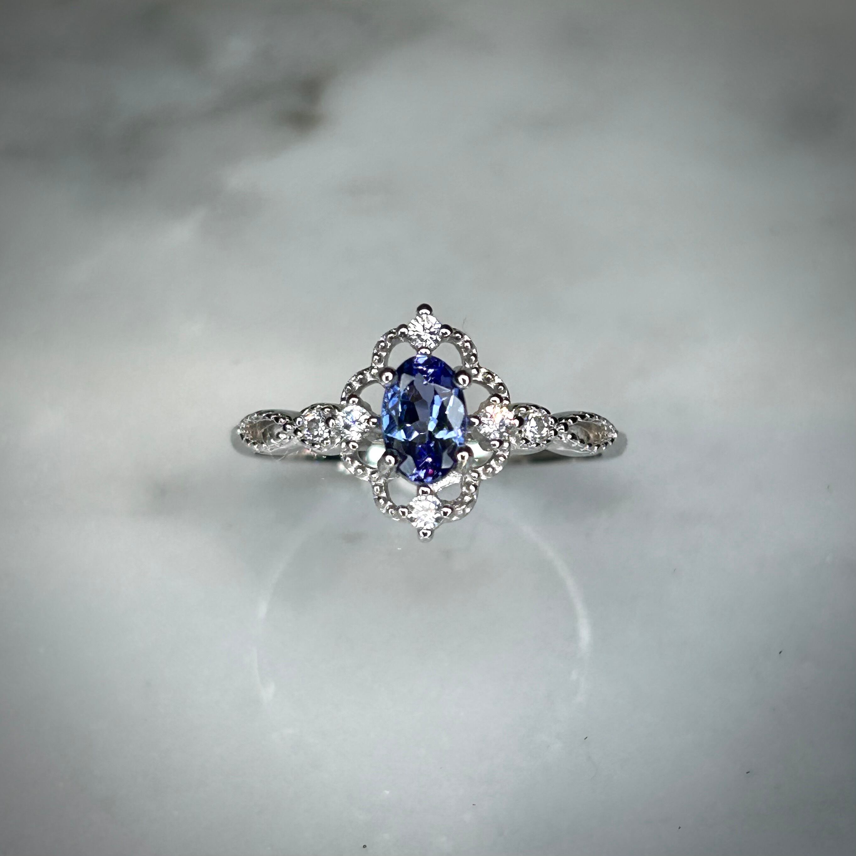 シルバー製、タンザナイトのクラシカルデザインリング。