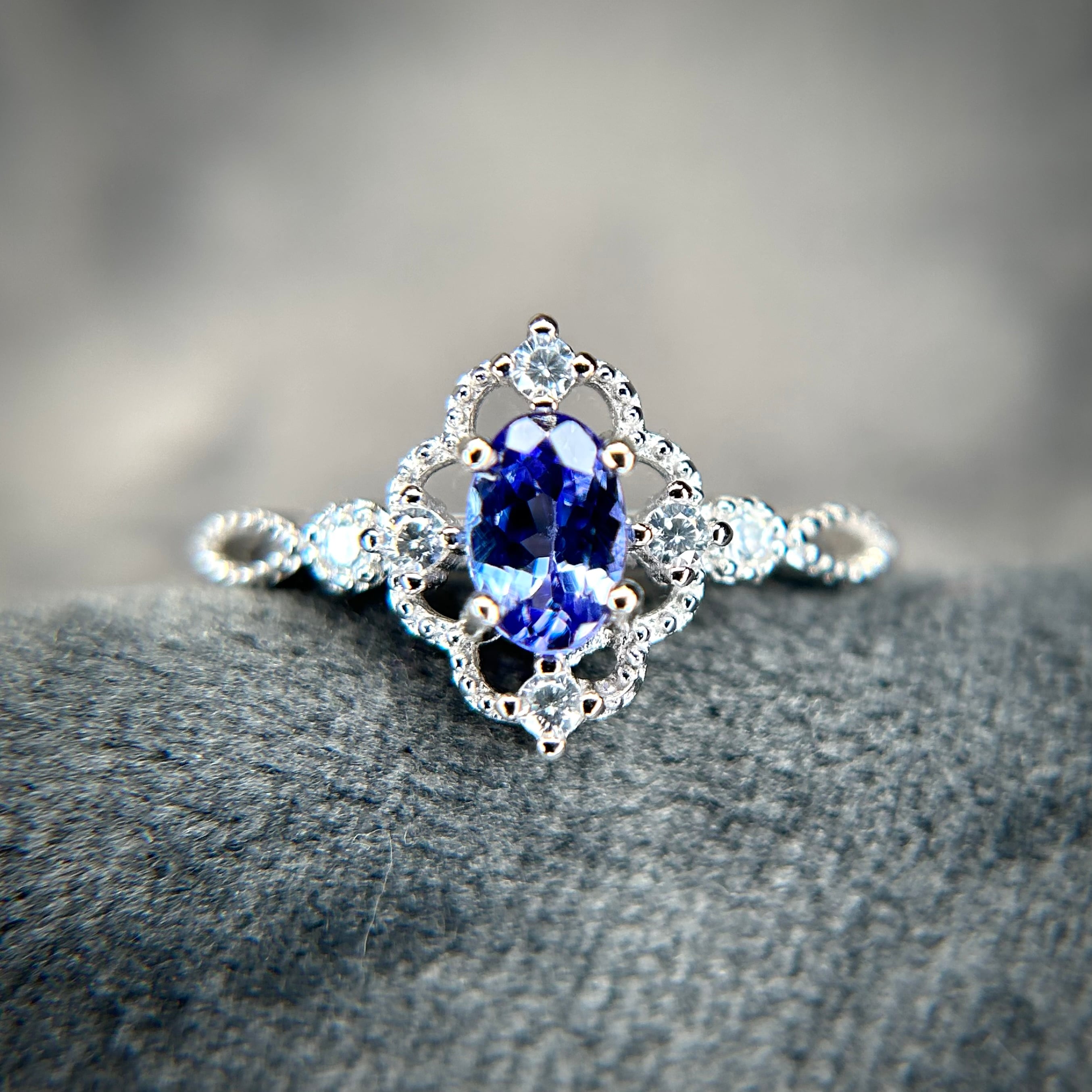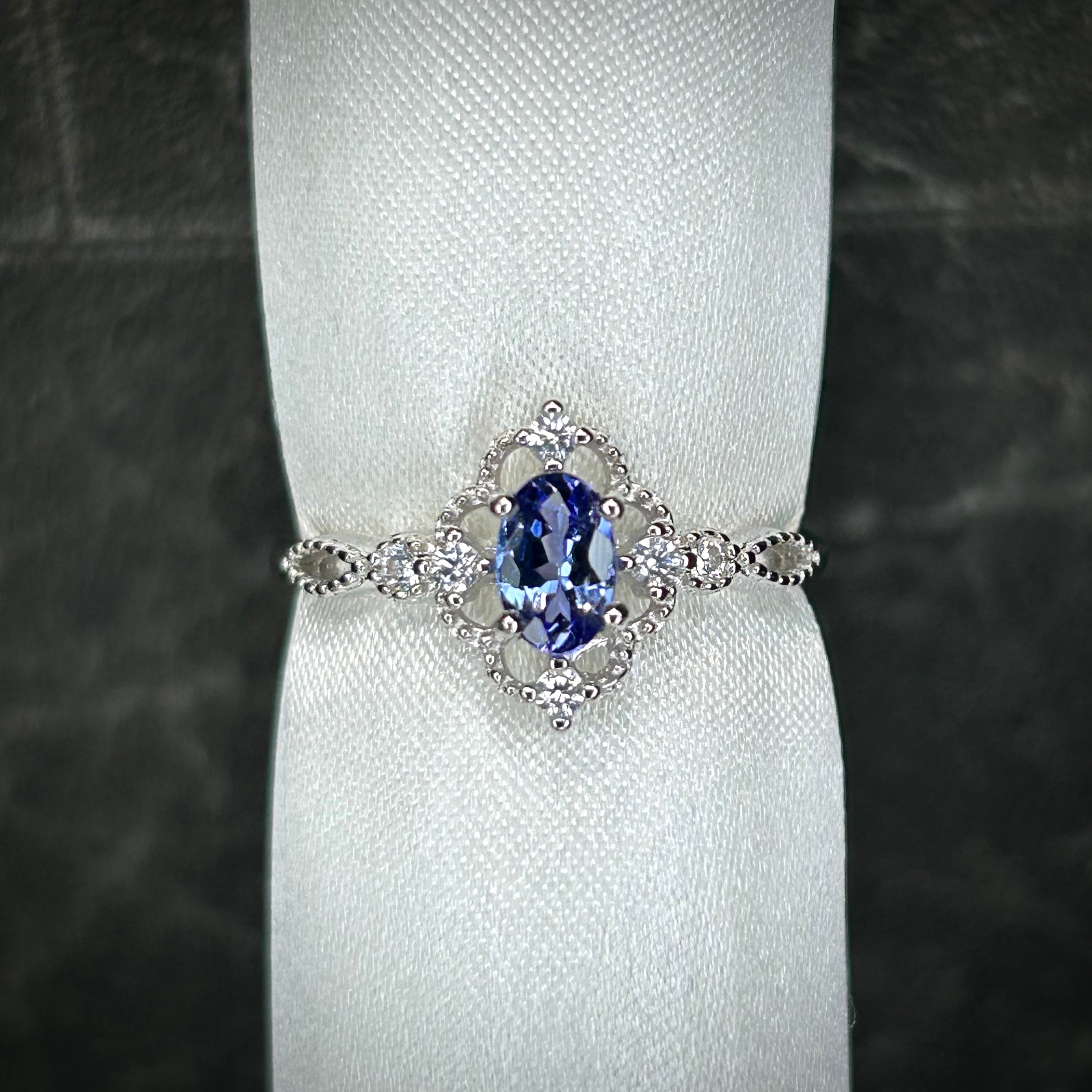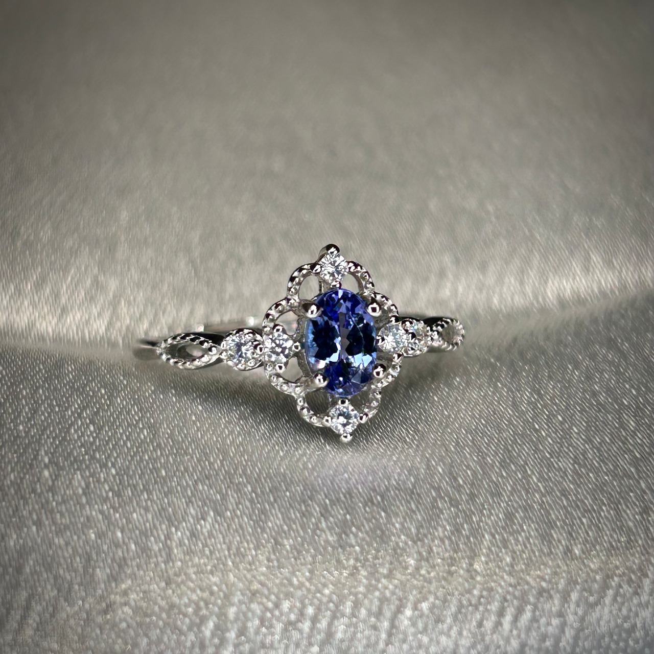 シルバー製、タンザナイトのクラシカルデザインリング。
