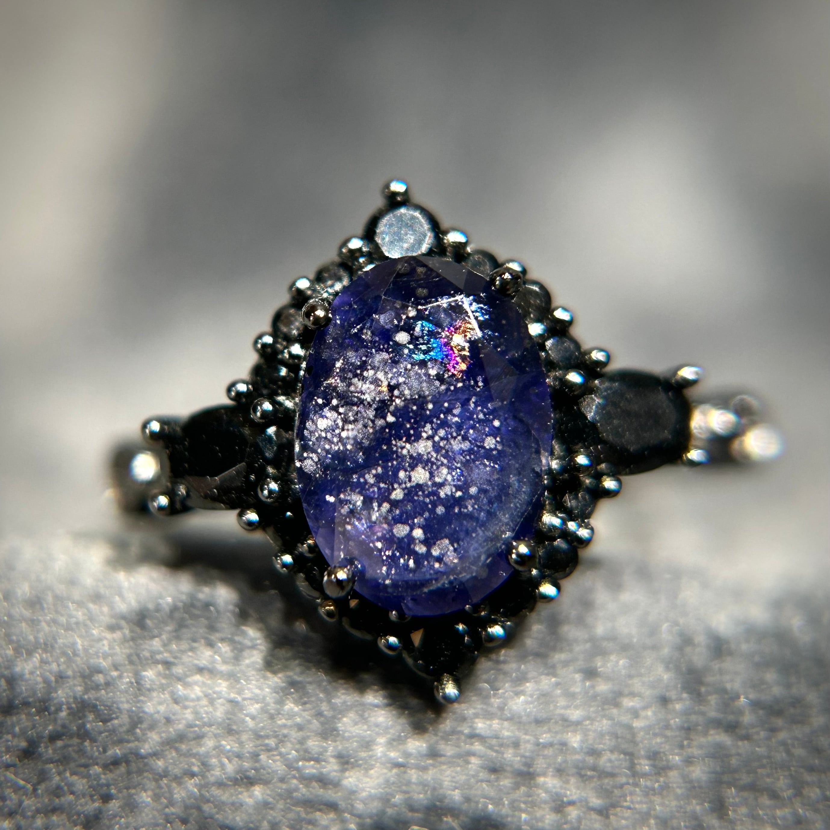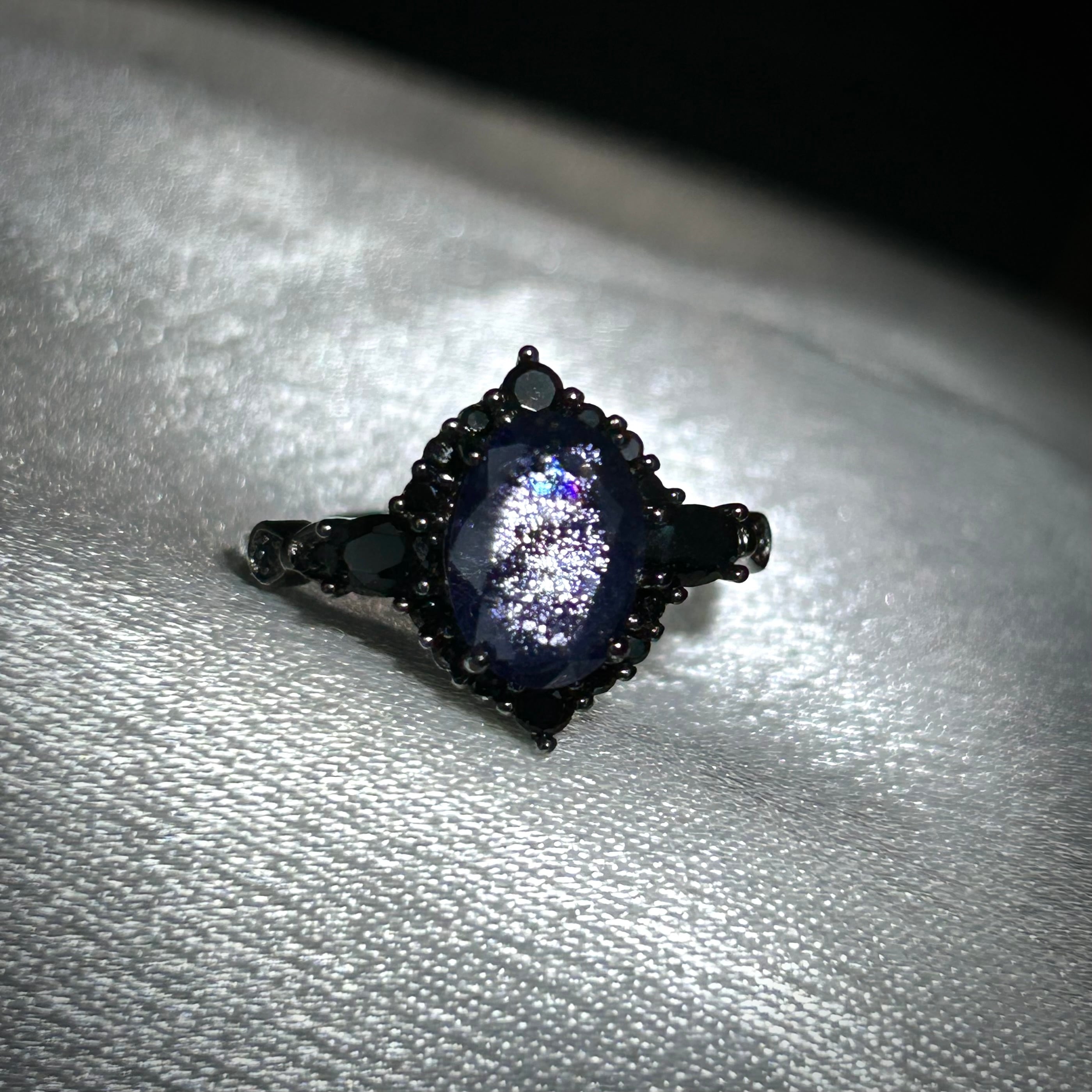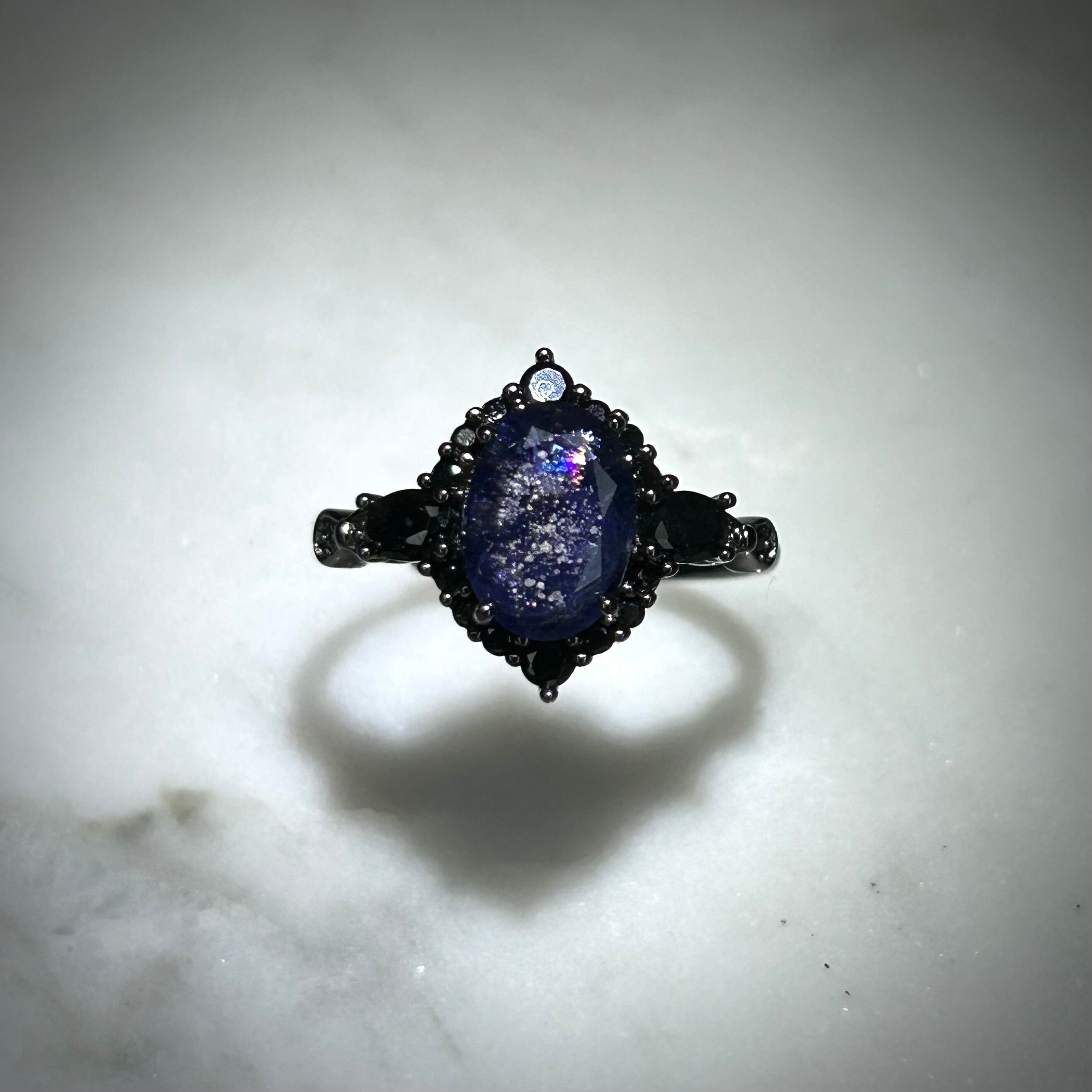 シルバー製ブラックカラー、アイオライトサンストーンのミッドナイトリング。