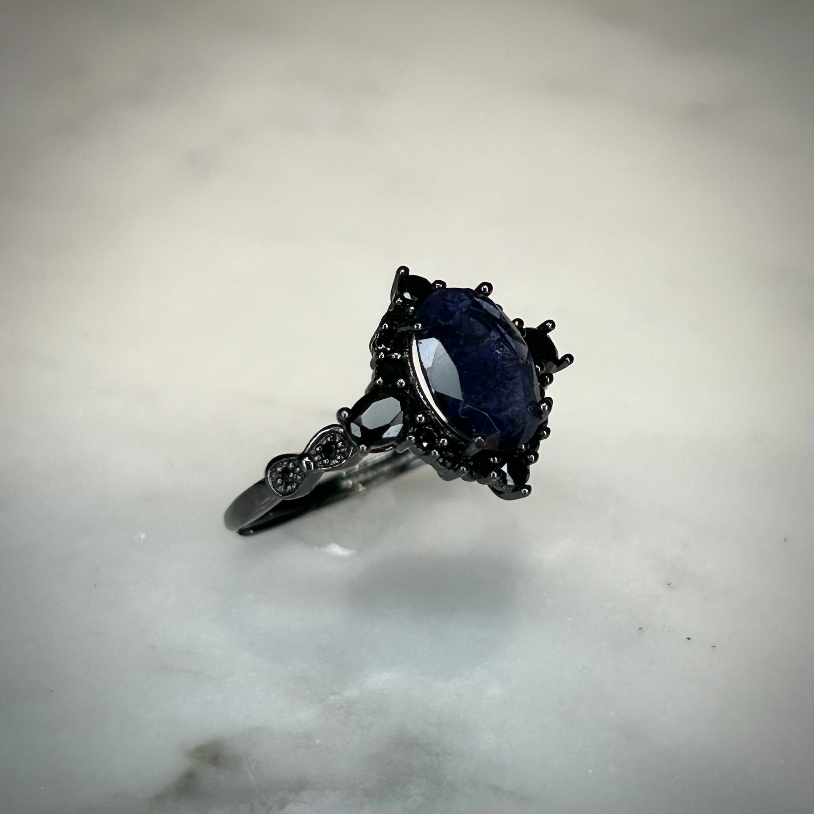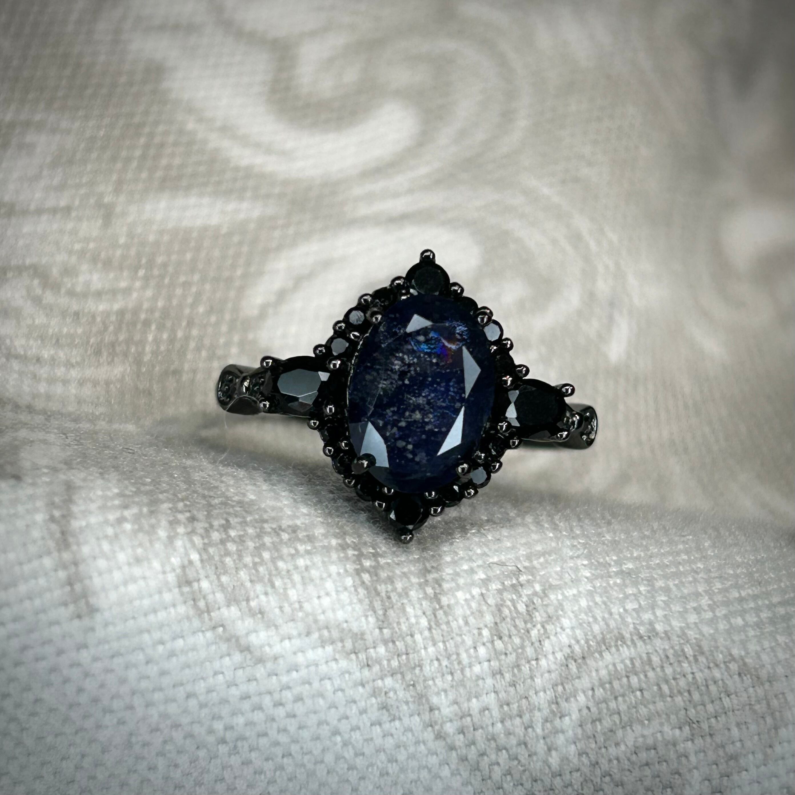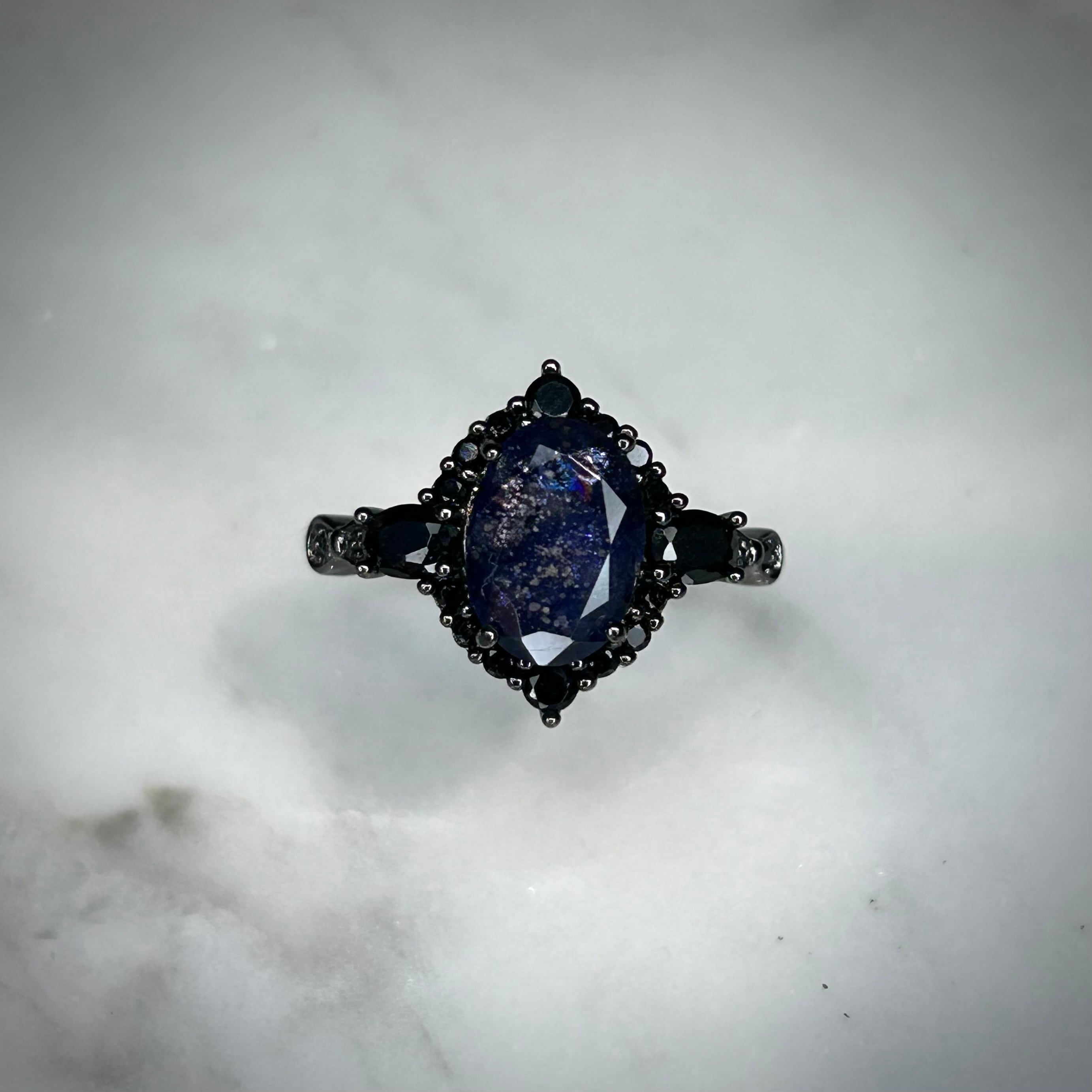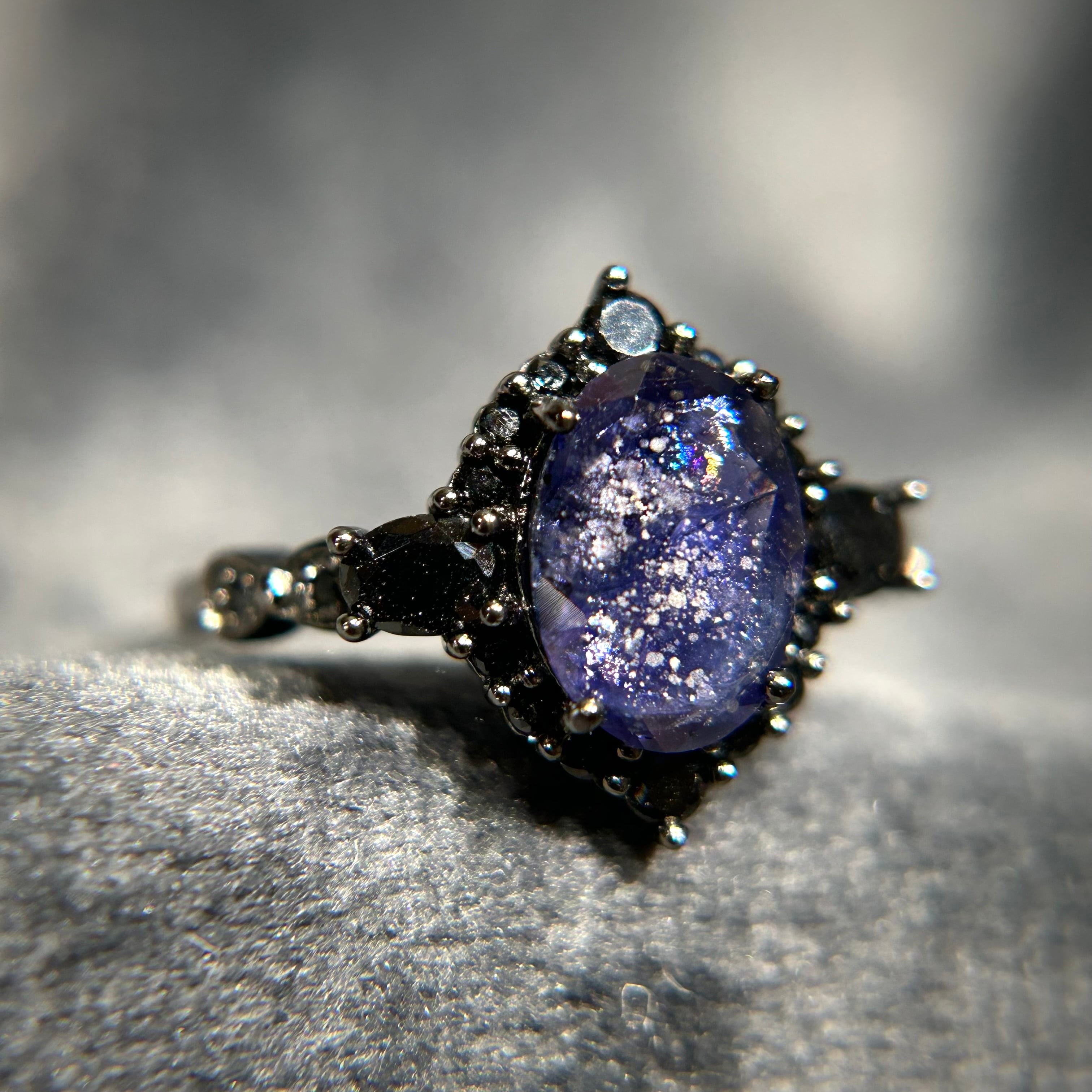 シルバー製ブラックカラー、アイオライトサンストーンのミッドナイトリング。