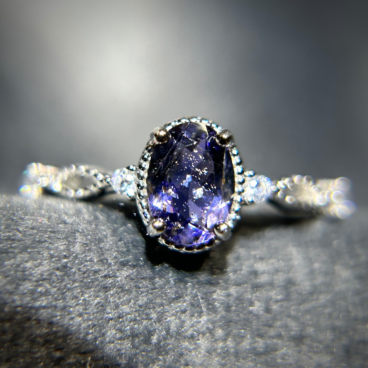 レースのような細やかなデザインが、アイオライトサンストーンにマッチしたリングです。