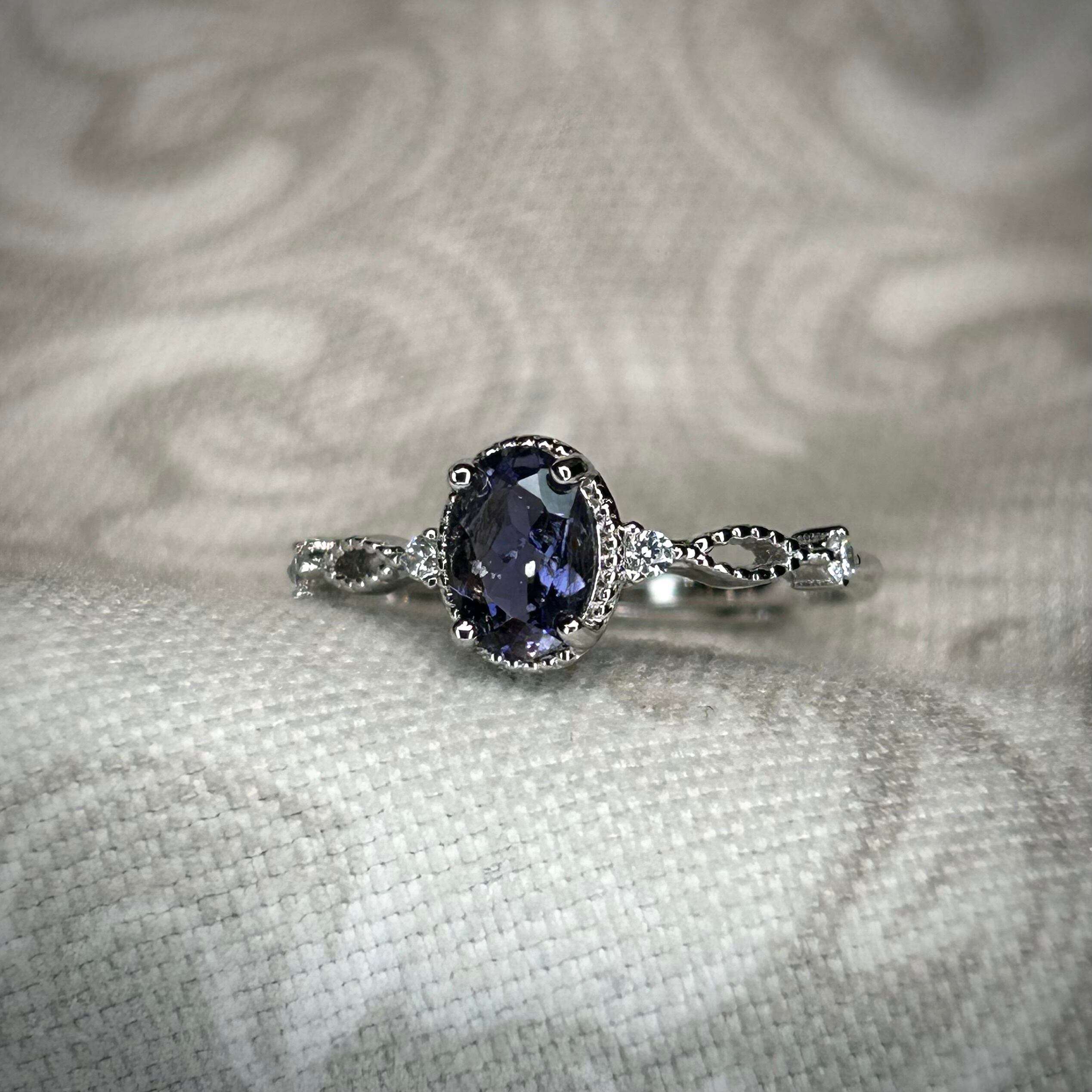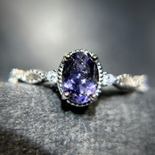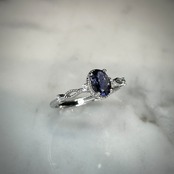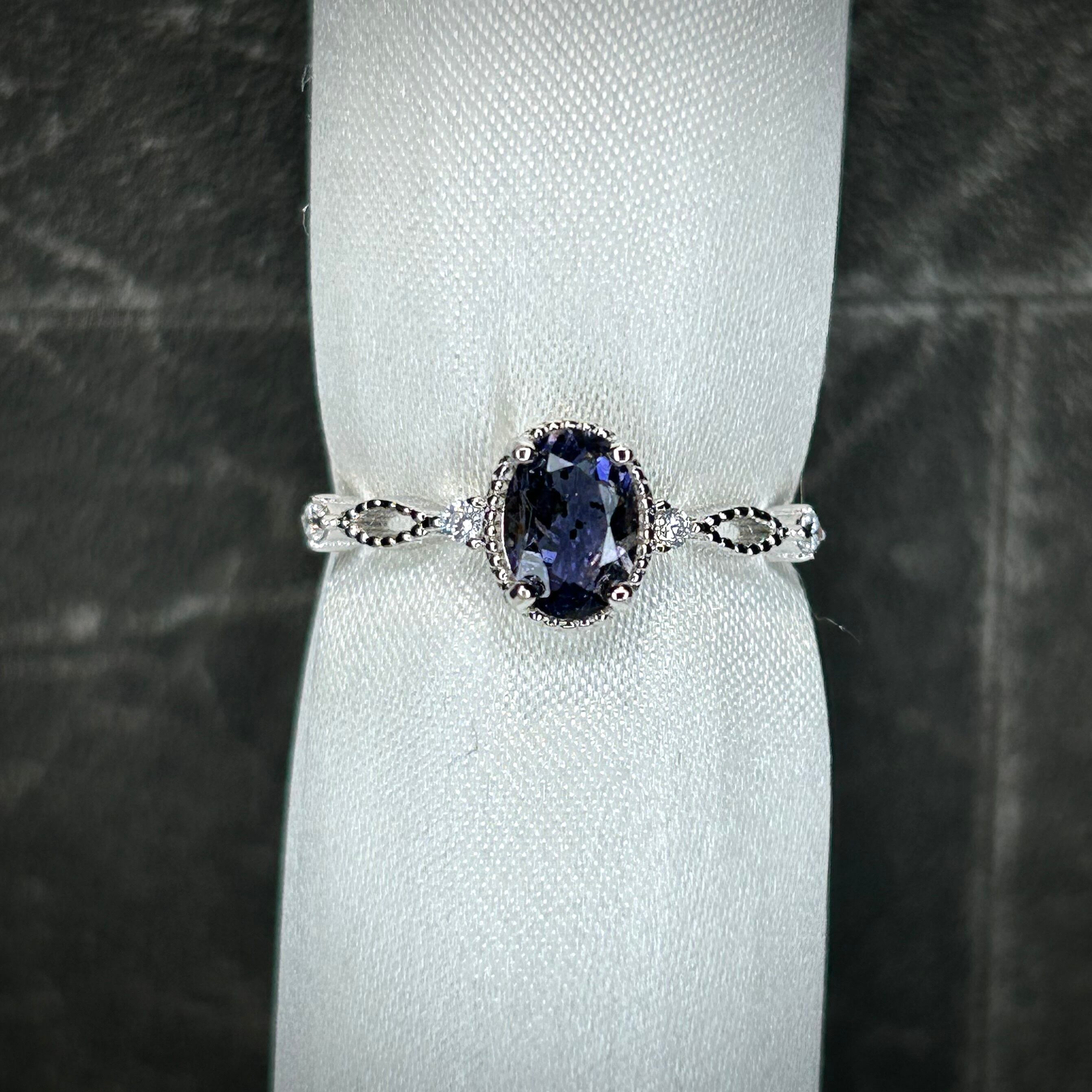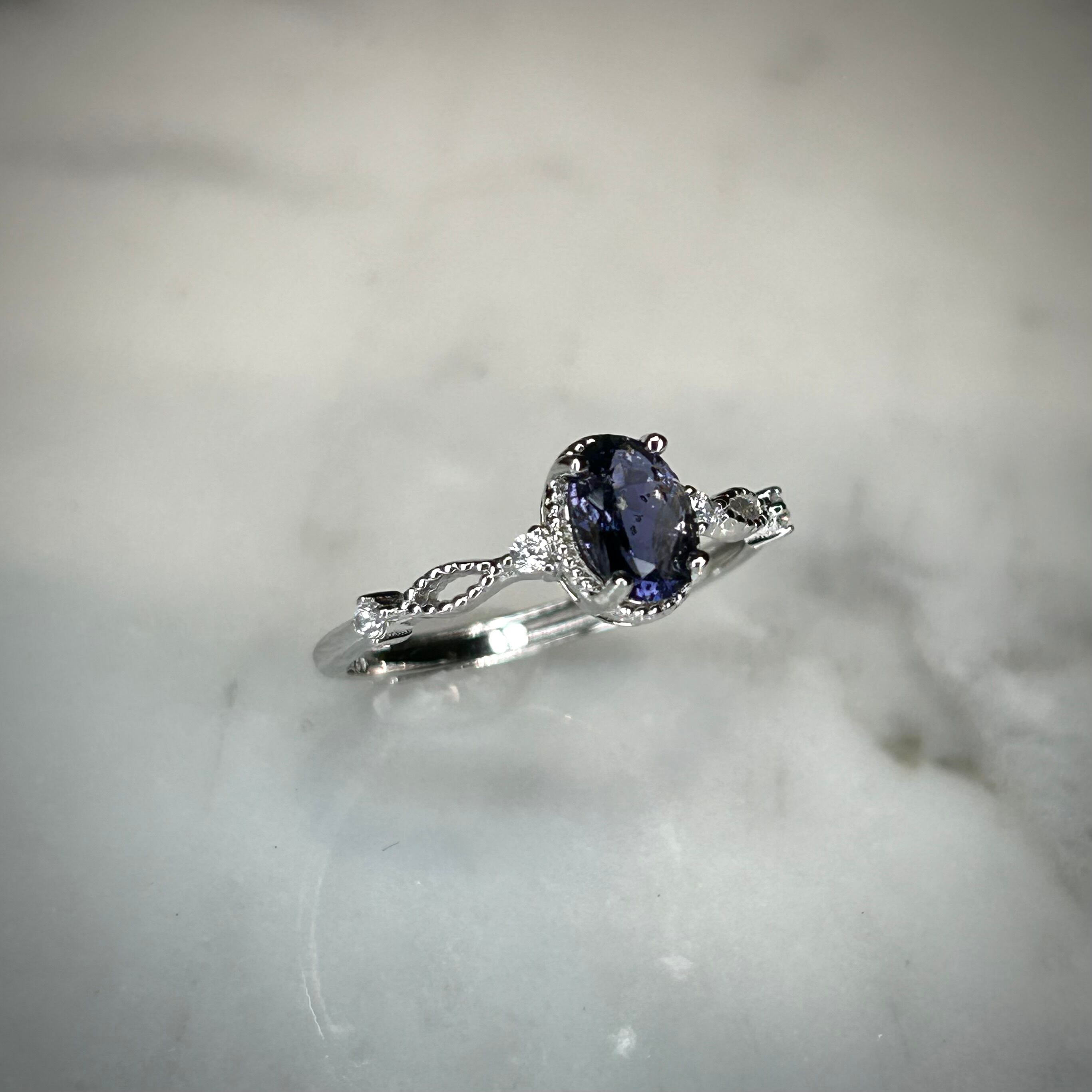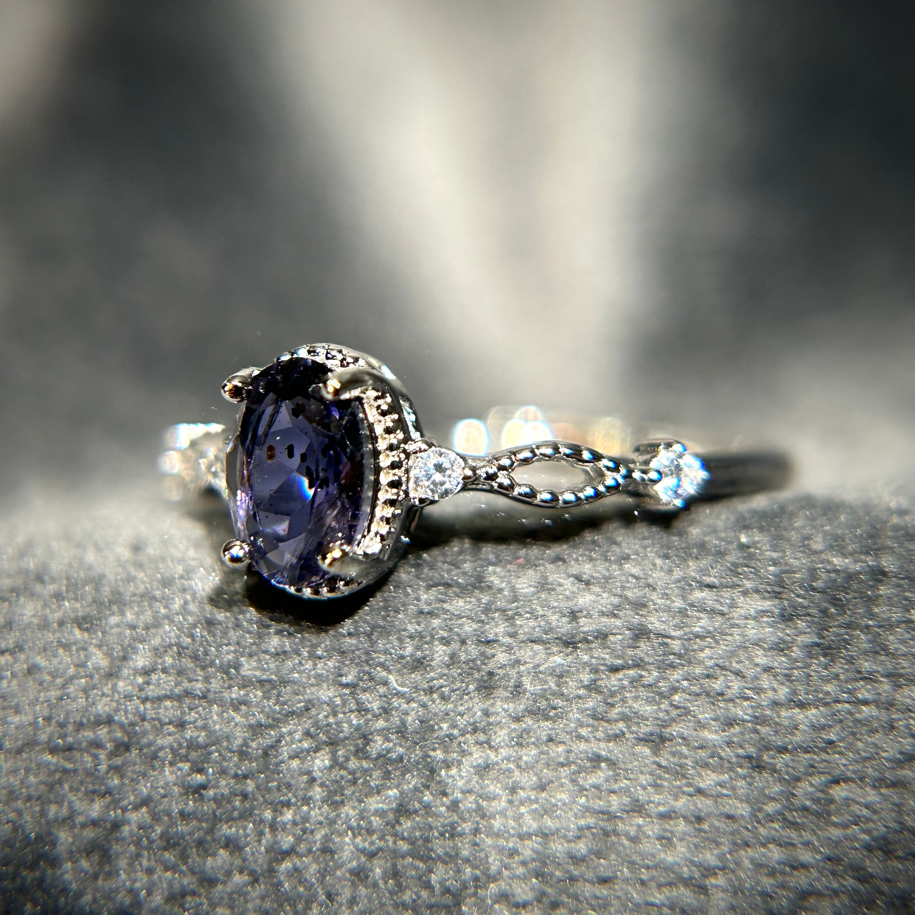 クラシカルなデザインに、藍色のアイオライトサンストーンが落ち着きのある雰囲気です。