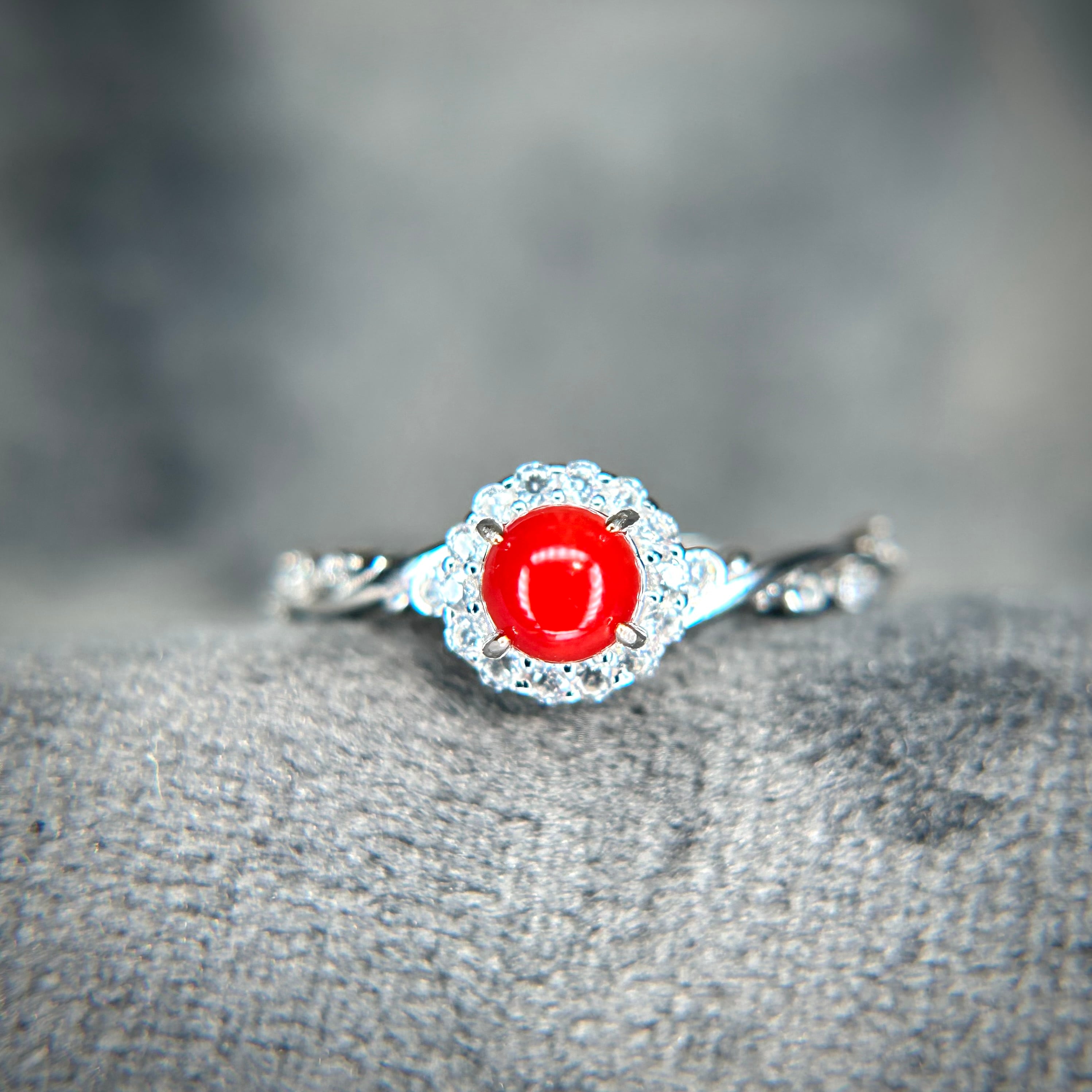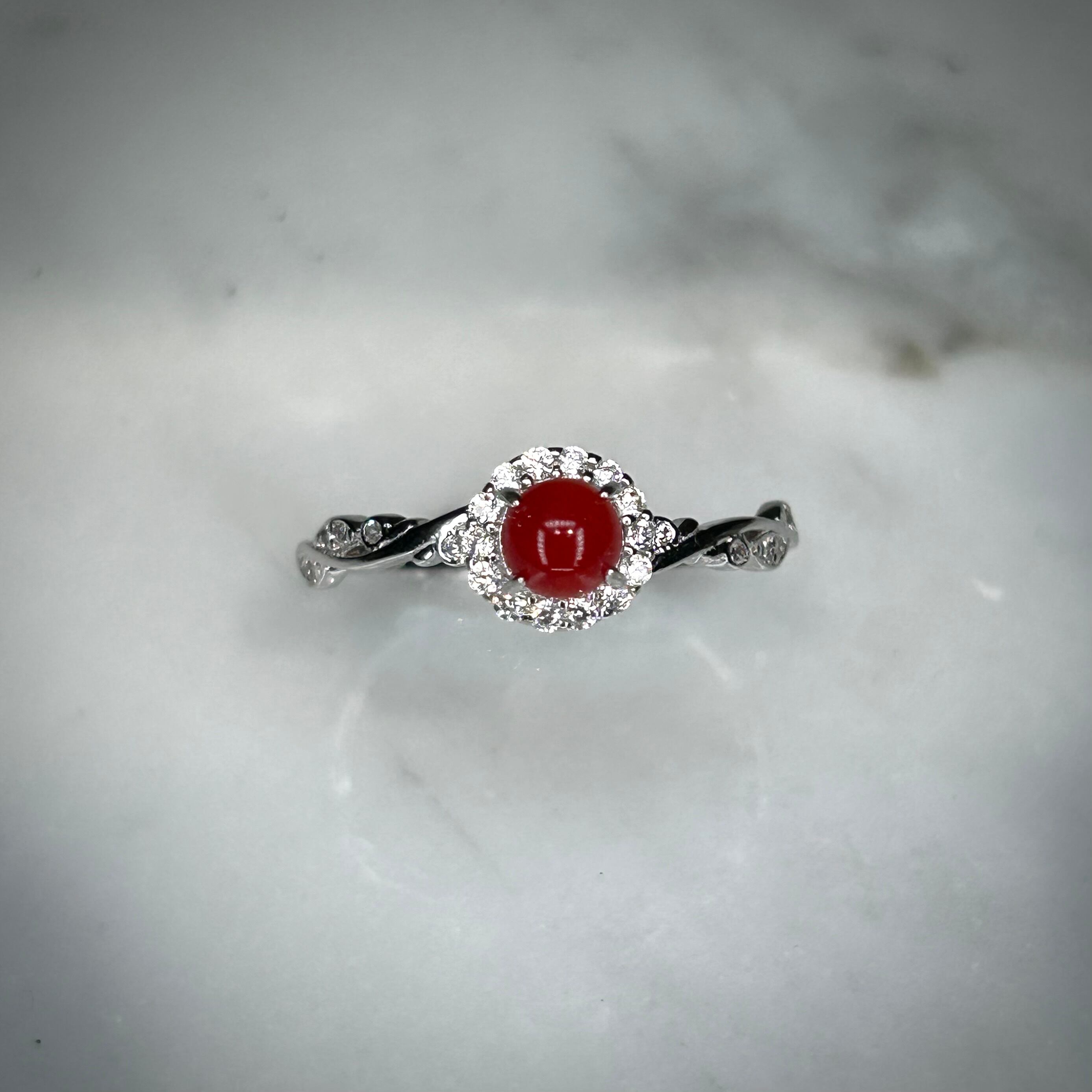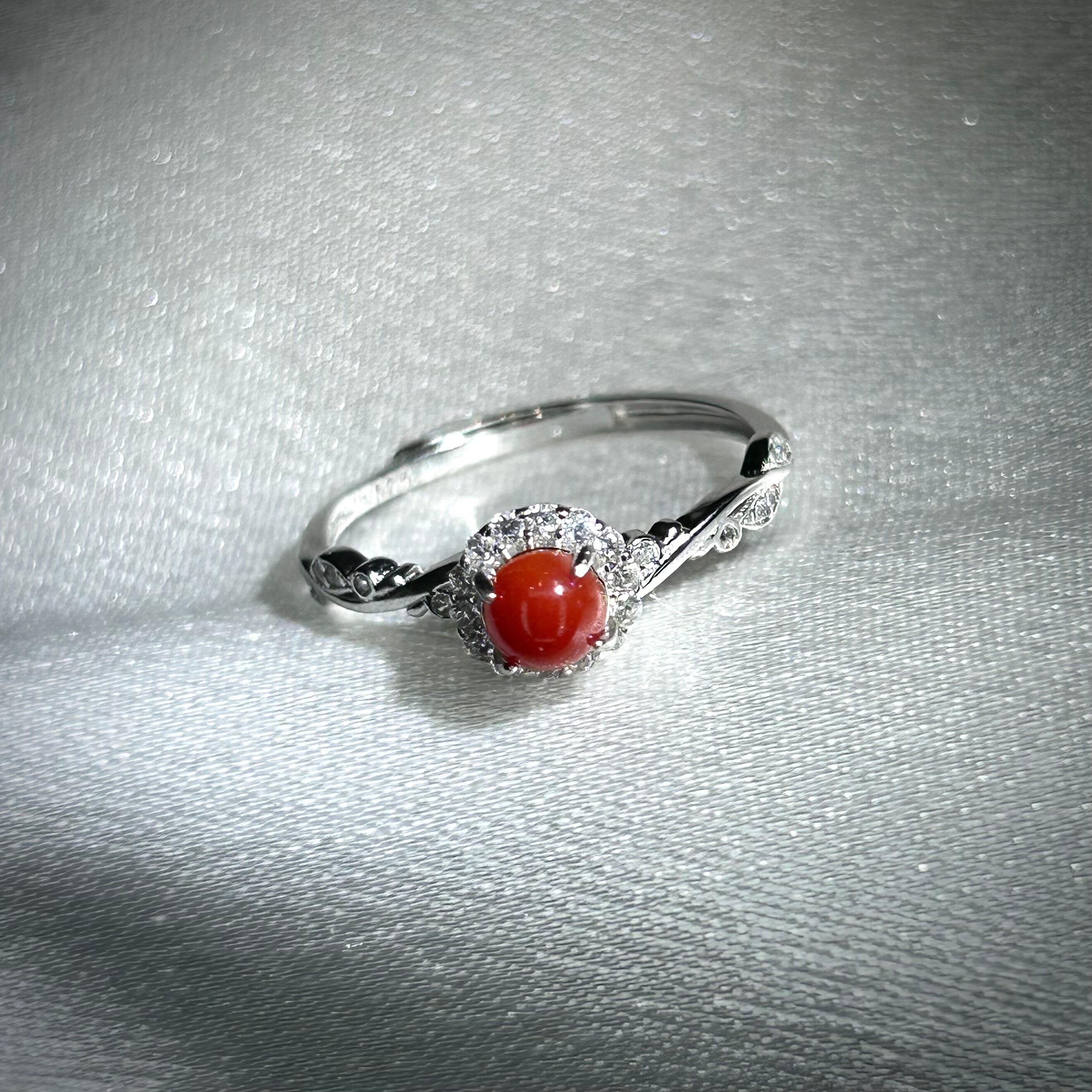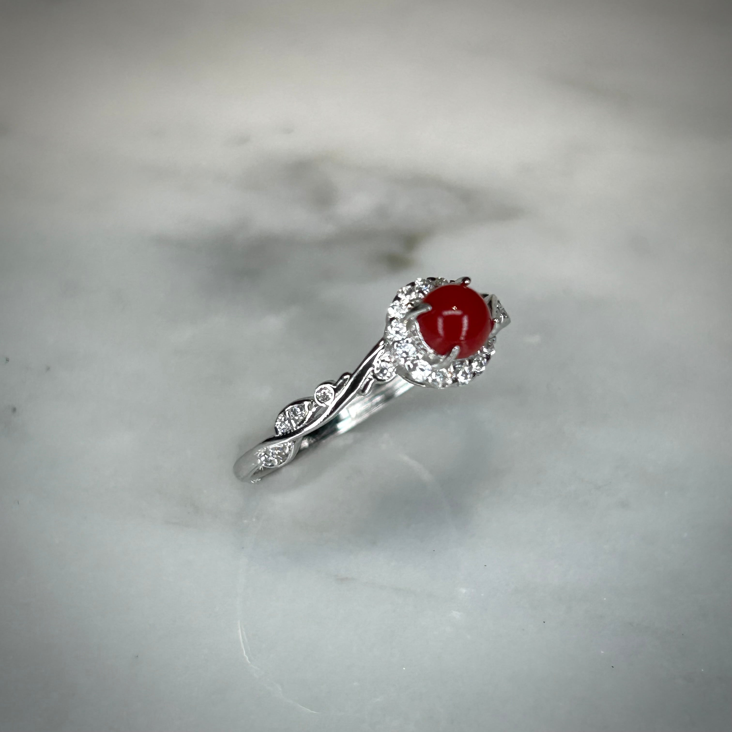 ナチュラル感のあるデザインに品のある血赤珊瑚が映えるリング。