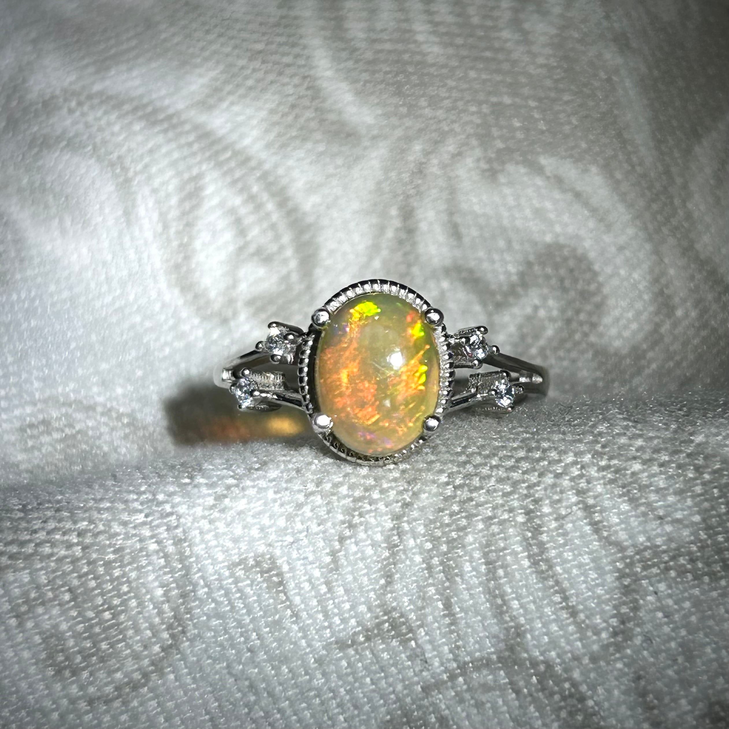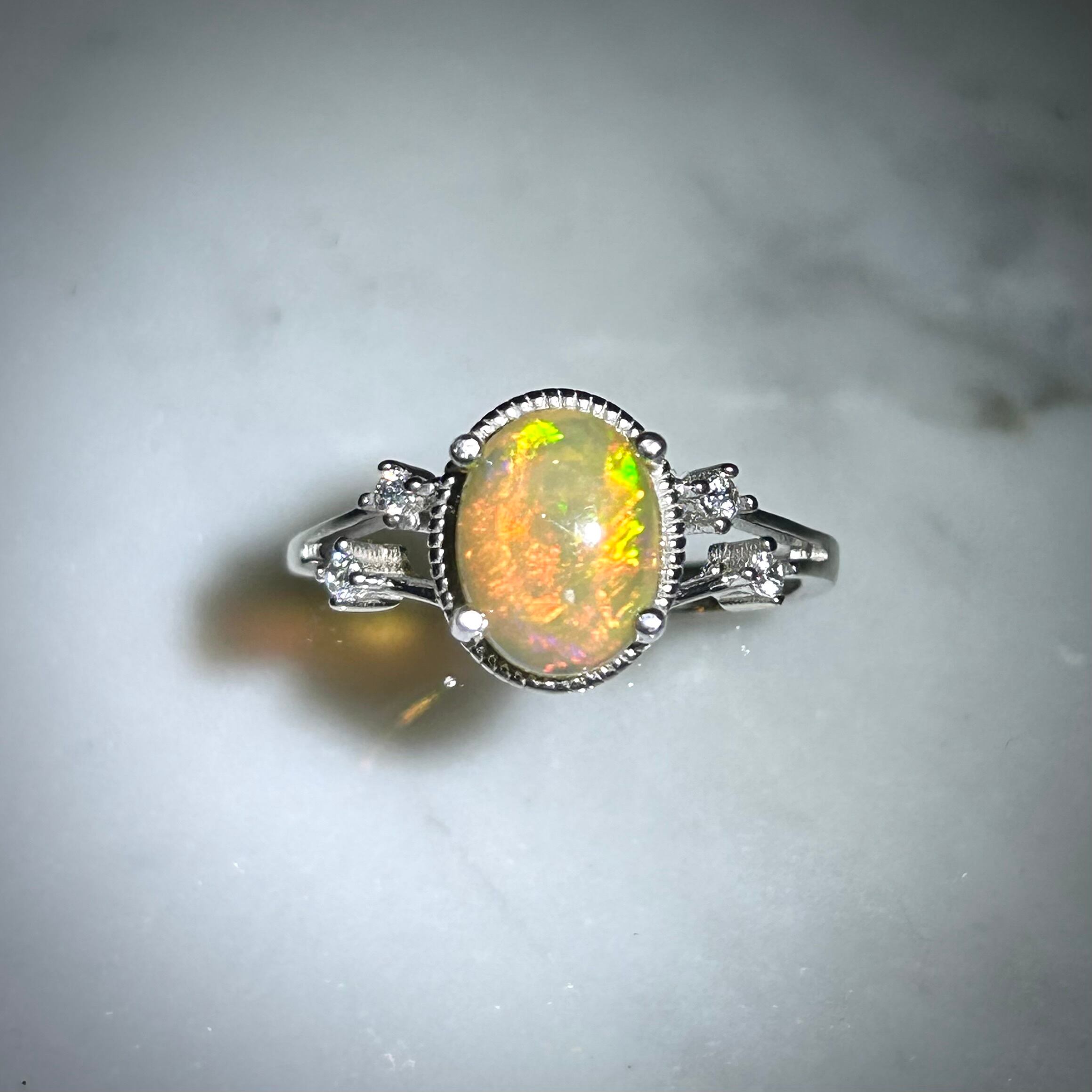 グリーン・イエロー・レッドと浮かび上がる遊色が幻想的なリング。