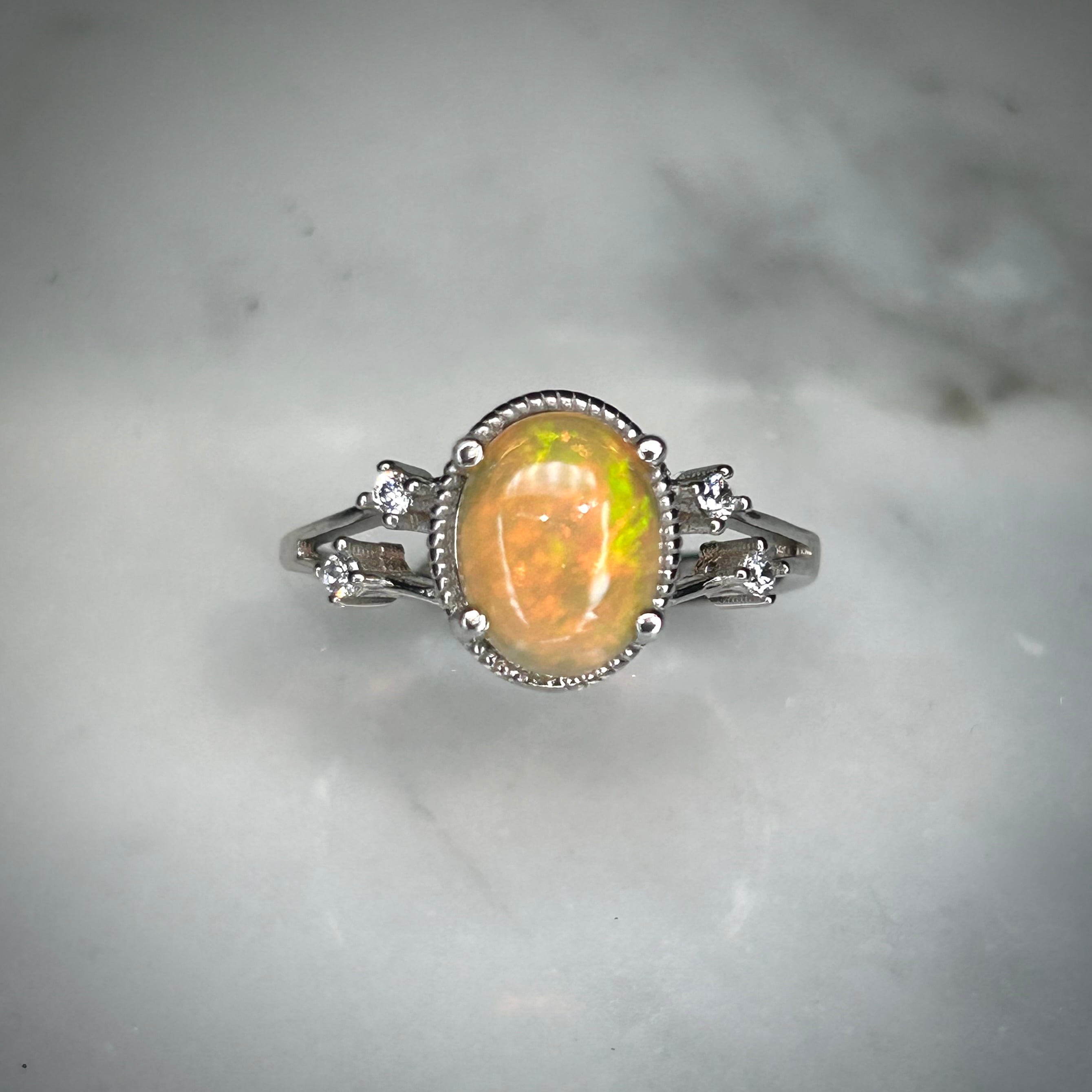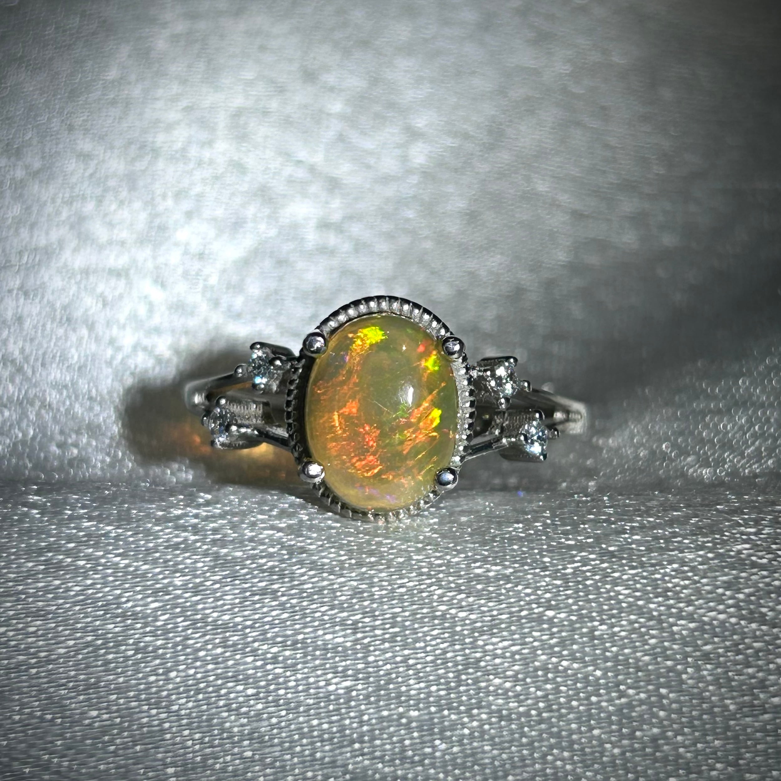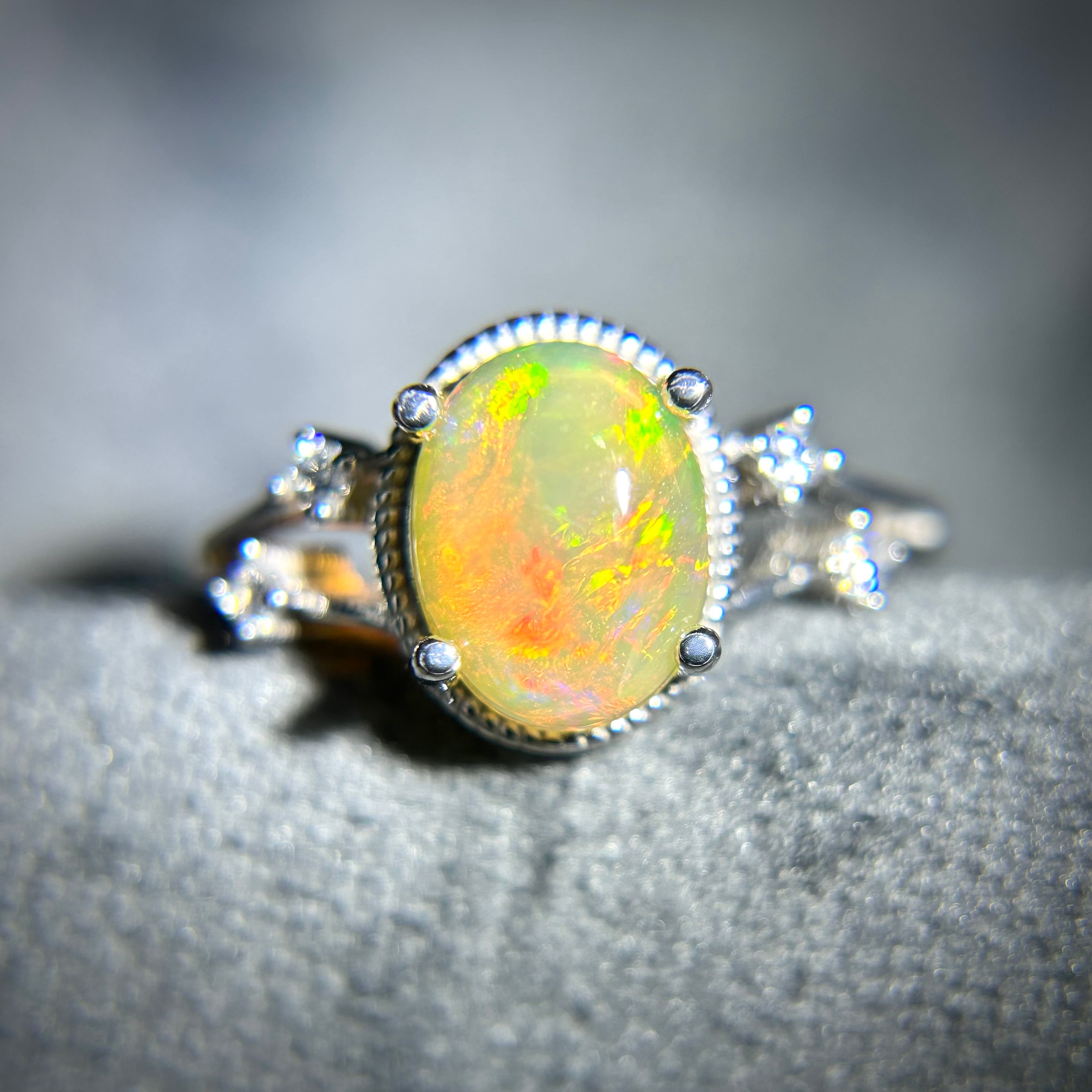 さりげなく両サイドに配置された脇石が派手過ぎず、オパールの存在感を引き立てます。