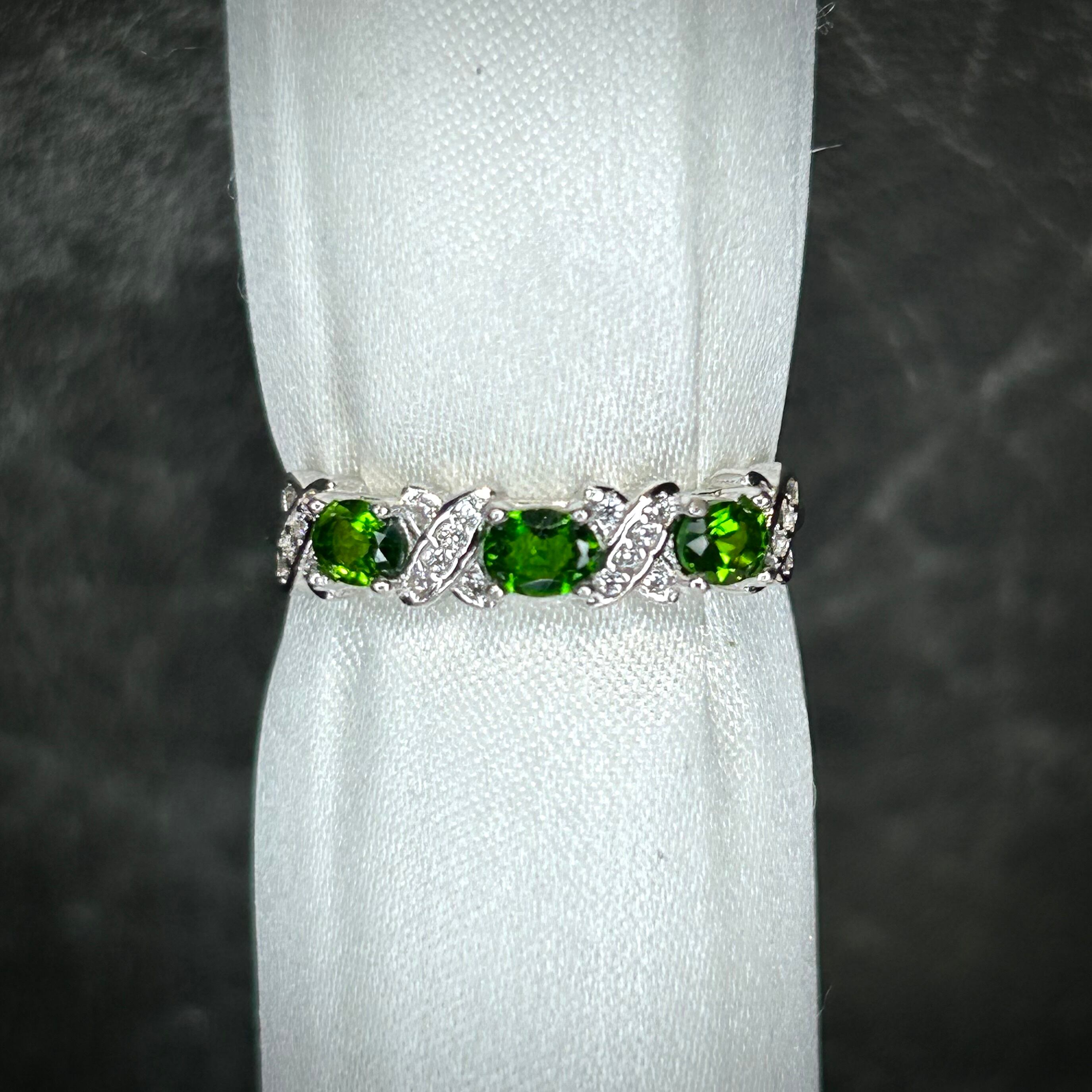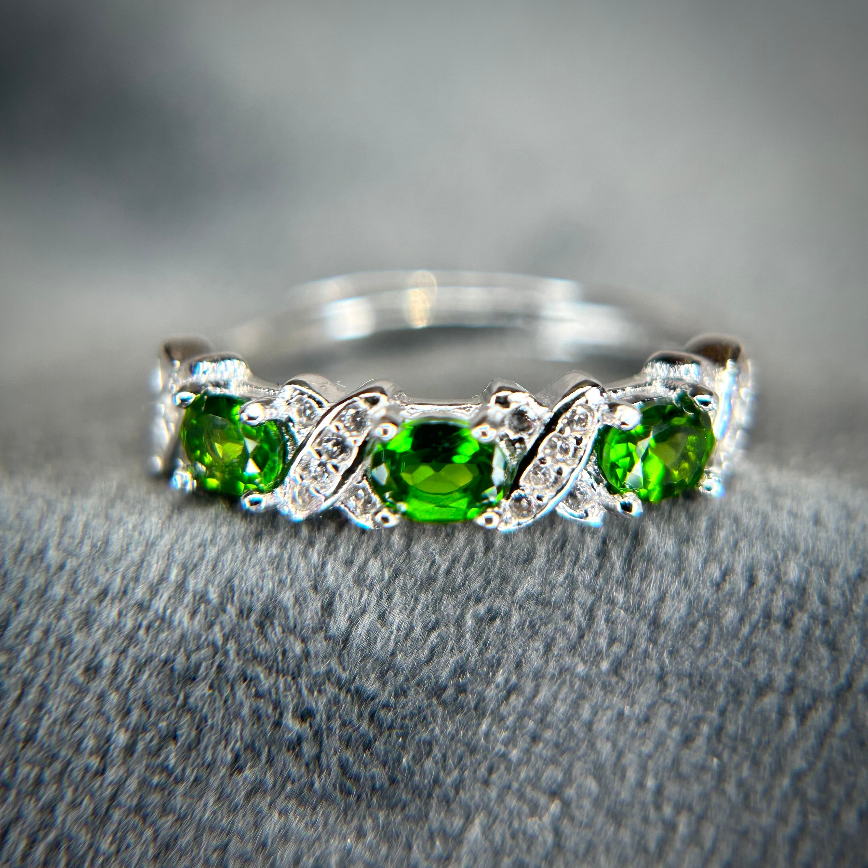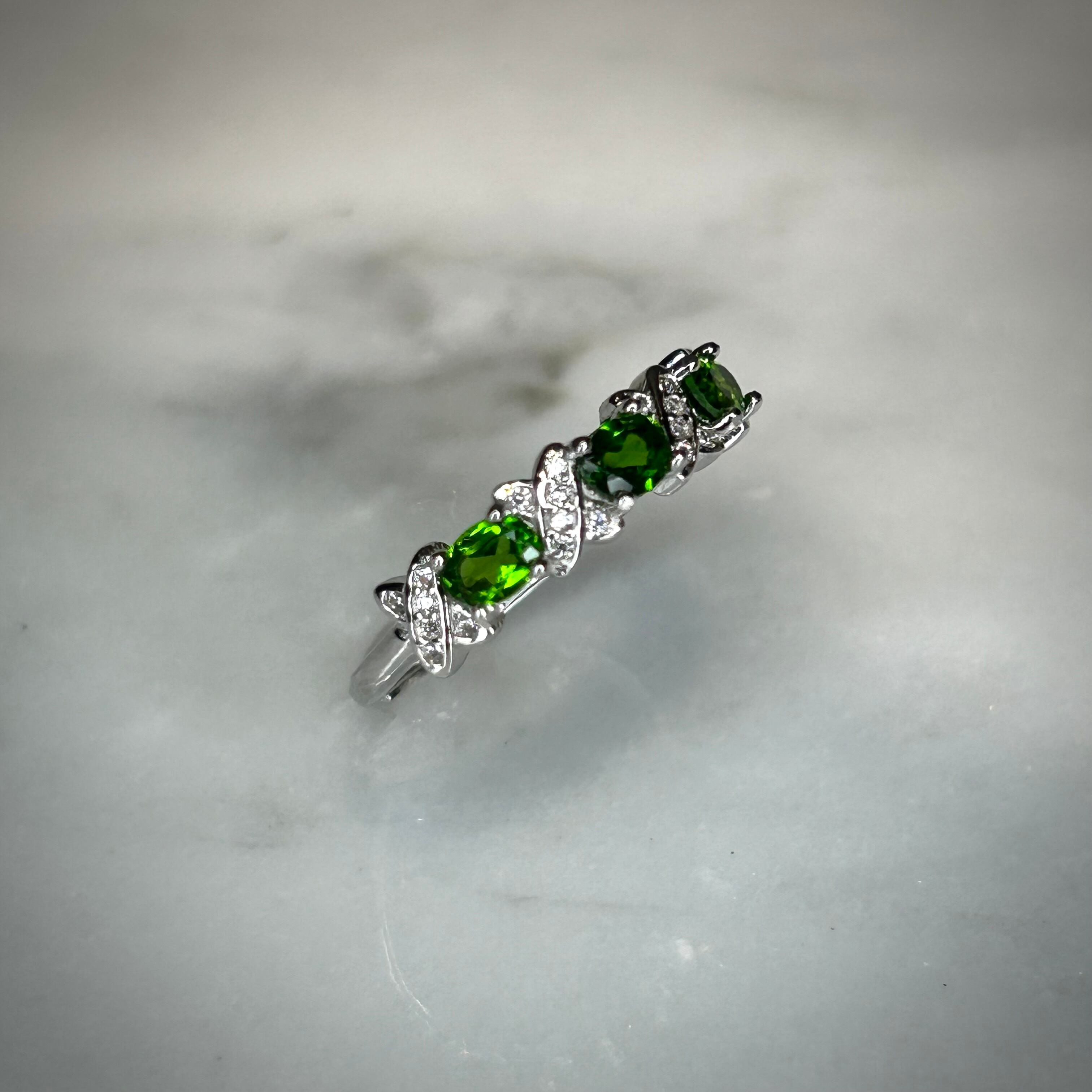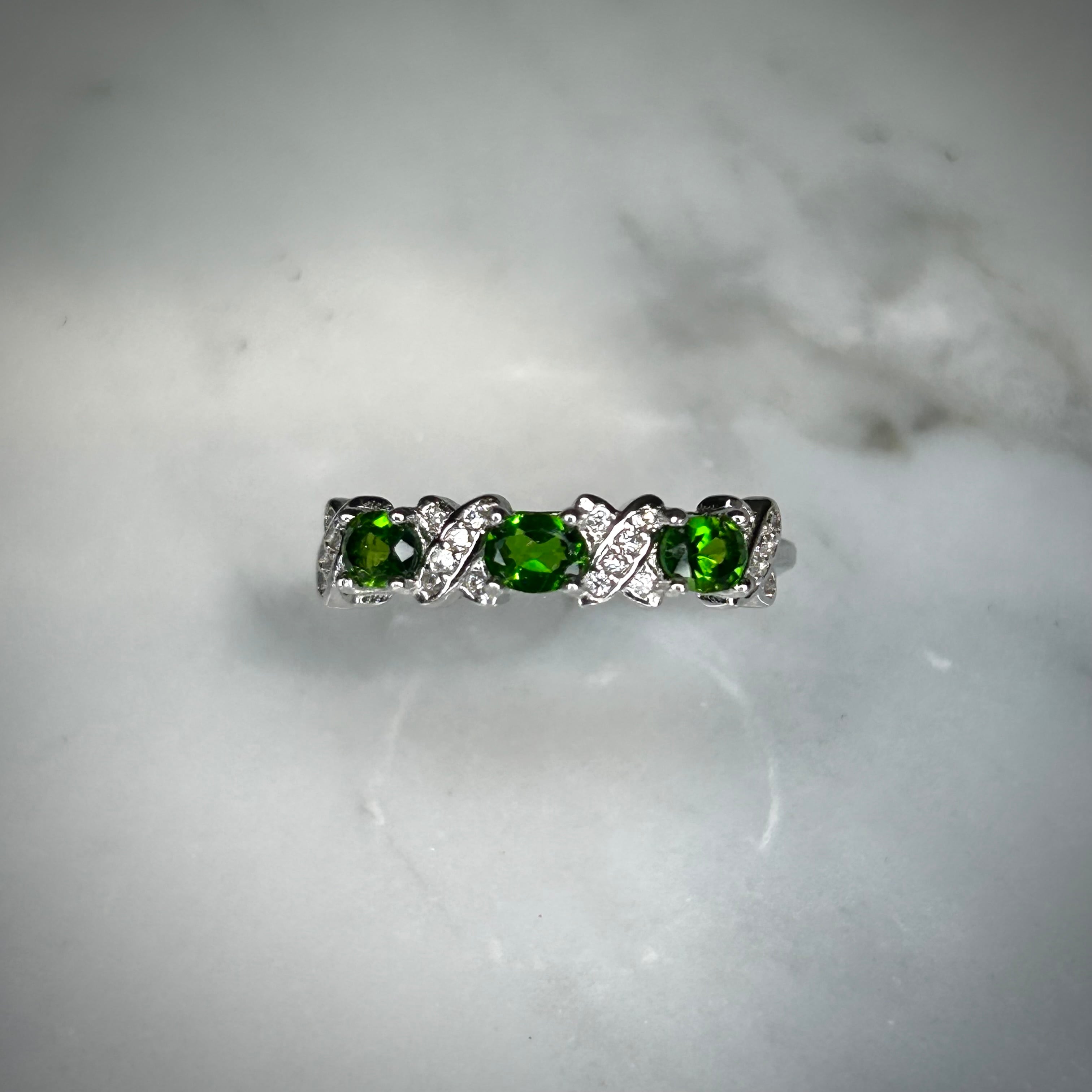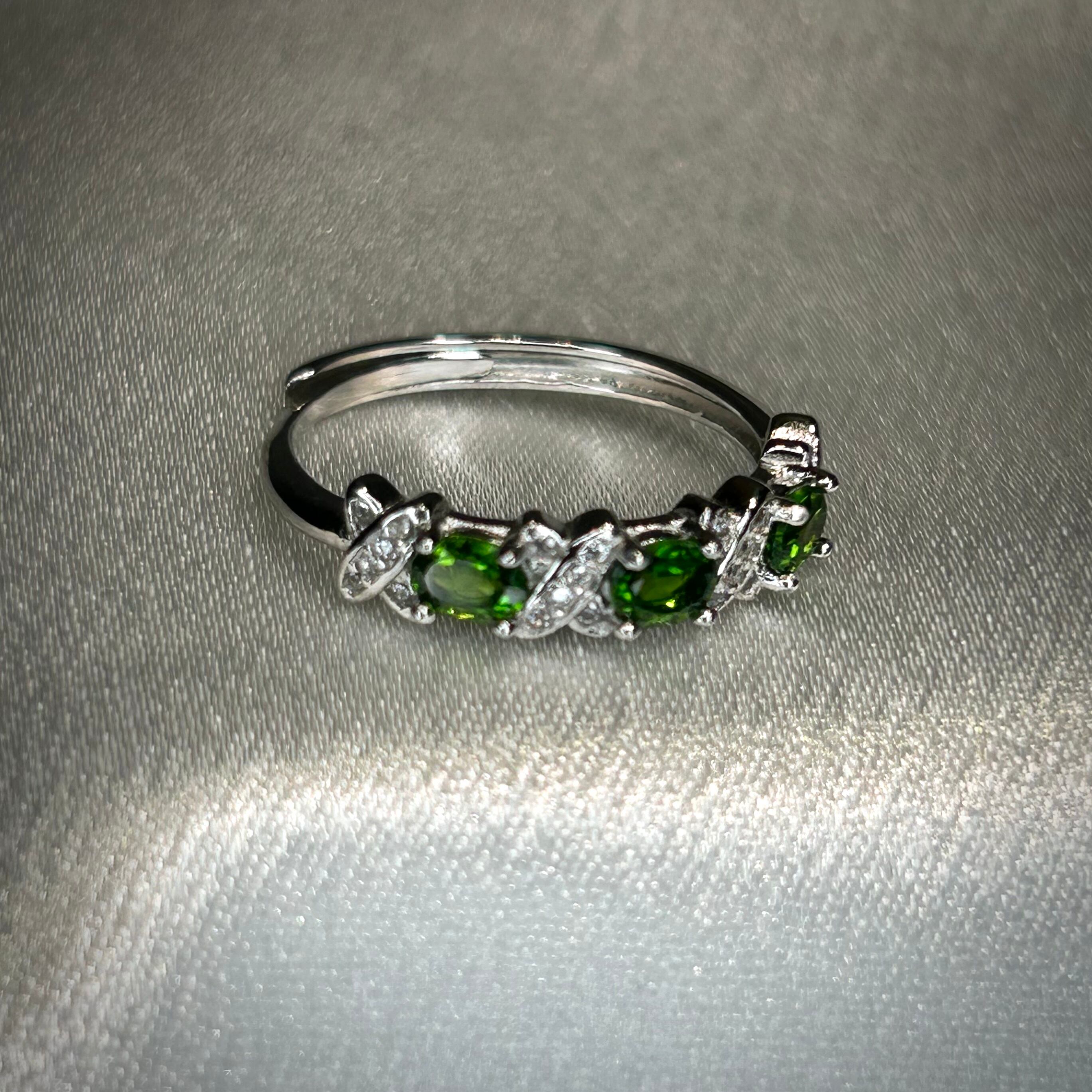 シルバー製、クロムダイオプサイトのオーバル3石リング。