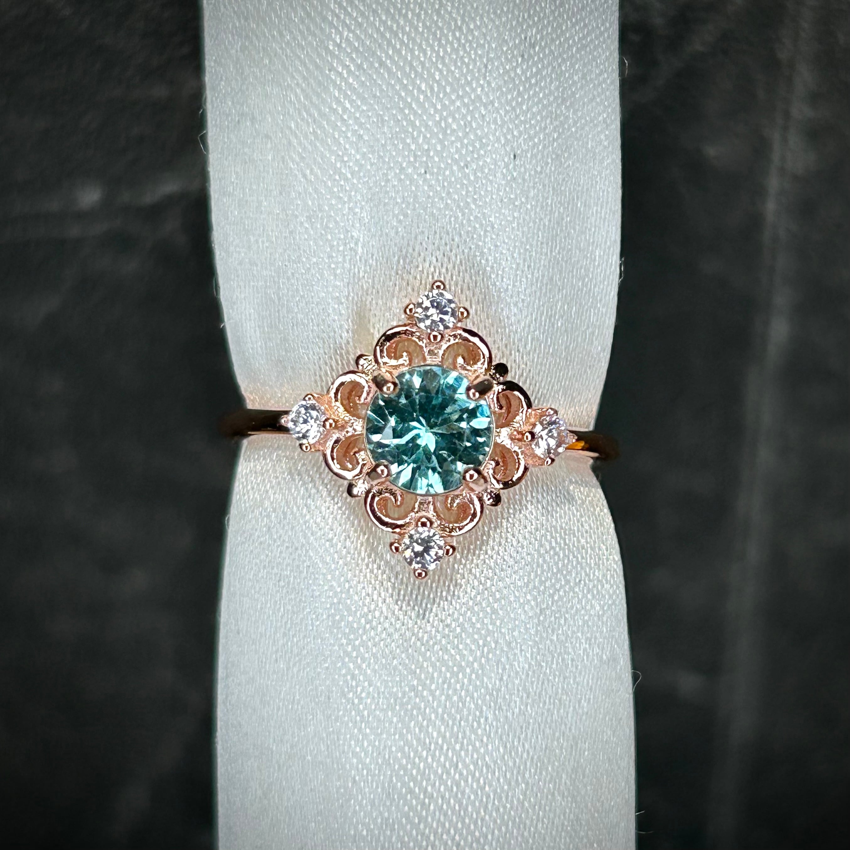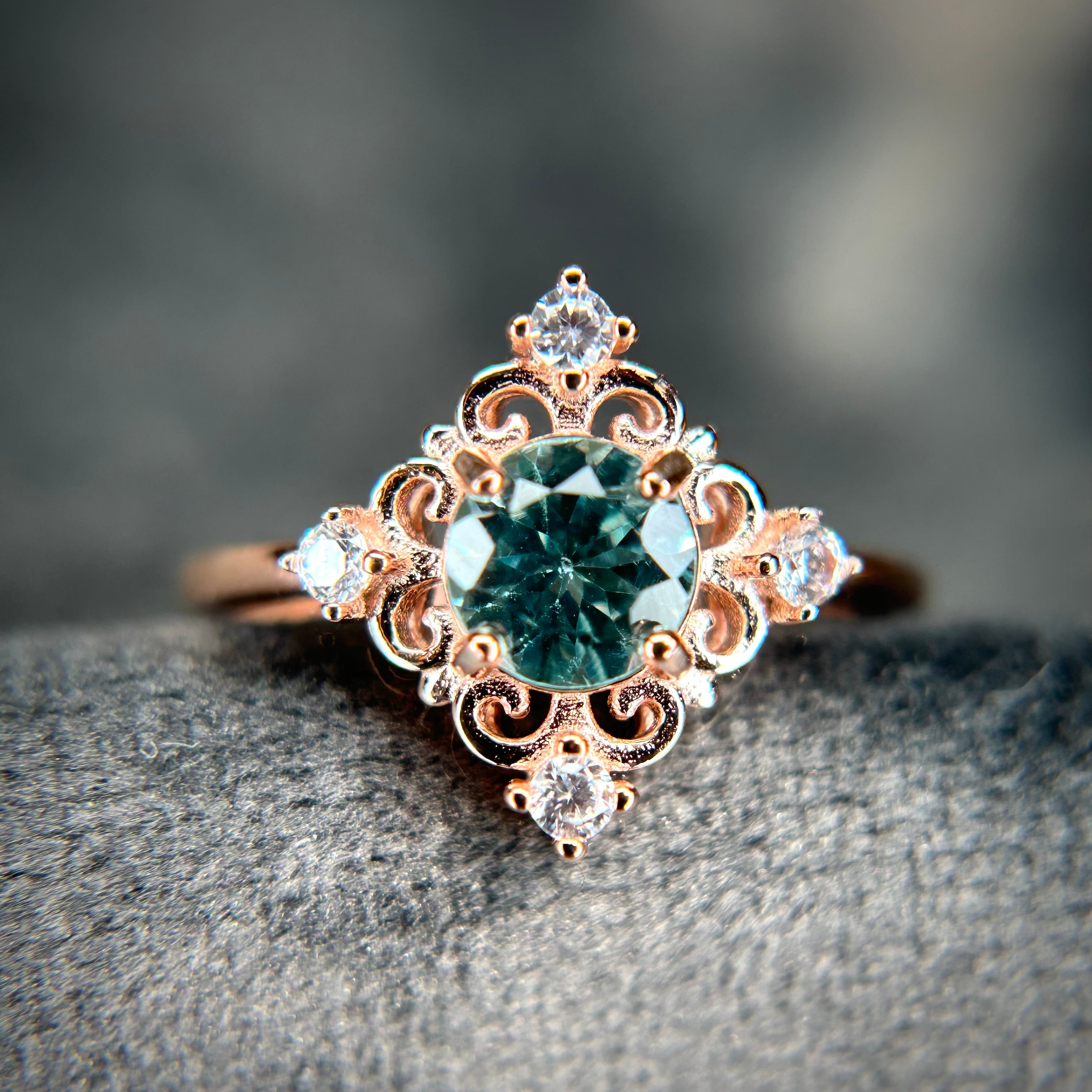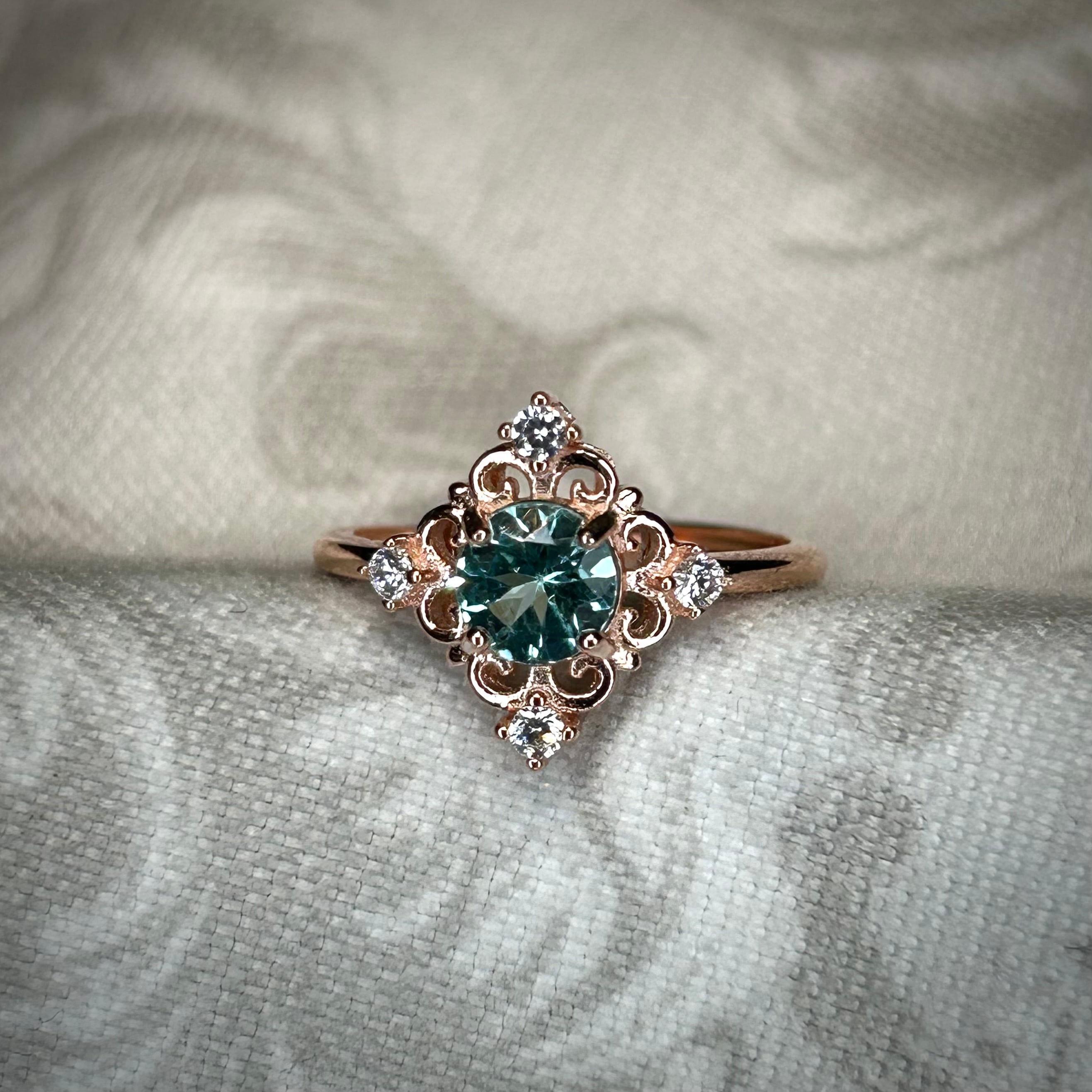 シルバー製ピンクゴールドカラー、アパタイトのアンティークデザインリング。