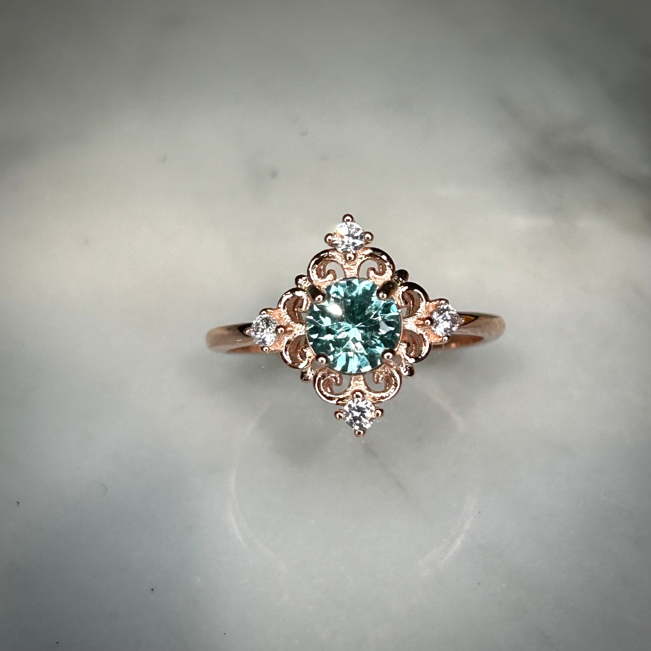 アンティーク感のあるデザインと爽やかなカラーのアパタイトが上品で可愛らしい印象のリングとなりました。