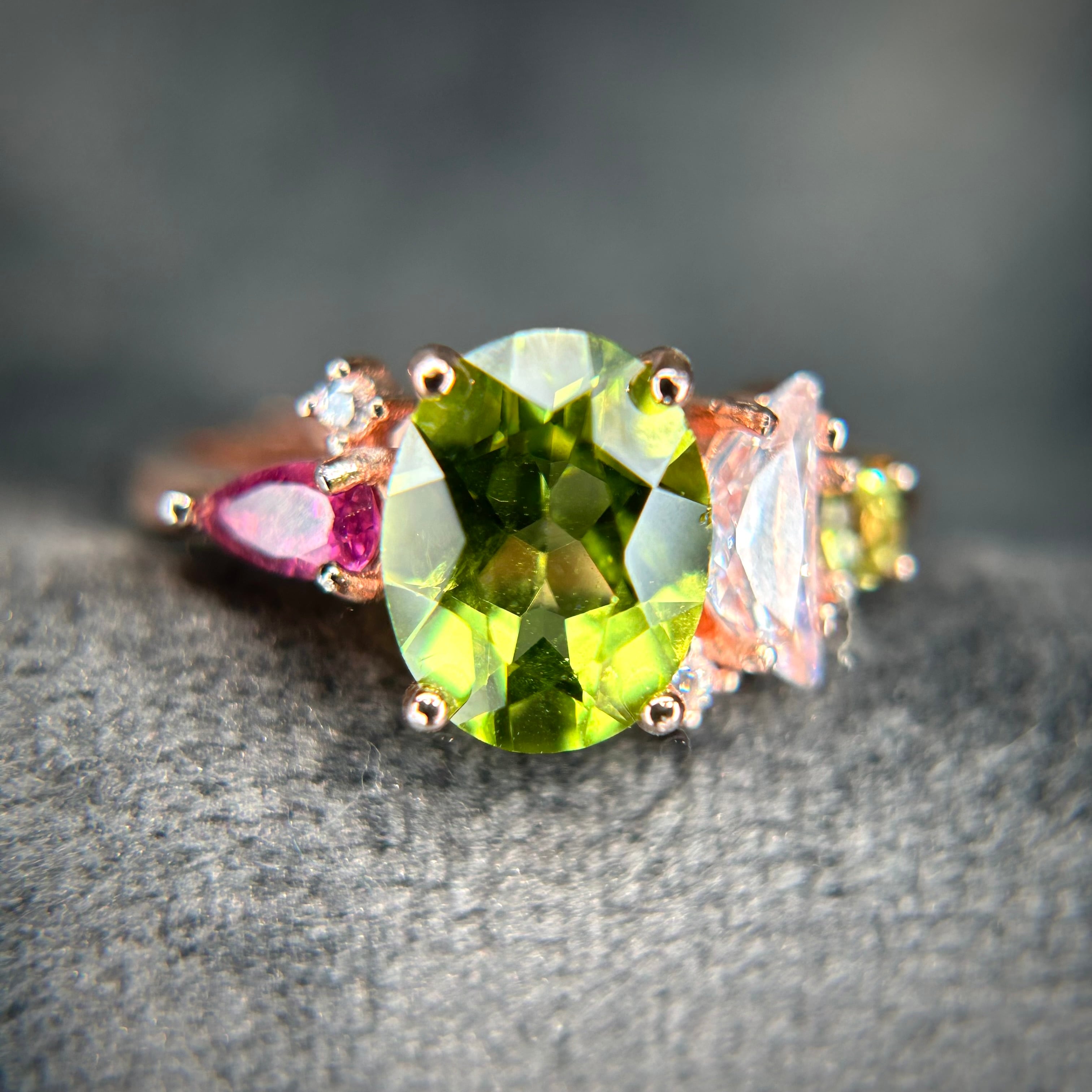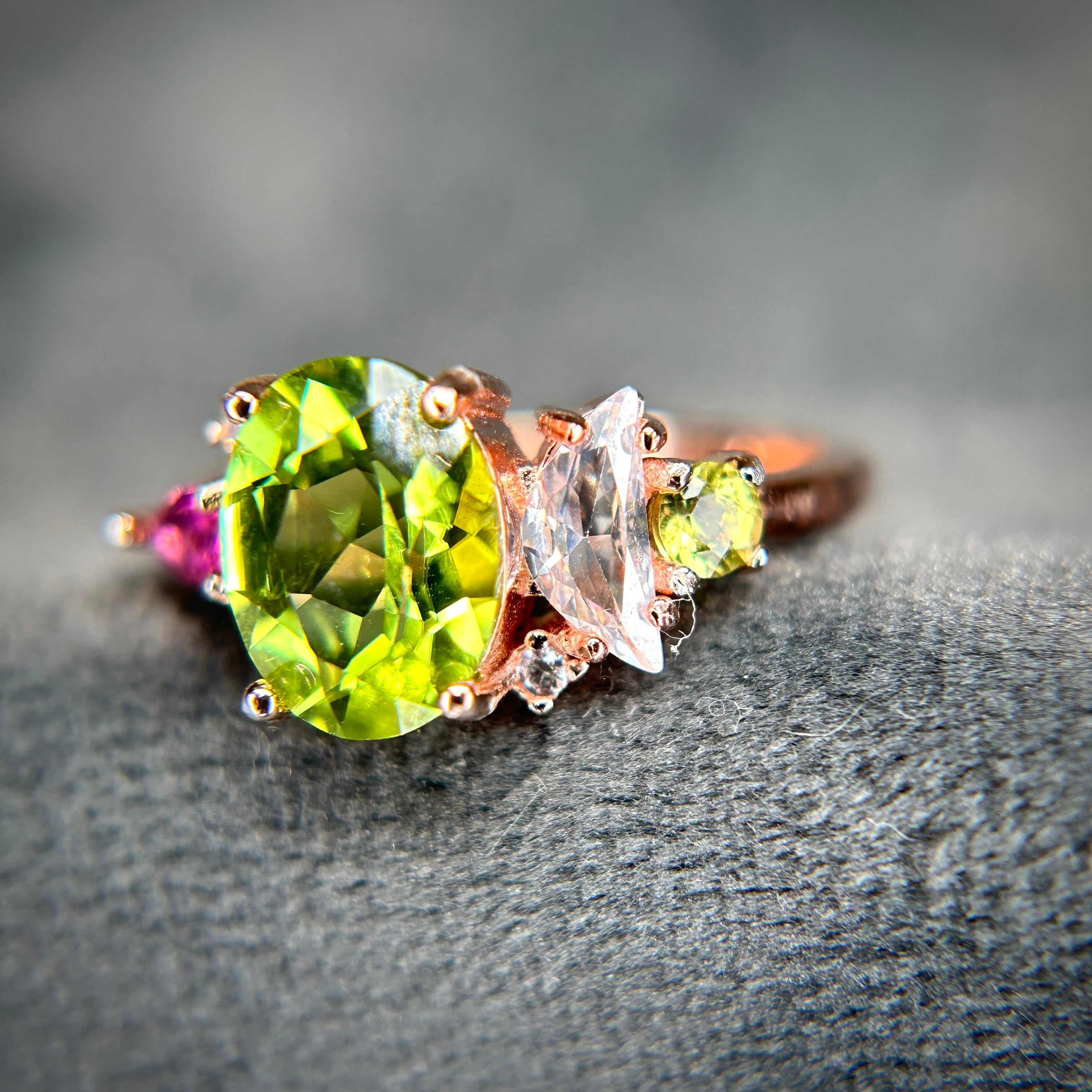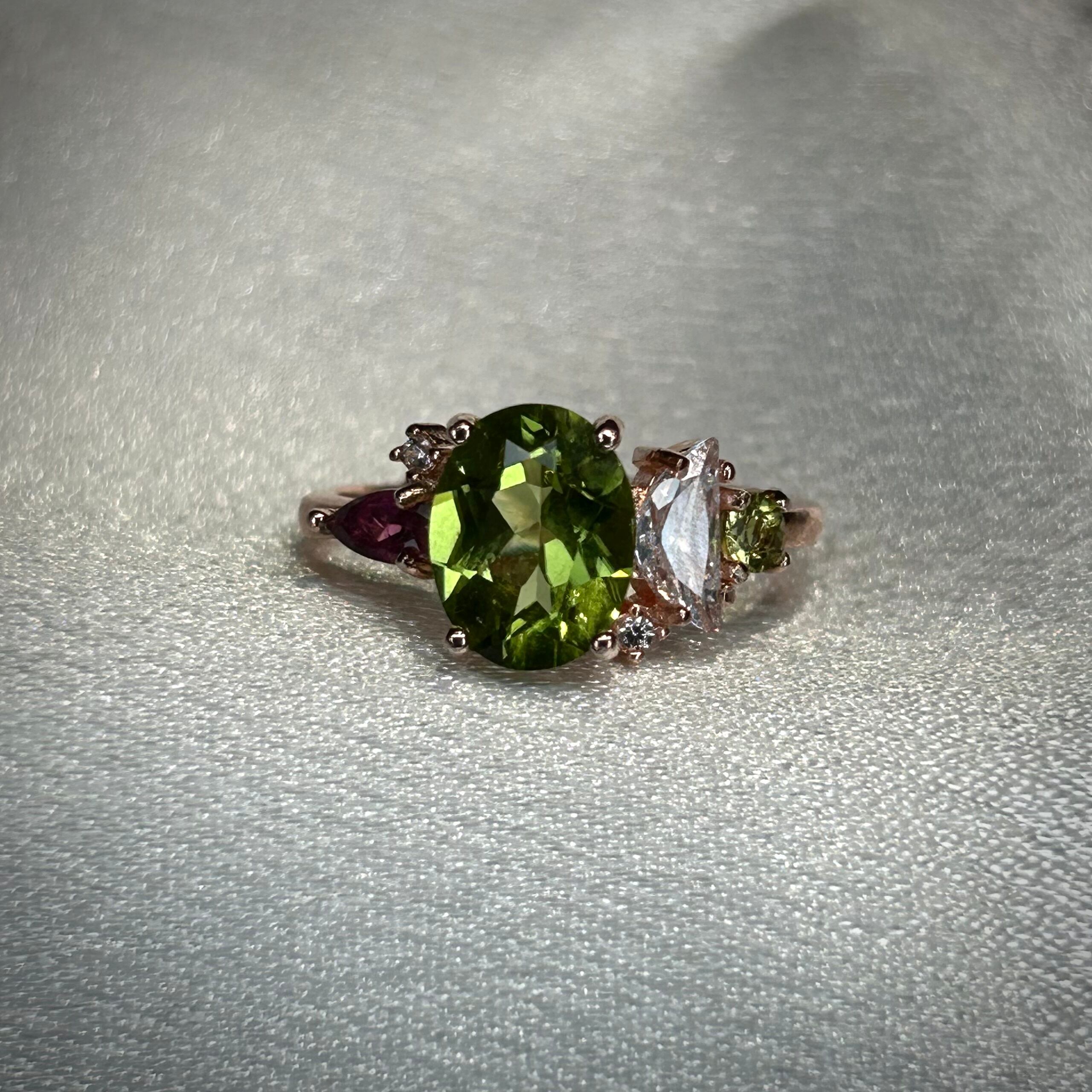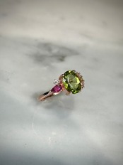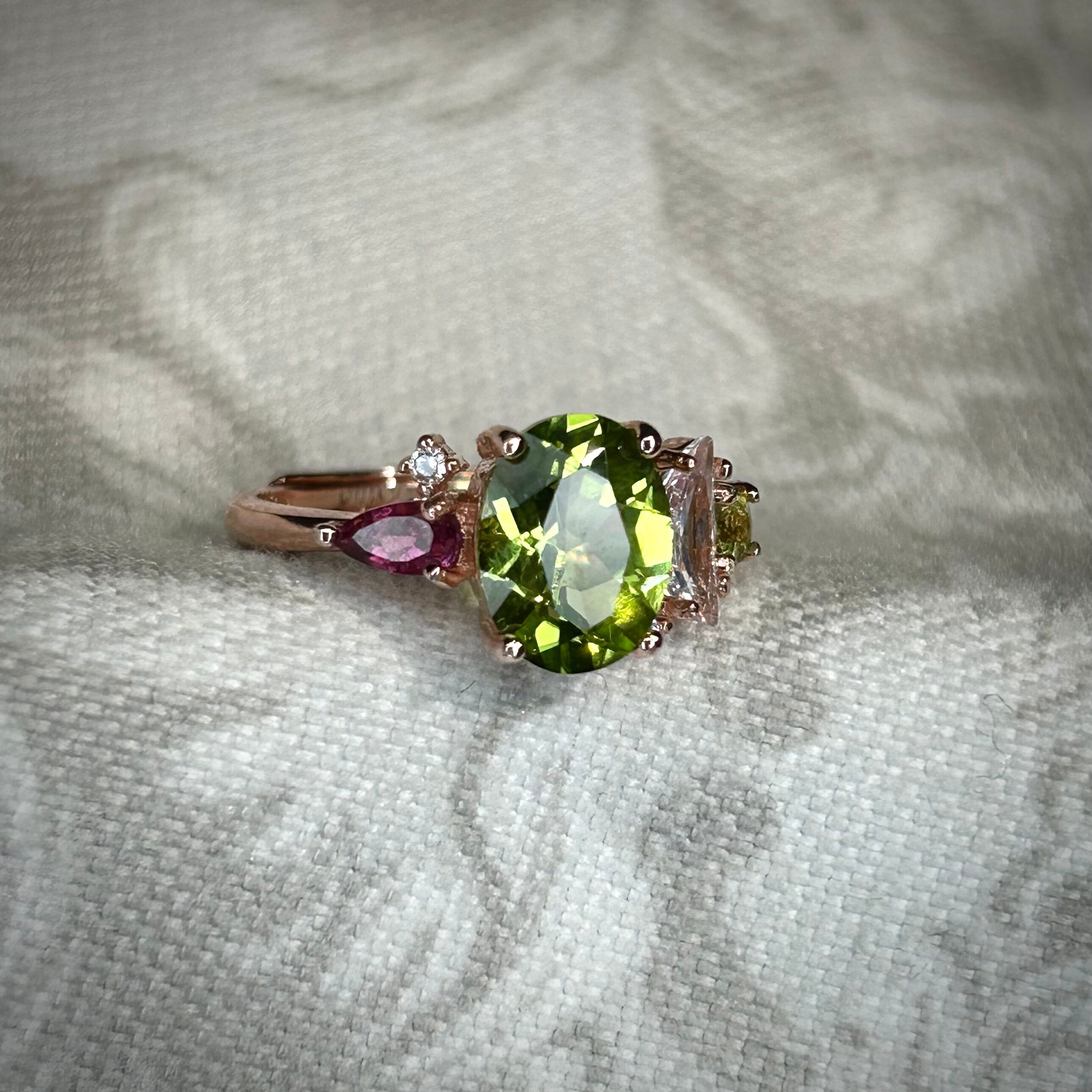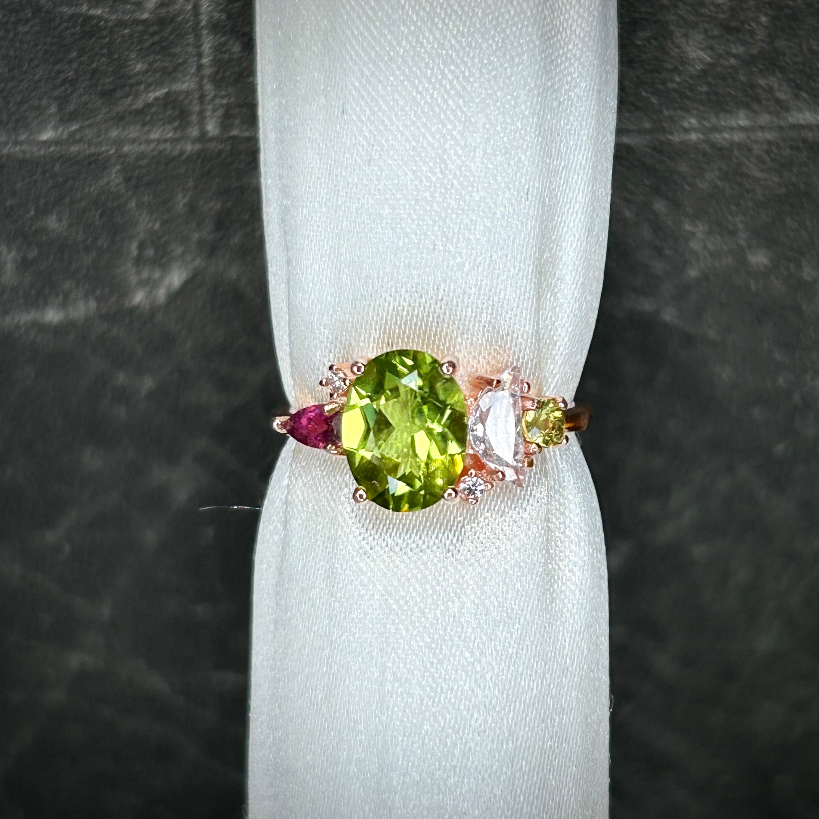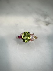 シルバー製ピンクゴールドカラー、ペリドット&トルマリンのリアンリング。
