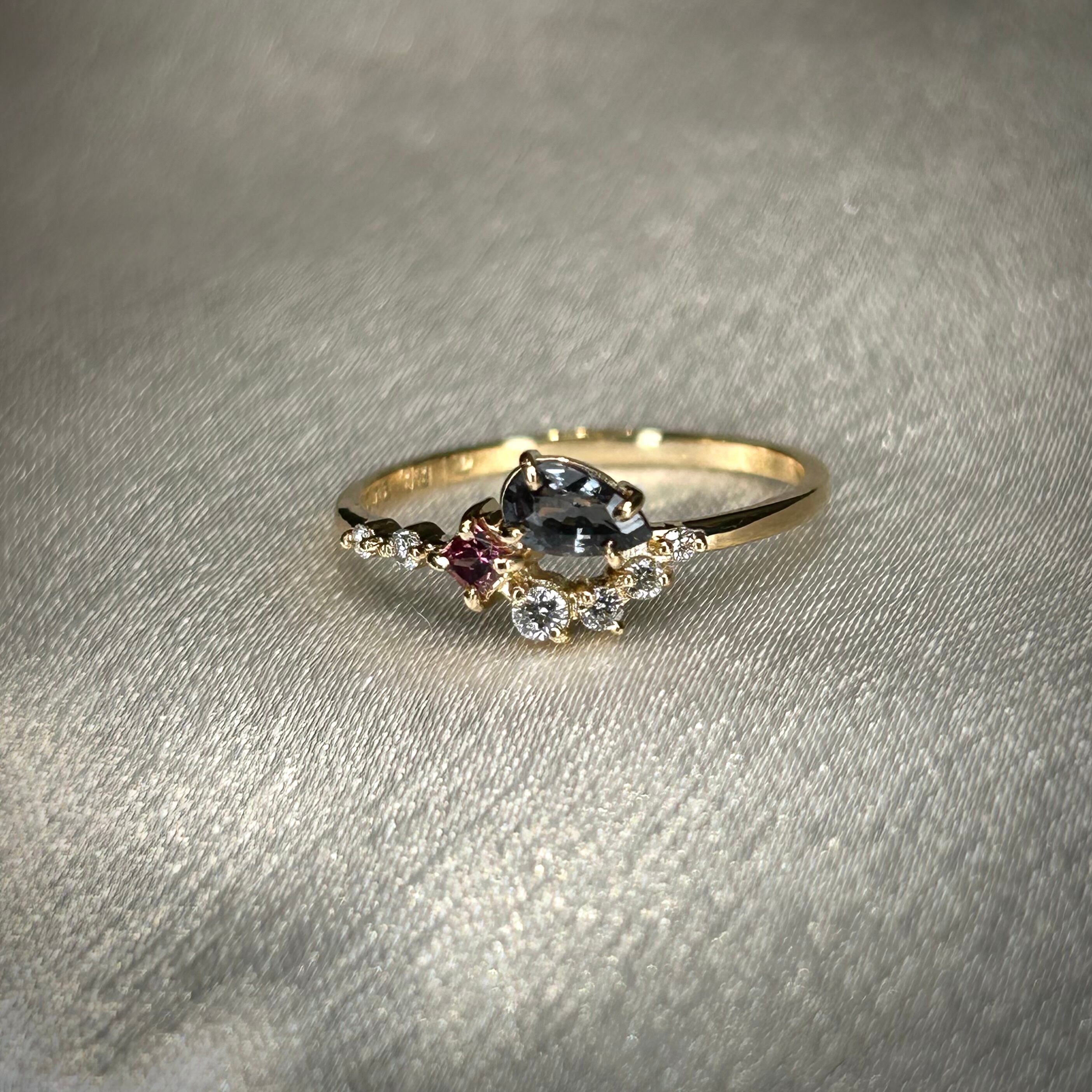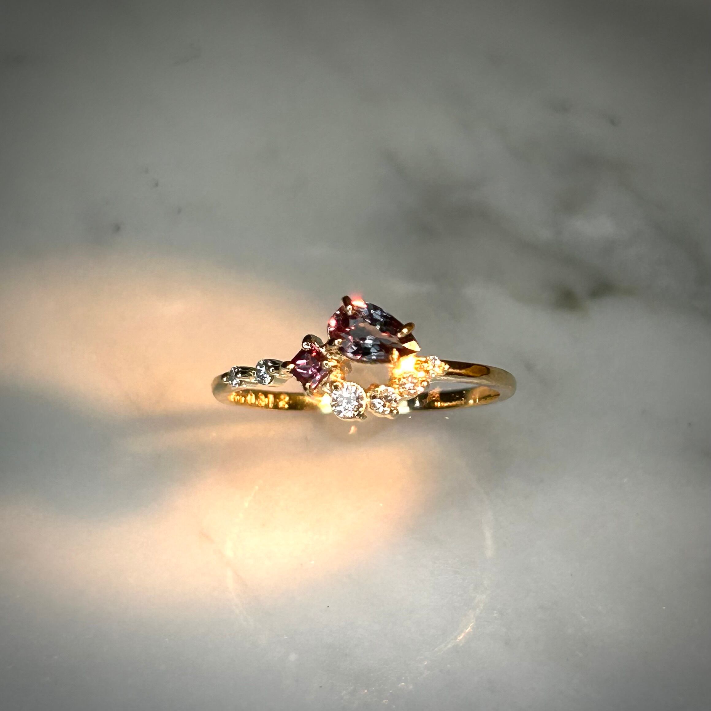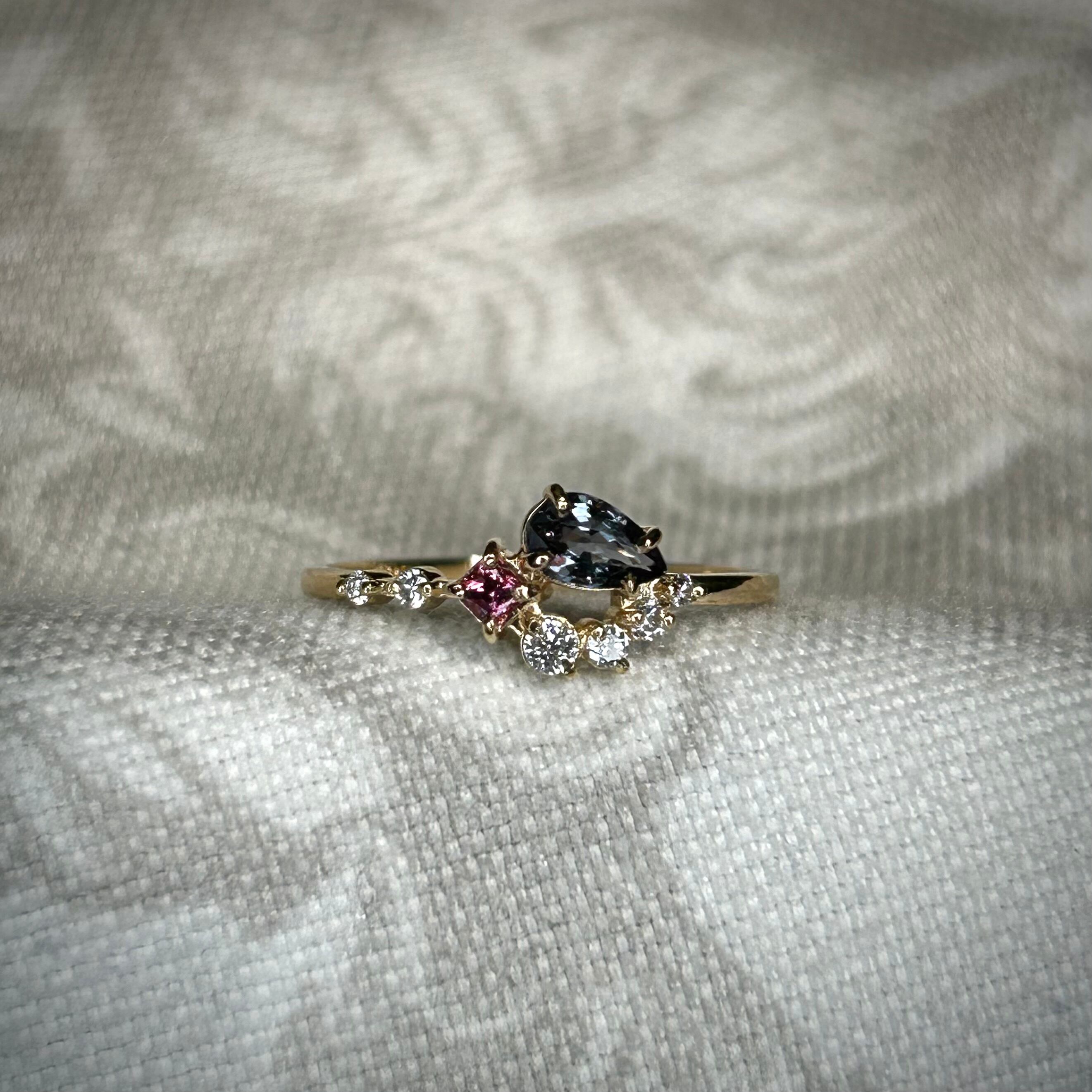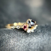 夕日の様なマラヤガーネットから、夜の空を表したベキリーブルーガーネット、そして輝く星をイメージした3サイズのダイヤモンドを添えた、1つの指輪の中にストーリーと遊び心が詰まったリングです。