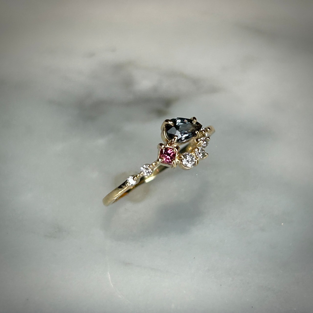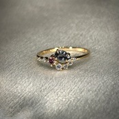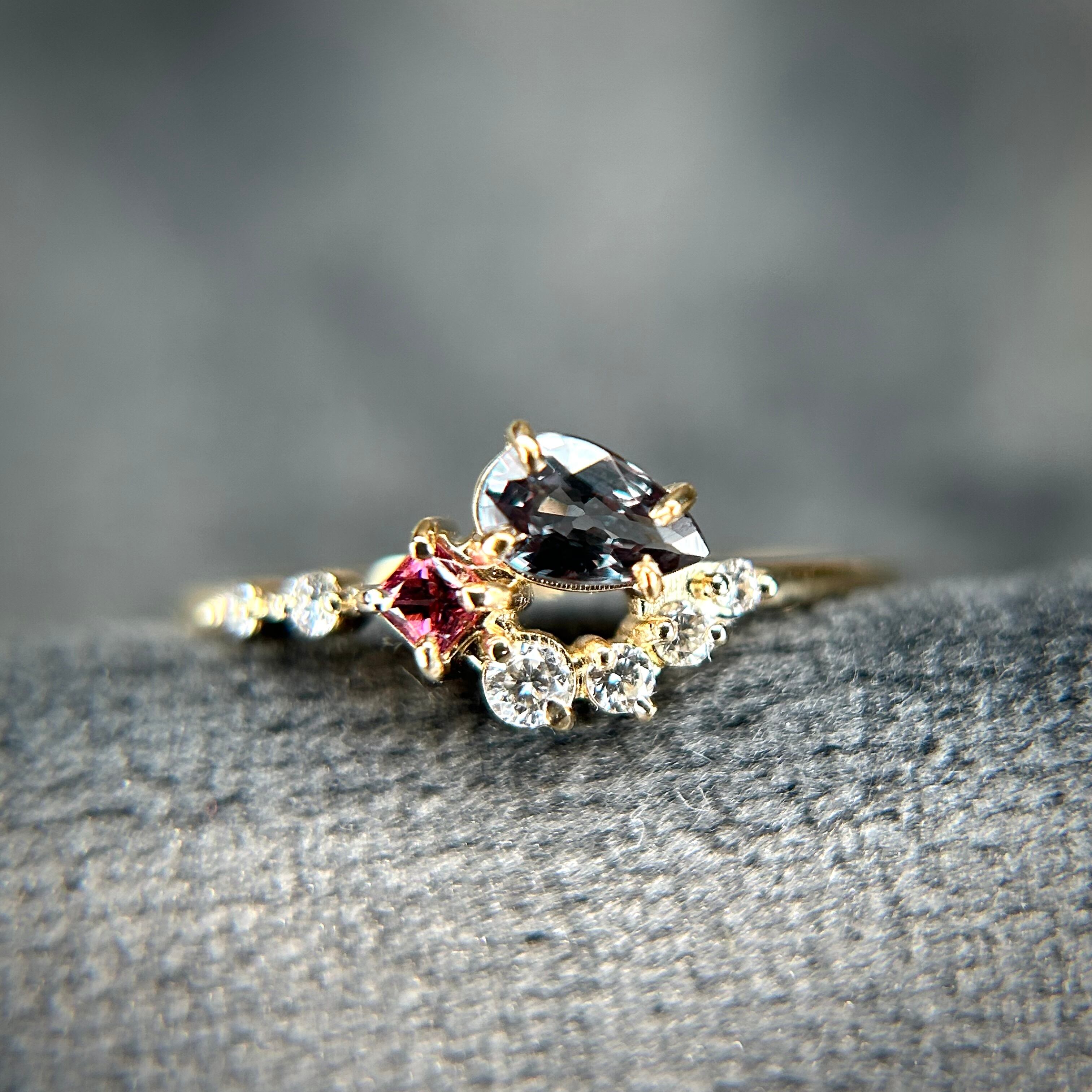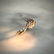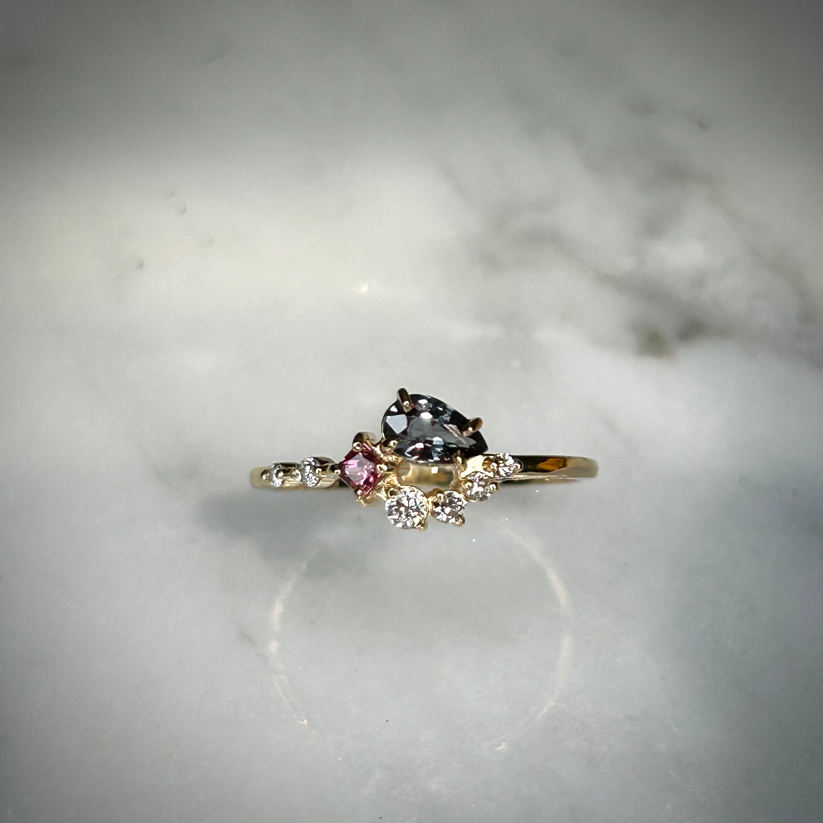 夕日の様なマラヤガーネットから、夜の空を表したベキリーブルーガーネット、そして輝く星をイメージした3サイズのダイヤモンドを添えた、1つの指輪の中にストーリーと遊び心が詰まったリングです。