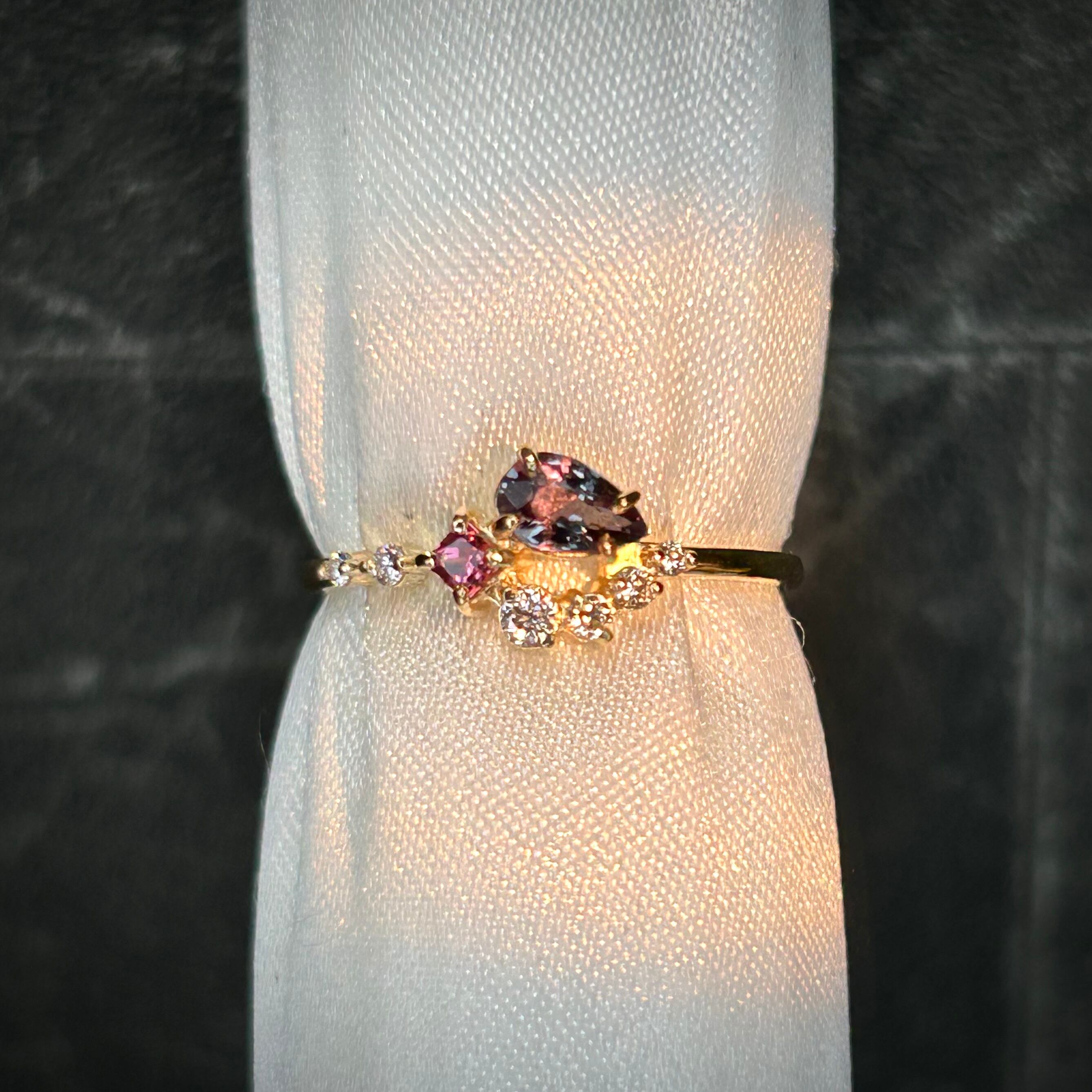 カラーチェンジが楽しめるマダガスカル産ベキリーブルーガーネットと、プリンセスカットのマラヤガーネットを使用。