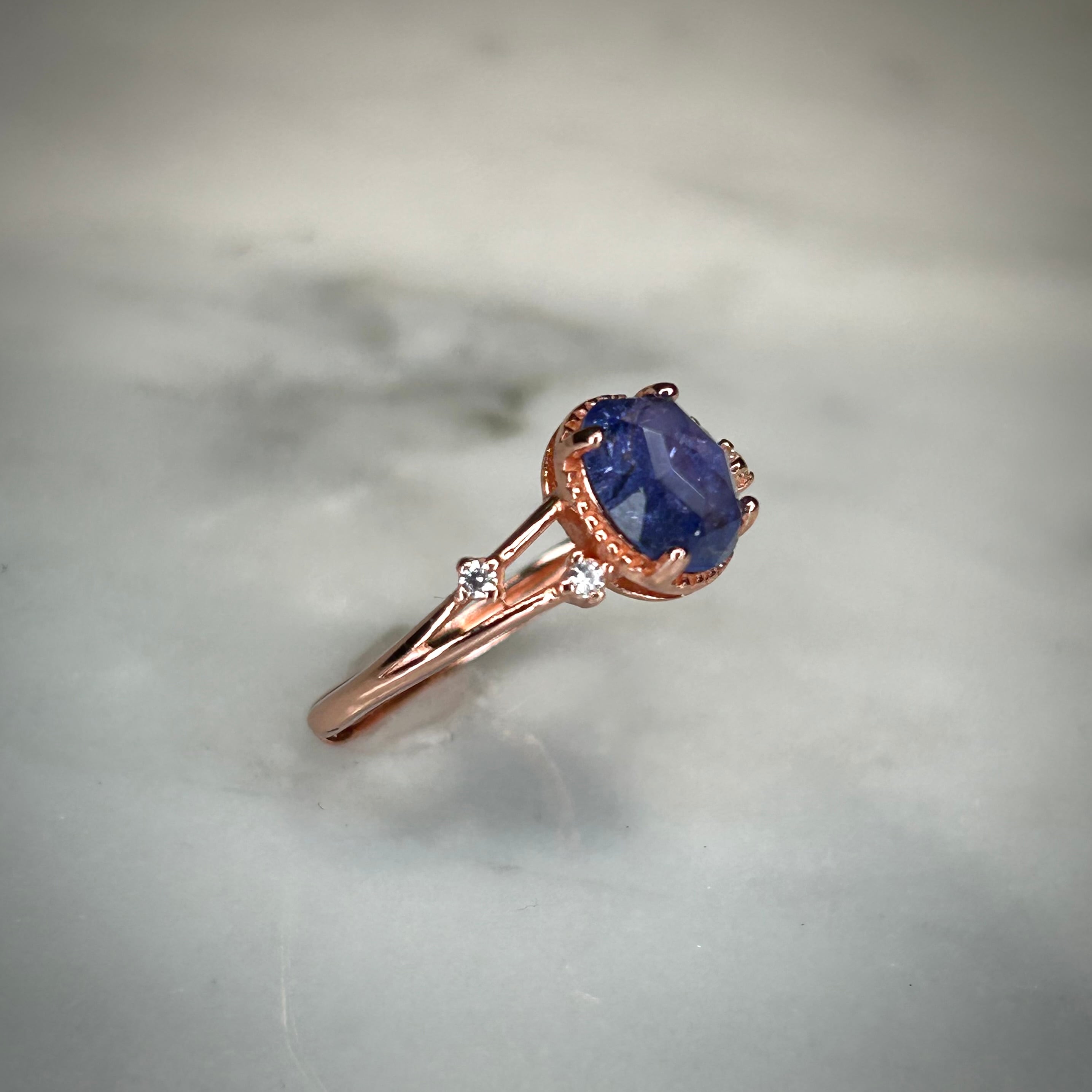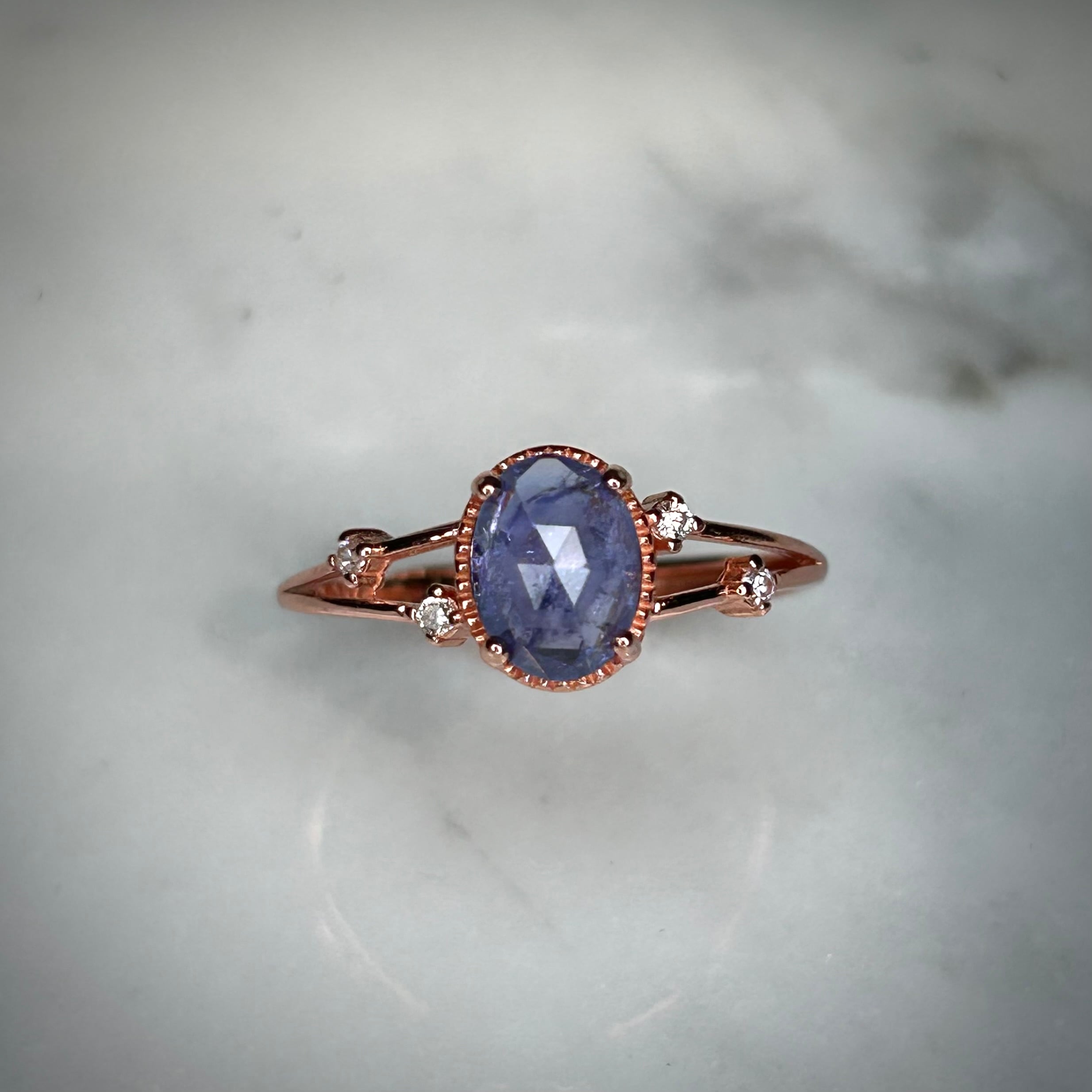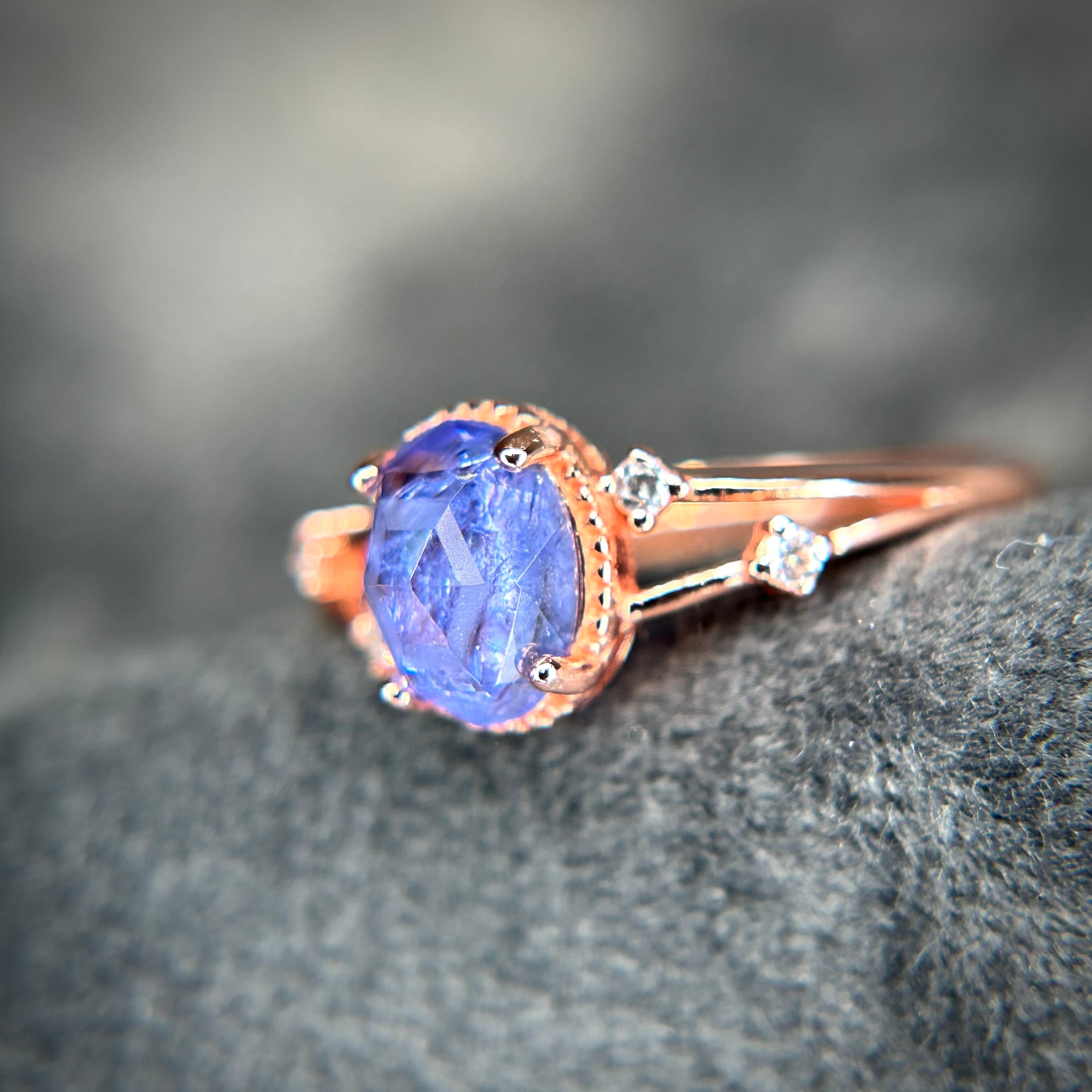 シルバー製ピンクゴールドカラー、タンザナイトのオーバルステーションリング。