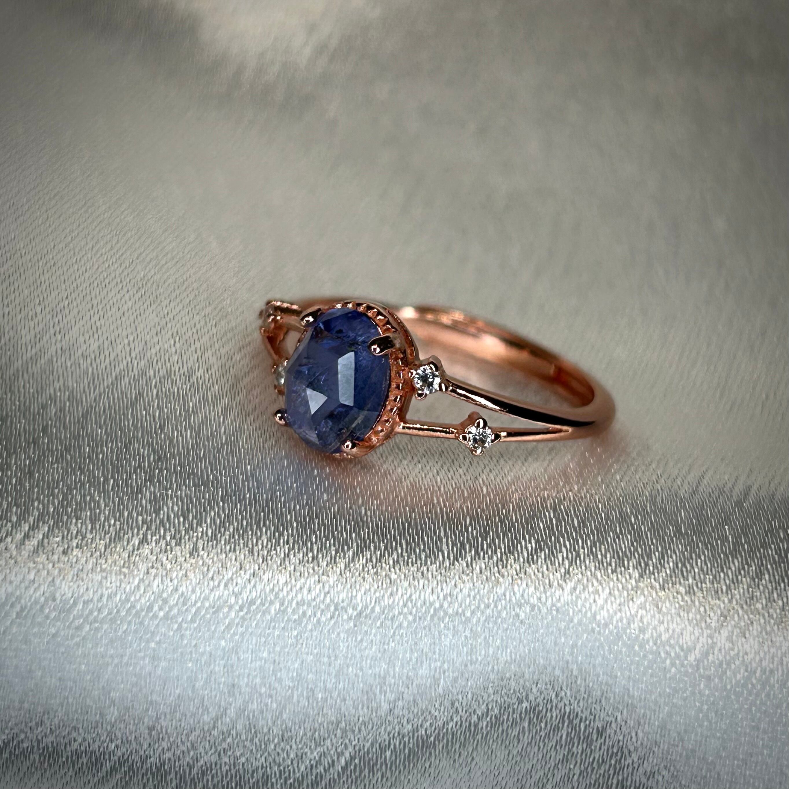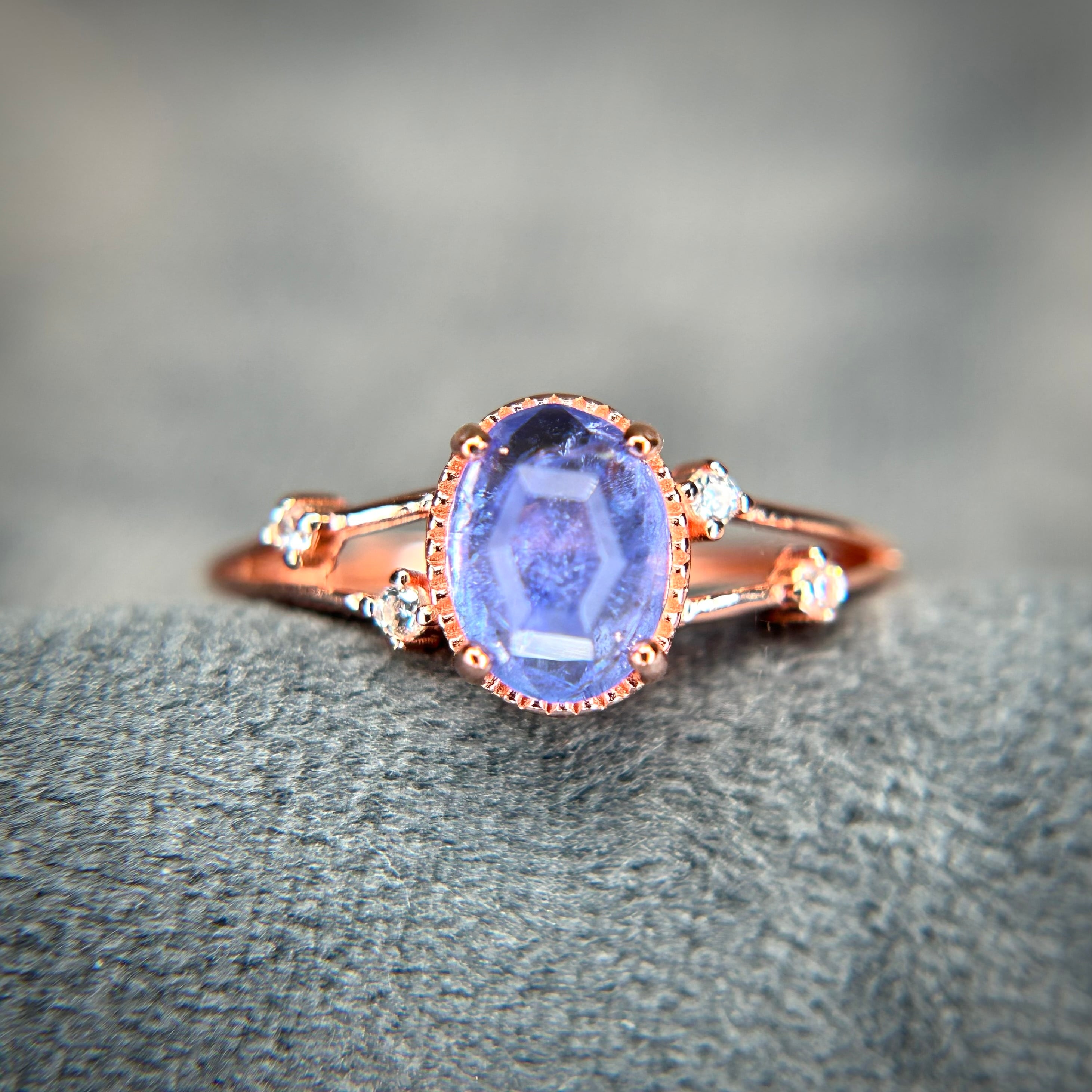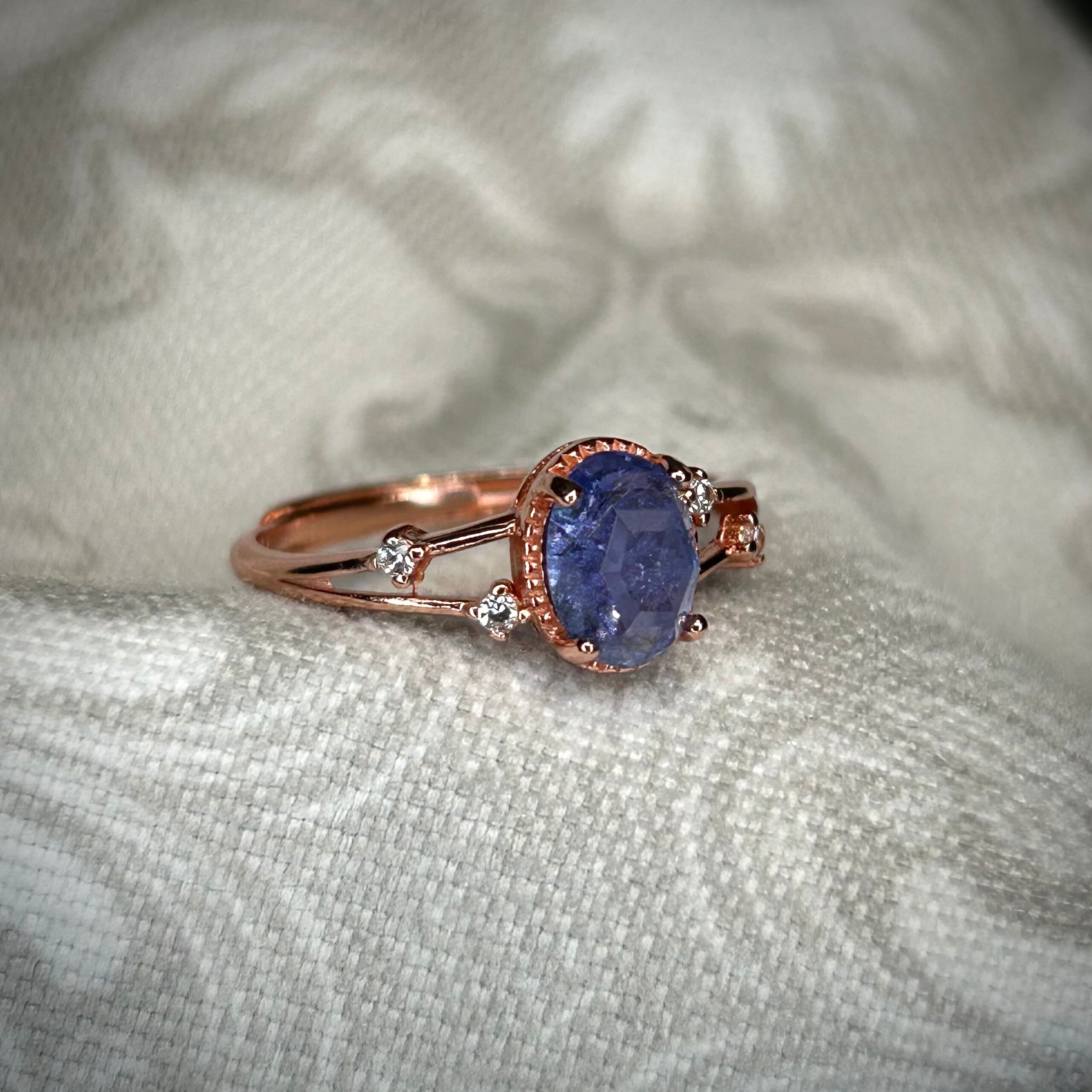 シルバー製ピンクゴールドカラー、タンザナイトのオーバルステーションリング。