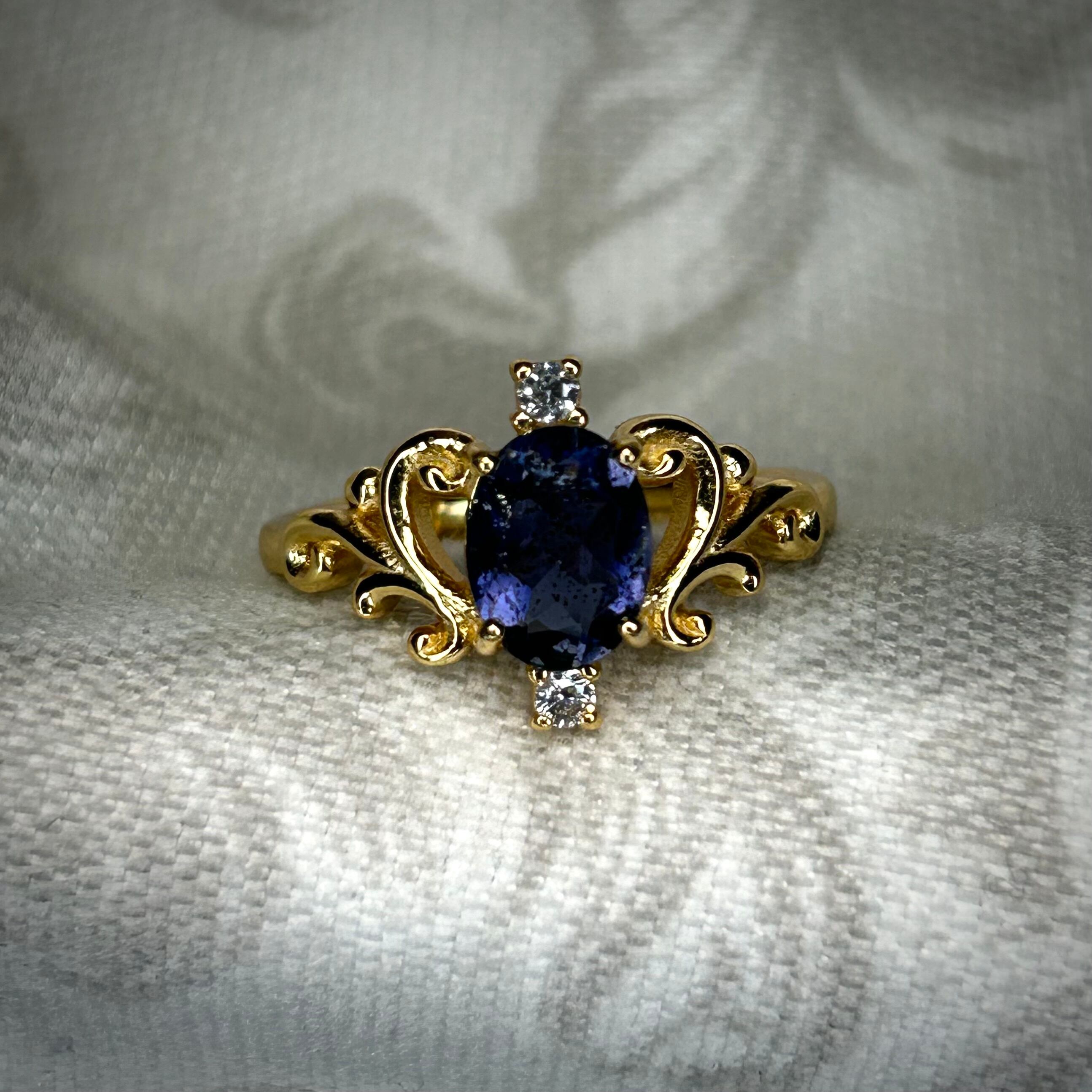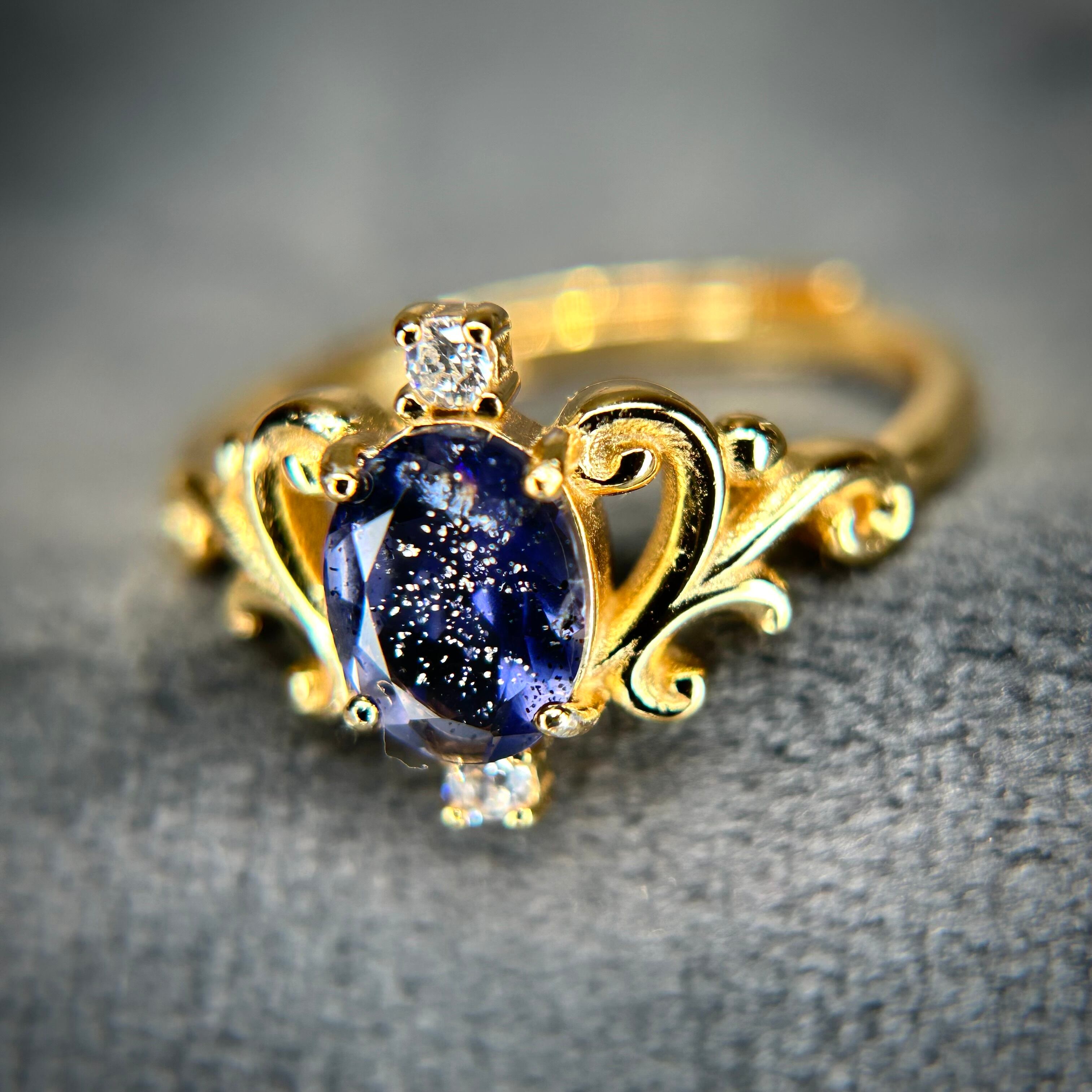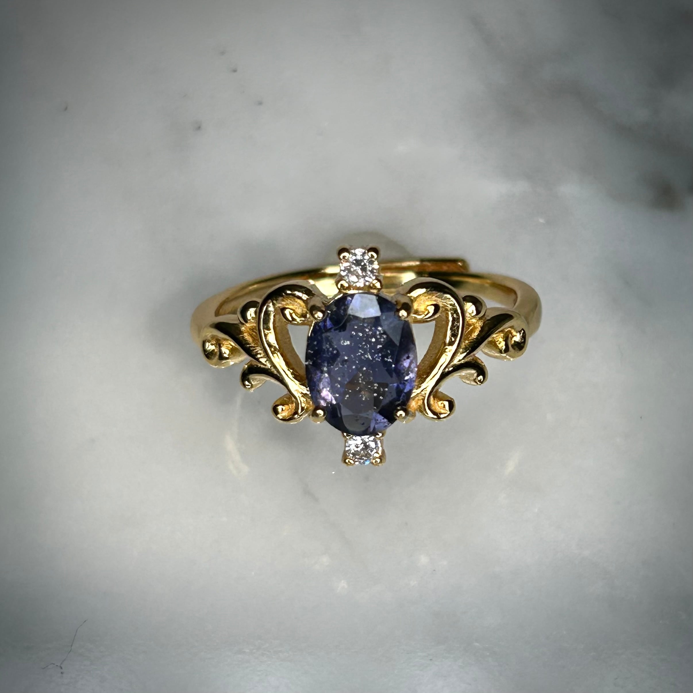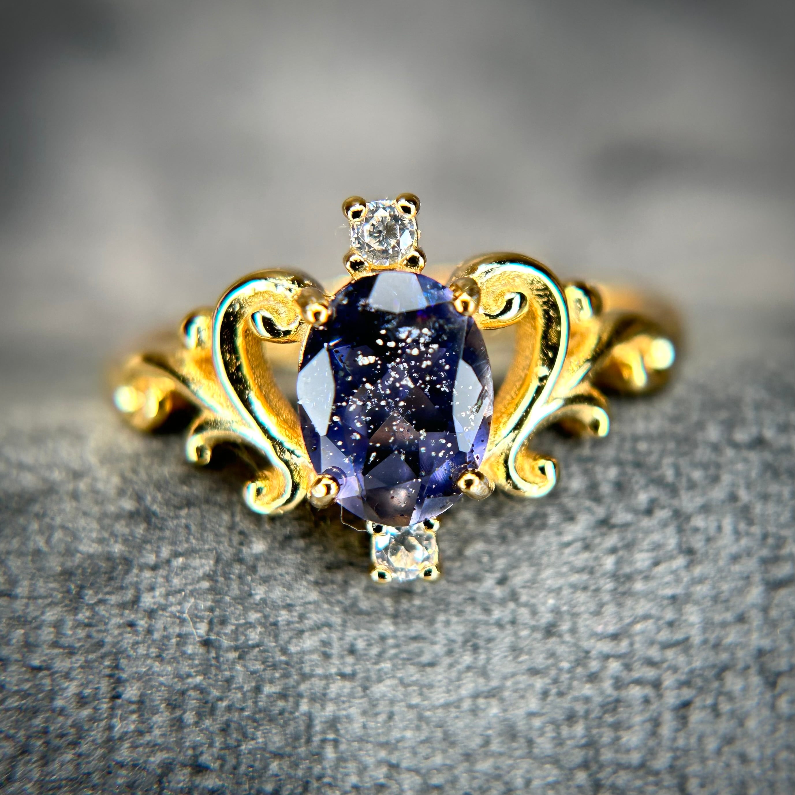 シルバー製ゴールドカラー、アイオライトサンストーンのロイヤルリング。