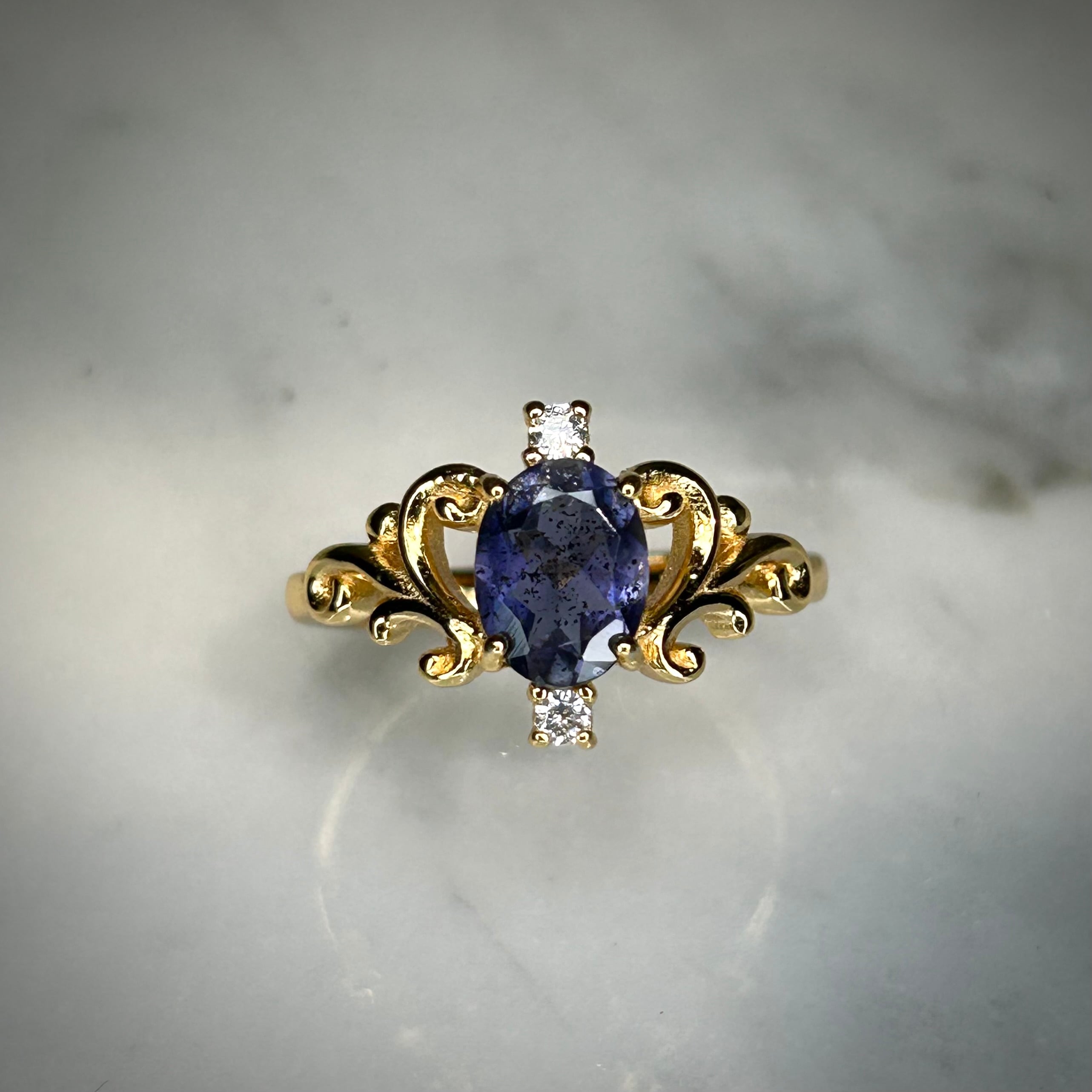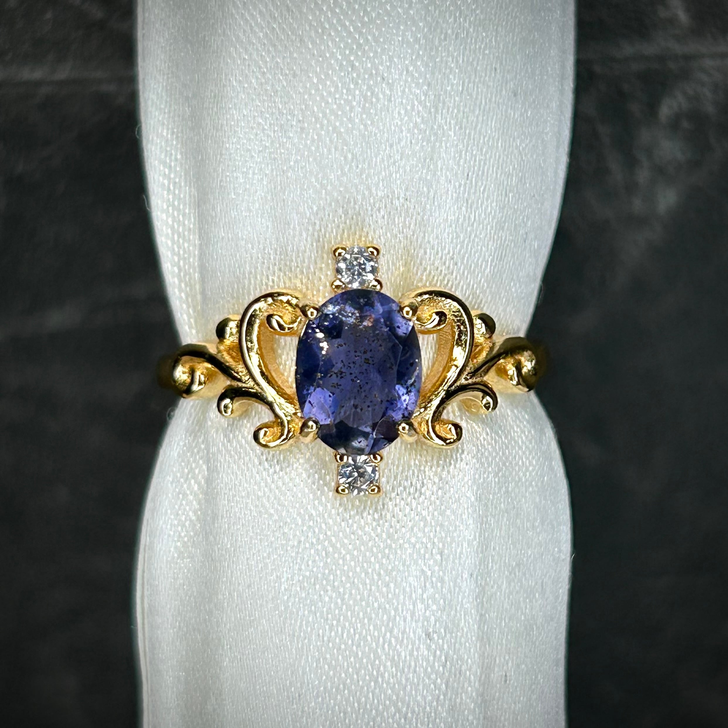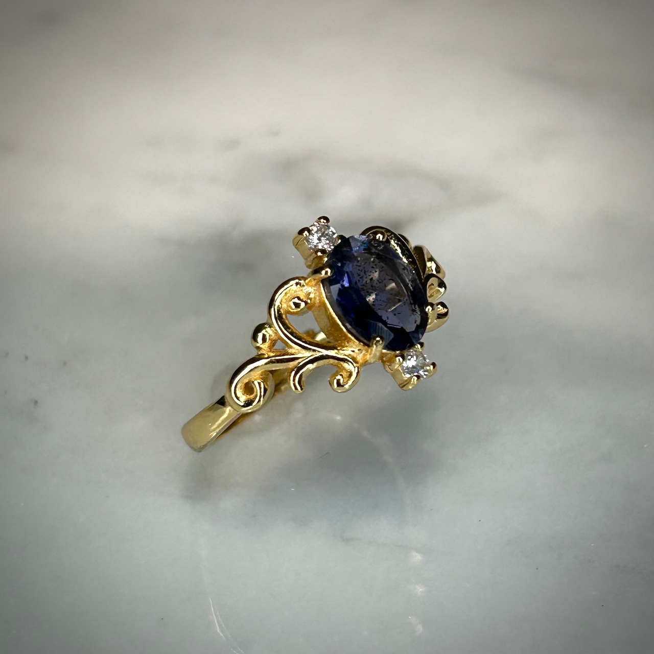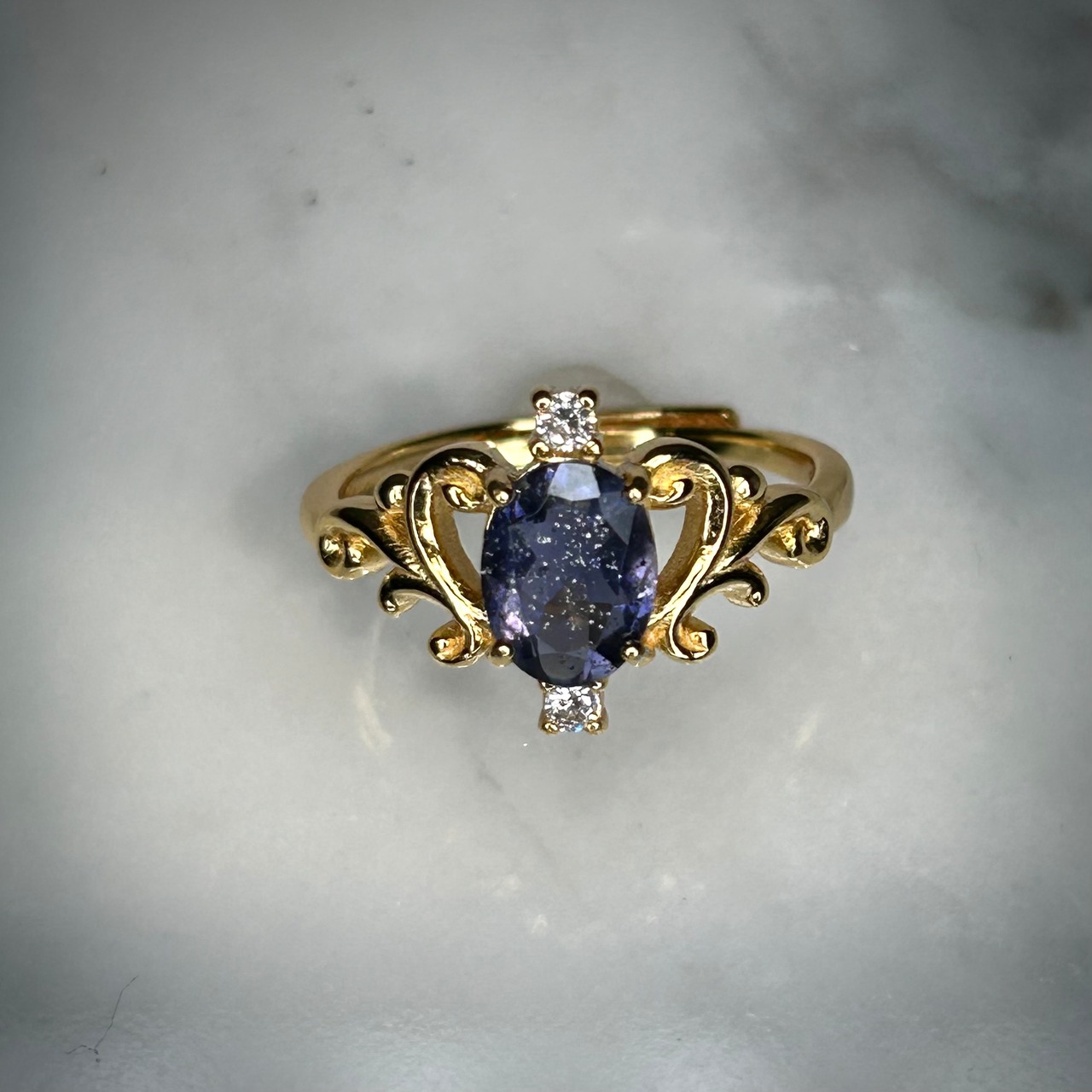 シルバー製ゴールドカラー、アイオライトサンストーンのロイヤルリング。