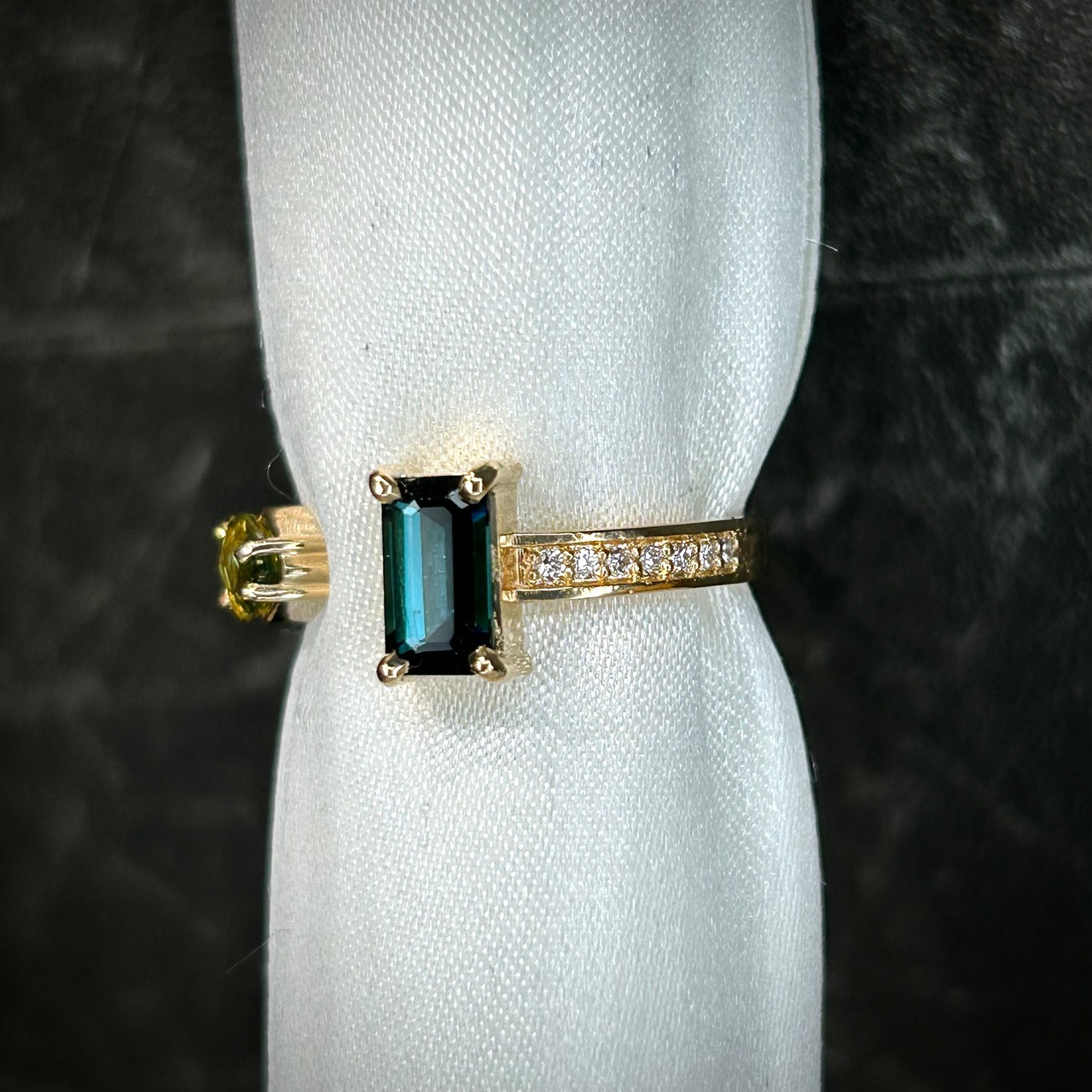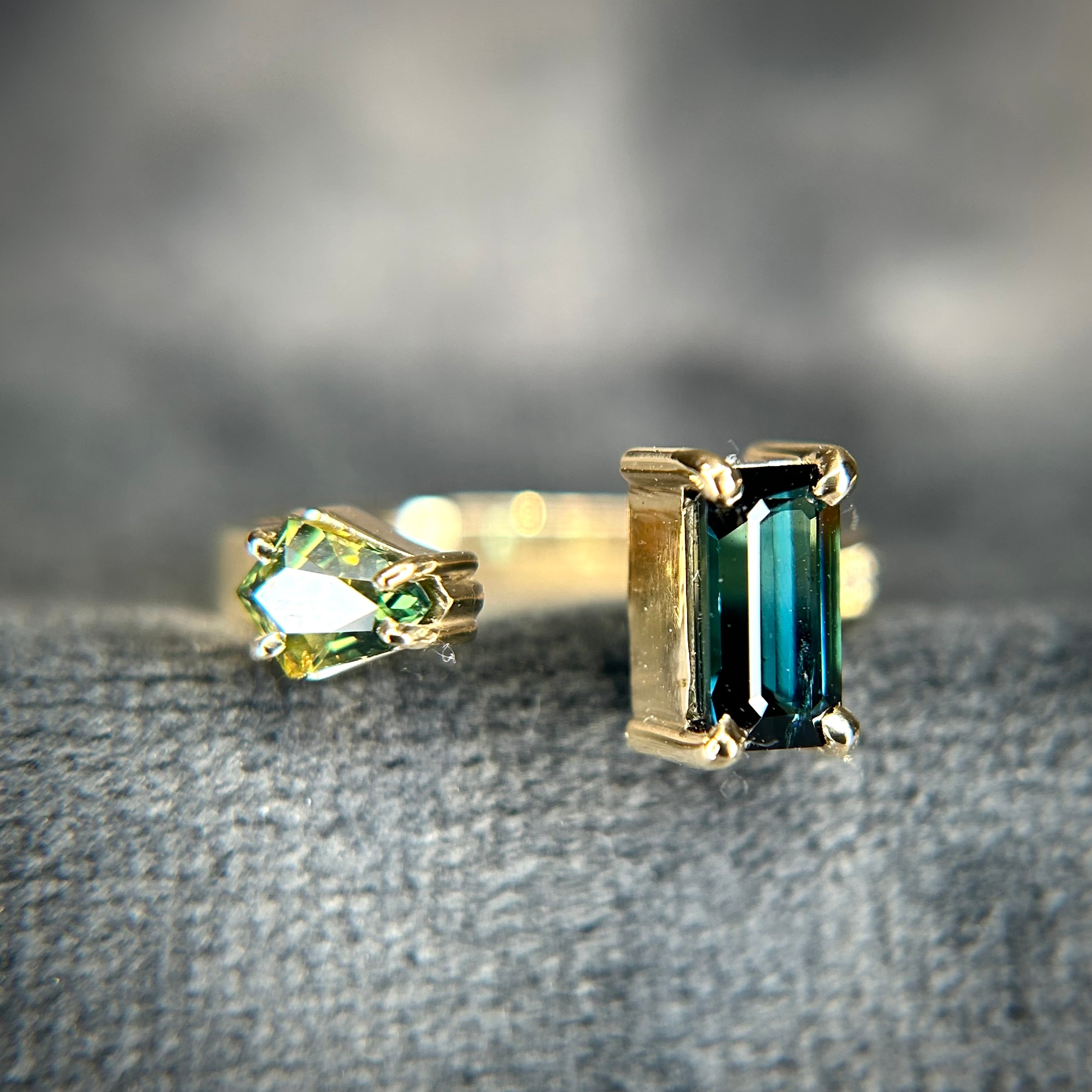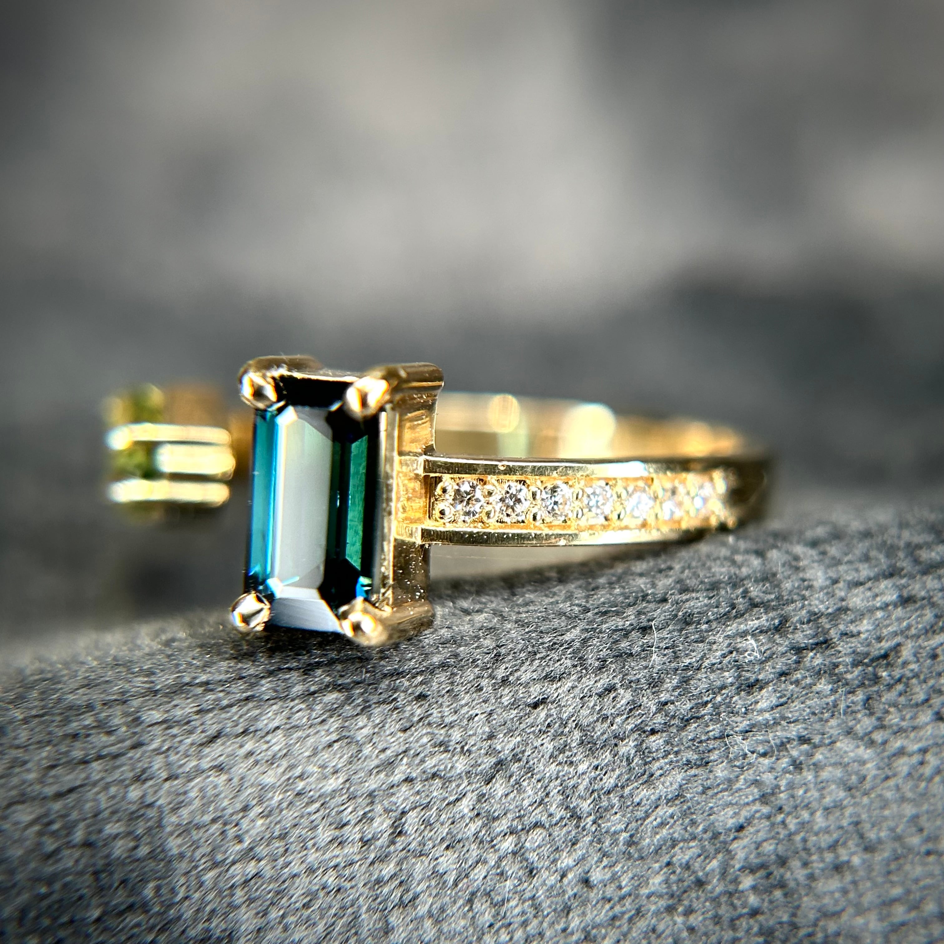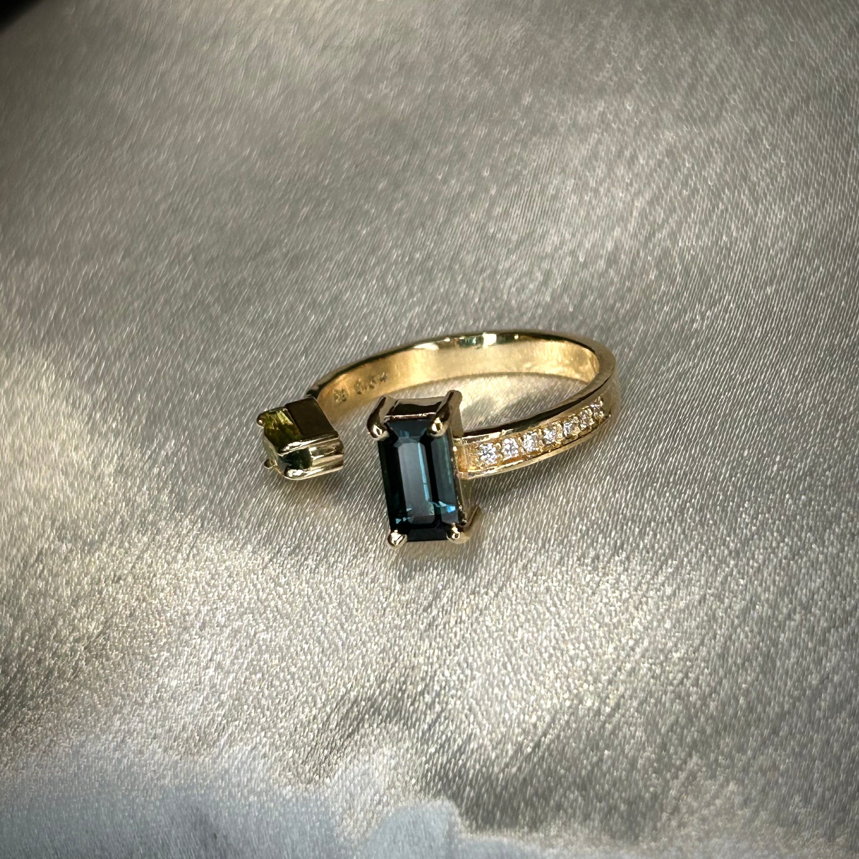 K18YG製 、インディコライトトルマリン&サファイアのデュアリスリング。