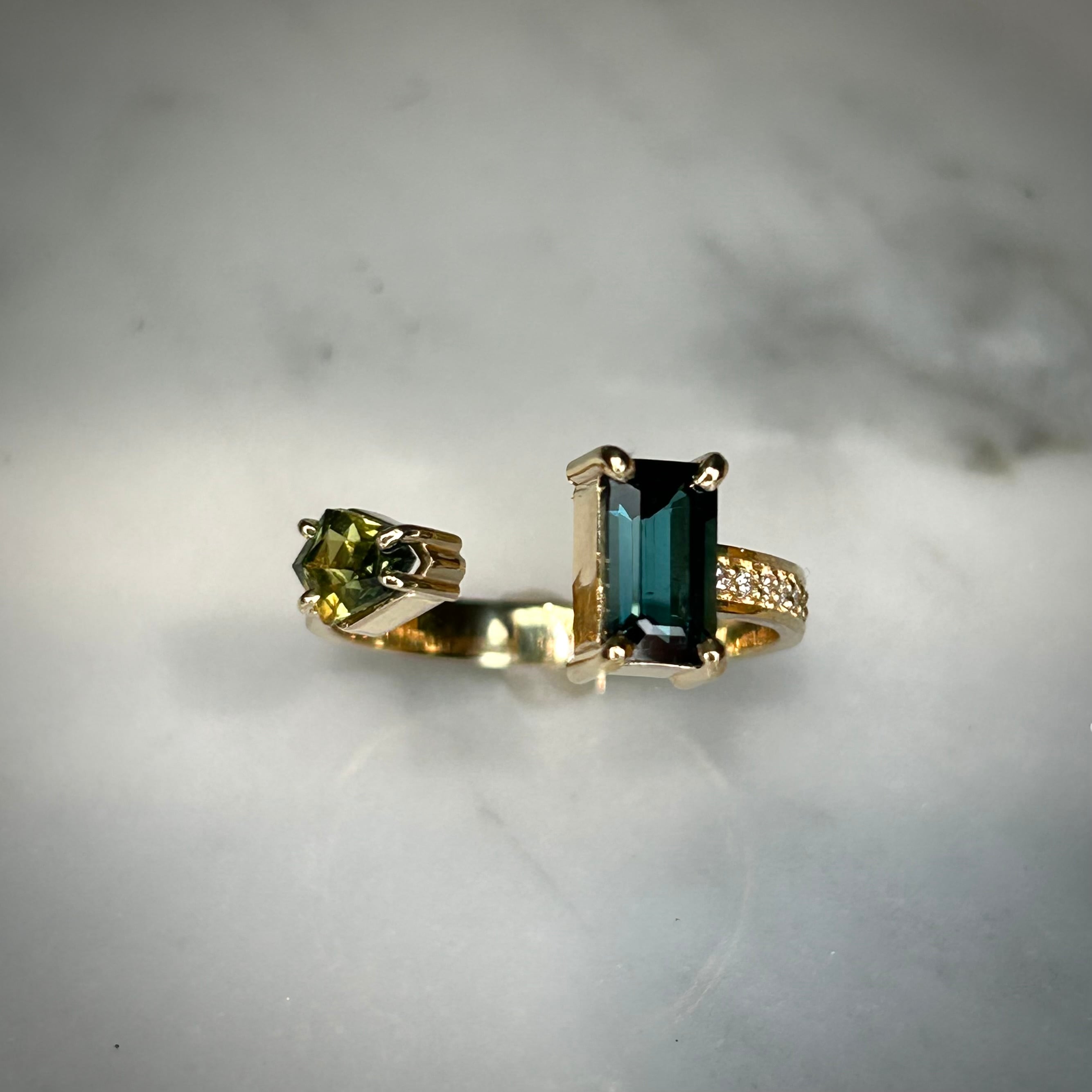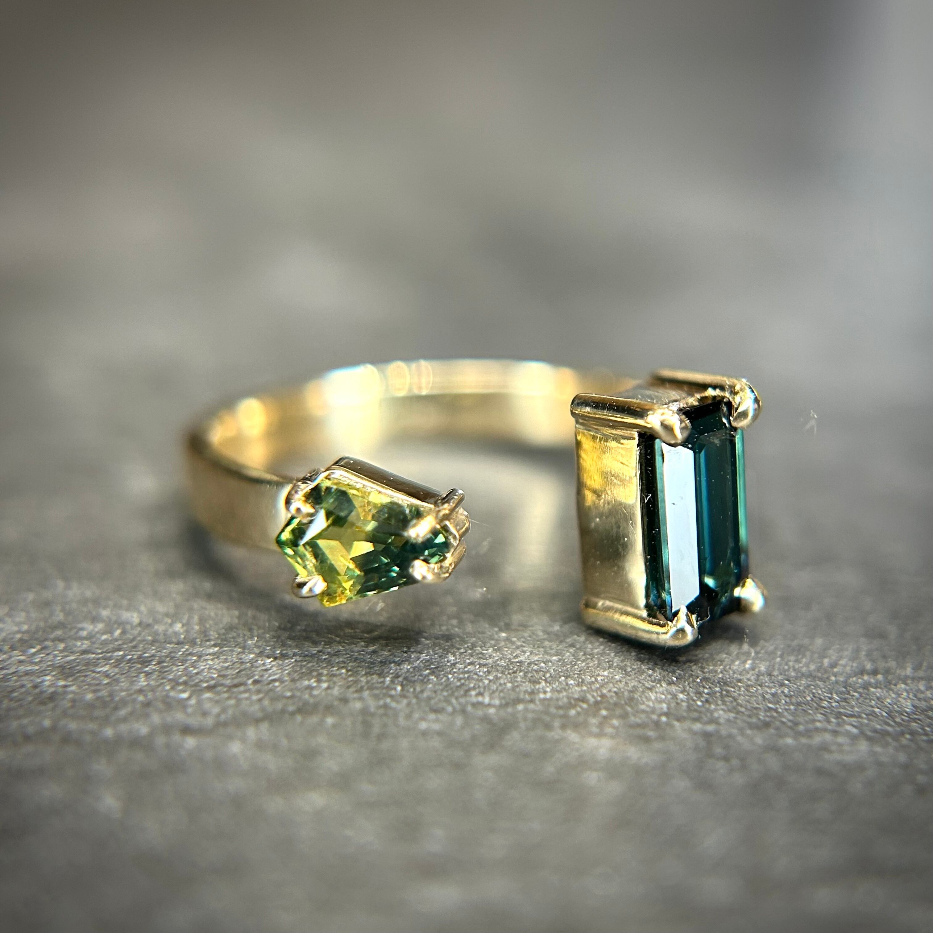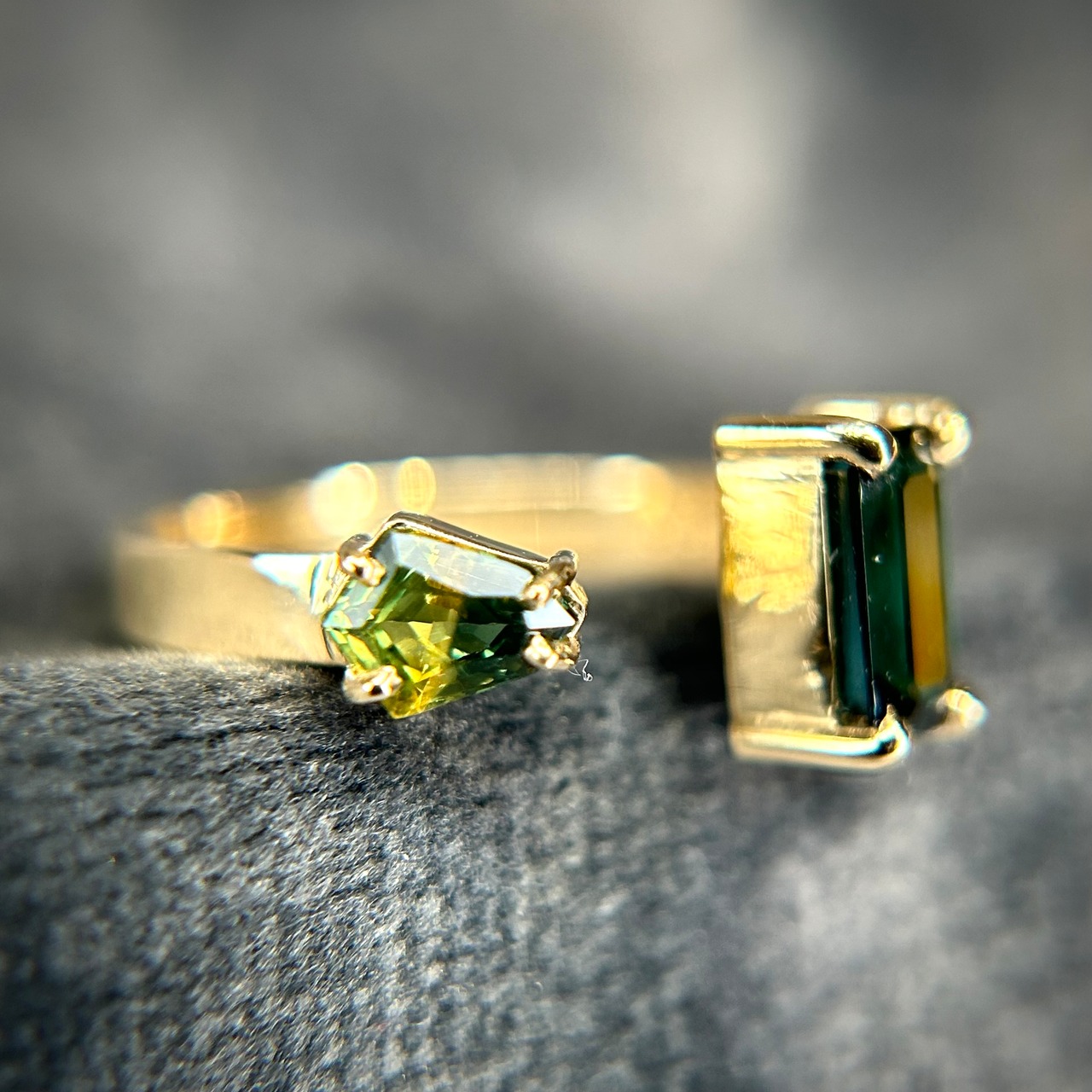 K18YG製 、インディコライトトルマリン&サファイアのデュアリスリング。