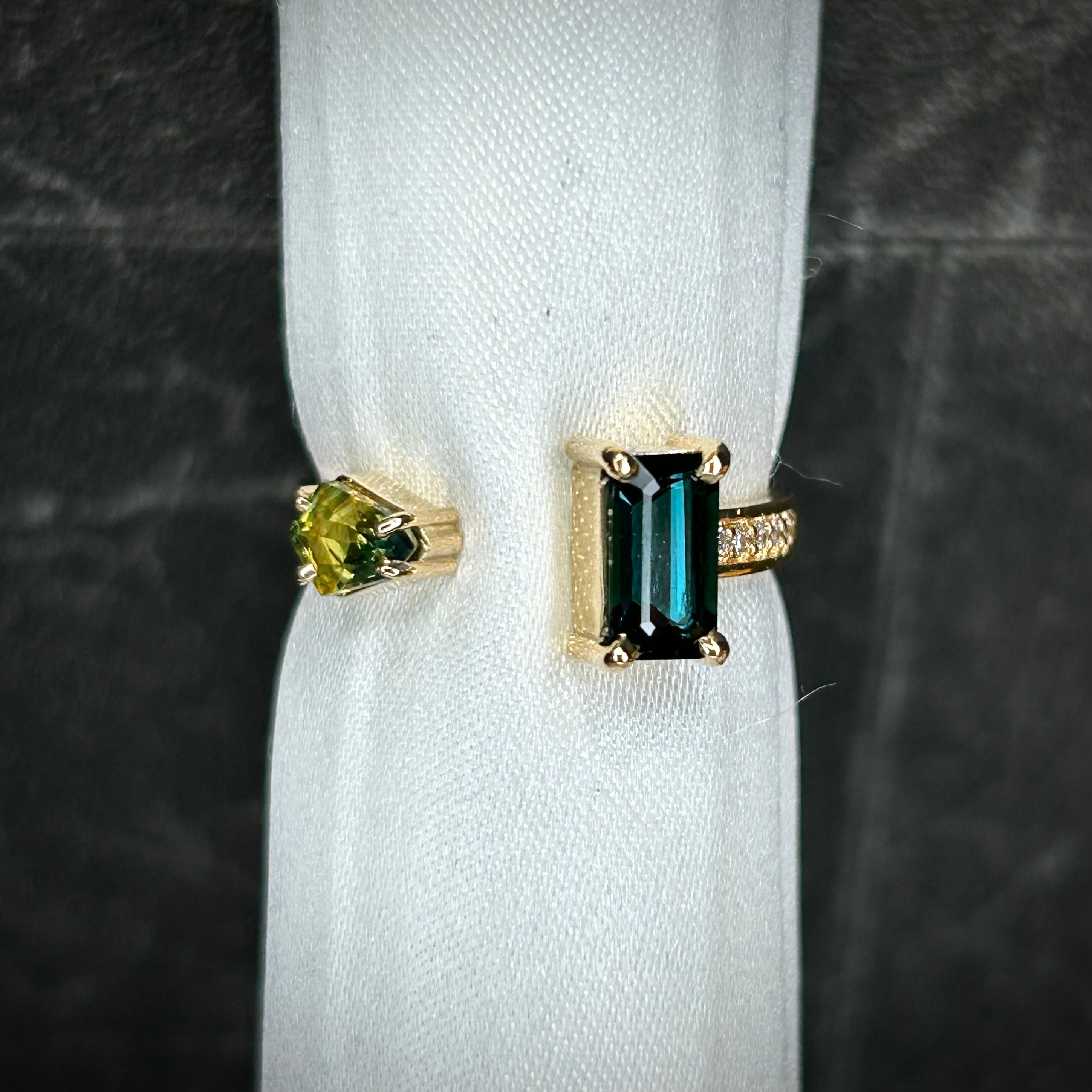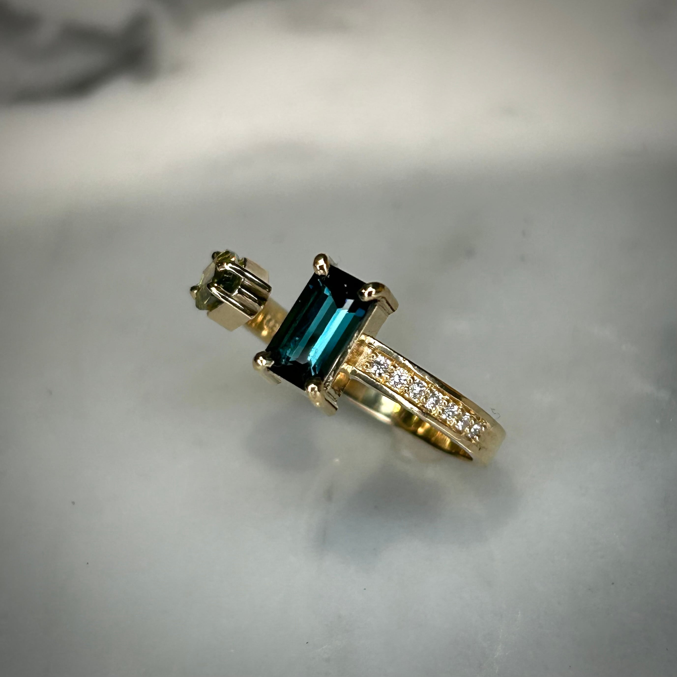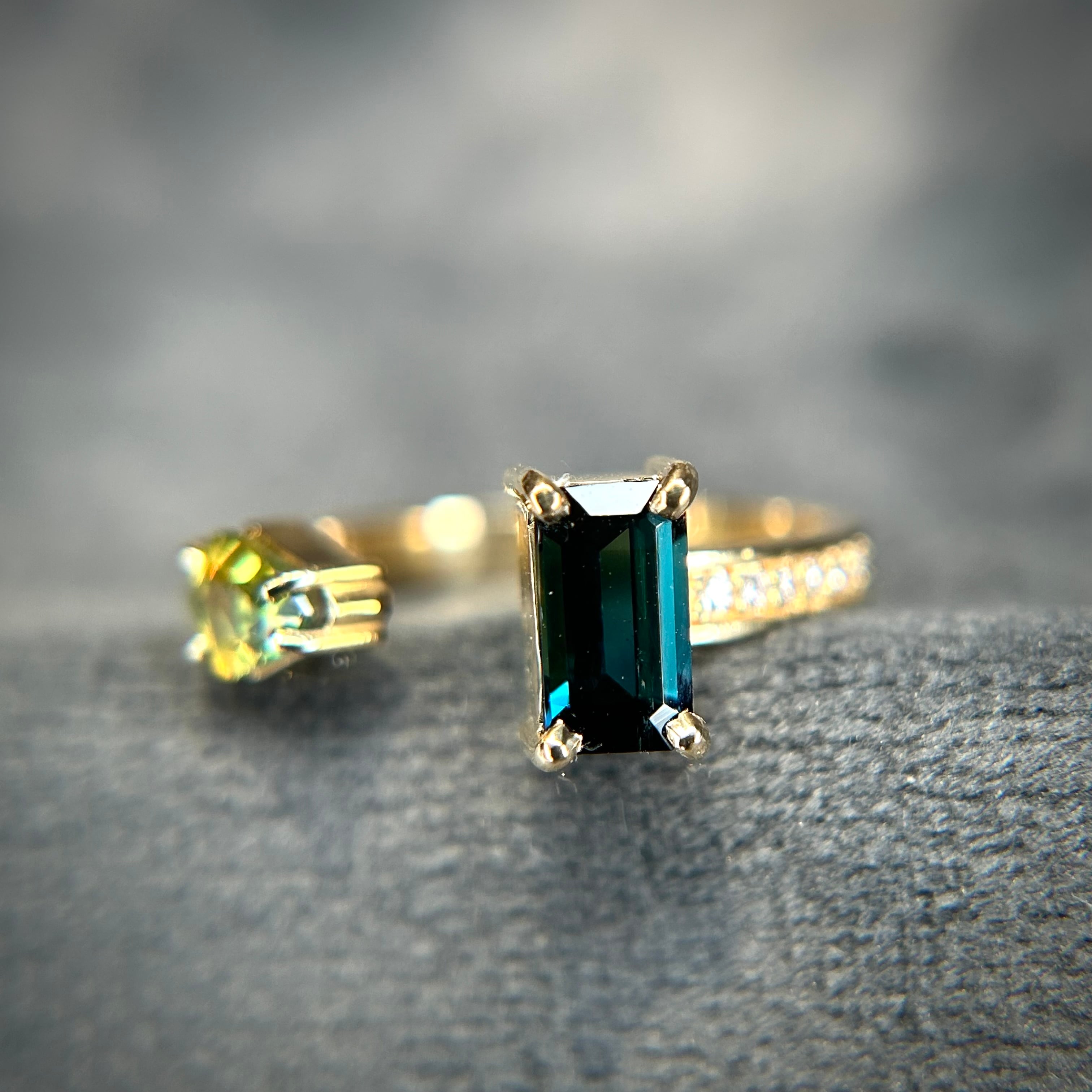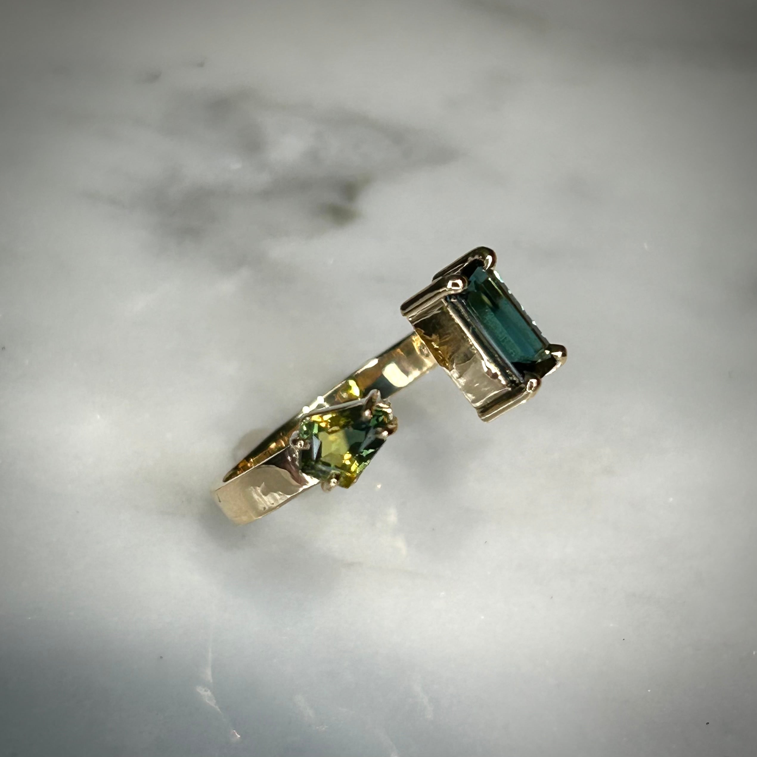 K18YG製 、インディコライトトルマリン&サファイアのデュアリスリング。