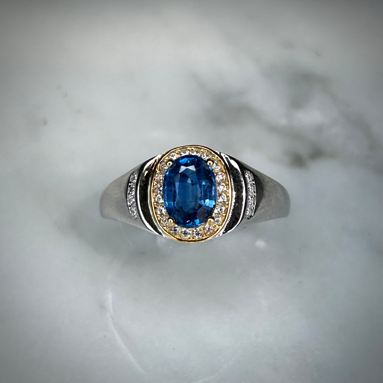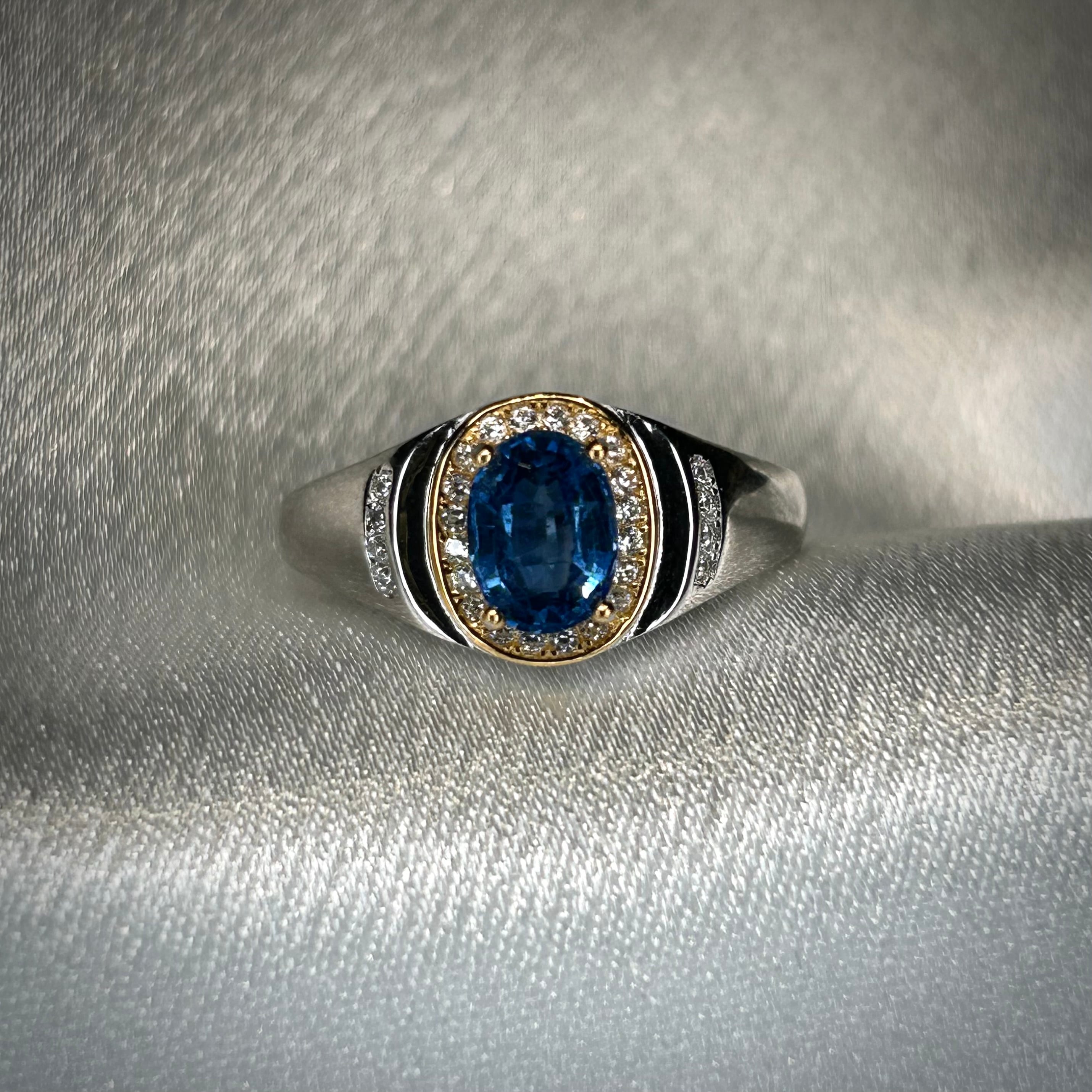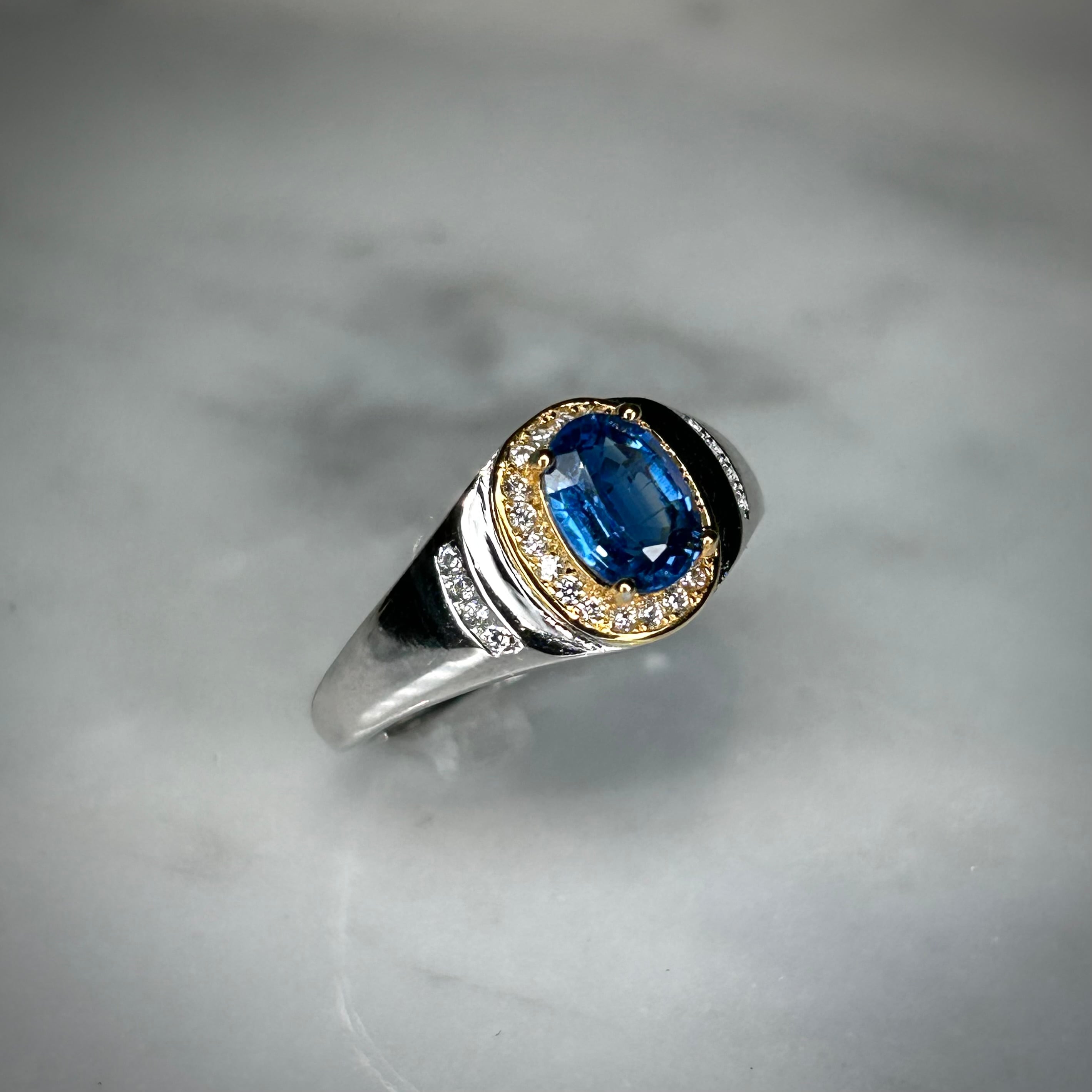 ゴールドカラーとのコンビカラーなのが華やかな印象で、ブルーカラーのカイヤナイトが映えるリングとなってます。