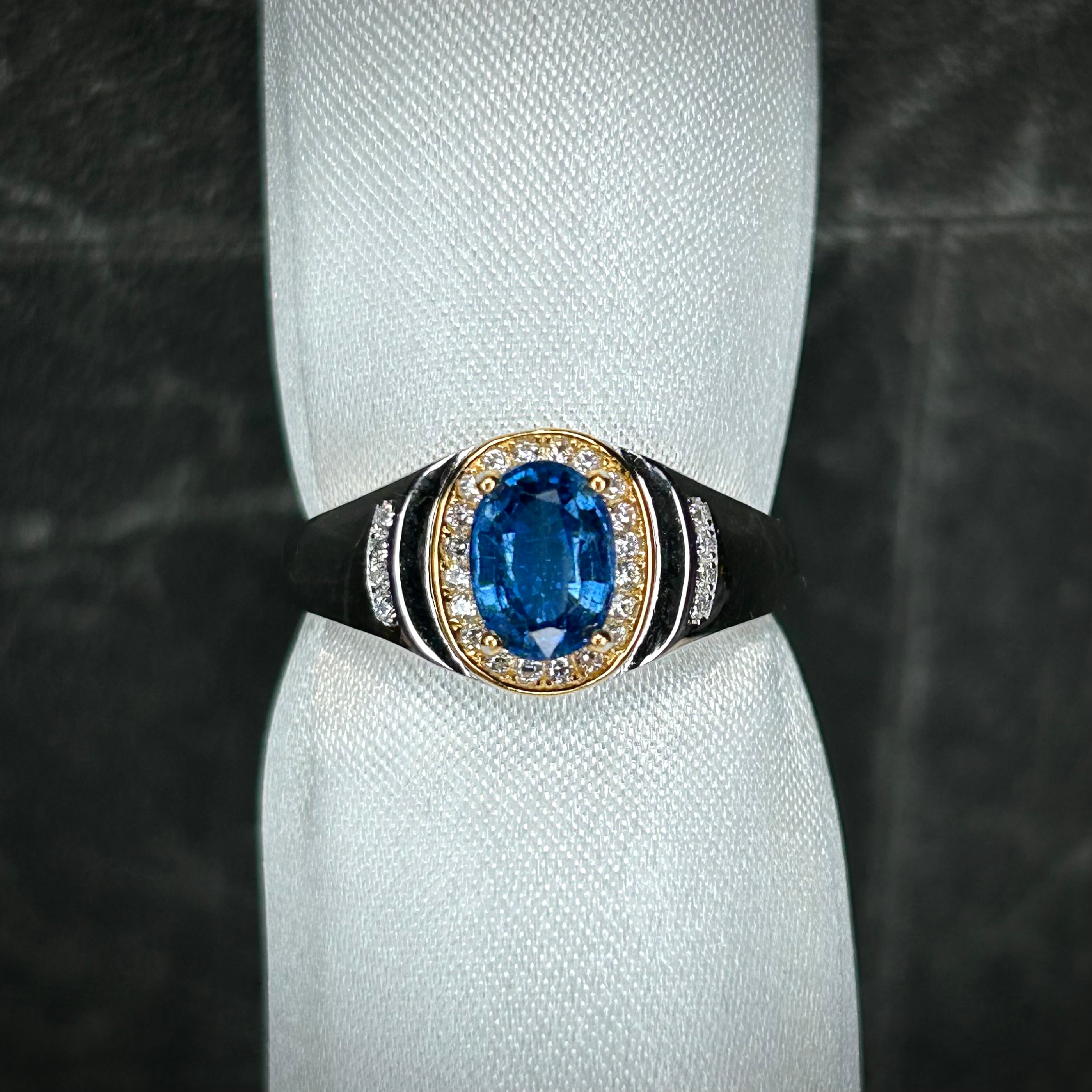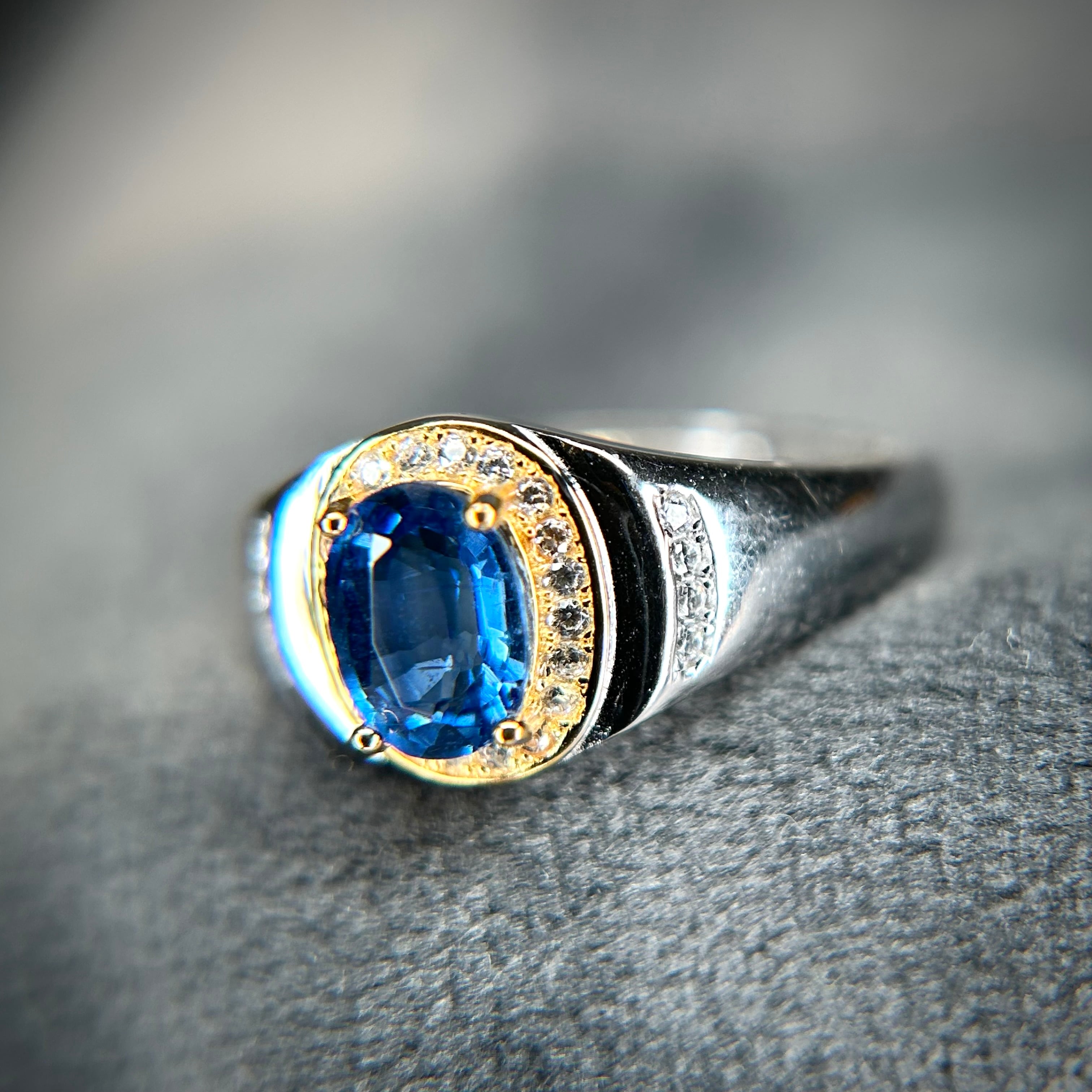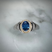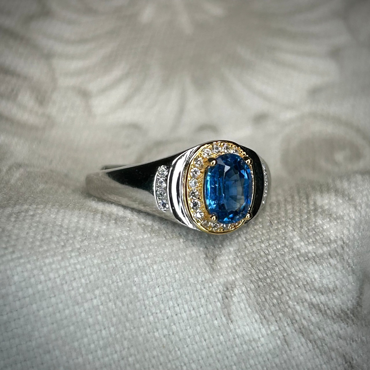 ゴールドカラーとのコンビカラーなのが華やかな印象で、ブルーカラーのカイヤナイトが映えるリングとなってます。