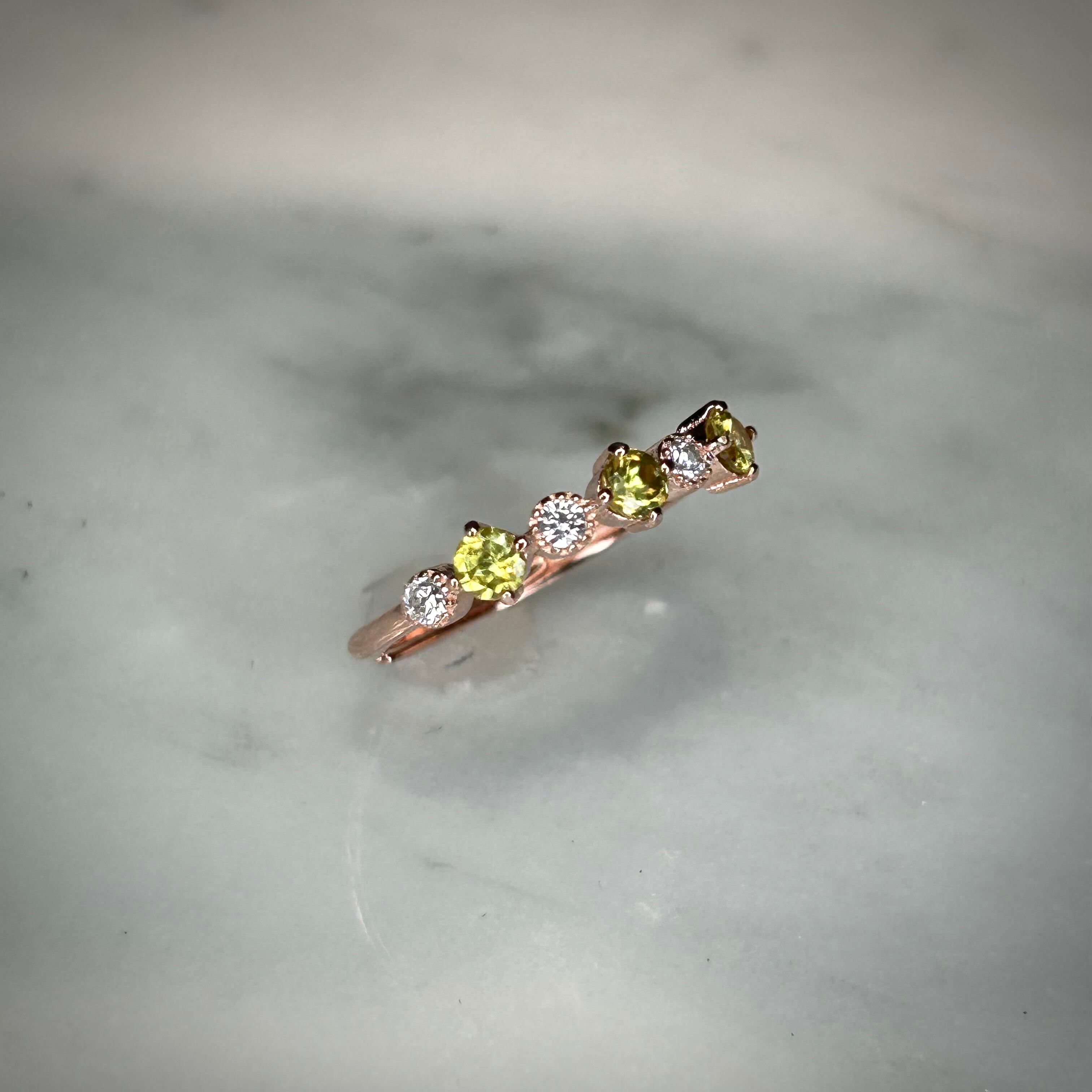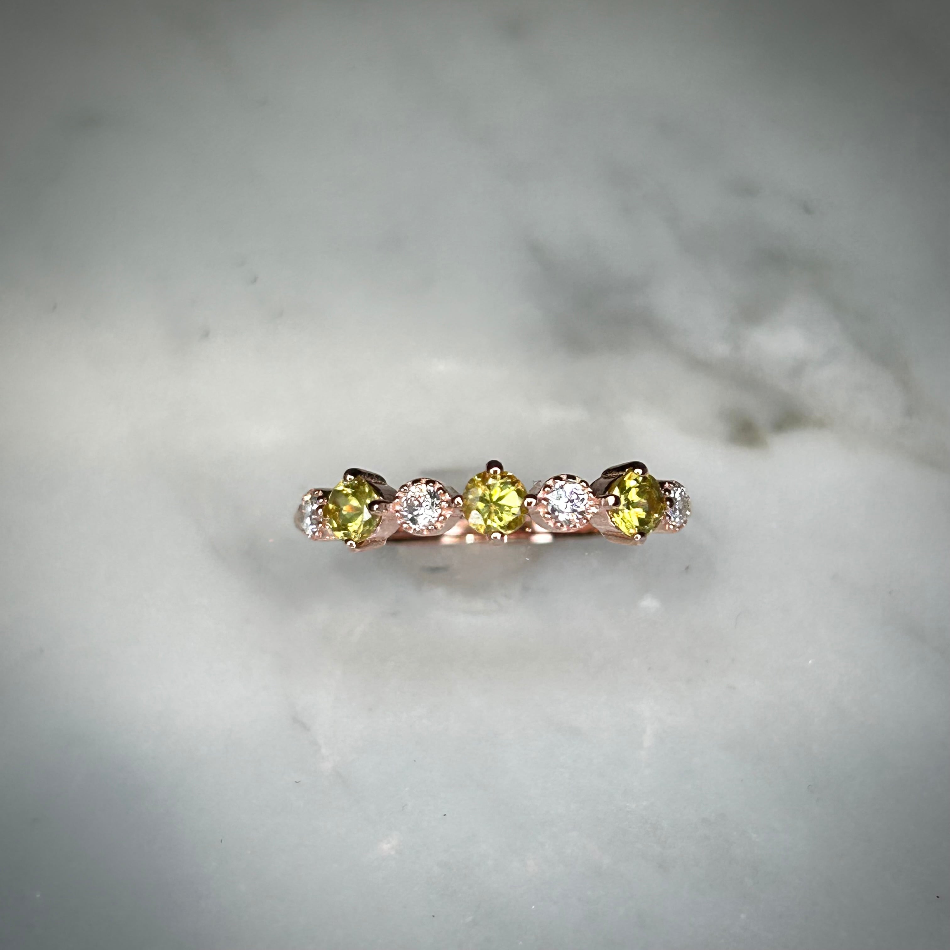 シルバー製ピンクゴールドカラー、スフェーンの3石リング。