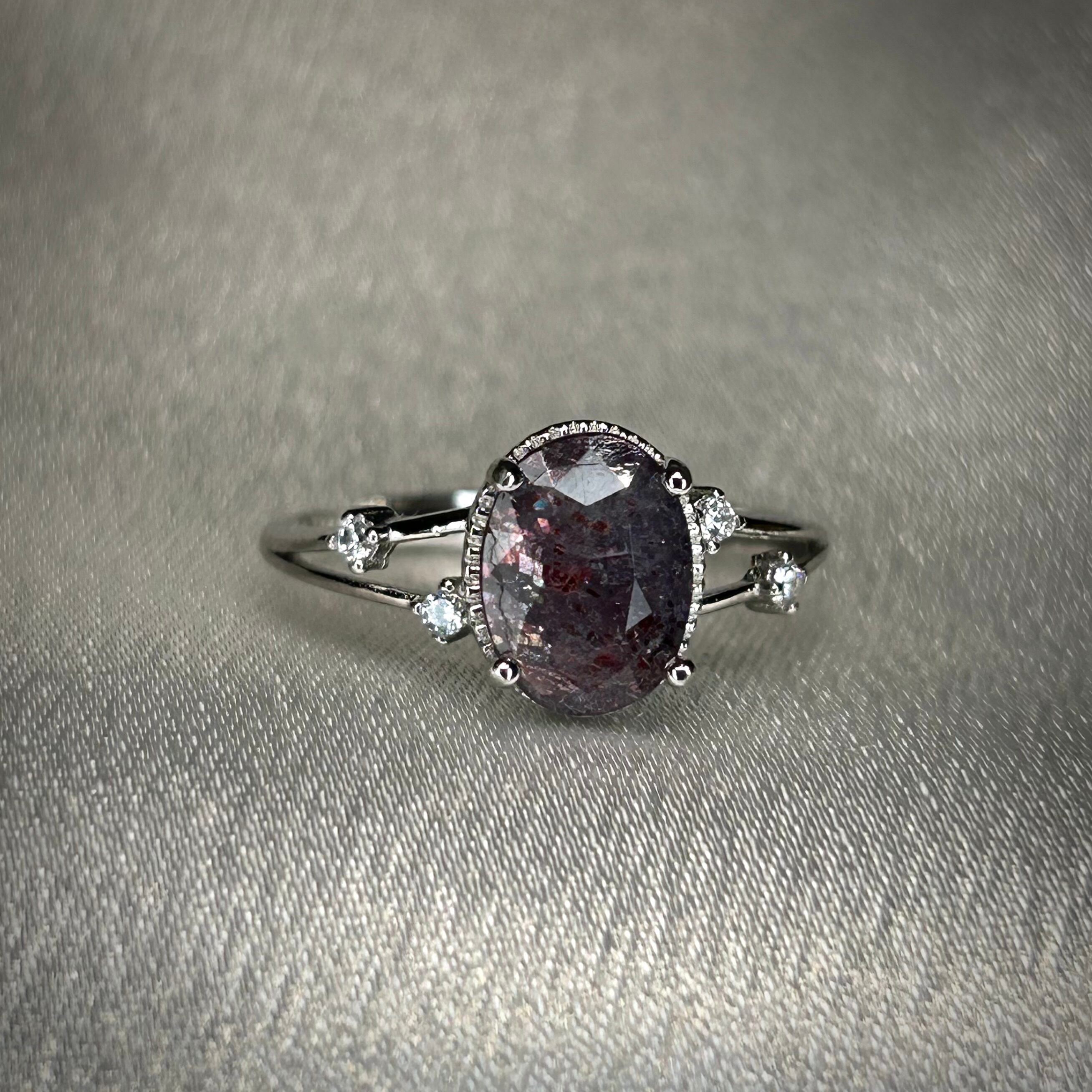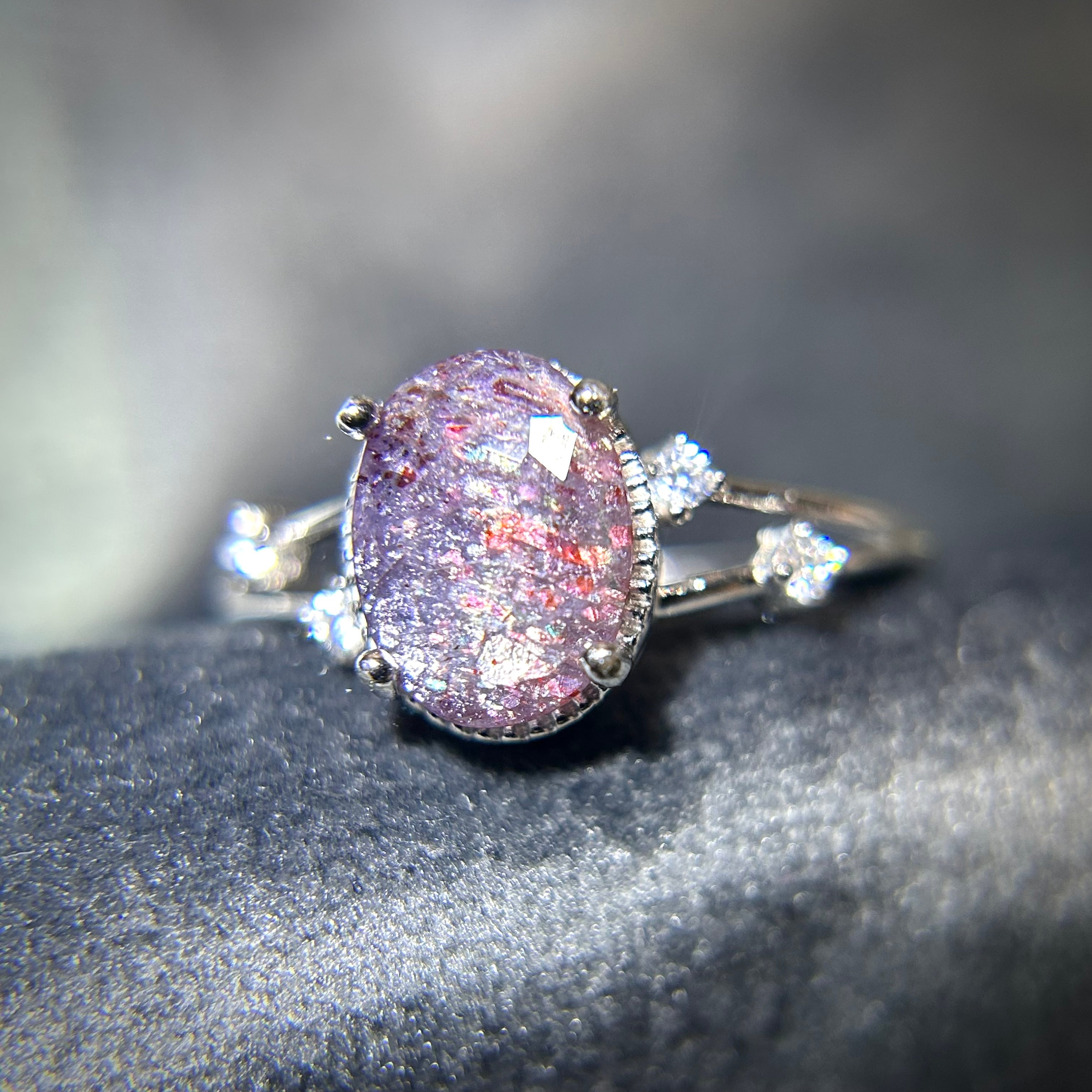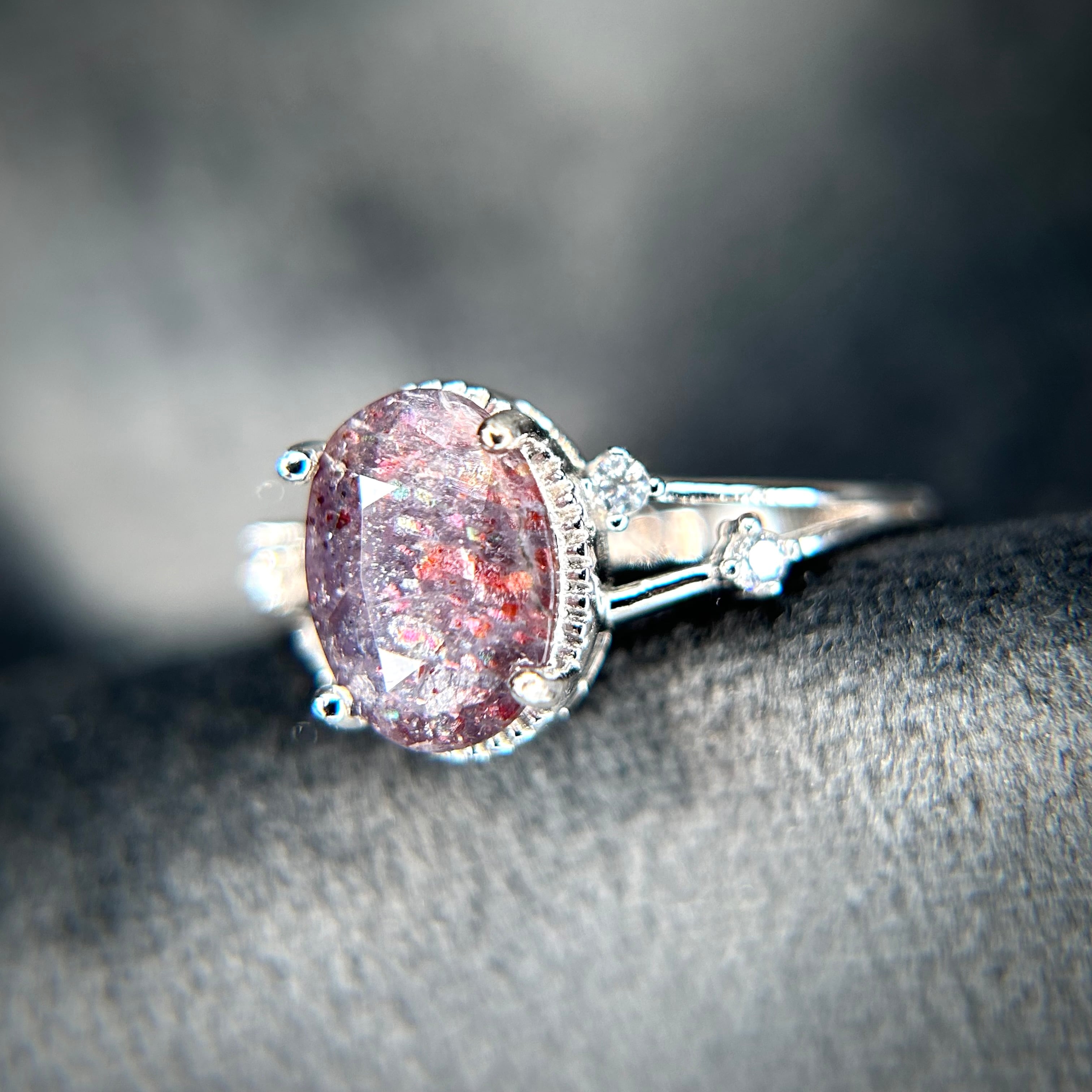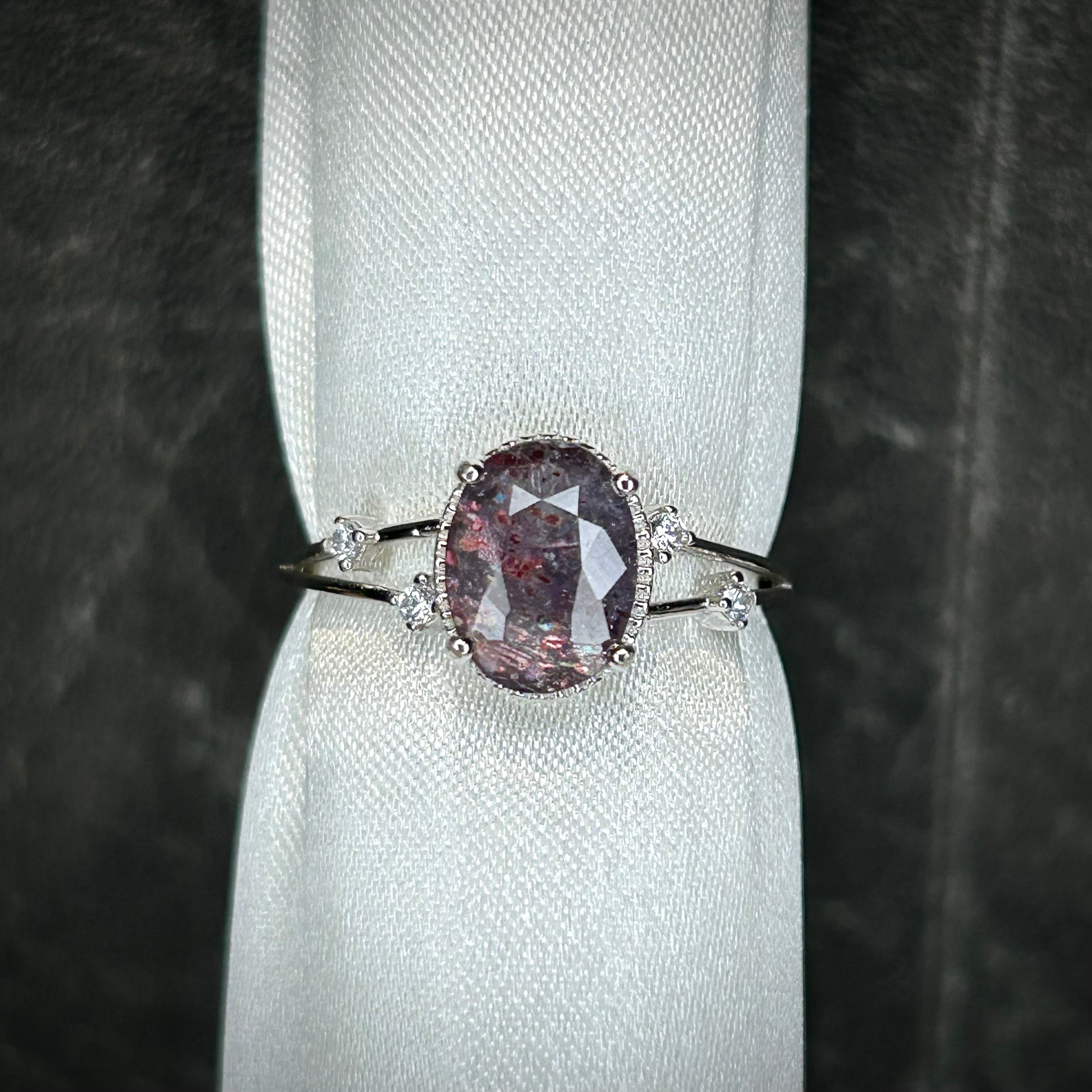 シルバー製、ブラッドショットアイオライトサンストーンのオーバルステーションリング。