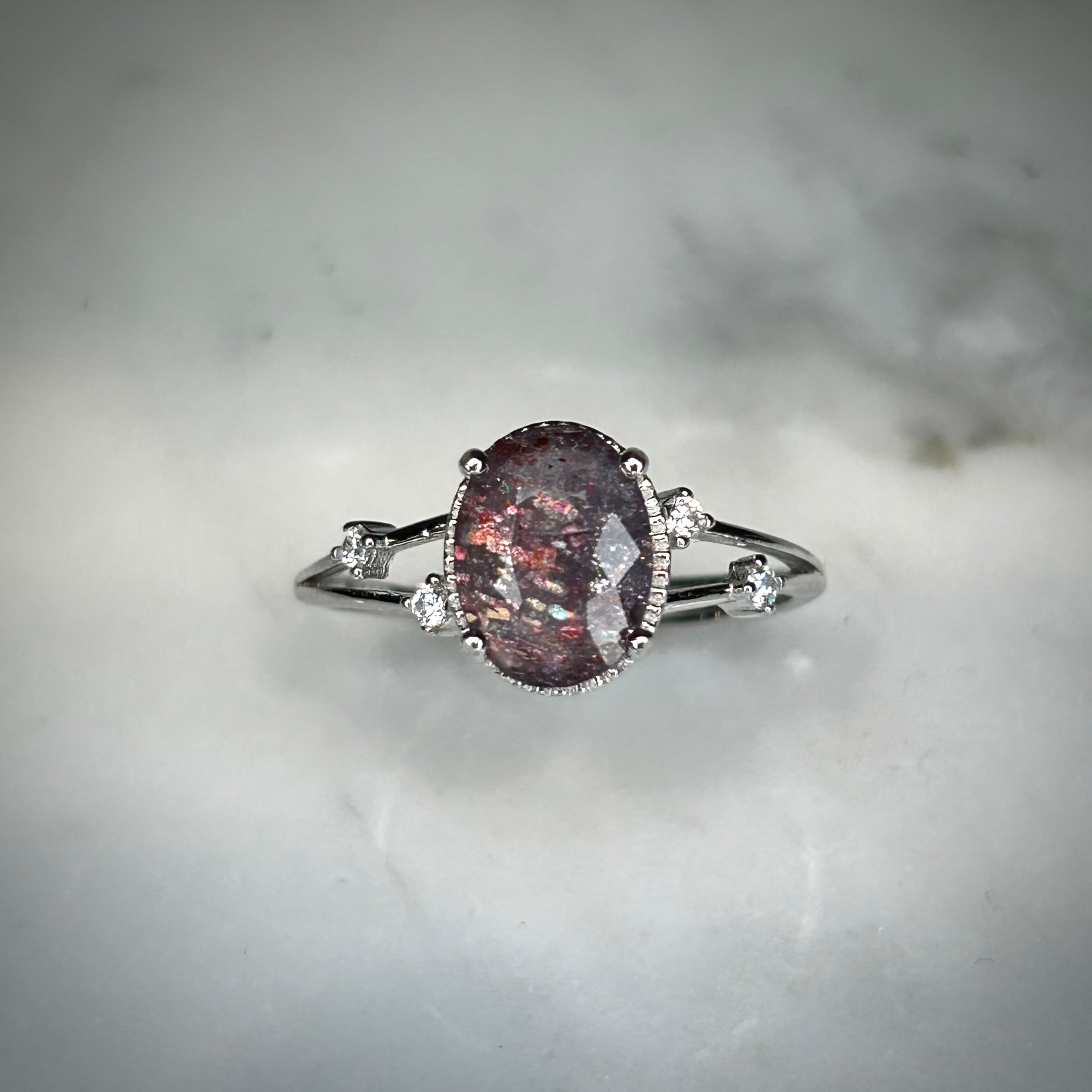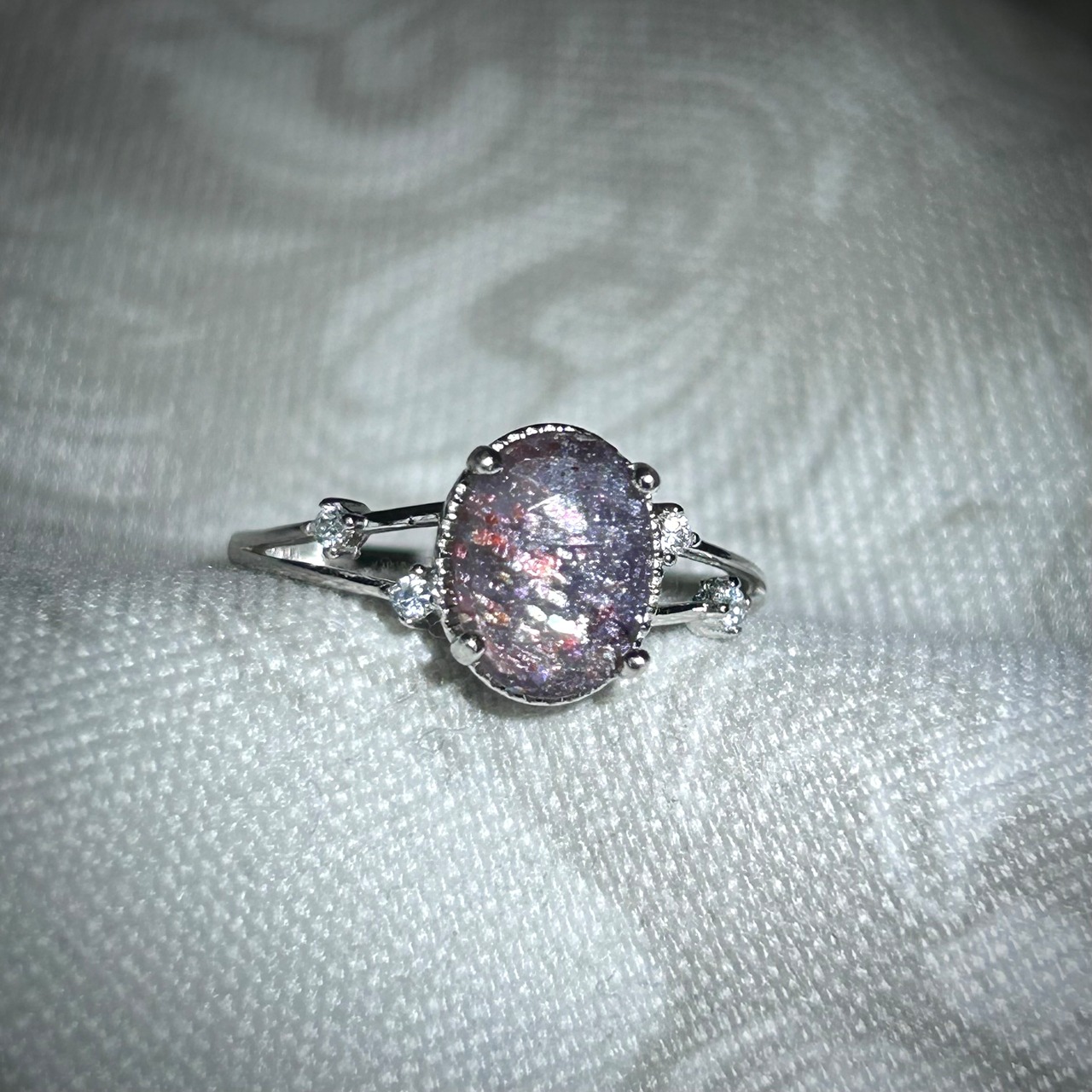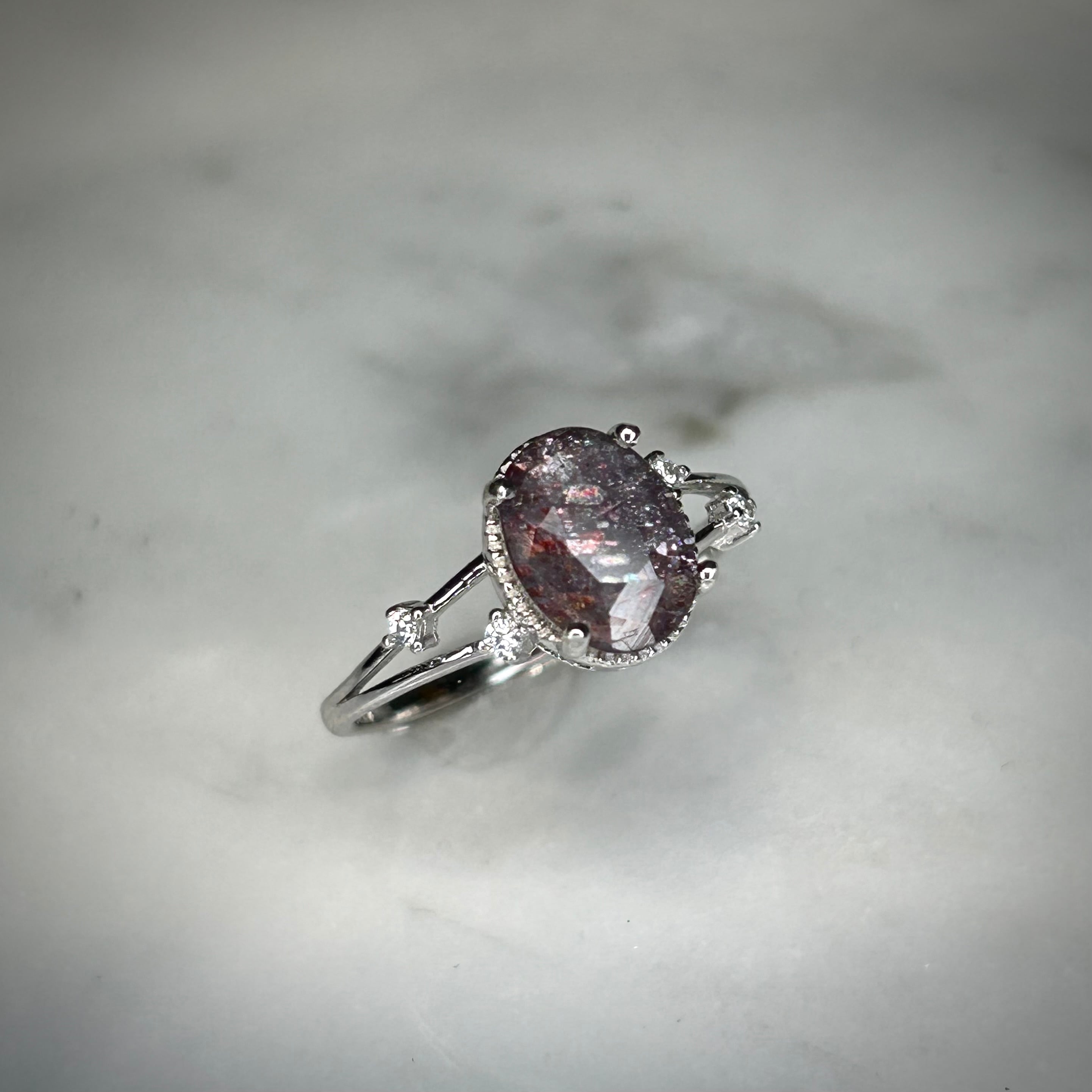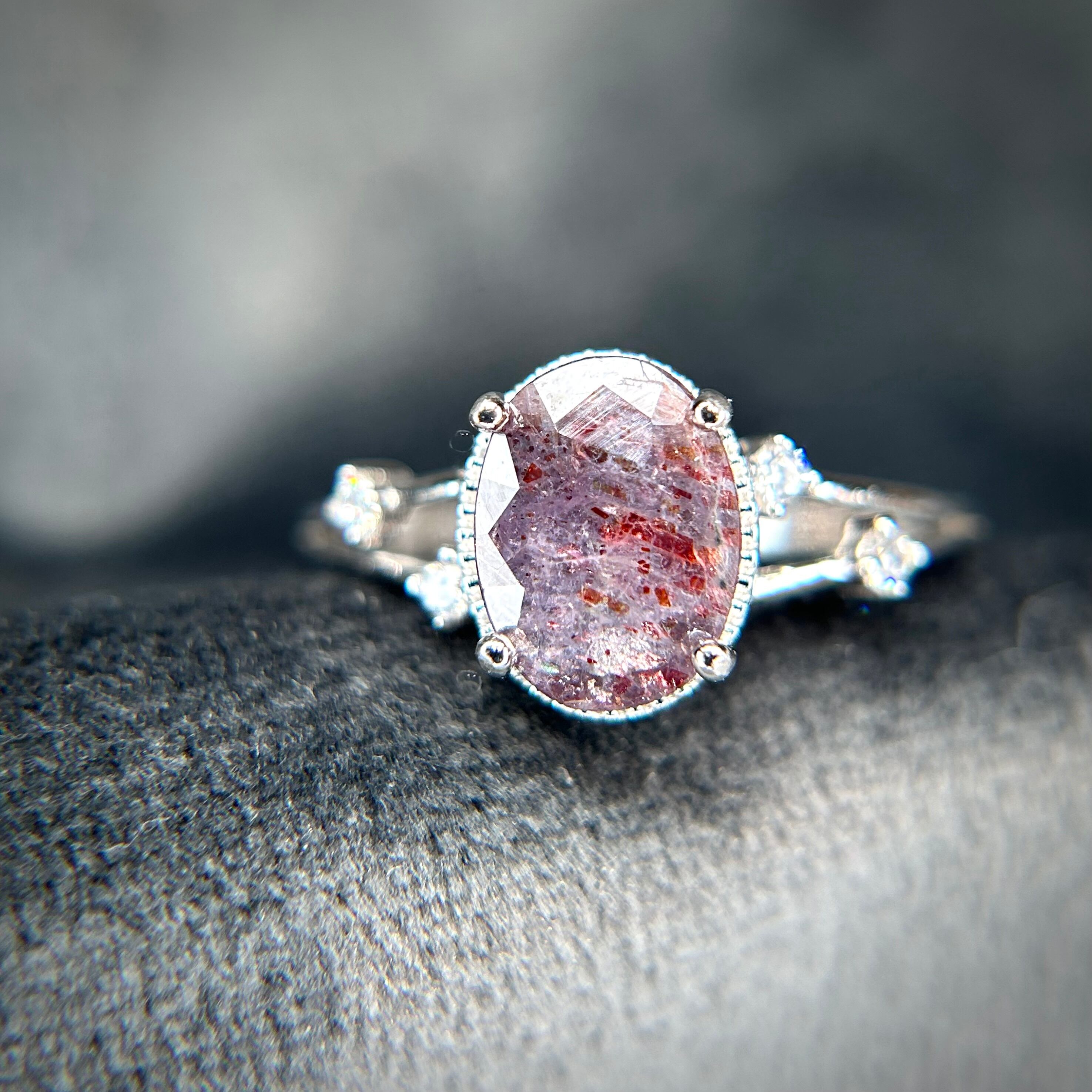 さりげなく両サイドに配置された脇石が派手過ぎず、ブラッドショットアイオライトサンストーンを引き立てるデザインとなってます。