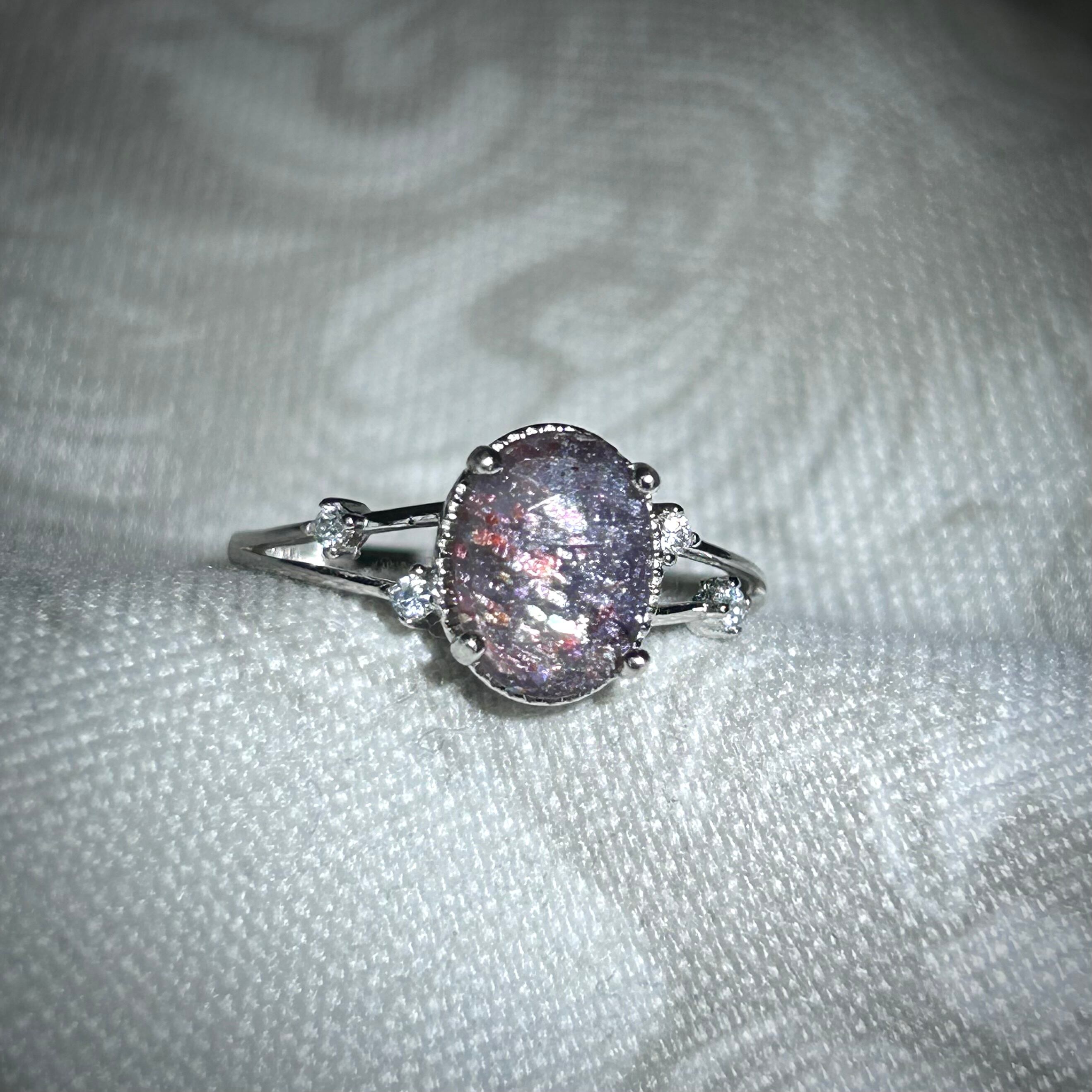 赤い内包物がキラキラと煌めく、ブラッドショットアイオライトサンストーンのアベンチュリンレッセンスが、まるで銀河に輝く星々の様で幻想的な雰囲気です。
