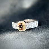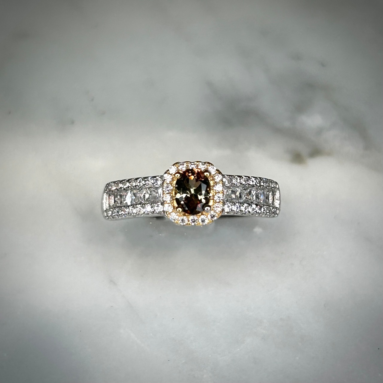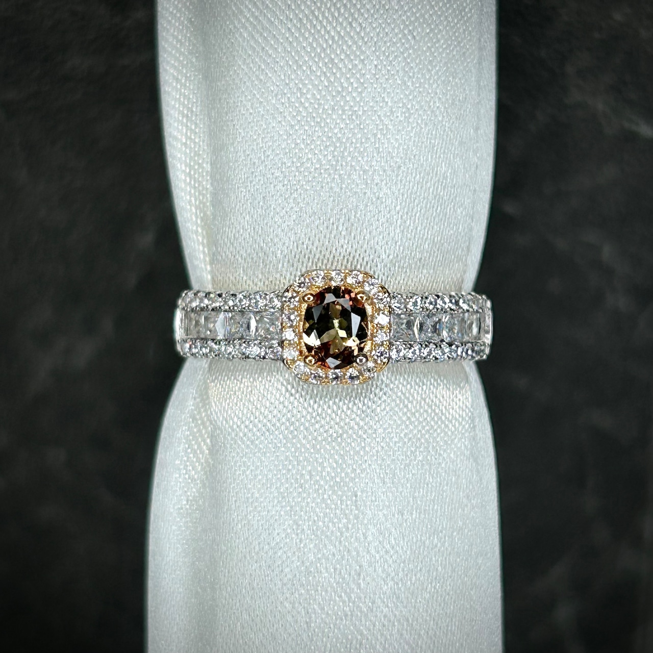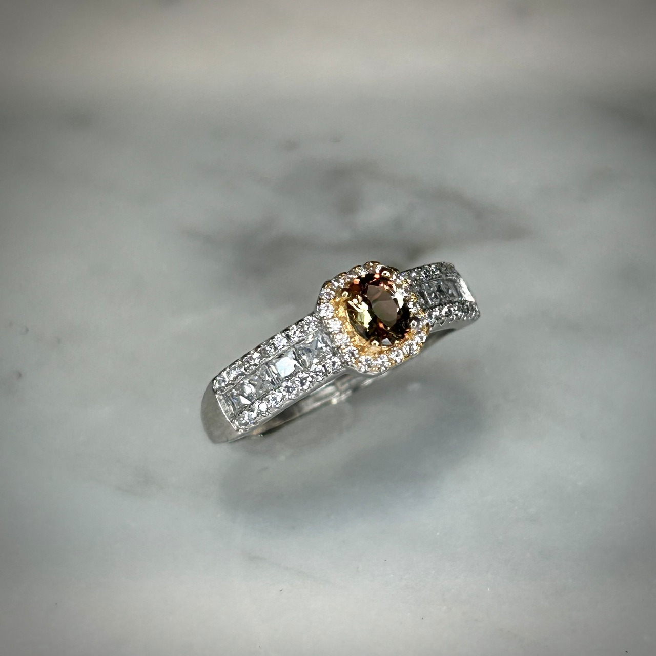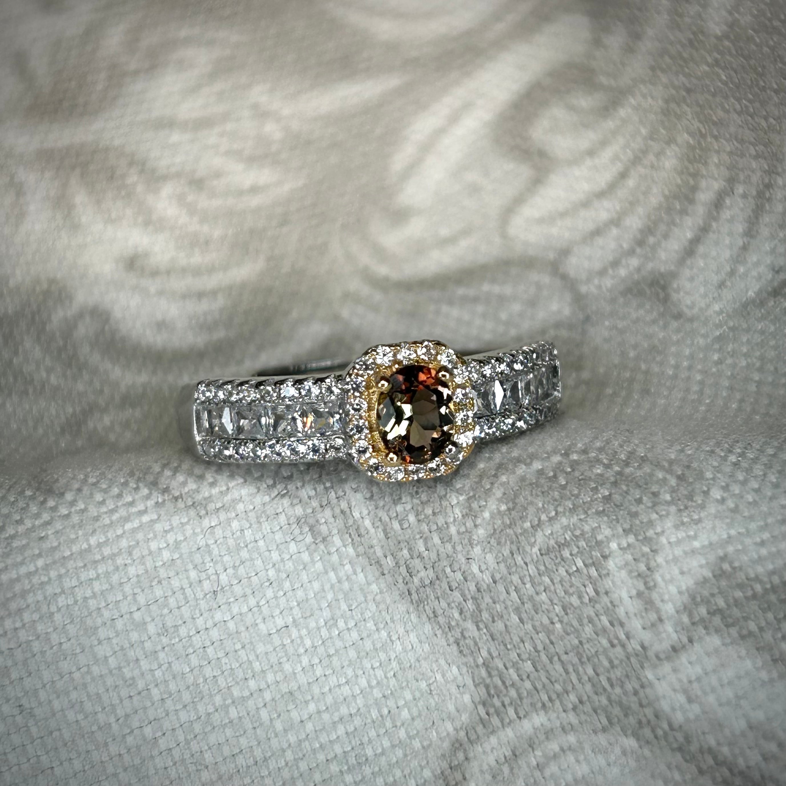 煌めく脇石の存在感にも負けない、美しいアンダリュサイトが楽しめる華やかなリングです。