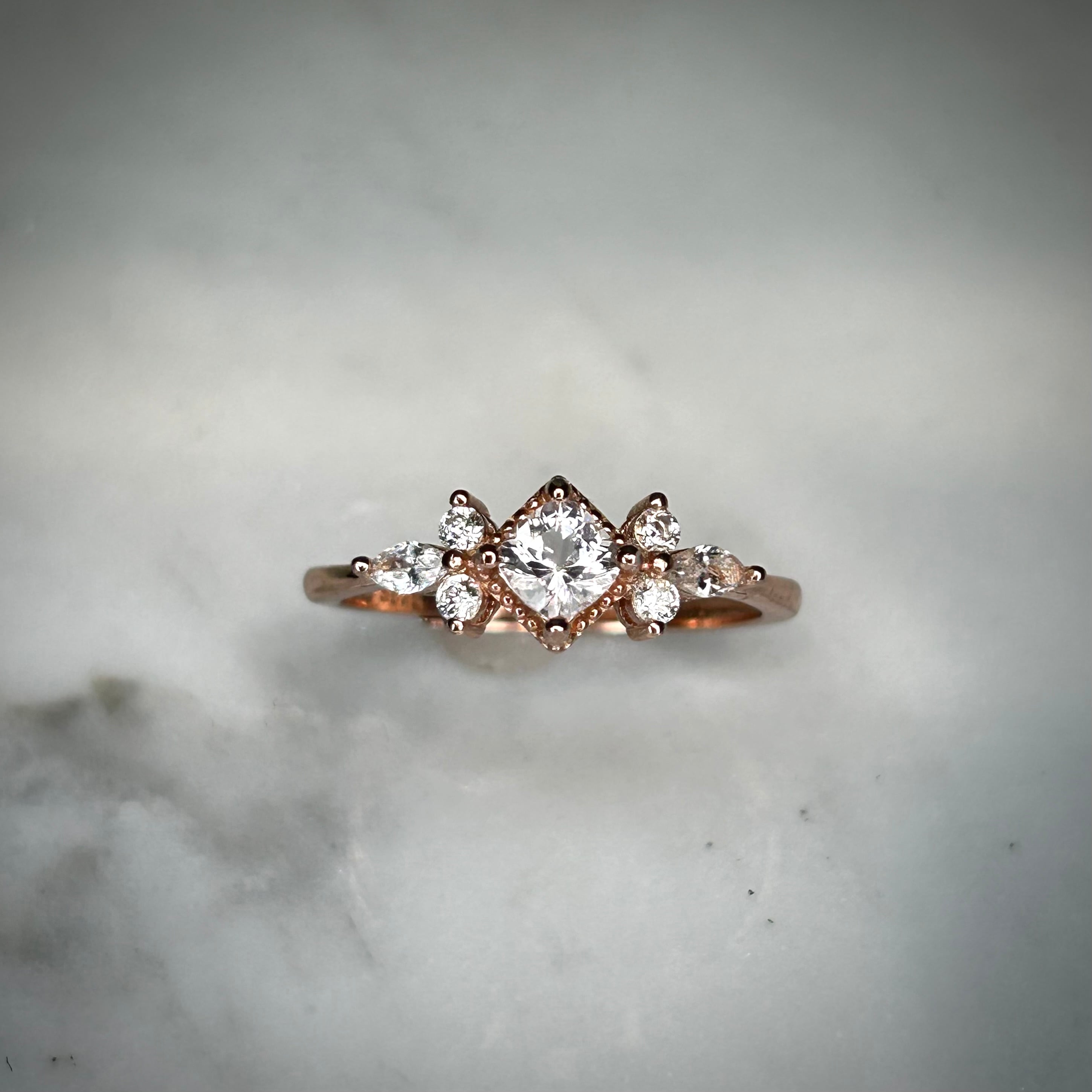 脇石のマーキスカットがアクセントになり、エレガントなリングです。