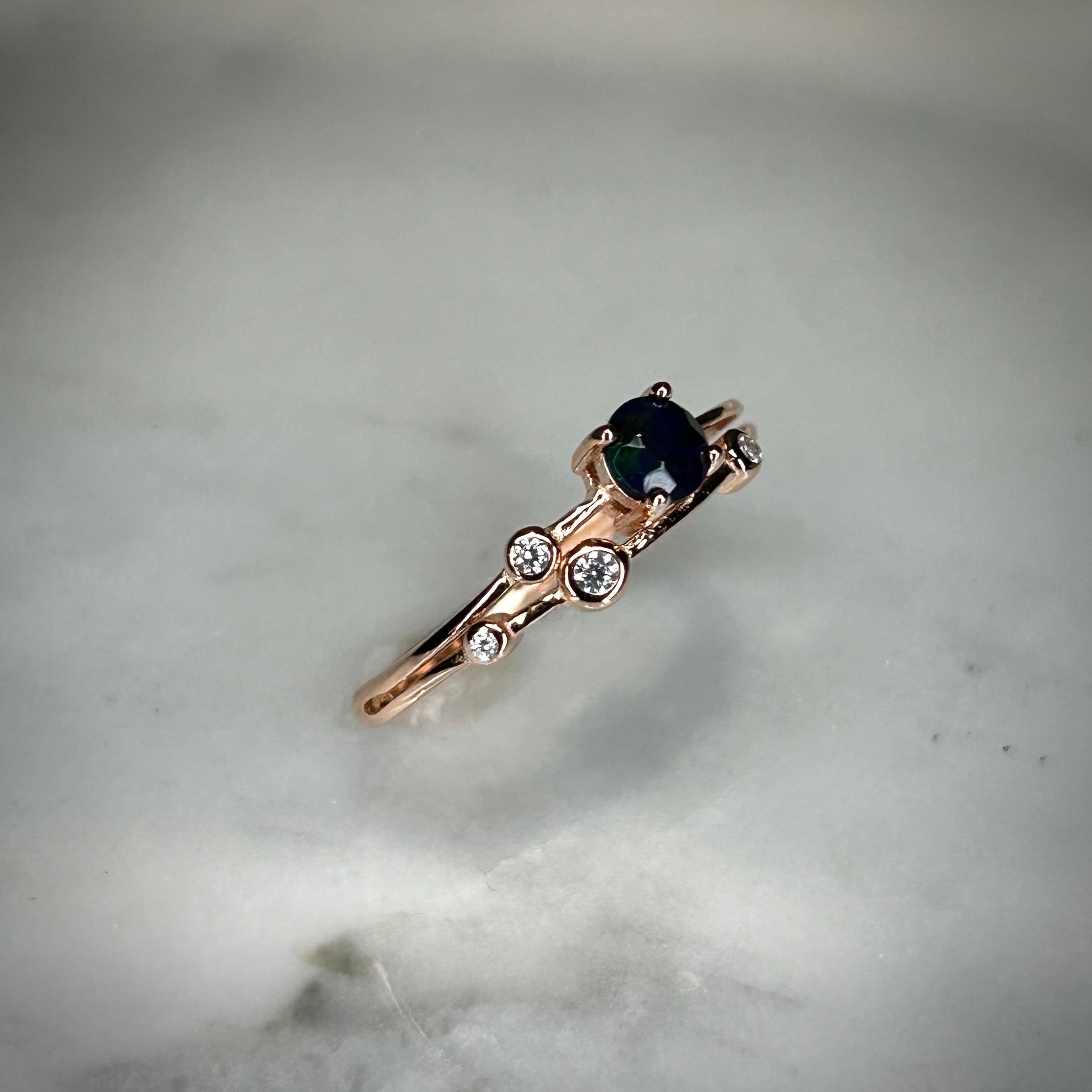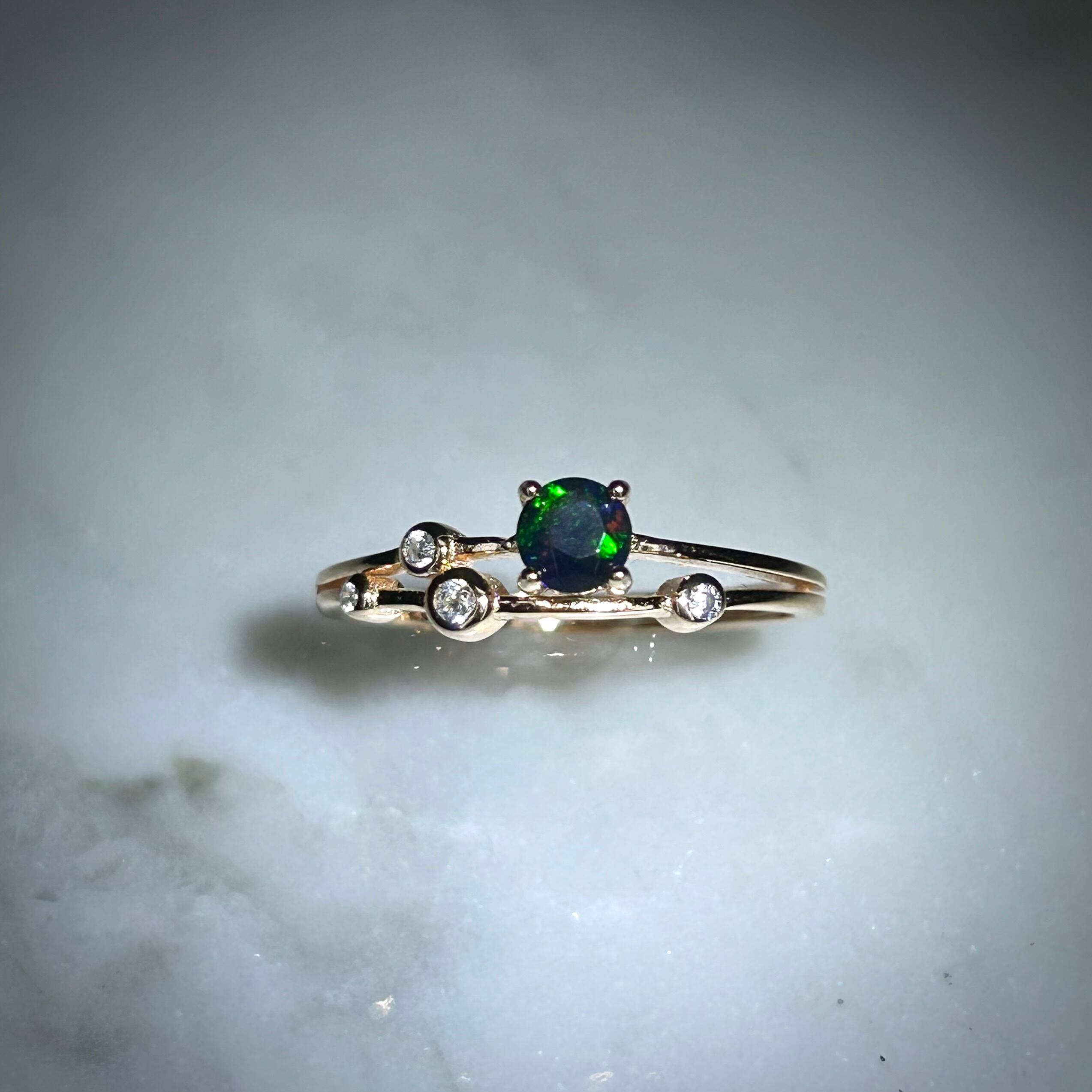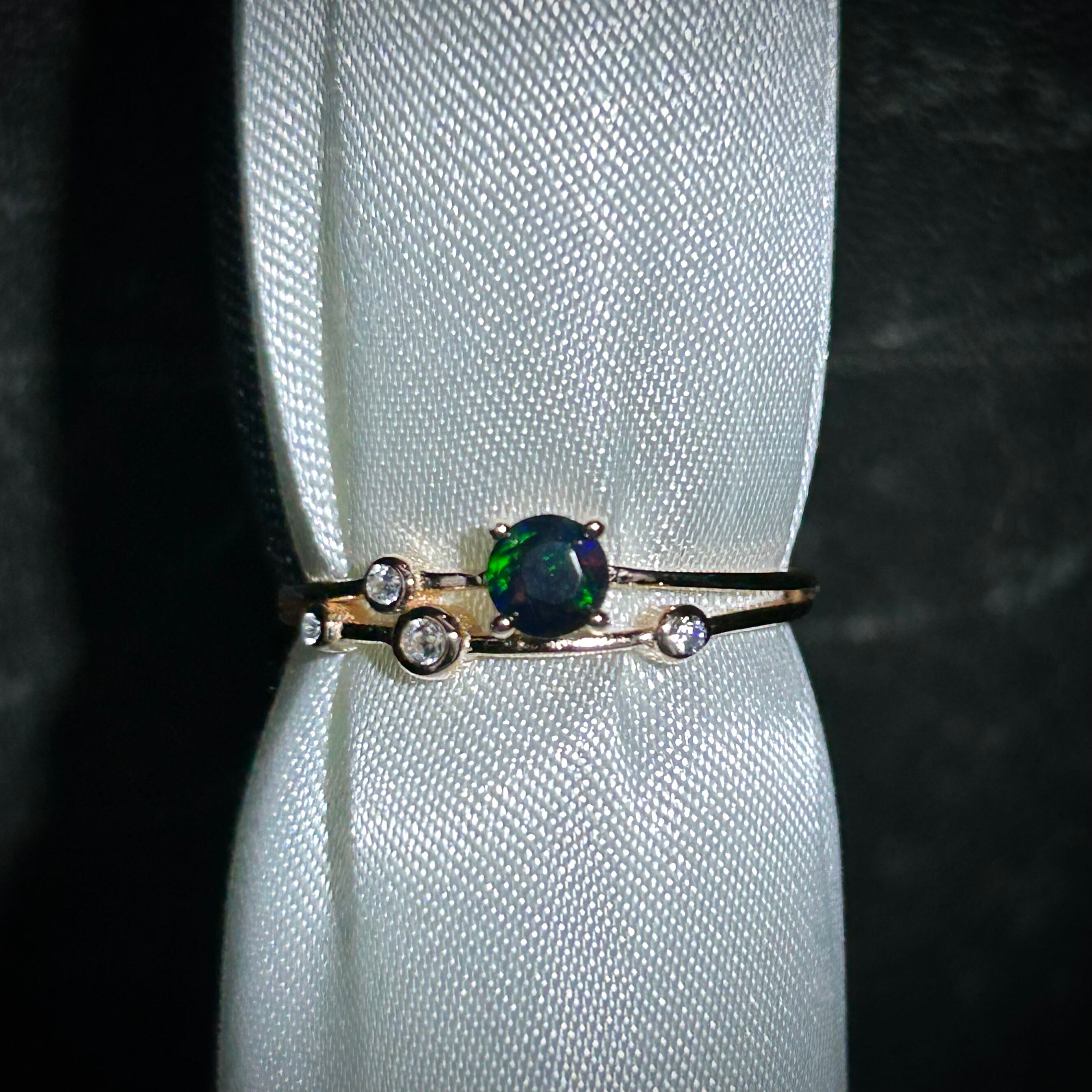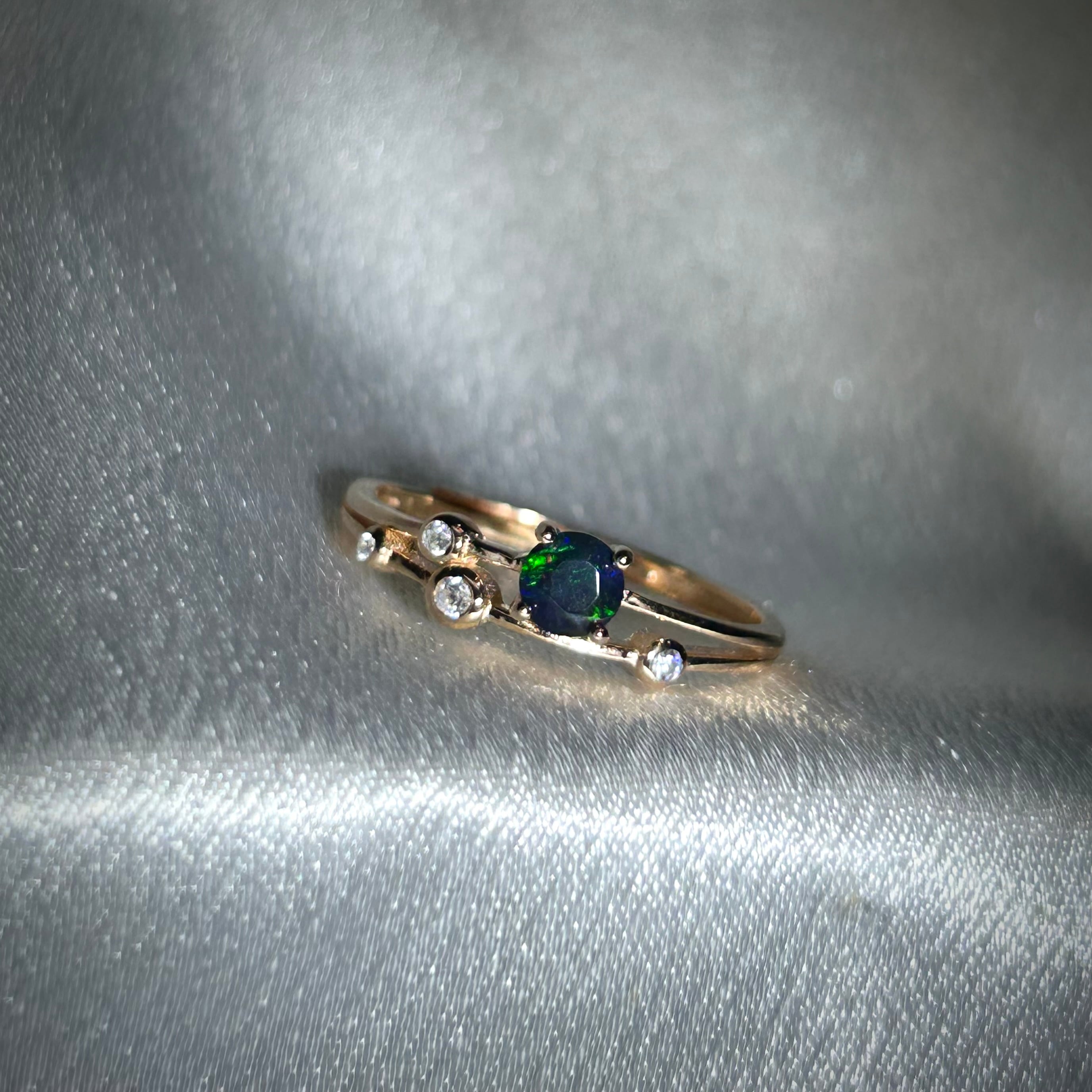 ブラックカラーに浮かび上がる遊色が面白く個性的なリングです。