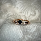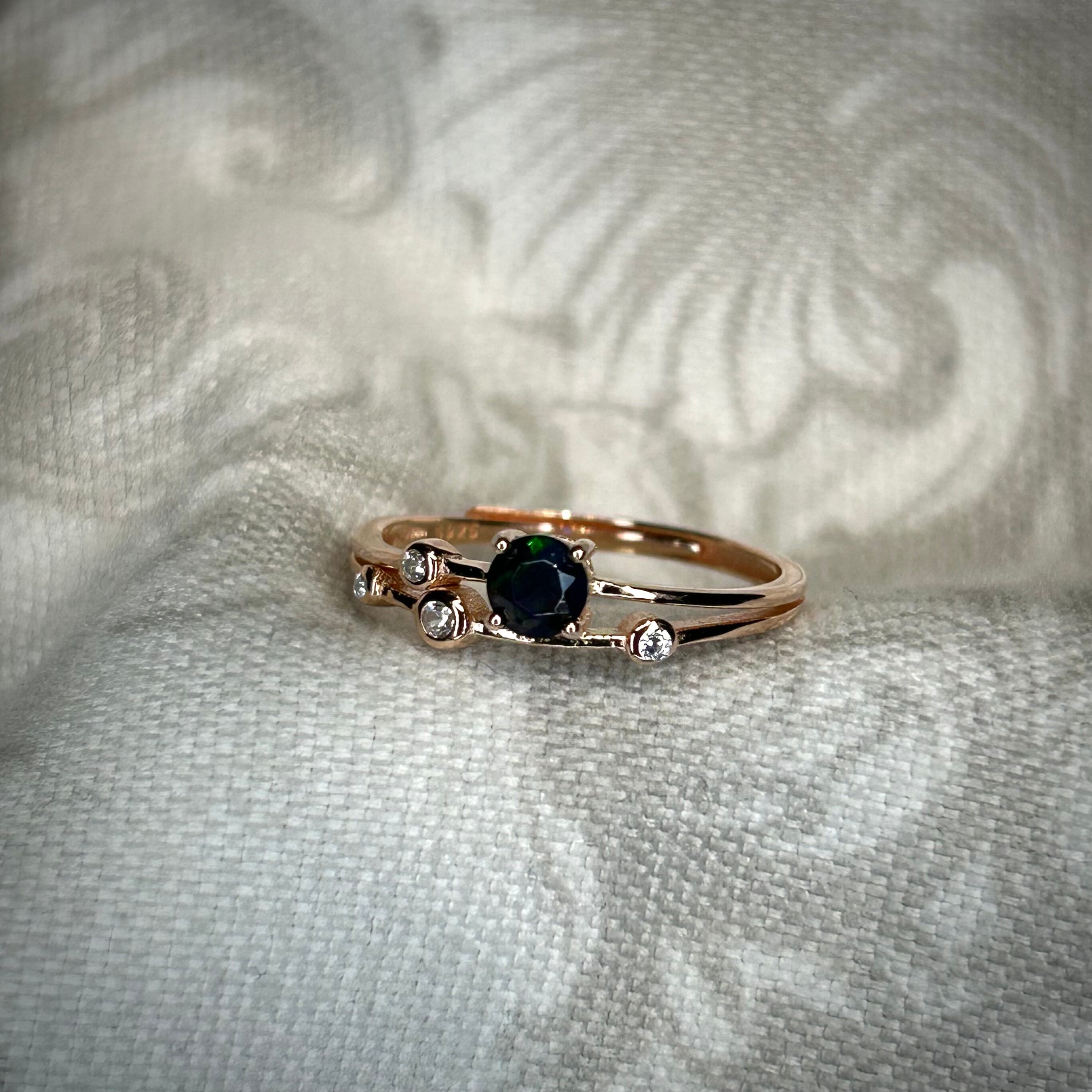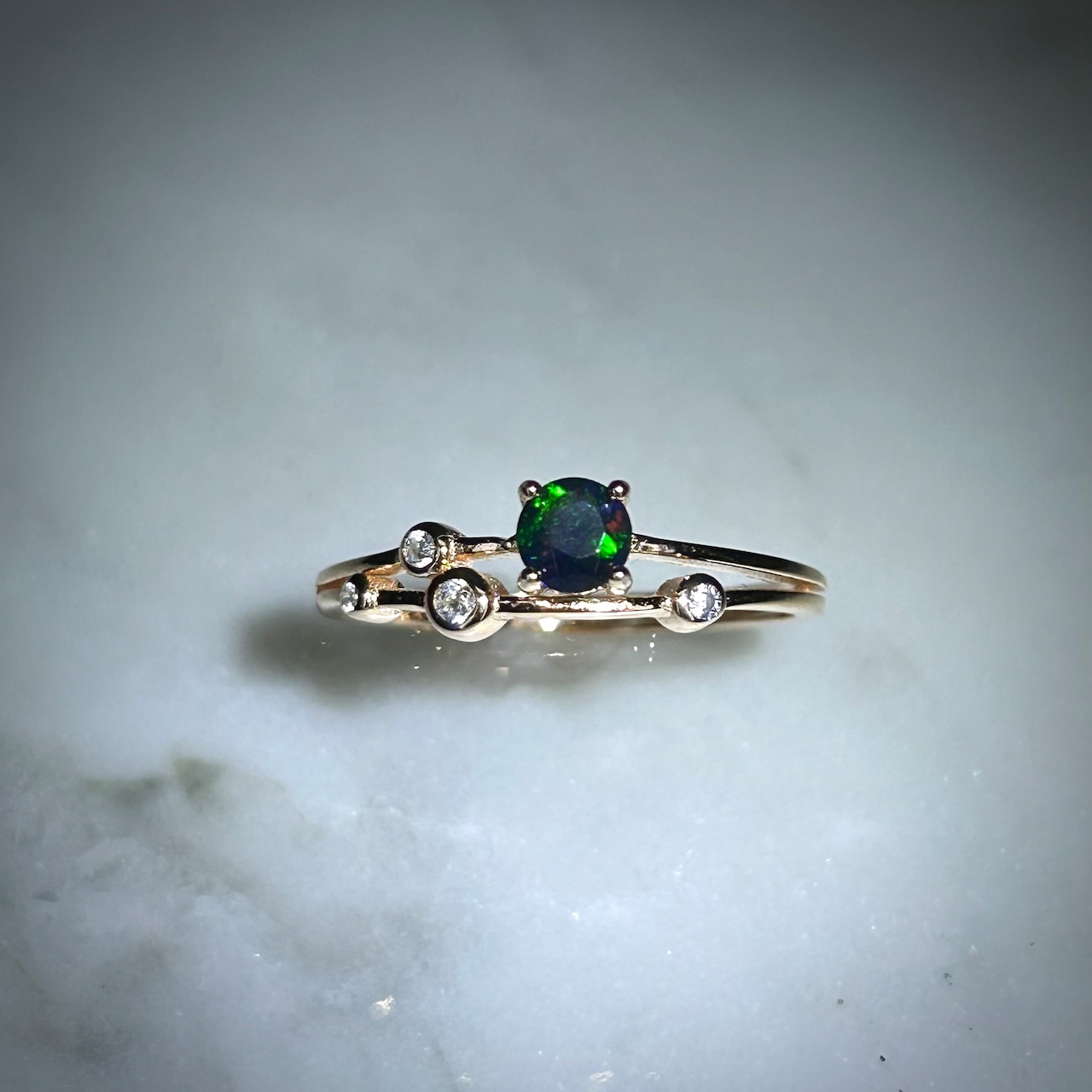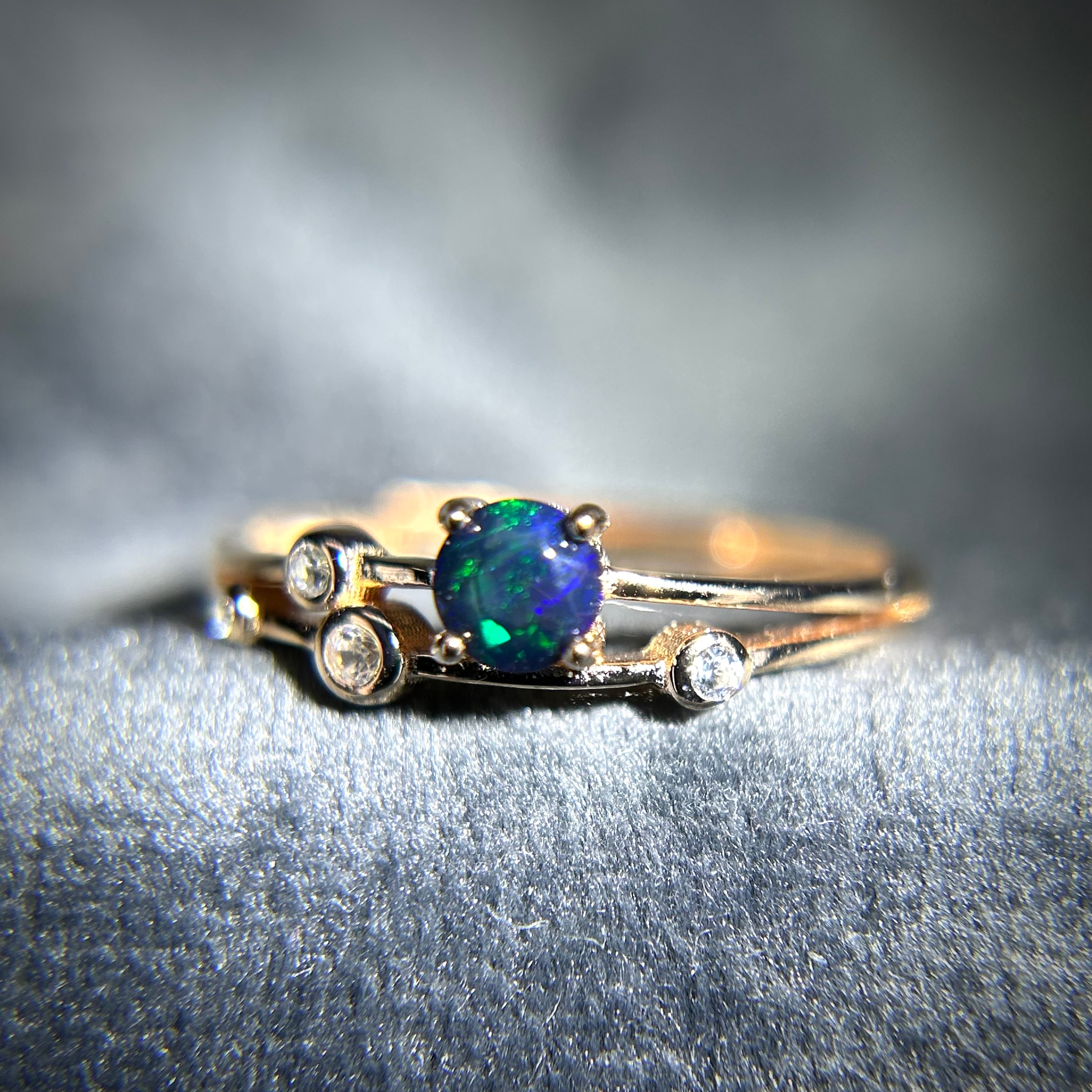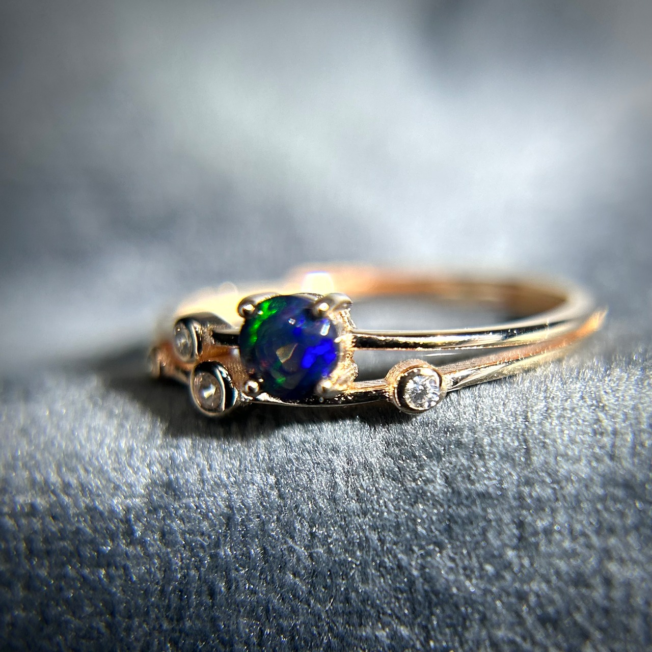 ブラックカラーに浮かび上がる遊色が面白く個性的なリングです。