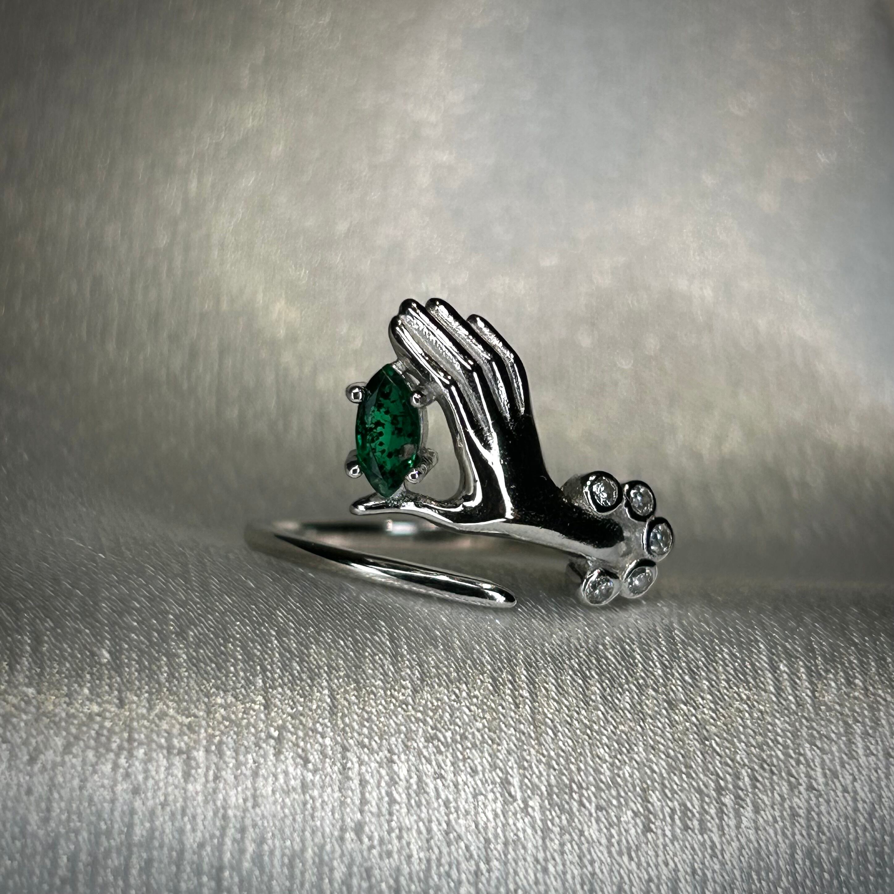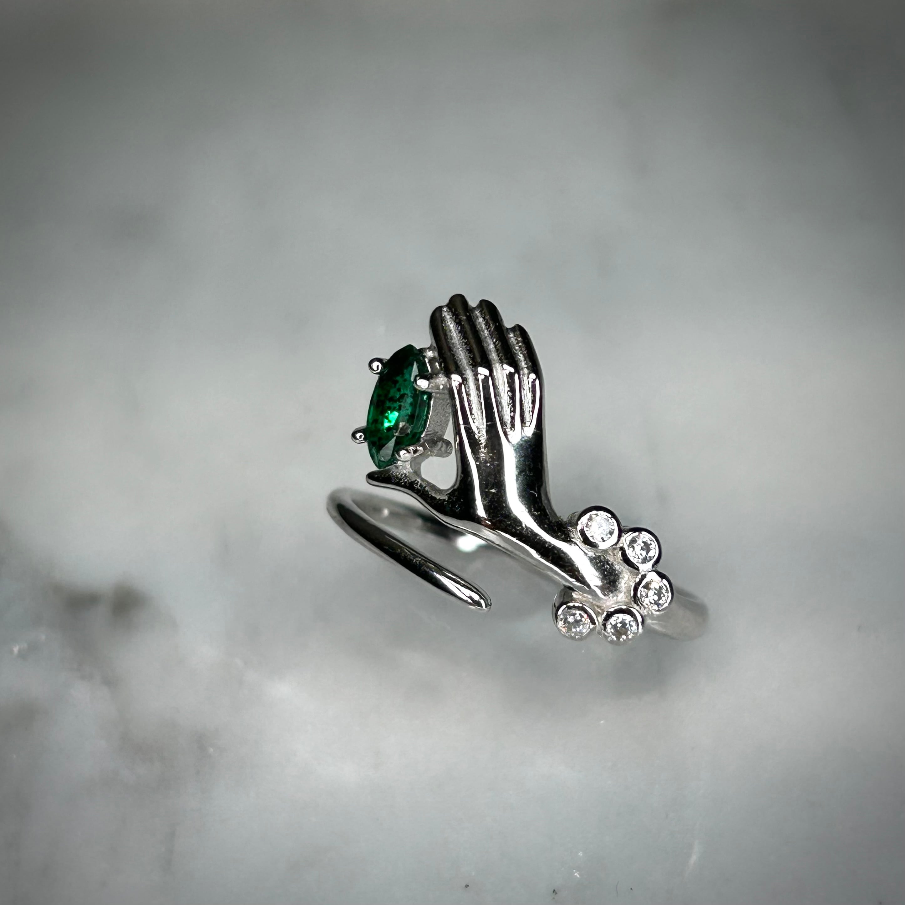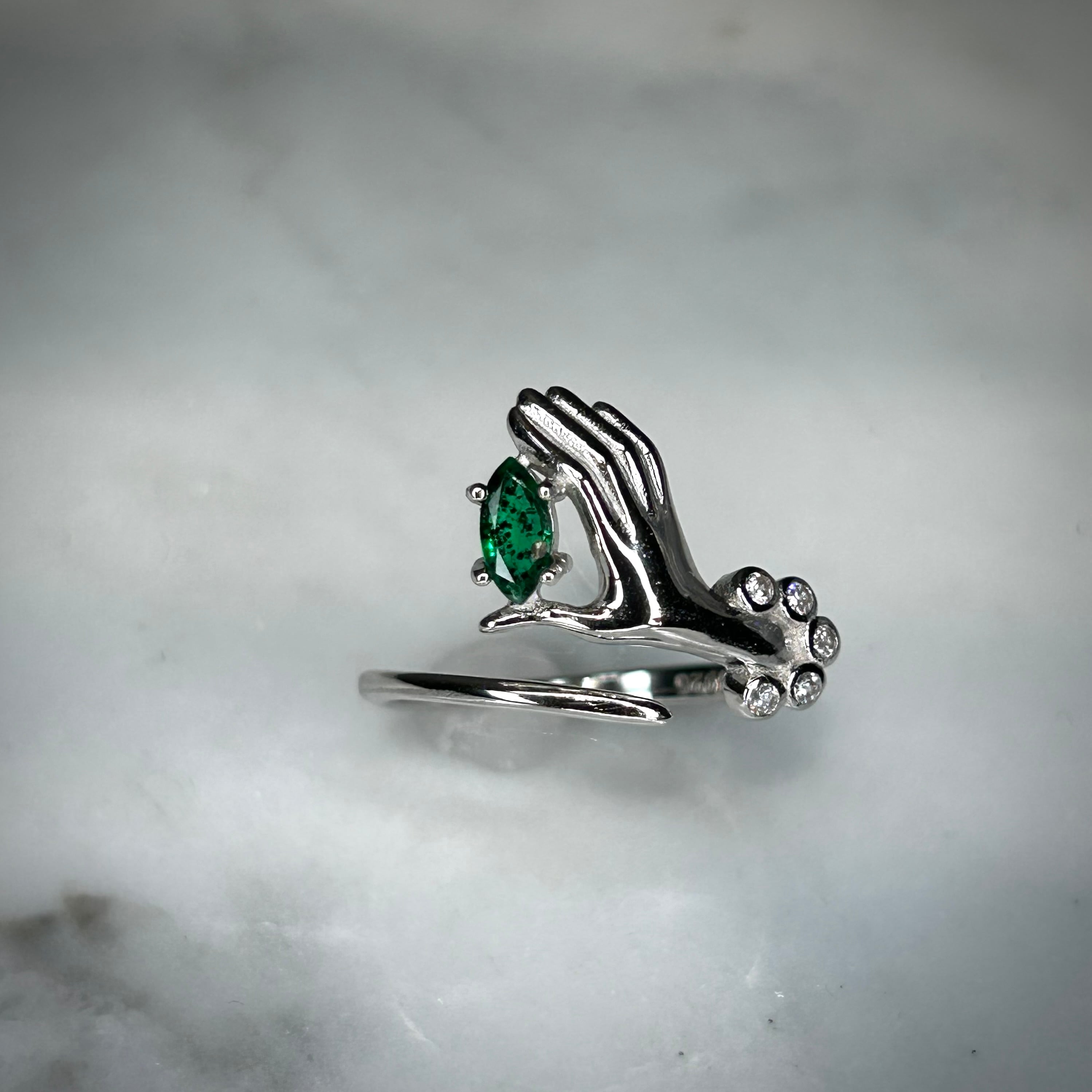 内包物にパイライトを含んだエメラルドを、手をモチーフにした面白く個性的なデザインに合わせた、個性の光るリングです。