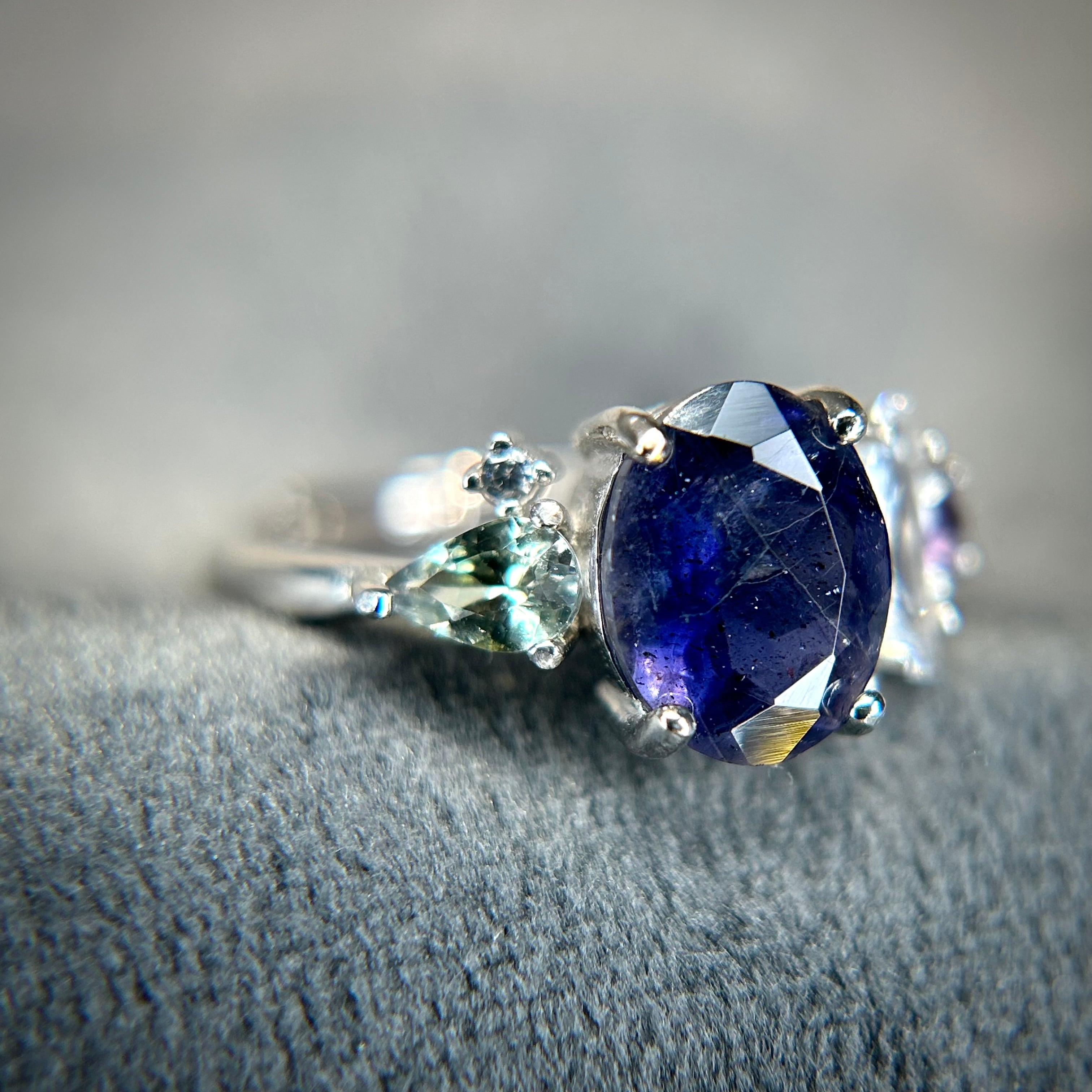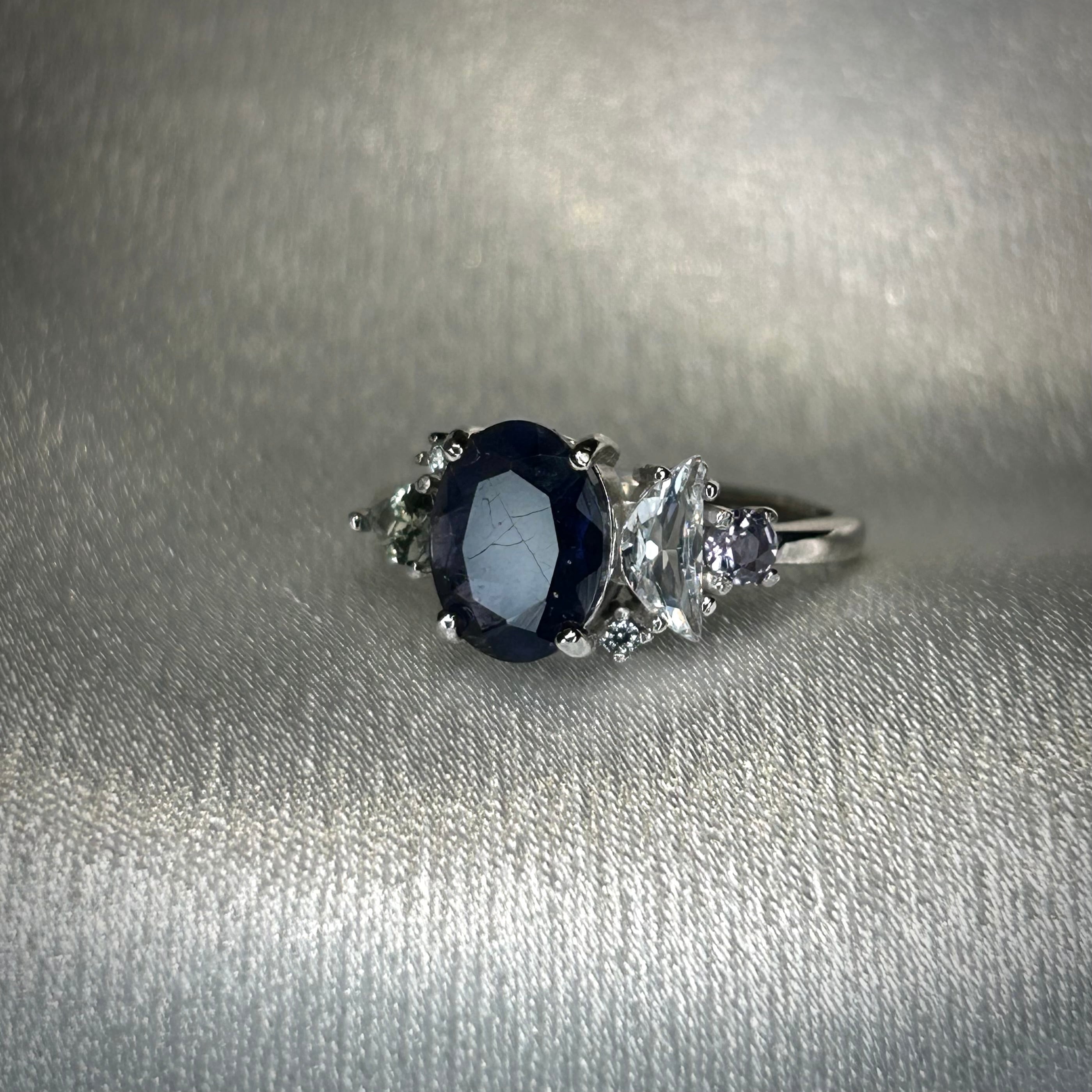 シルバー製、アイオライトサンストーン&ゾイサイト&サファイアを使用したリアンリング。