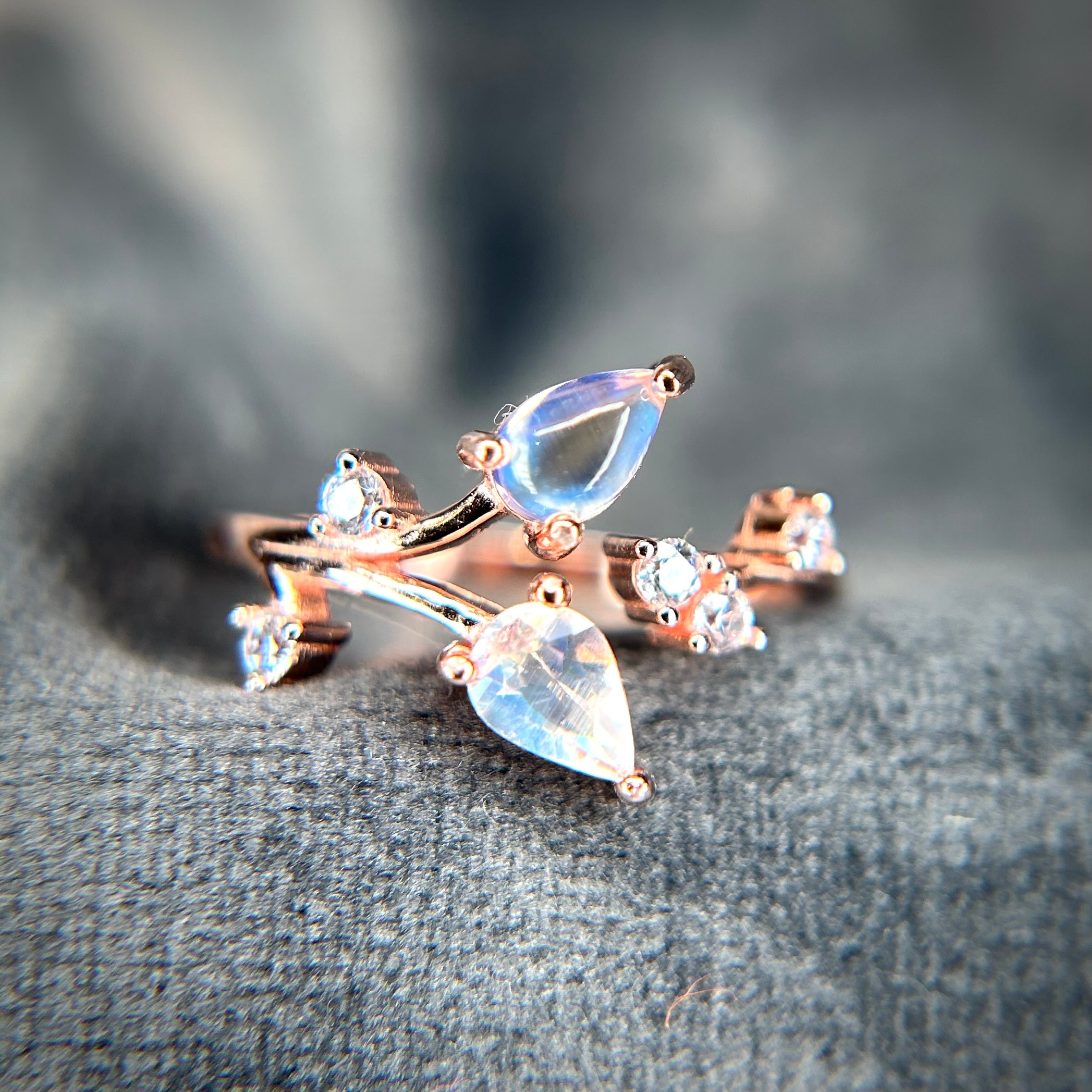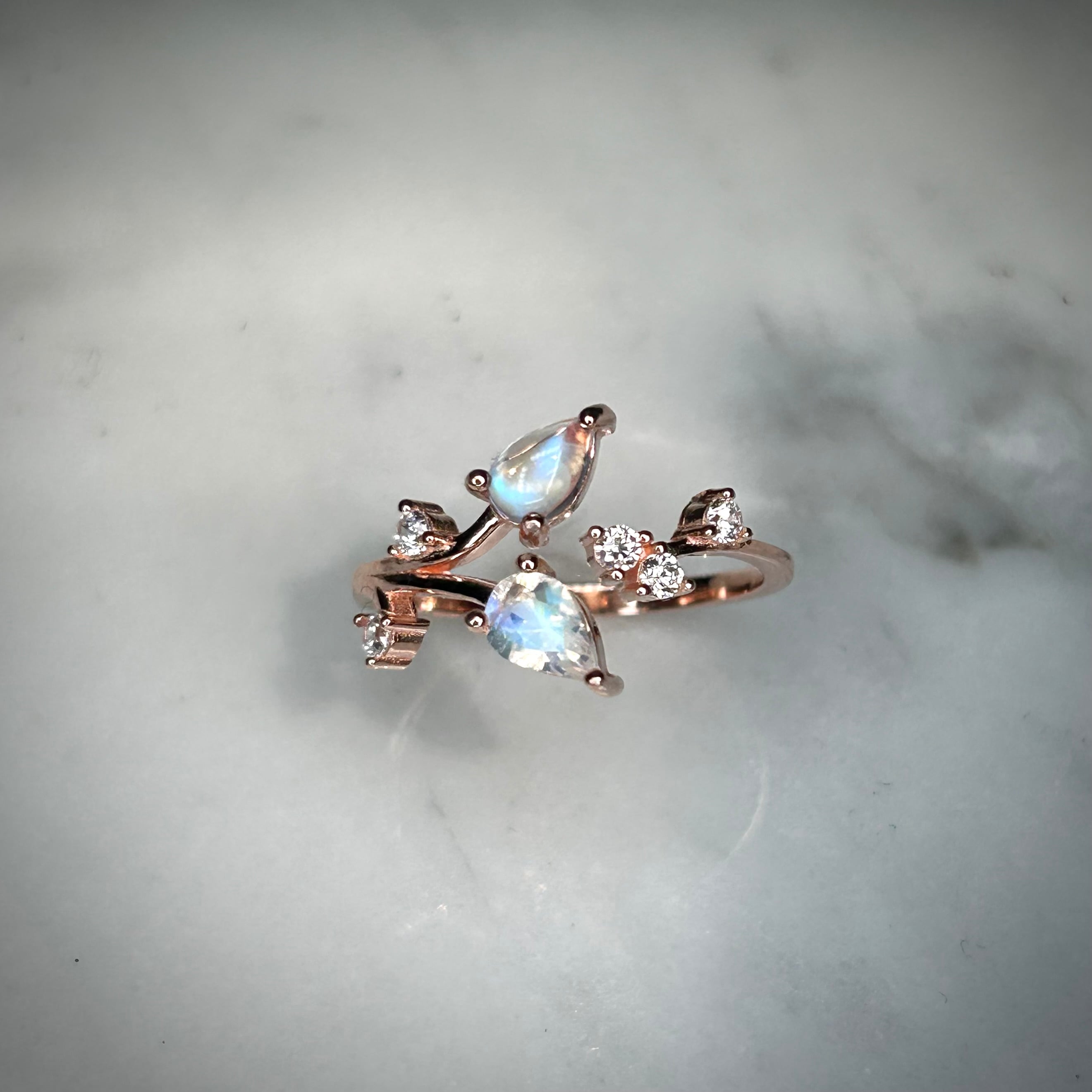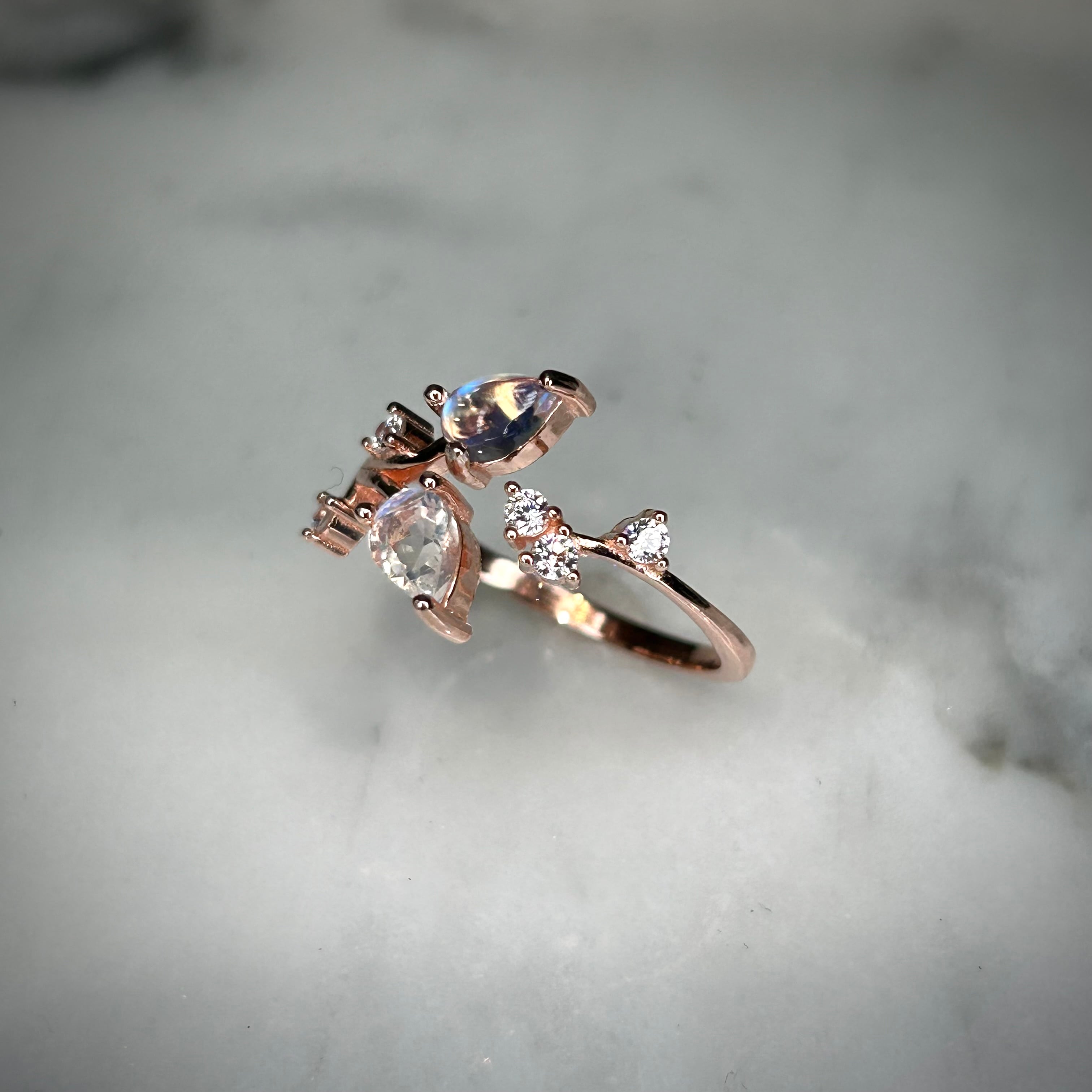 シルバー製ピンクゴールドカラー、レインボームーンストーンの実りリング。