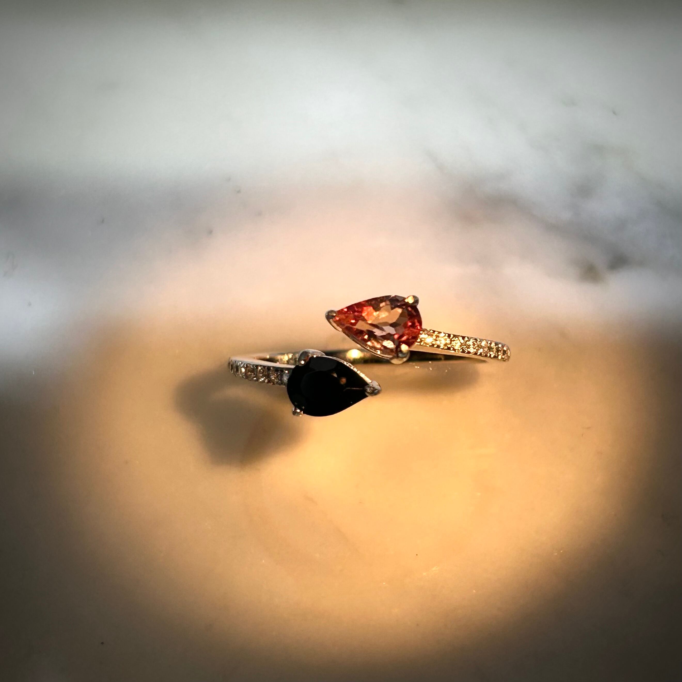 異なる2石を使用した、オープンデザインのリング。
