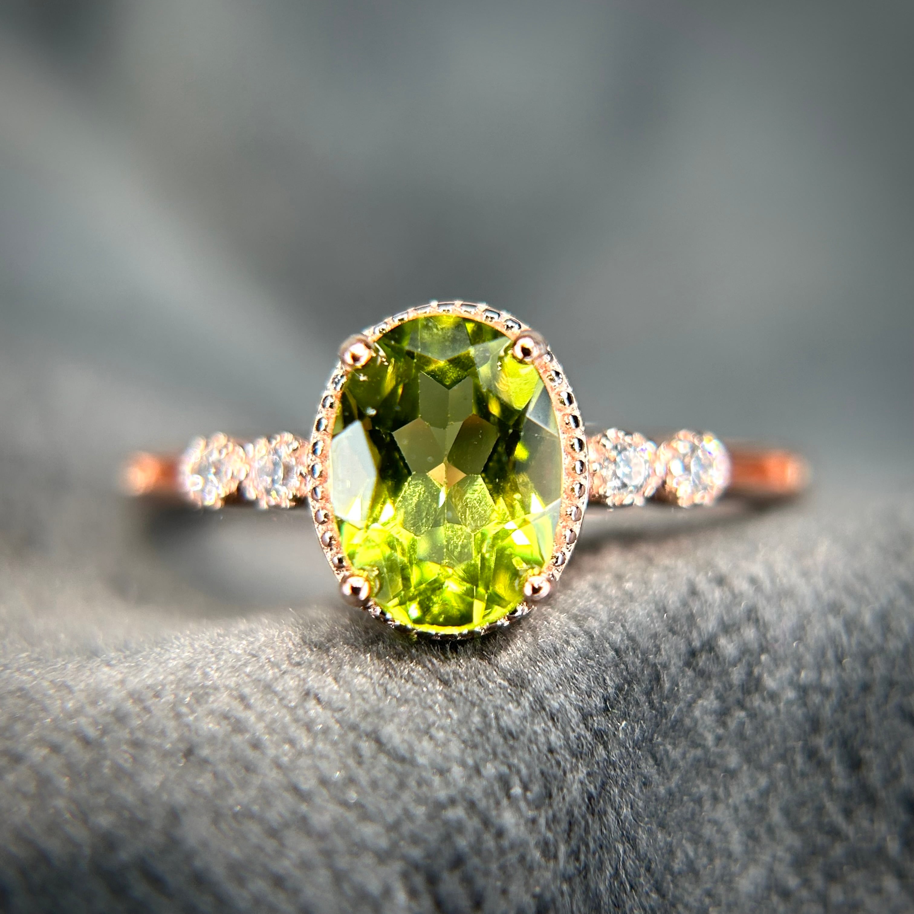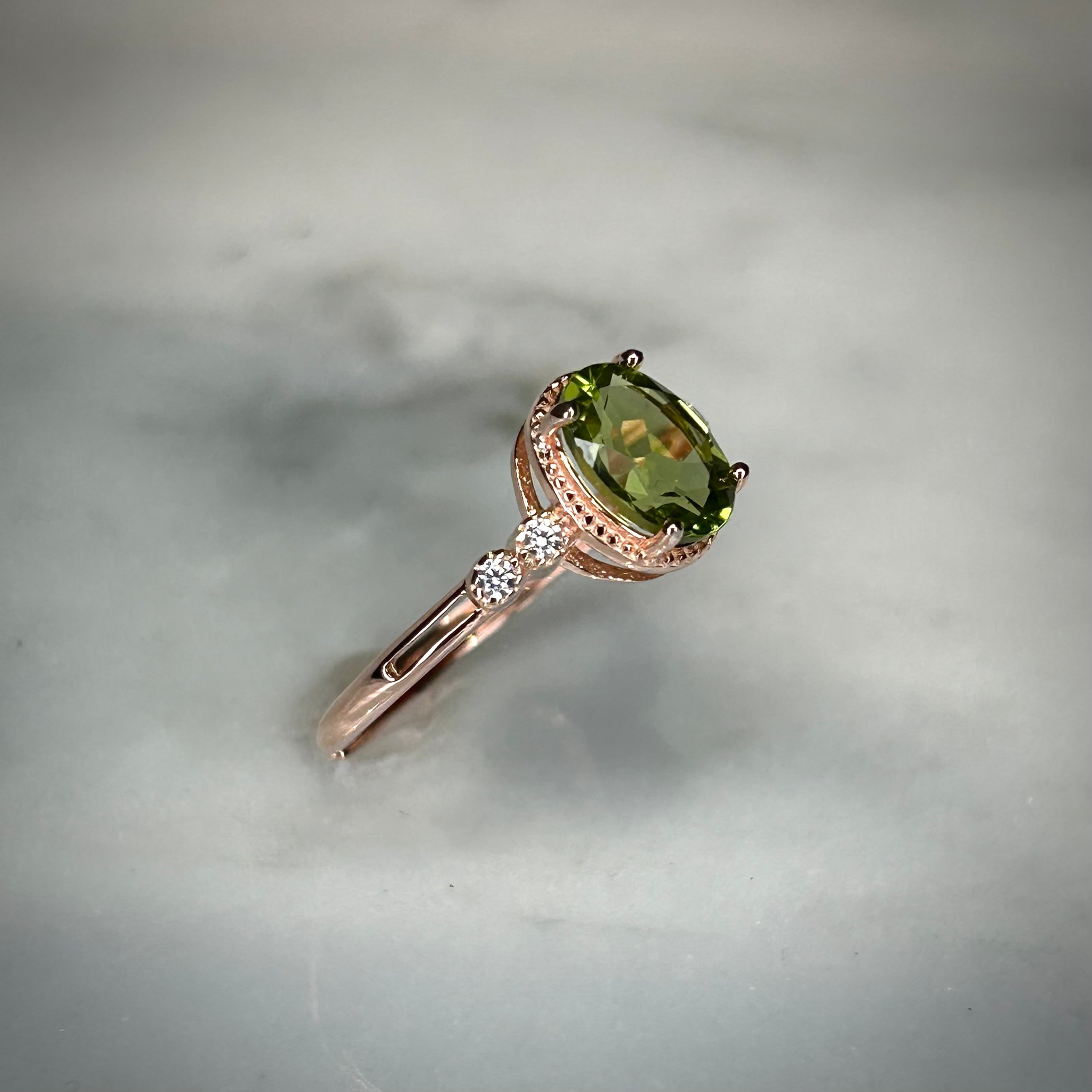 中石を引き立てる上品で洗礼されたデザインに煌めくペリドットのリング。