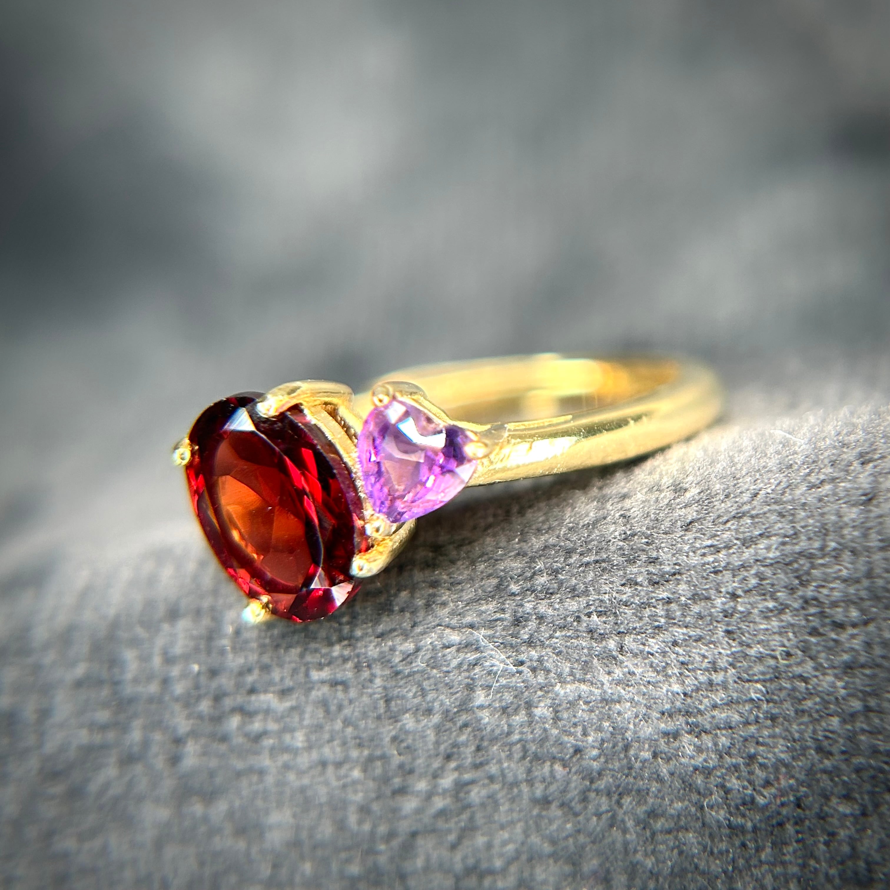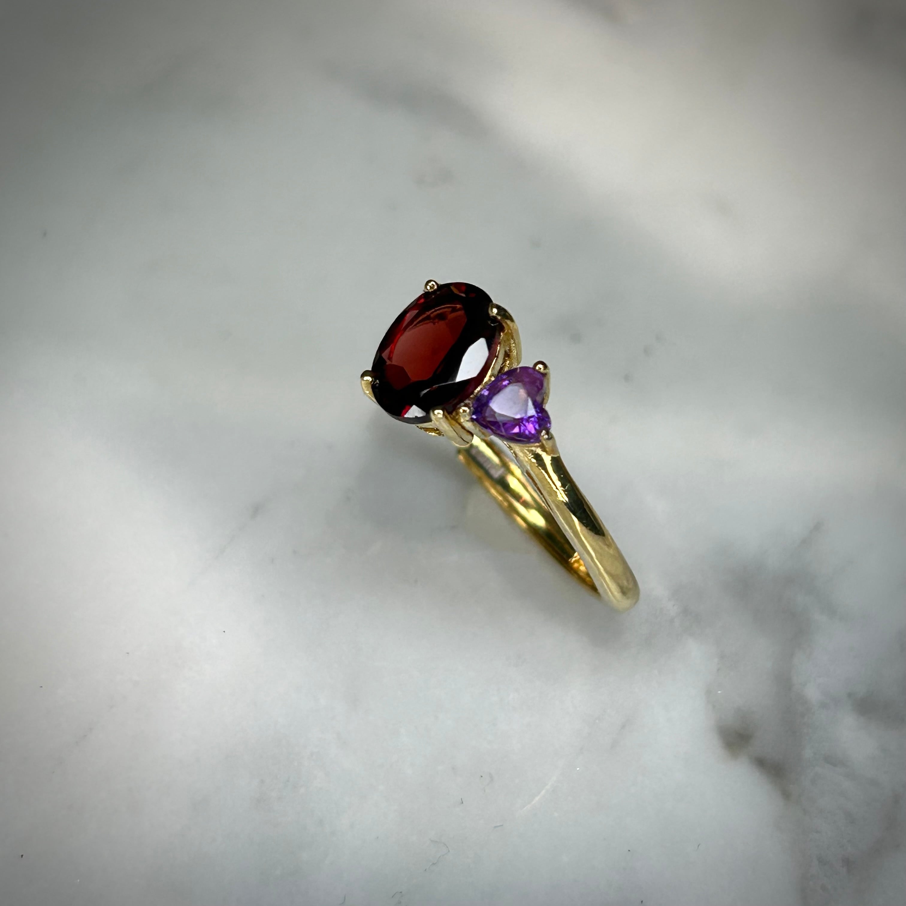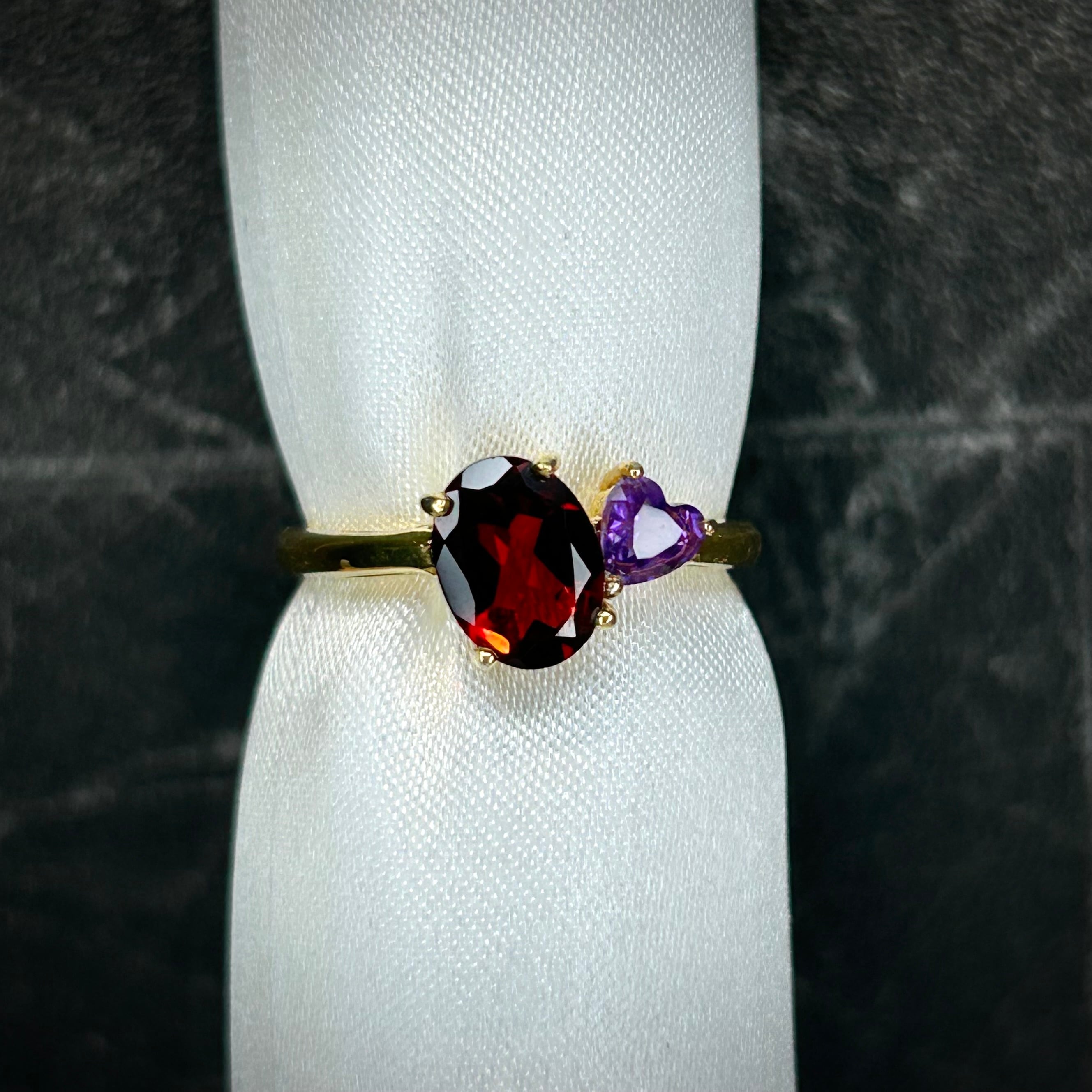 シルバー製ゴールドカラー、アメシスト&ガーネットのコンビリング。