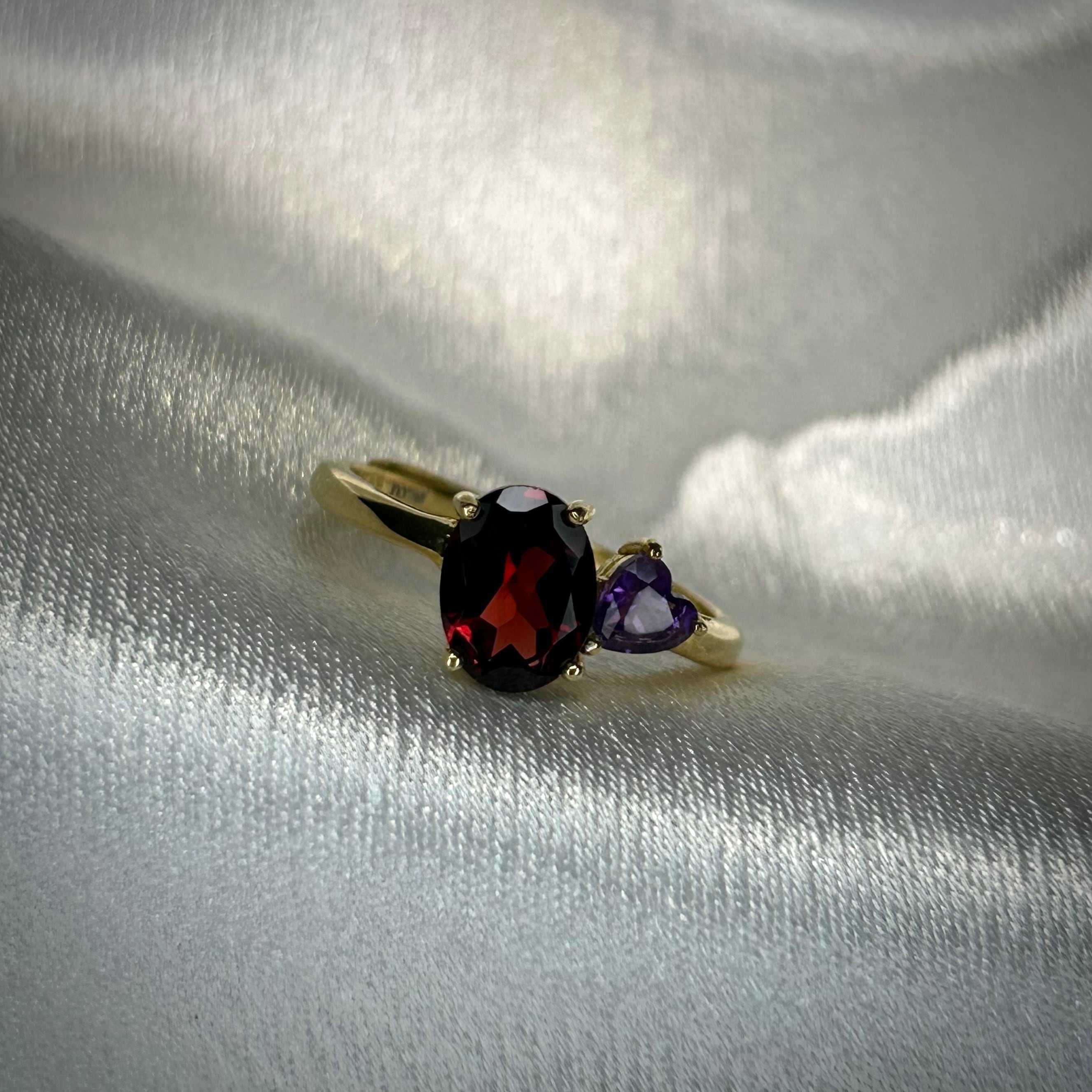 可愛いハートのアメシストと、存在感のあるオーバルのガーネットを使用。