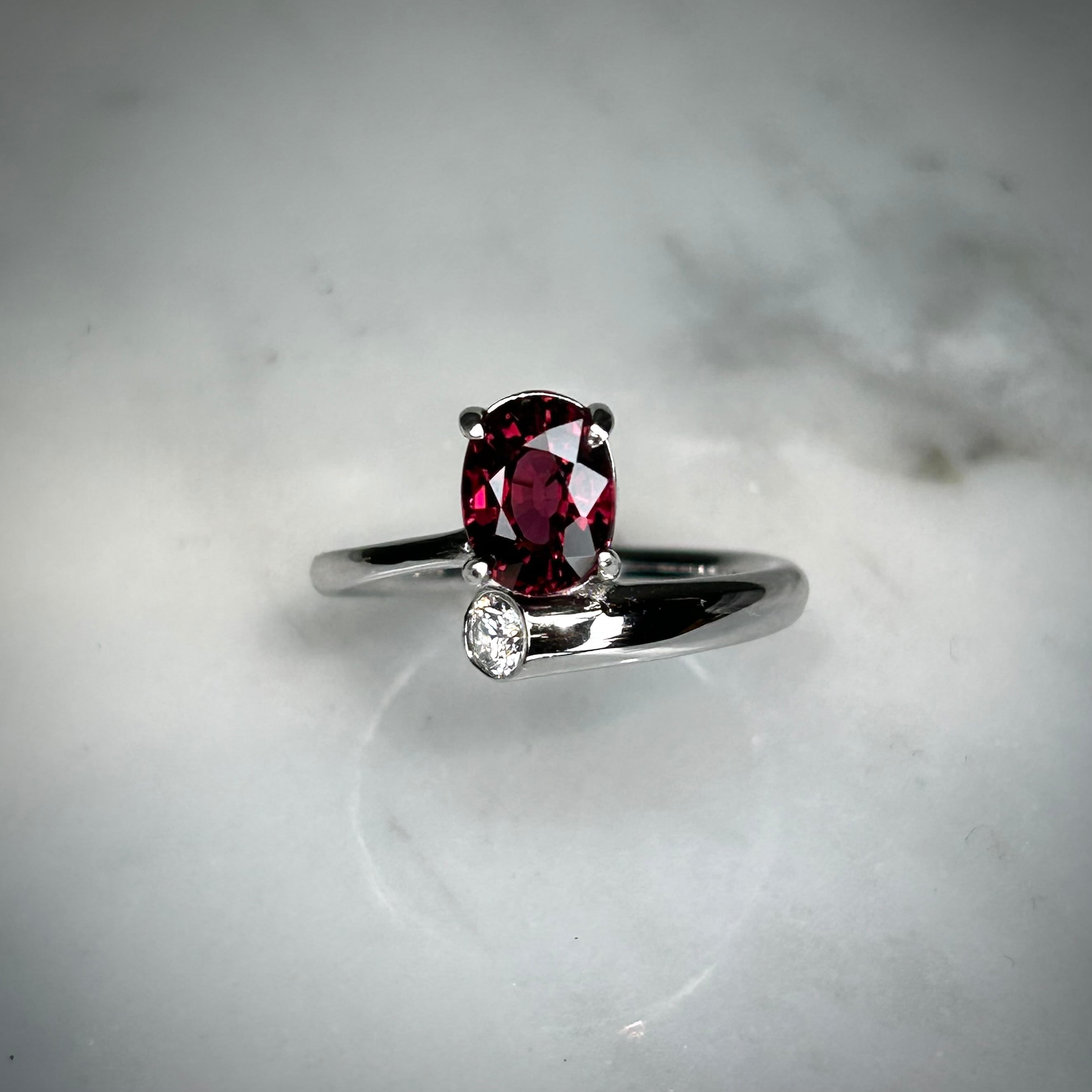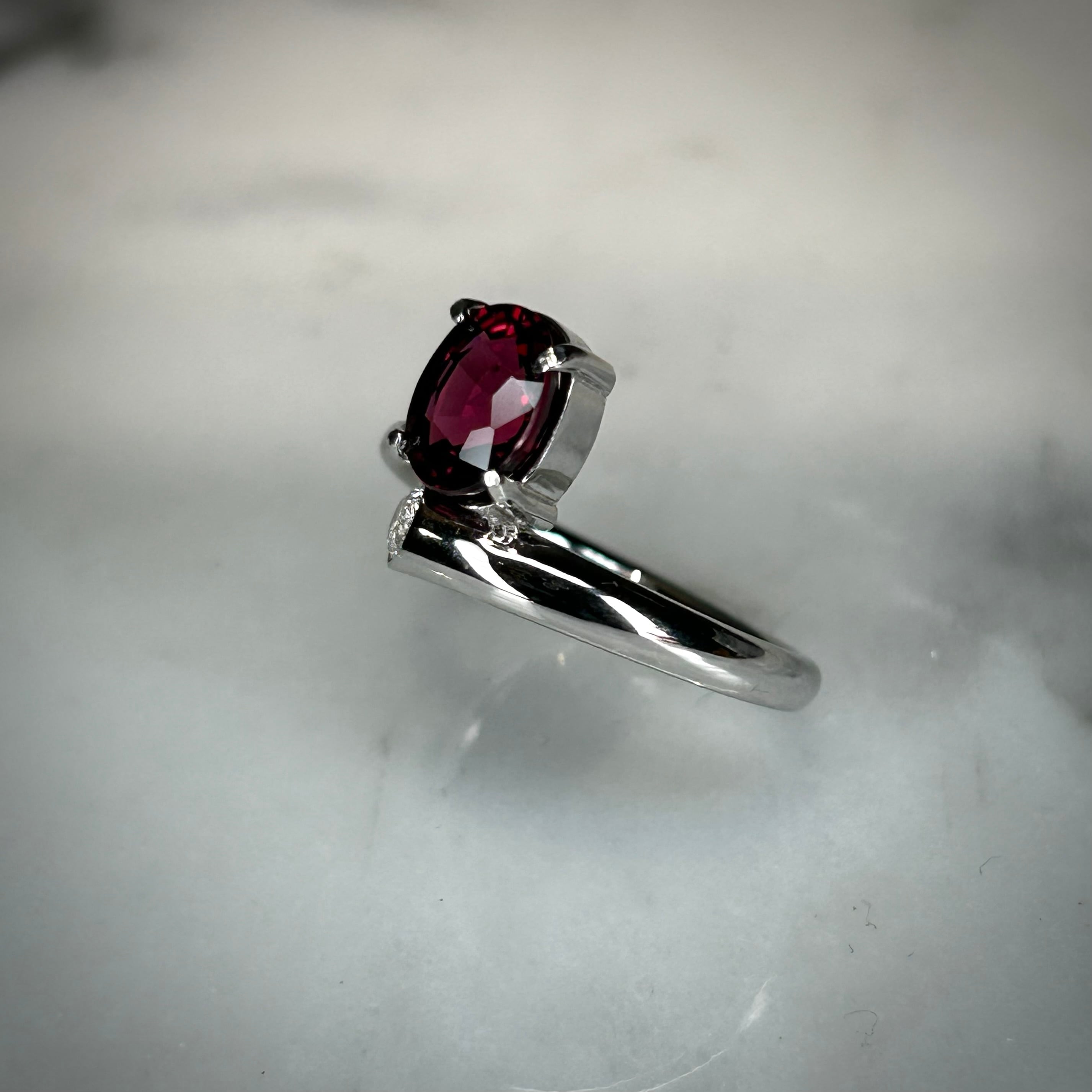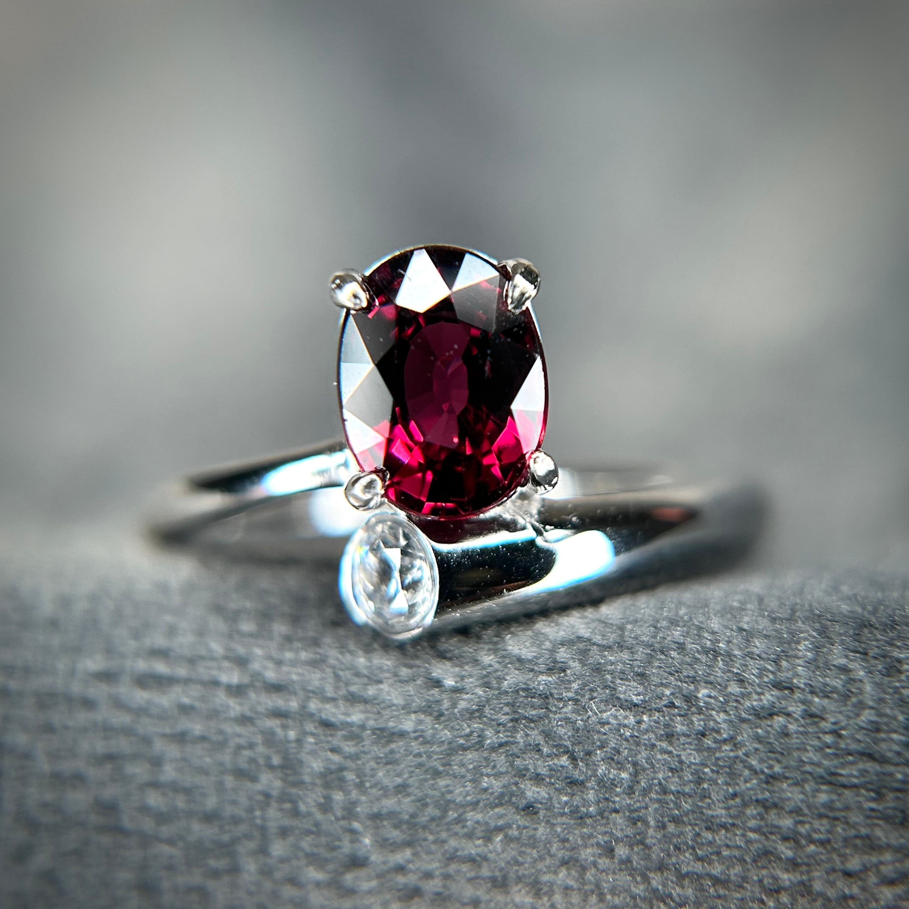 美しいロードライトガーネットを主役に、斜めに配置された脇石がさりげない輝きを添えます。