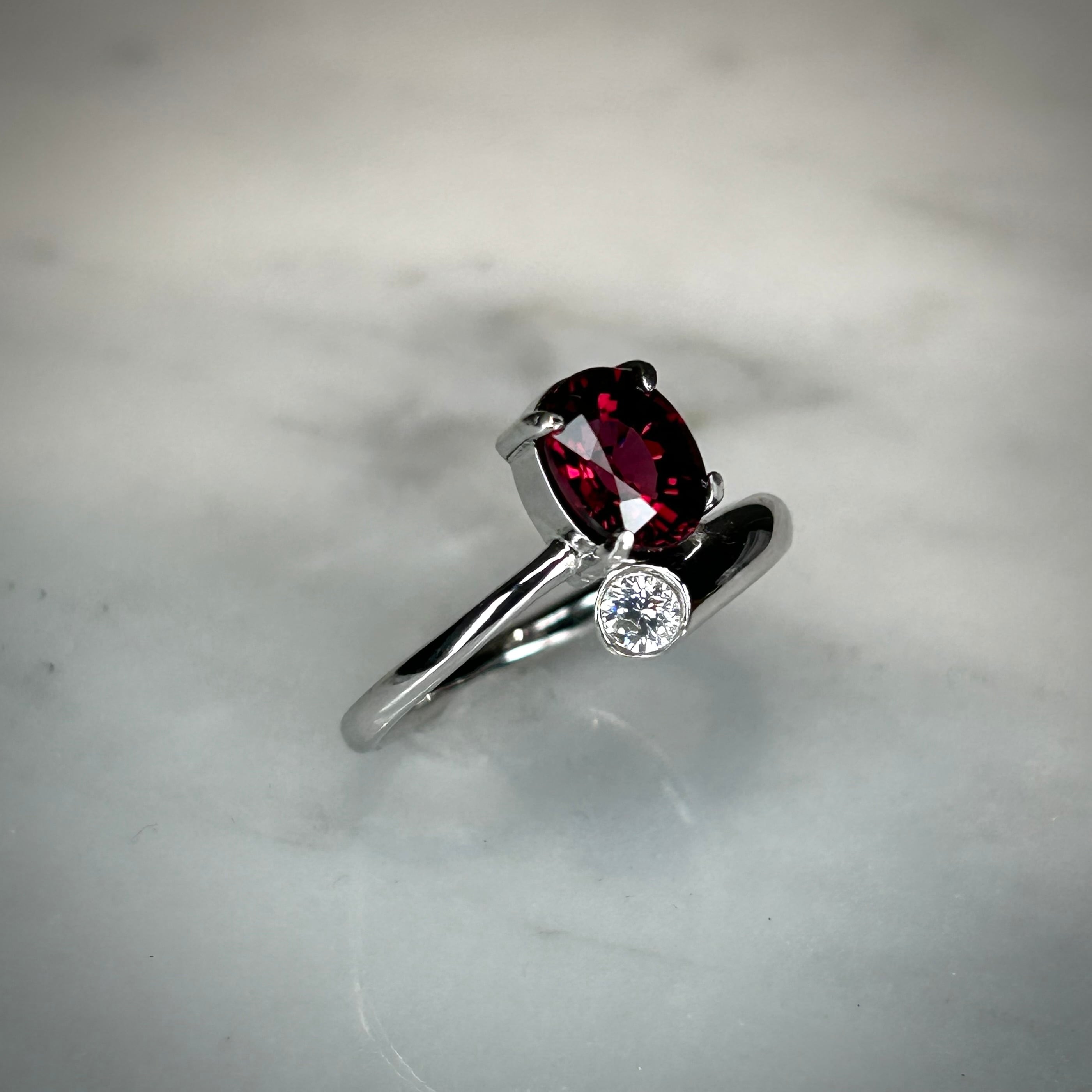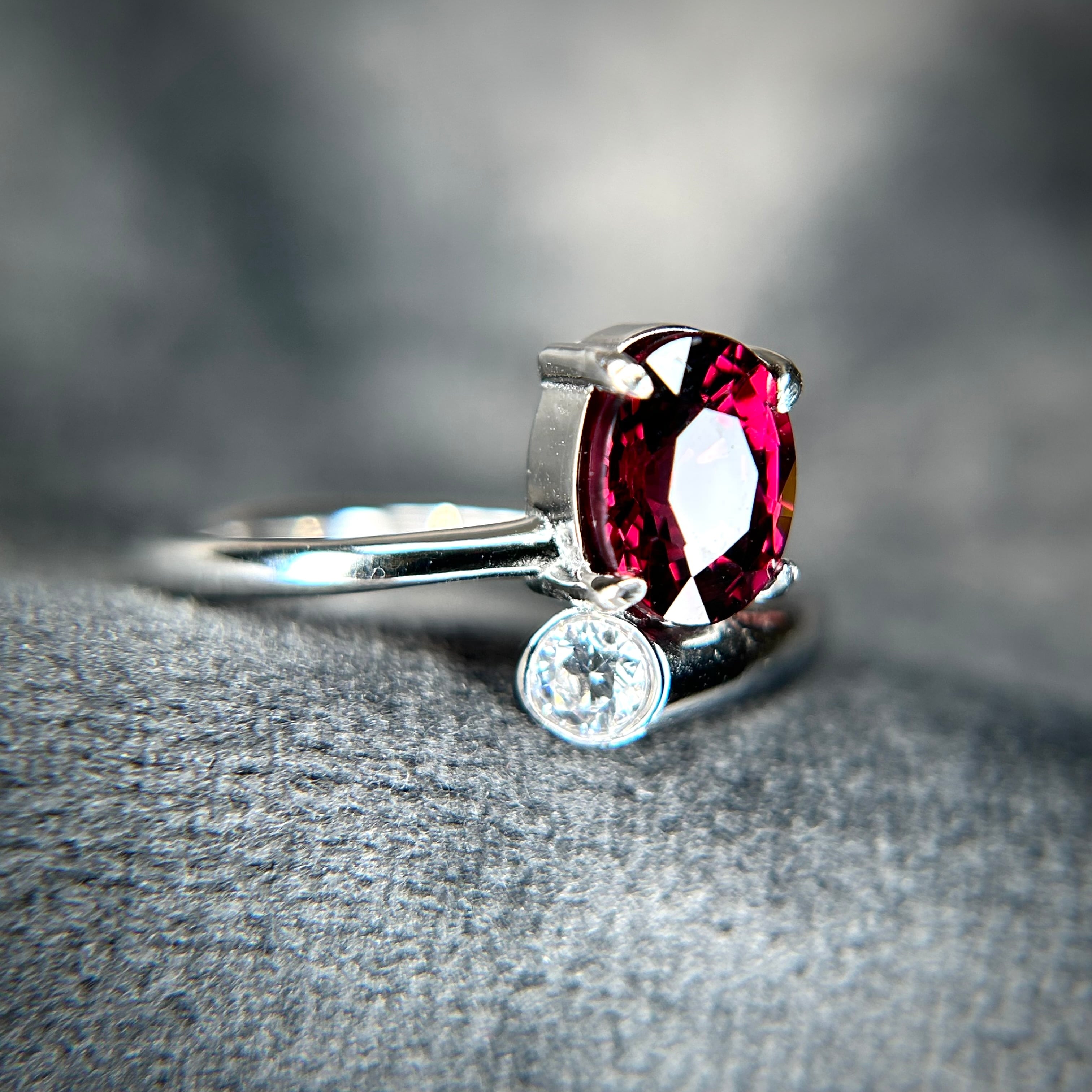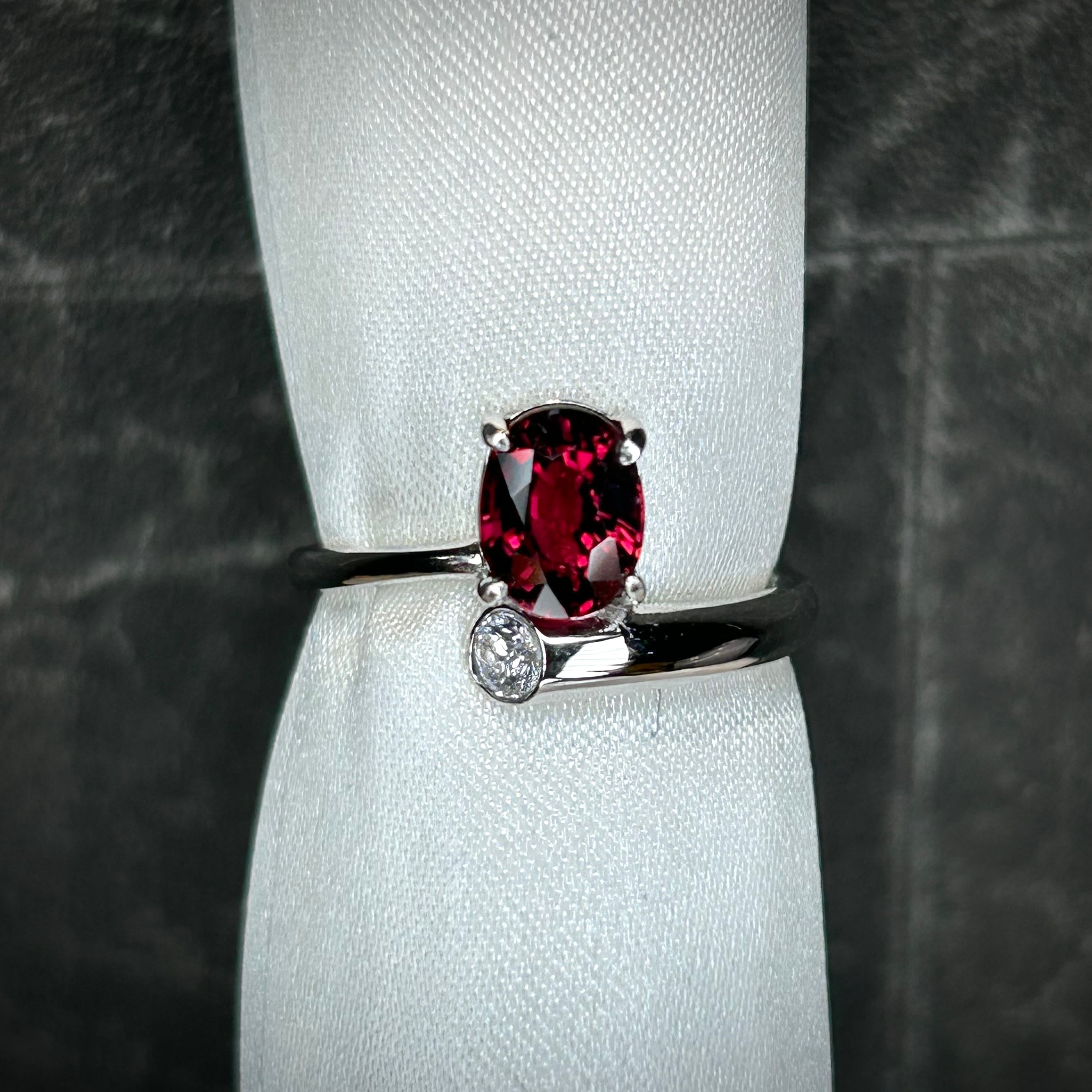 美しいロードライトガーネットを主役に、斜めに配置された脇石がさりげない輝きを添えます。