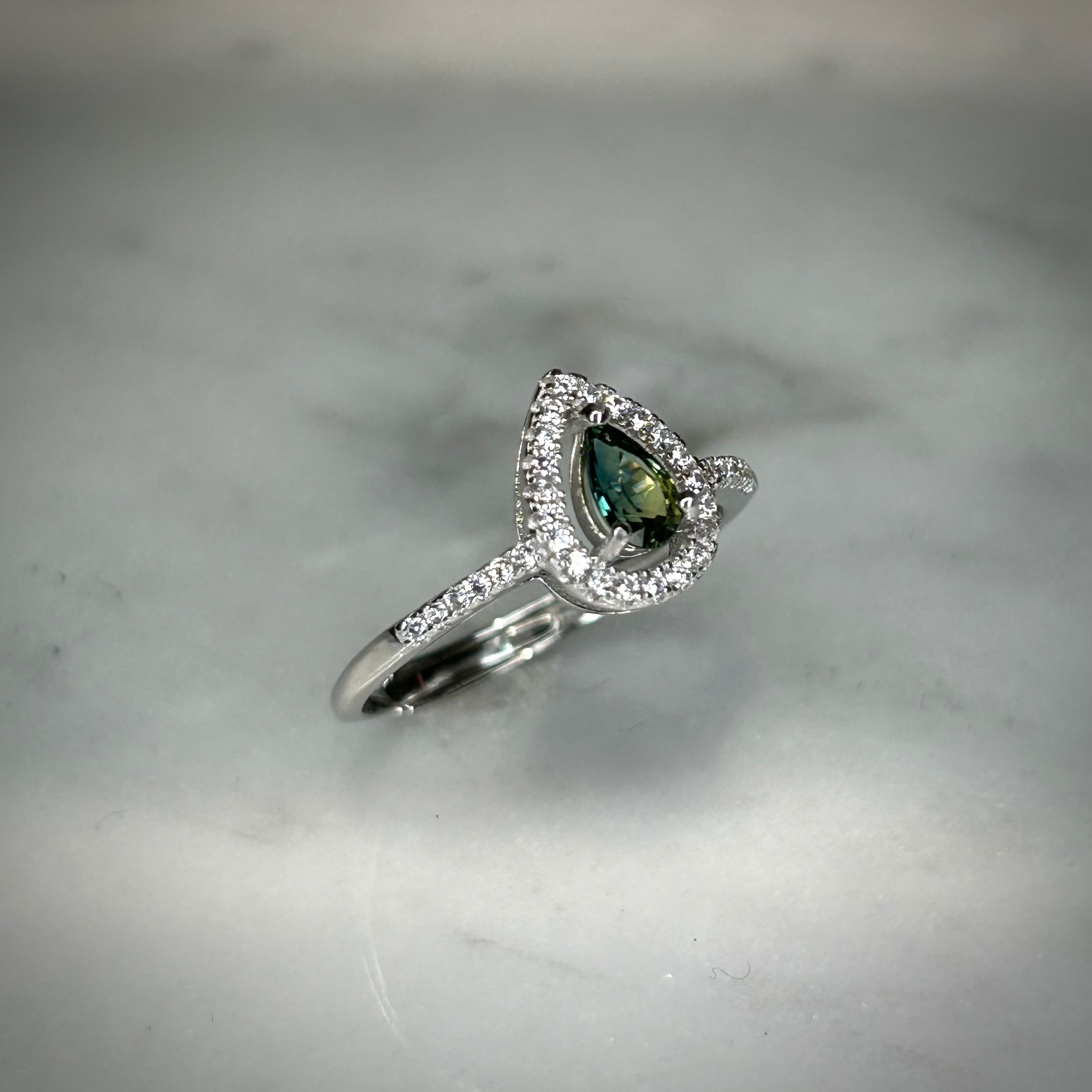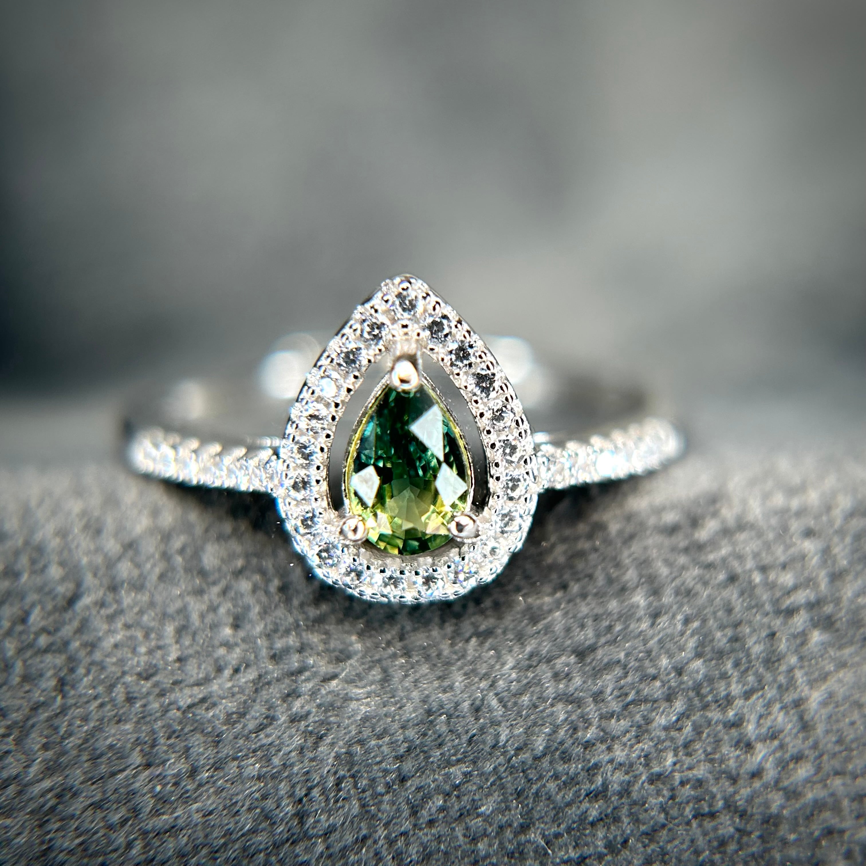 グリーンとイエローが見られるバイカラーサファイアを使用。