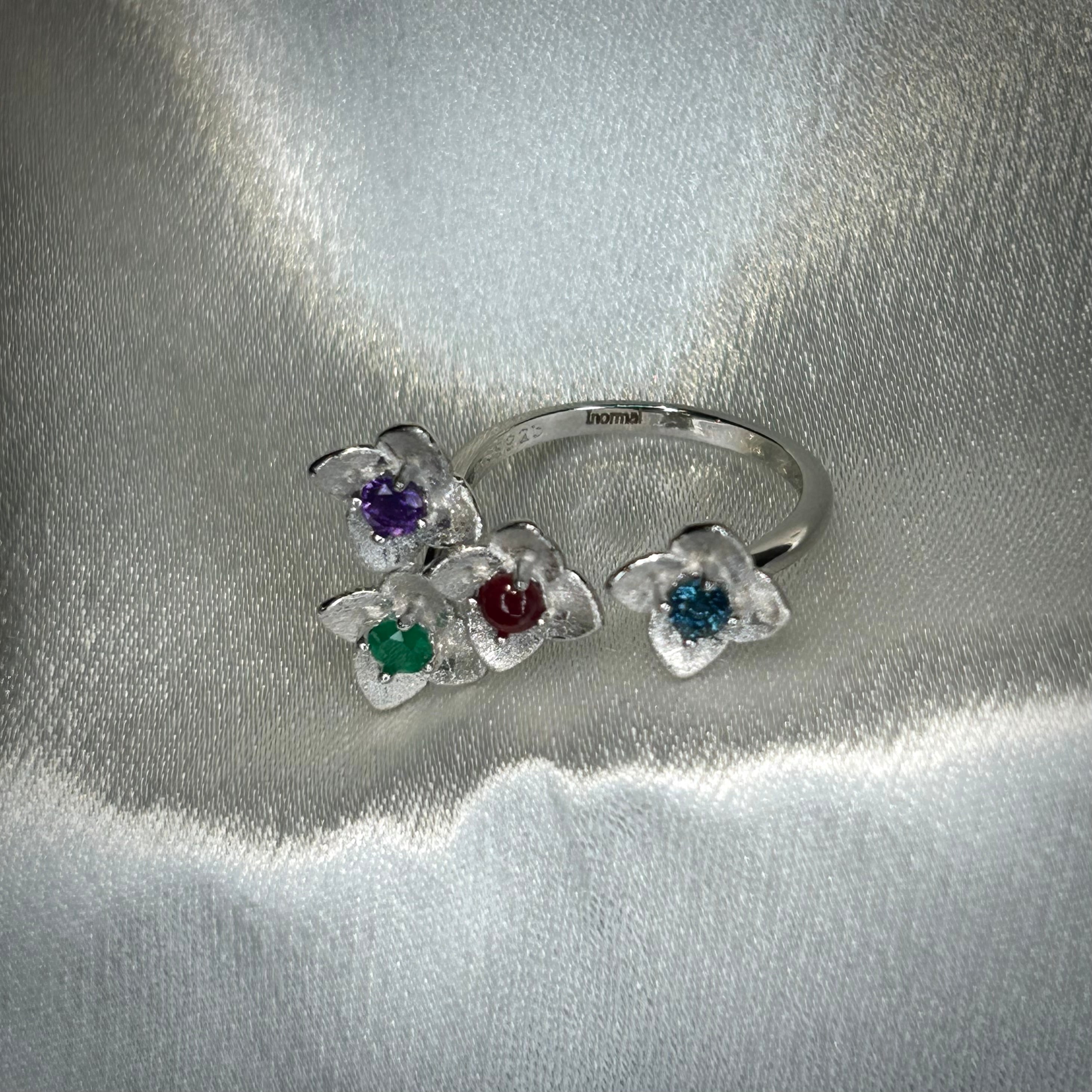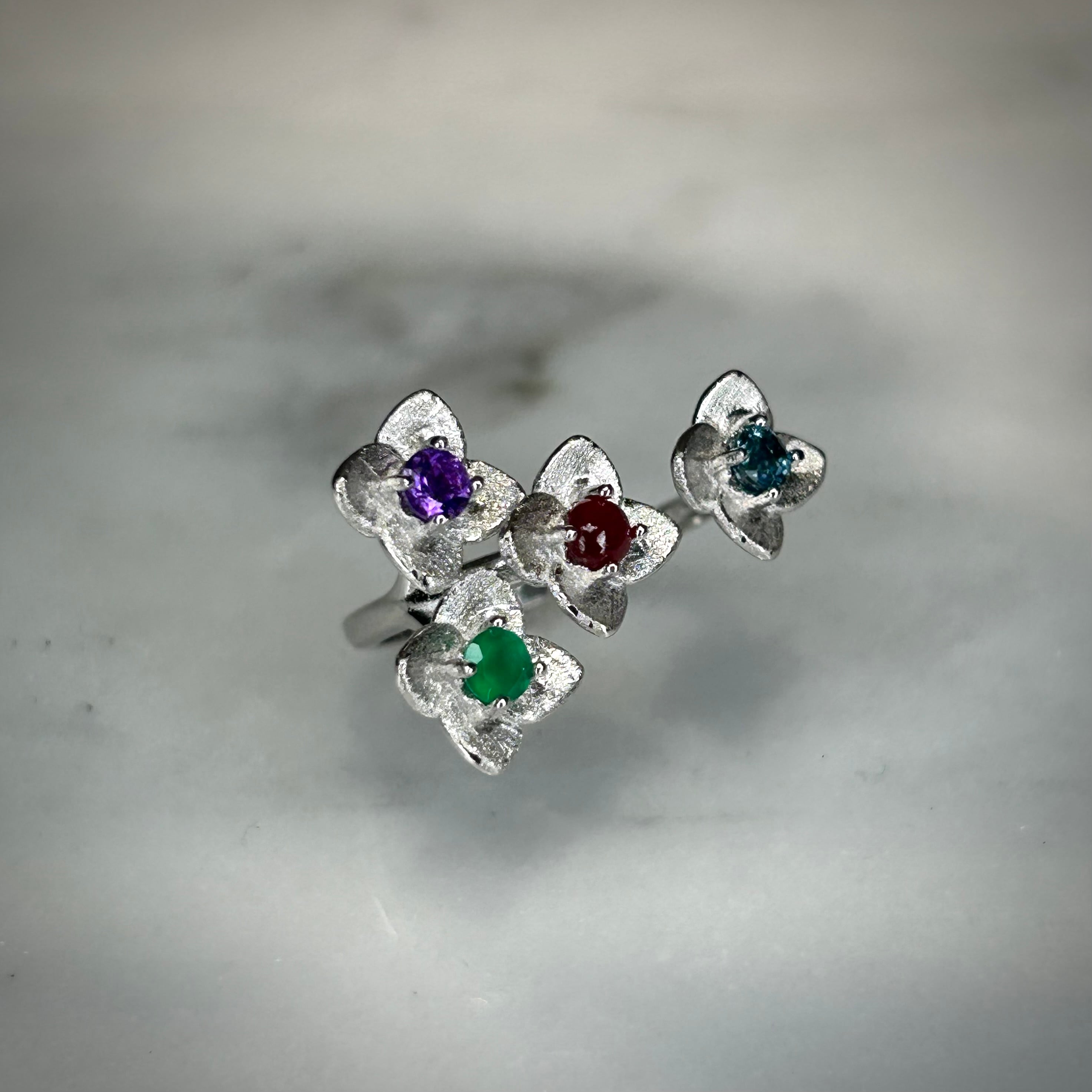 シルバー製、マルチストーンのフラワーリング。