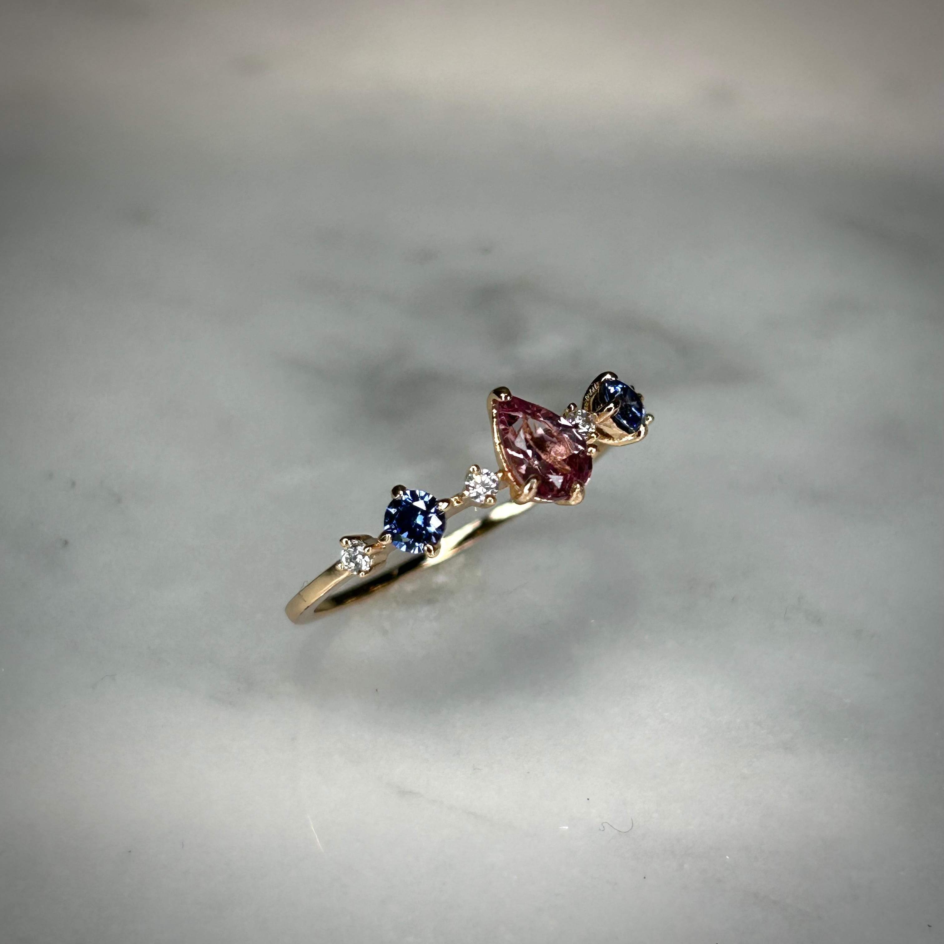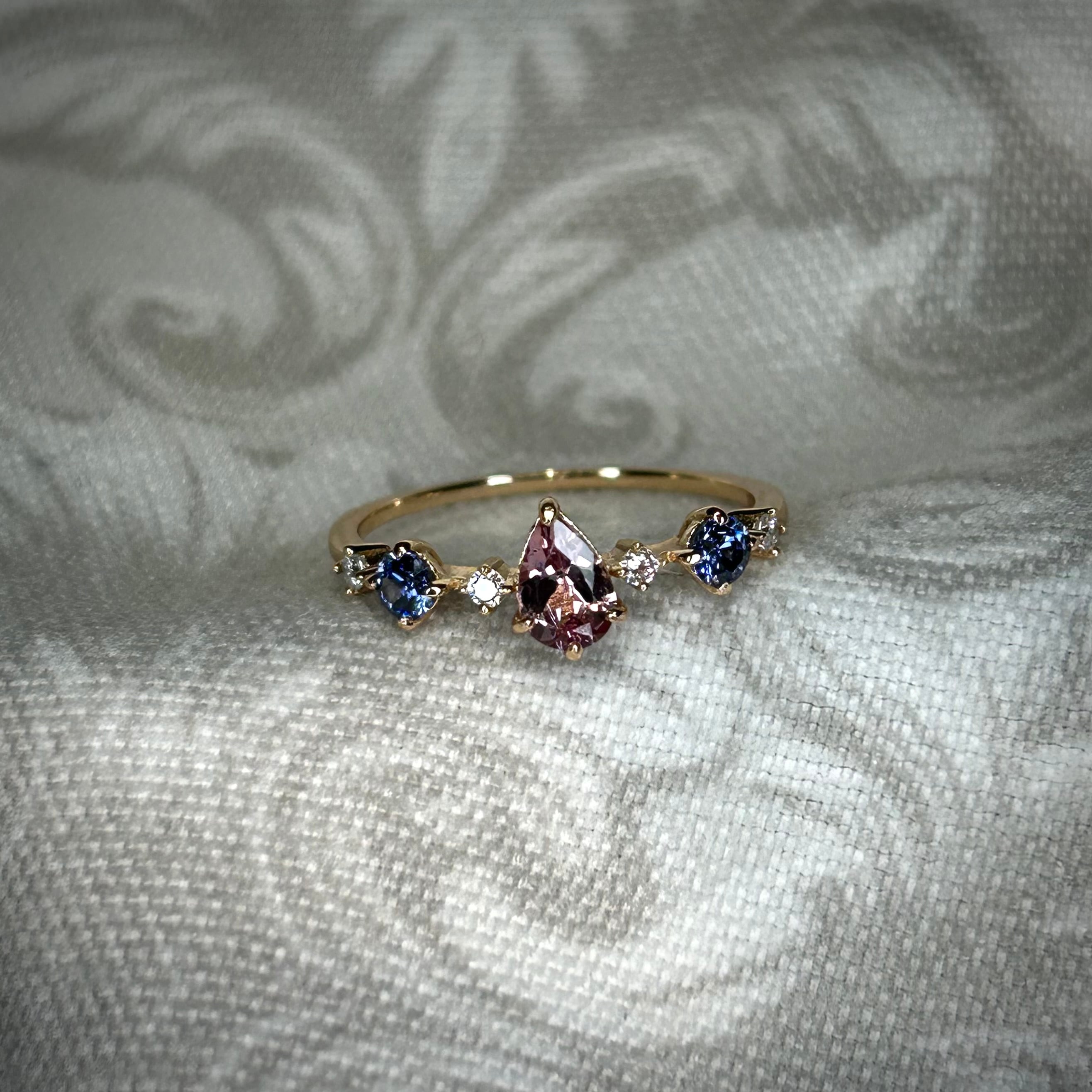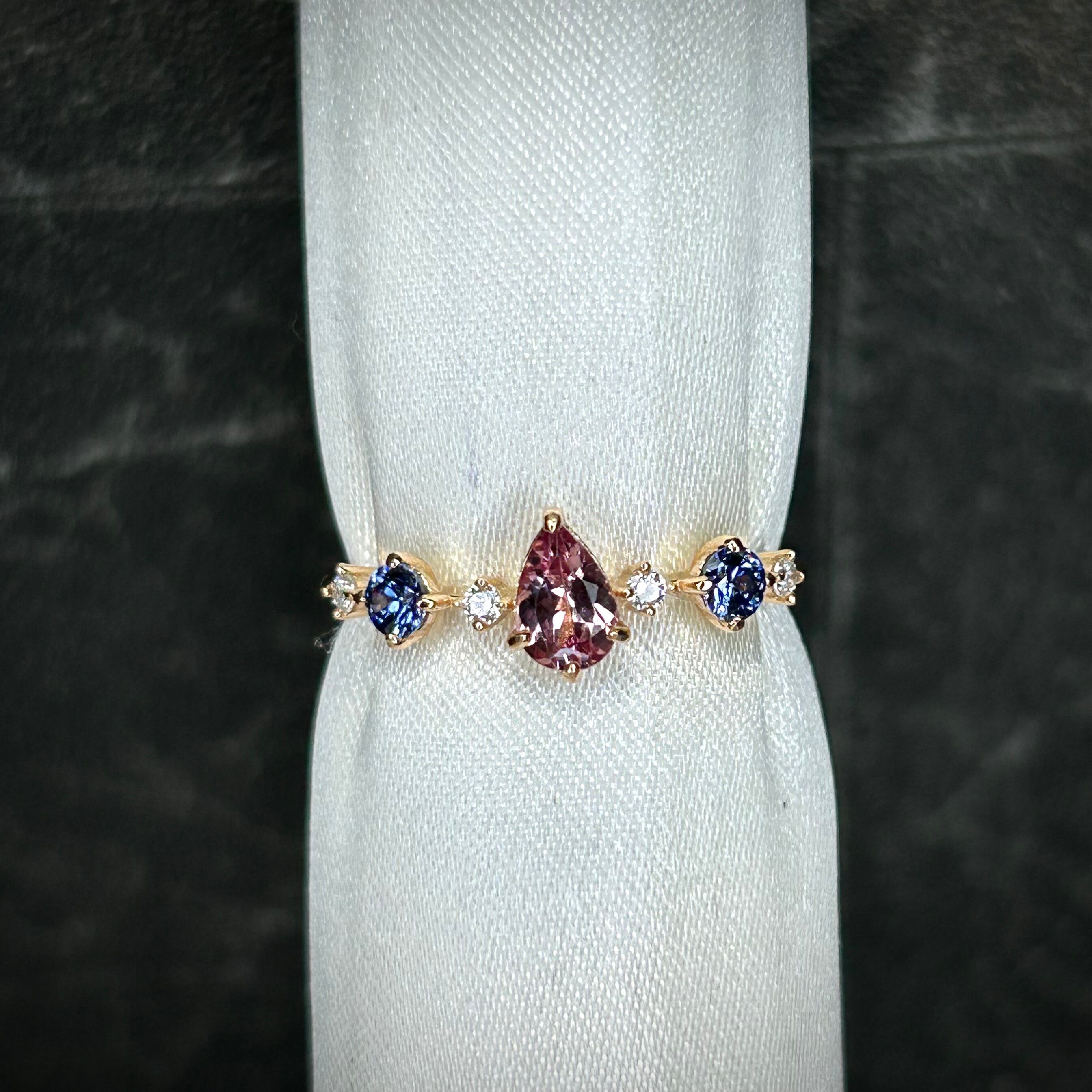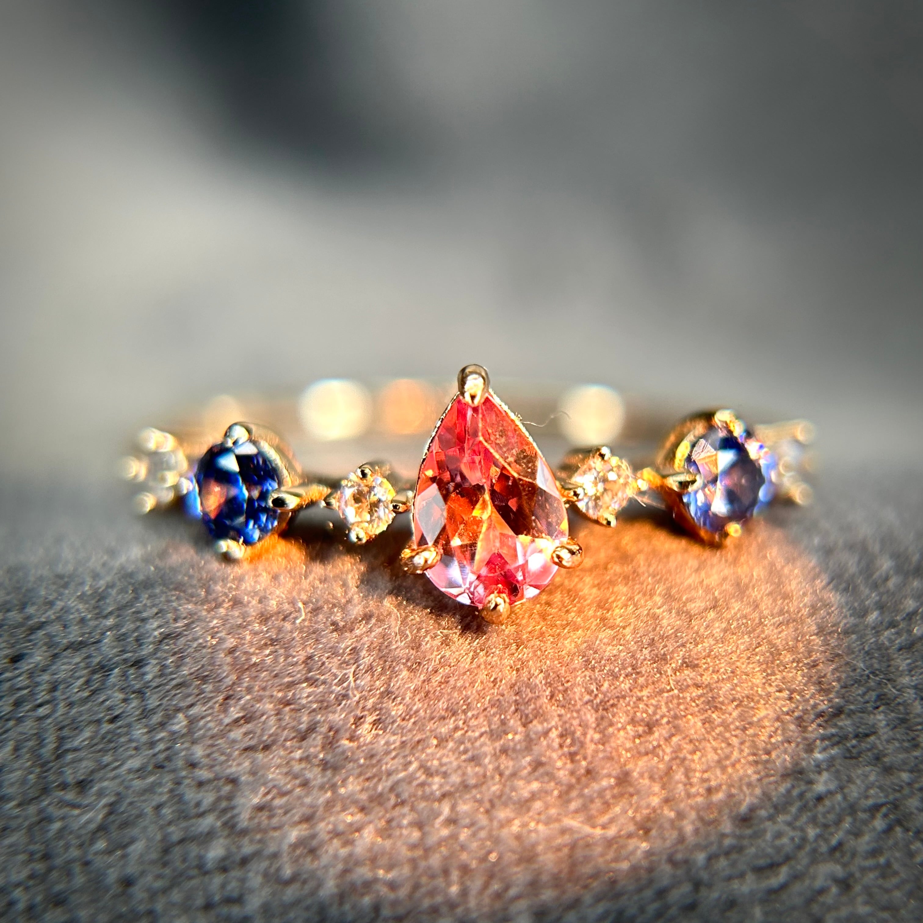 ブルーとクリアーの脇石が華やかで、ガーネットを引き立てます。