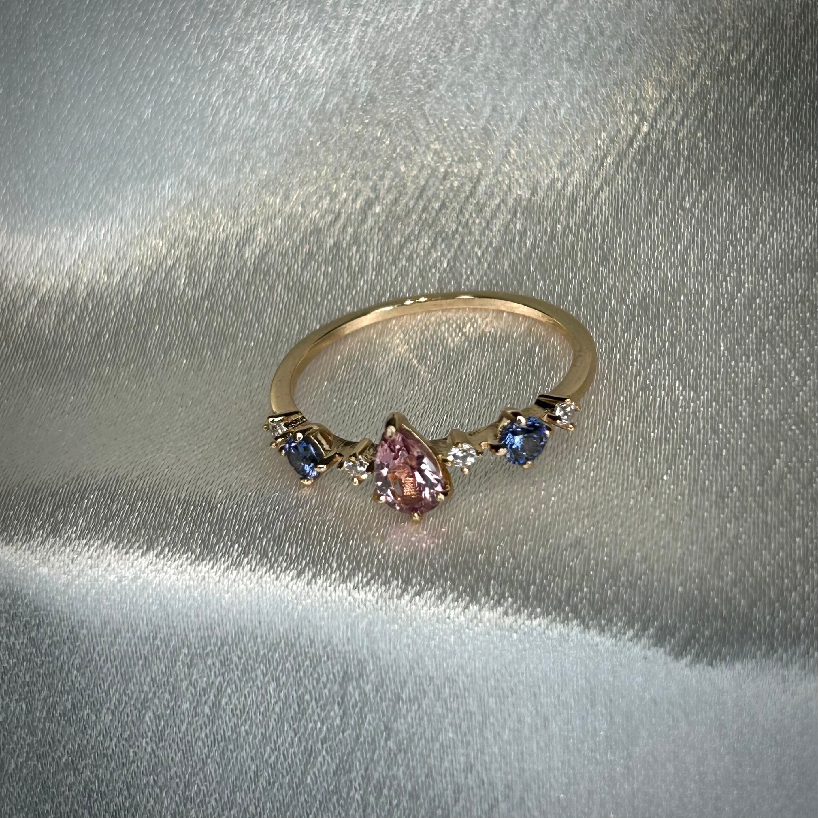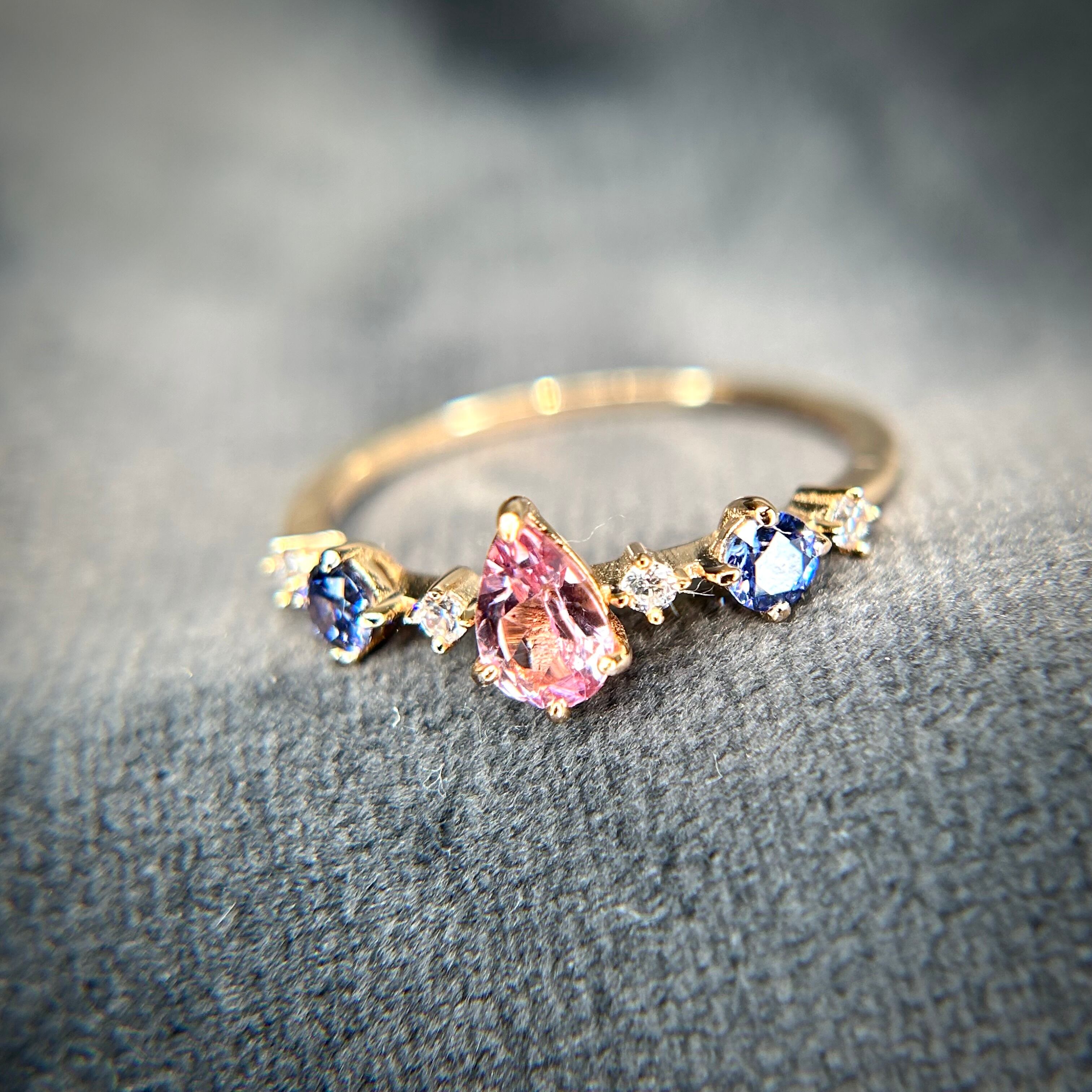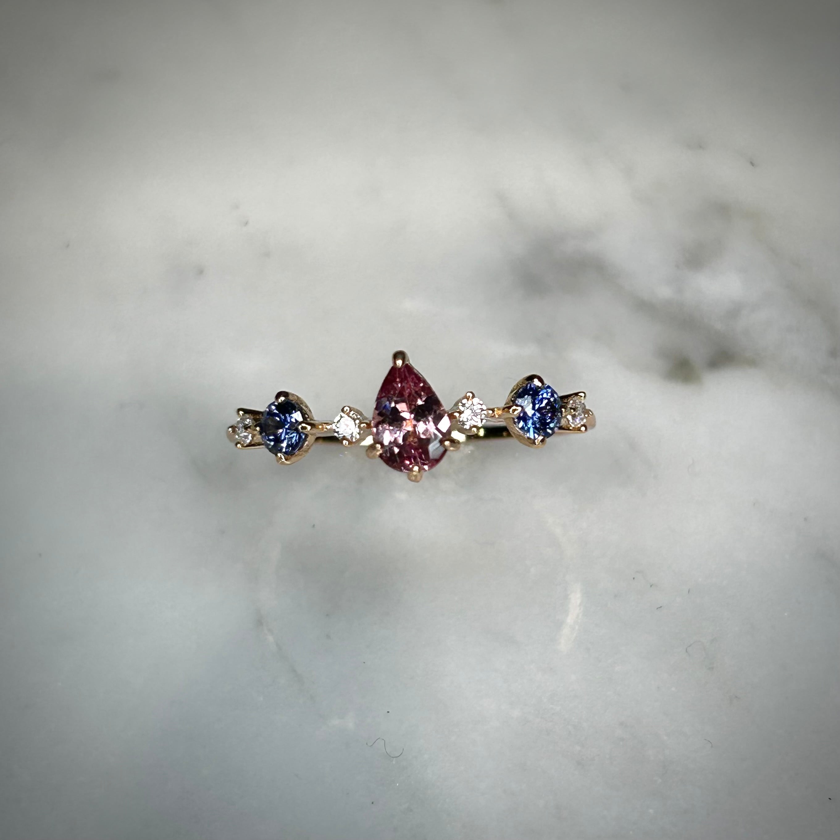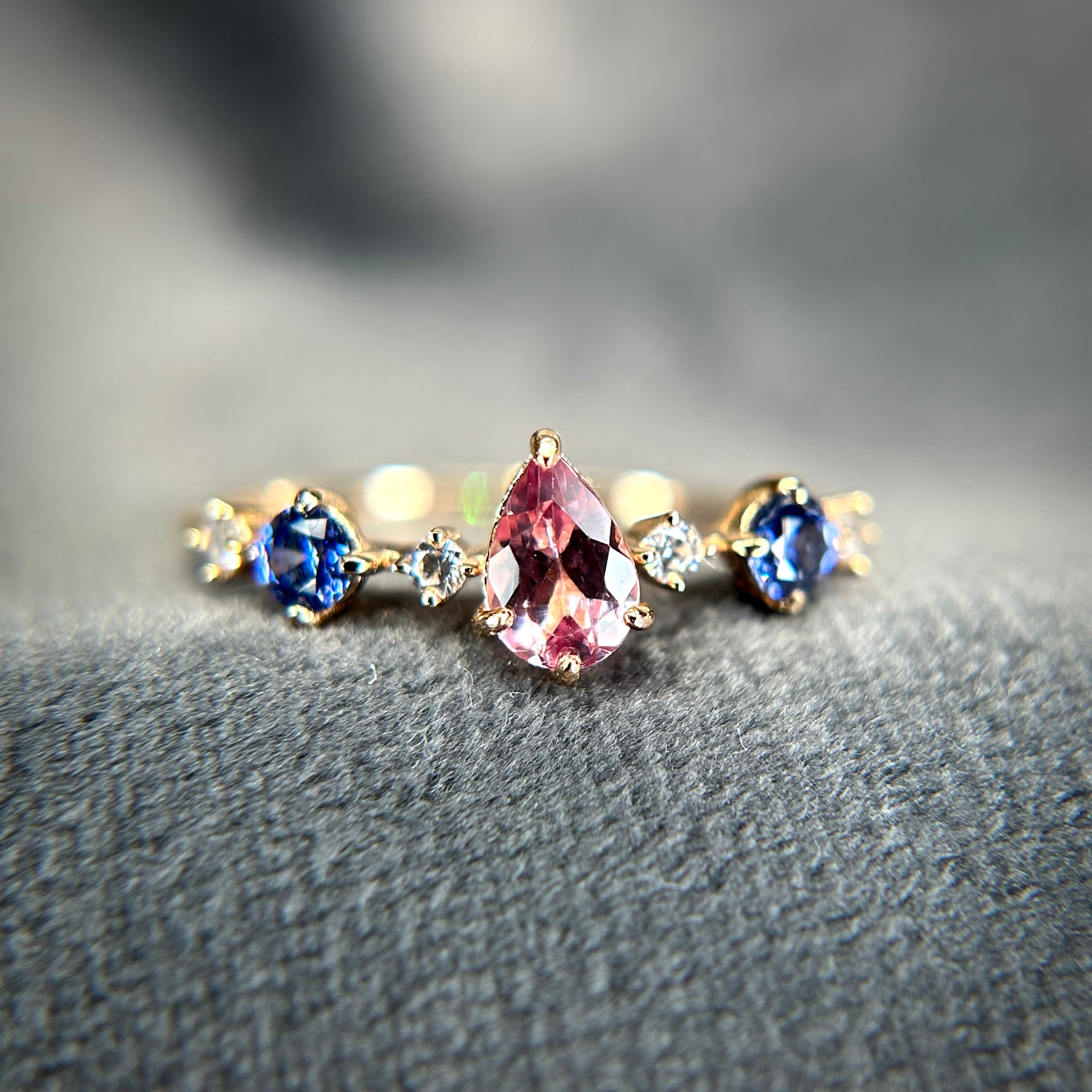 ブルーとクリアーの脇石が華やかで、ガーネットを引き立てます。